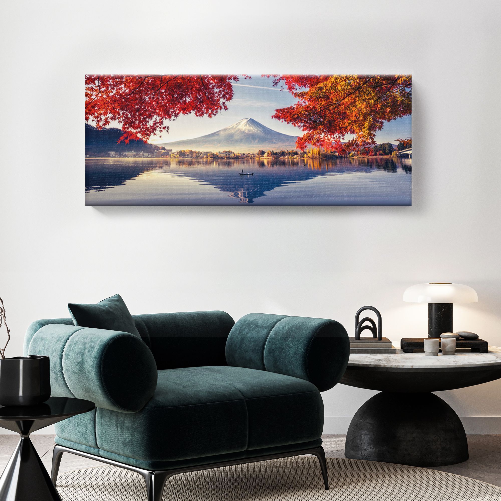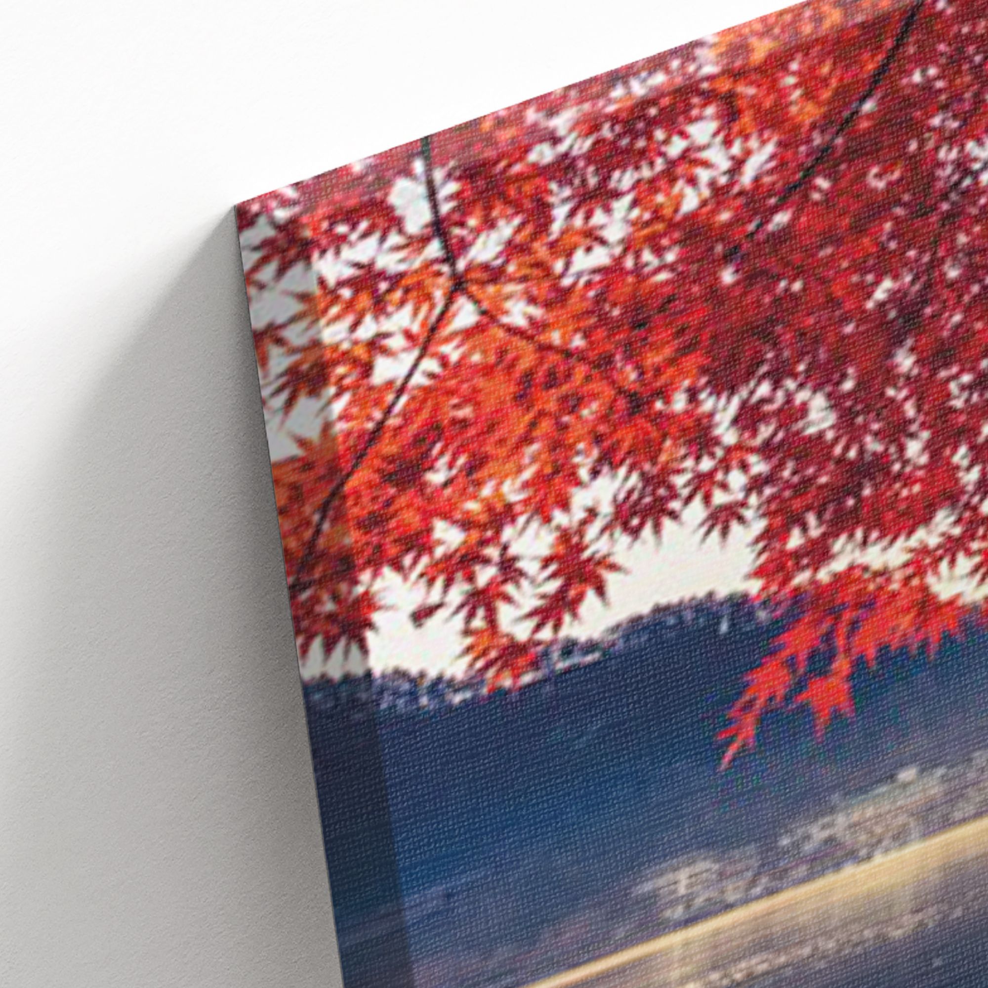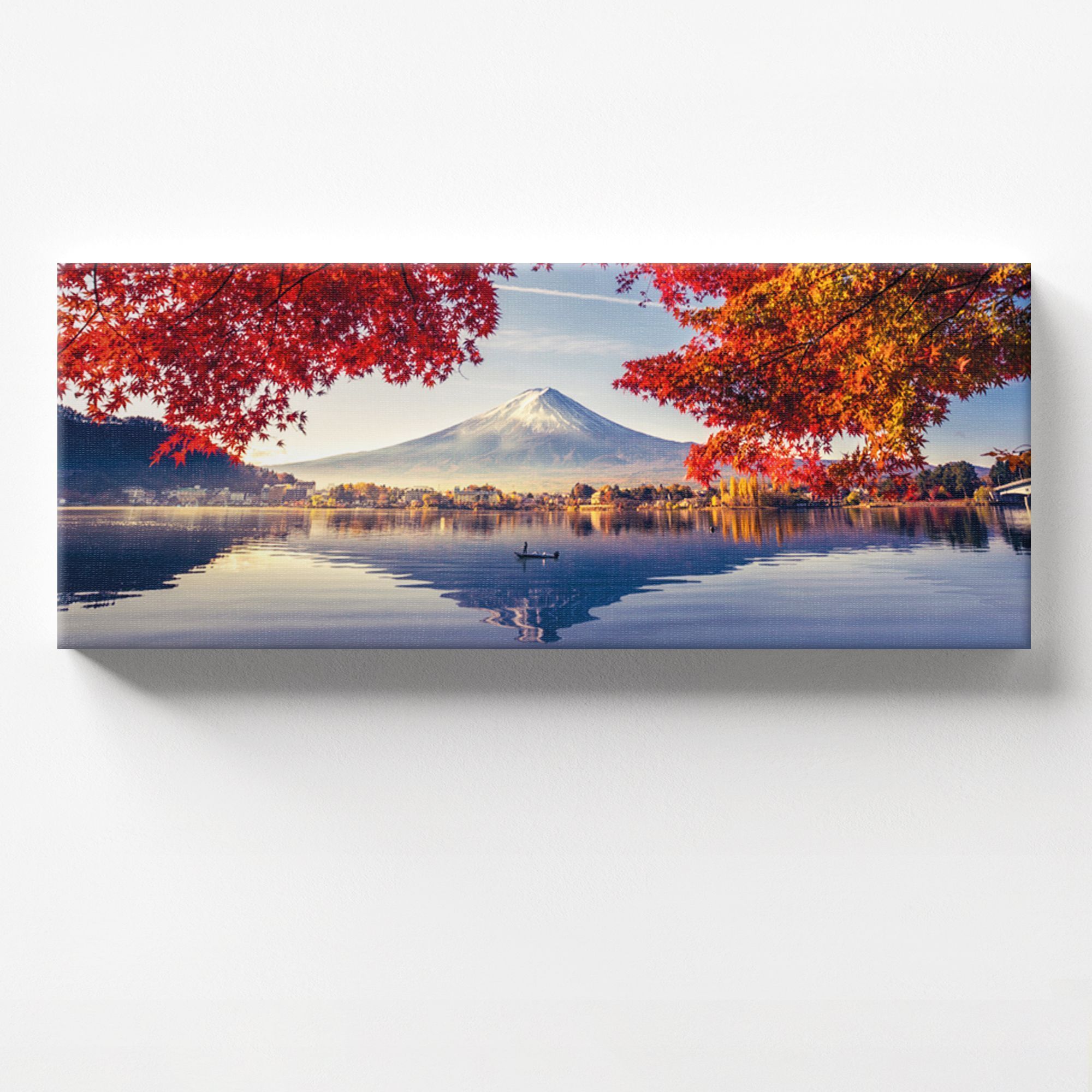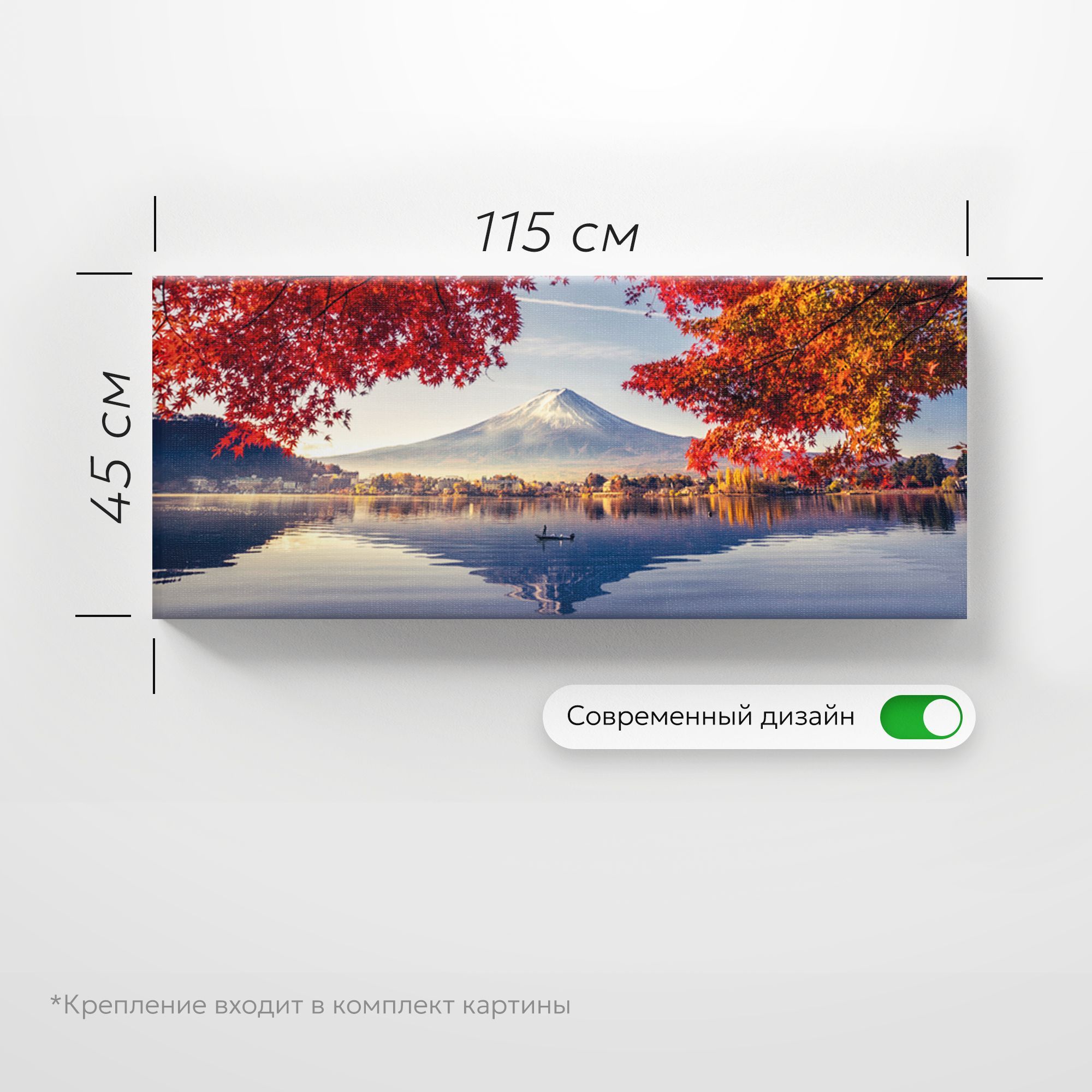 На картине изображён величественный пейзаж с горой Фудзияма (Фuji) в центре композиции — знаковым символом Японии. Белоснежная вершина горы чётко отражается в спокойной глади озера, создавая эффект зеркального полотна. На переднем плане раскинулись яркие ветви клёна с огненно-красными и золотисто-оранжевыми листьями, обрамляющие вид и добавляющие картине динамики и тепла. Вдали виднеется береговая линия с уютными домиками, гармонично вписанными в природный ландшафт. Чистое небо с лёгкими облаками подчёркивает спокойствие и гармонию сцены. Цветовая гамма сочетает холодные синие и серые оттенки воды и неба с тёплыми осенними тонами листвы, создавая баланс и глубину изображения. Картина на холсте идеально впишется в интерьер с элементами японского дизайна — татами, раздвижными перегородками, лаконичной мебелью. Картина подчеркнёт философию простоты и природной гармонии.