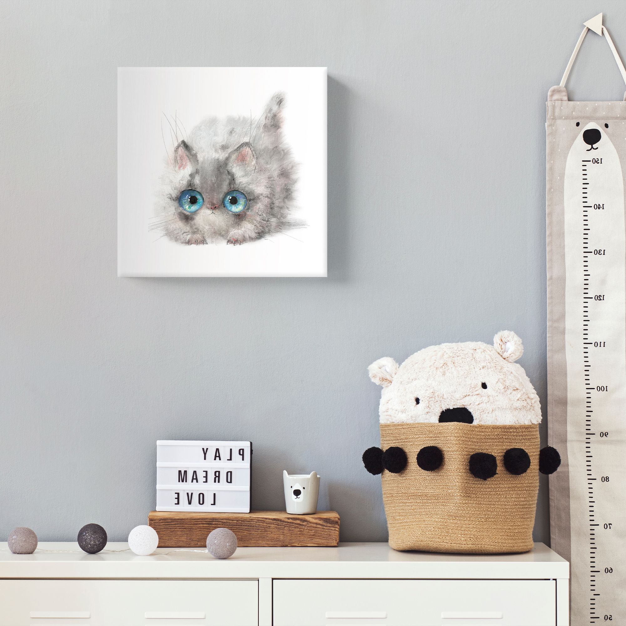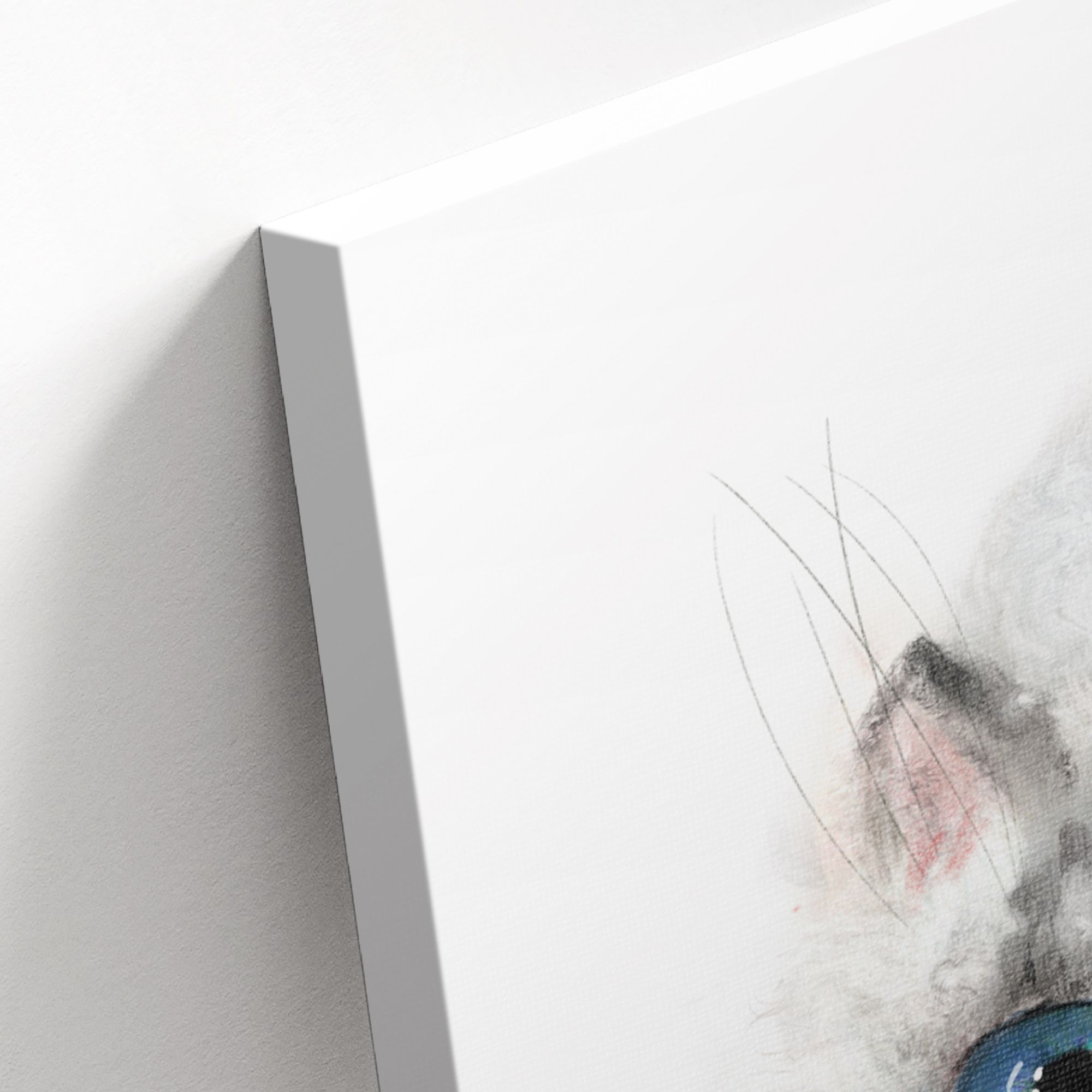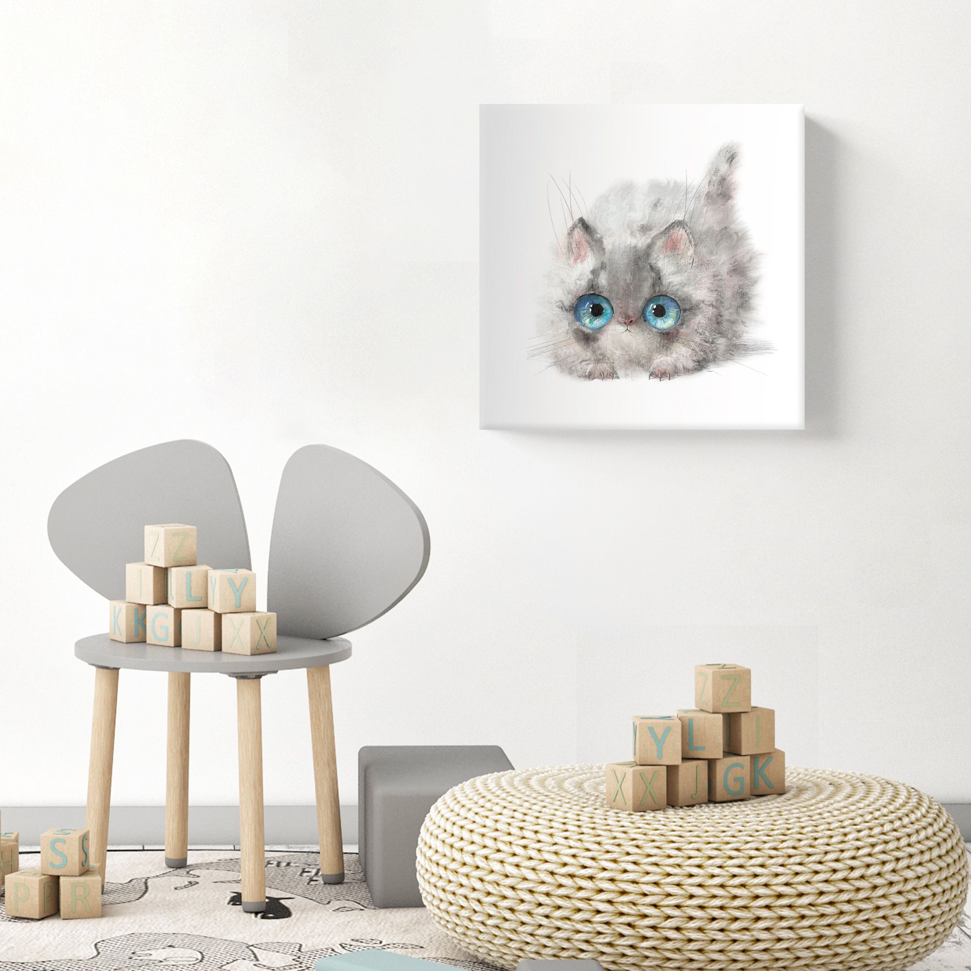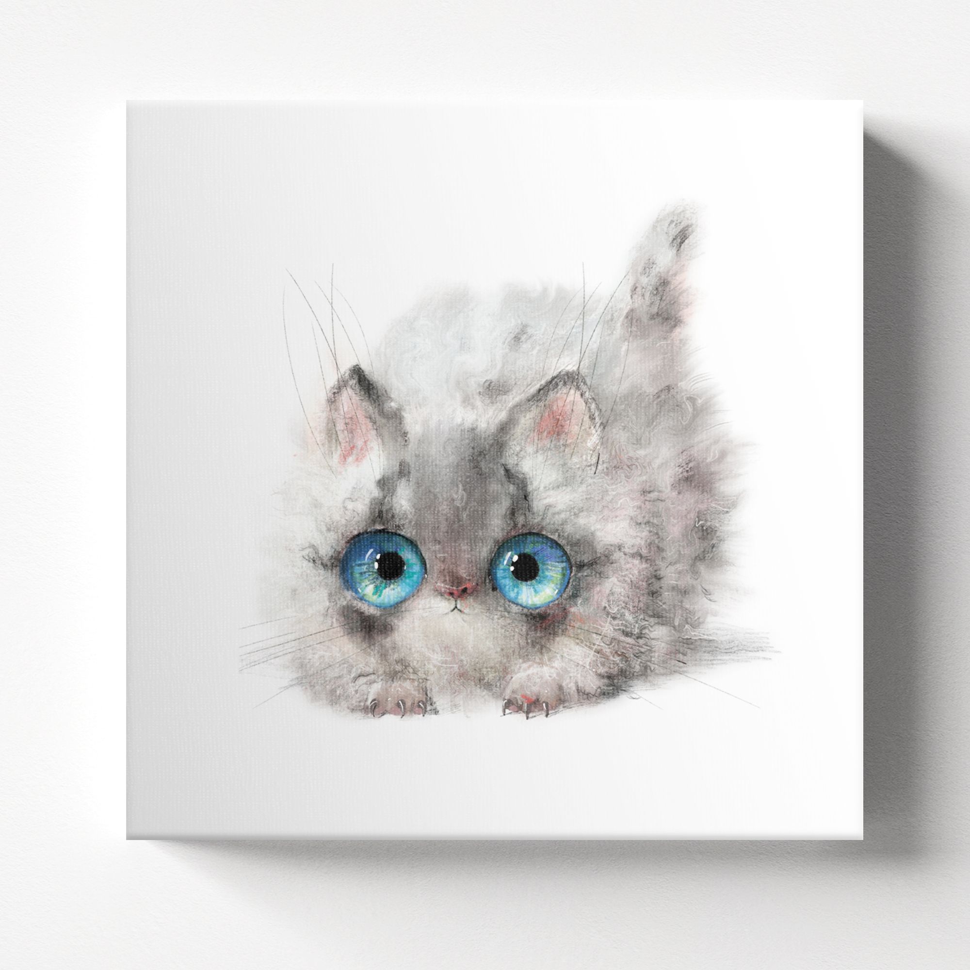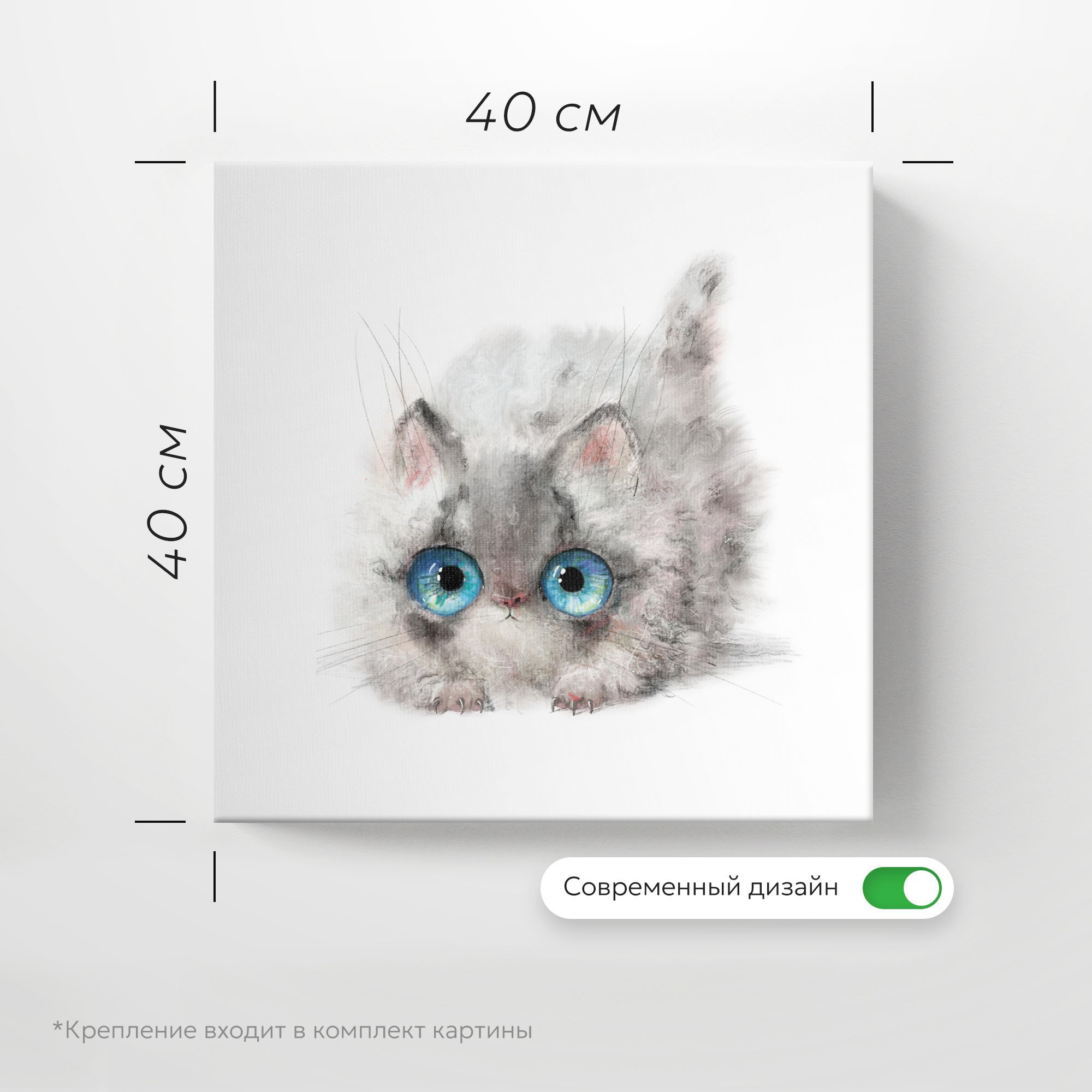 На картине изображён очаровательный пушистый котёнок, выполненный в акварельной технике. Композиция сосредоточена на мордочке и верхней части туловища животного, что создаёт эффект крупного плана и усиливает выразительность образа. Глаза — самая выразительная часть картины. Они огромные, ярко-голубые с детализированными бликами и переливами, создающими эффект живого взгляда. Зрачки чётко прорисованы, что добавляет взгляду котёнка наивности и любопытства. Фон абсолютно белый, без каких-либо деталей — это акцентирует внимание на котёнке, подчёркивает его хрупкость и невинность. Работа излучает тепло, нежность и безмятежность. Огромные глаза котёнка вызывают умиление, а мягкие акварельные переходы создают атмосферу уюта и лёгкости. Картина ассоциируется с детством, беззаботностью и искренней радостью.