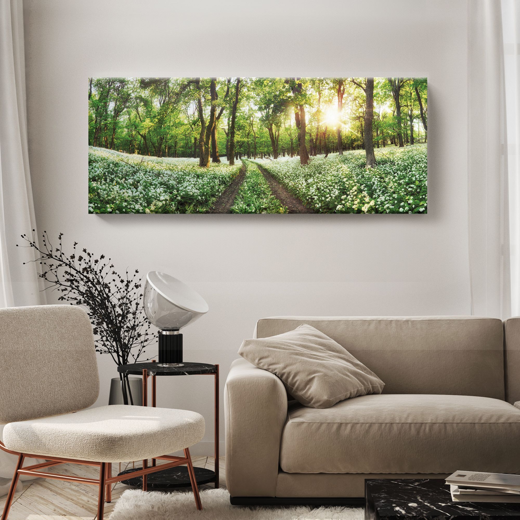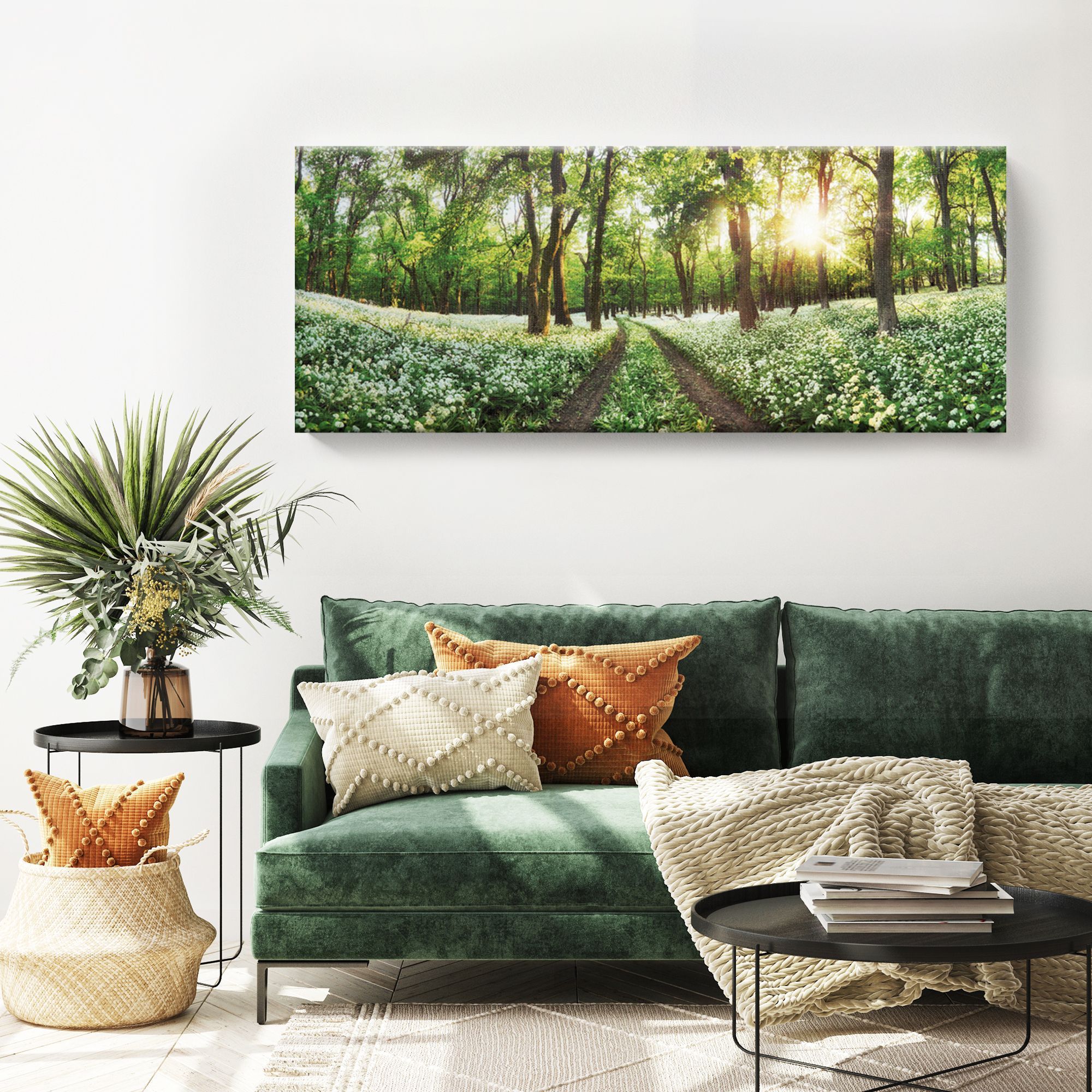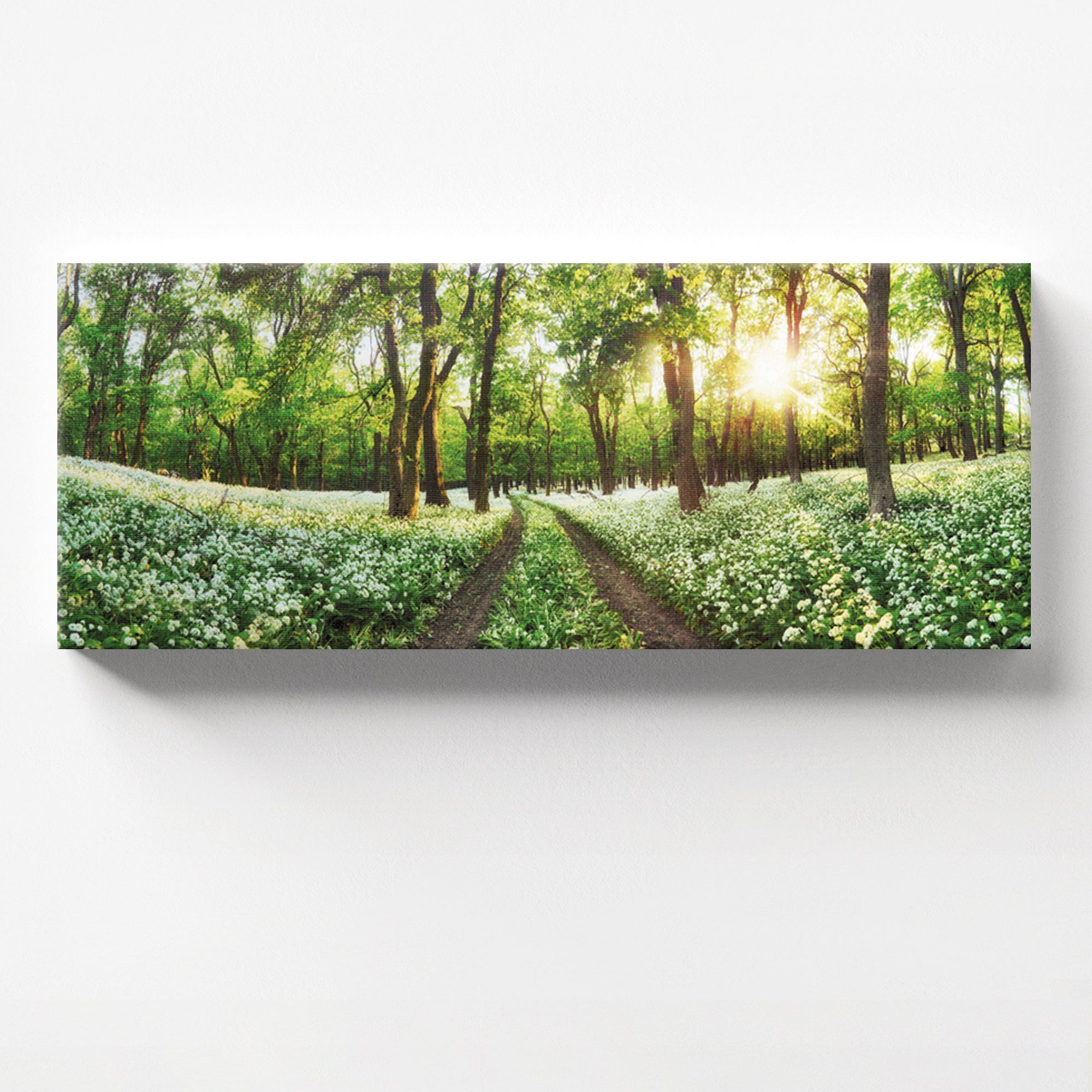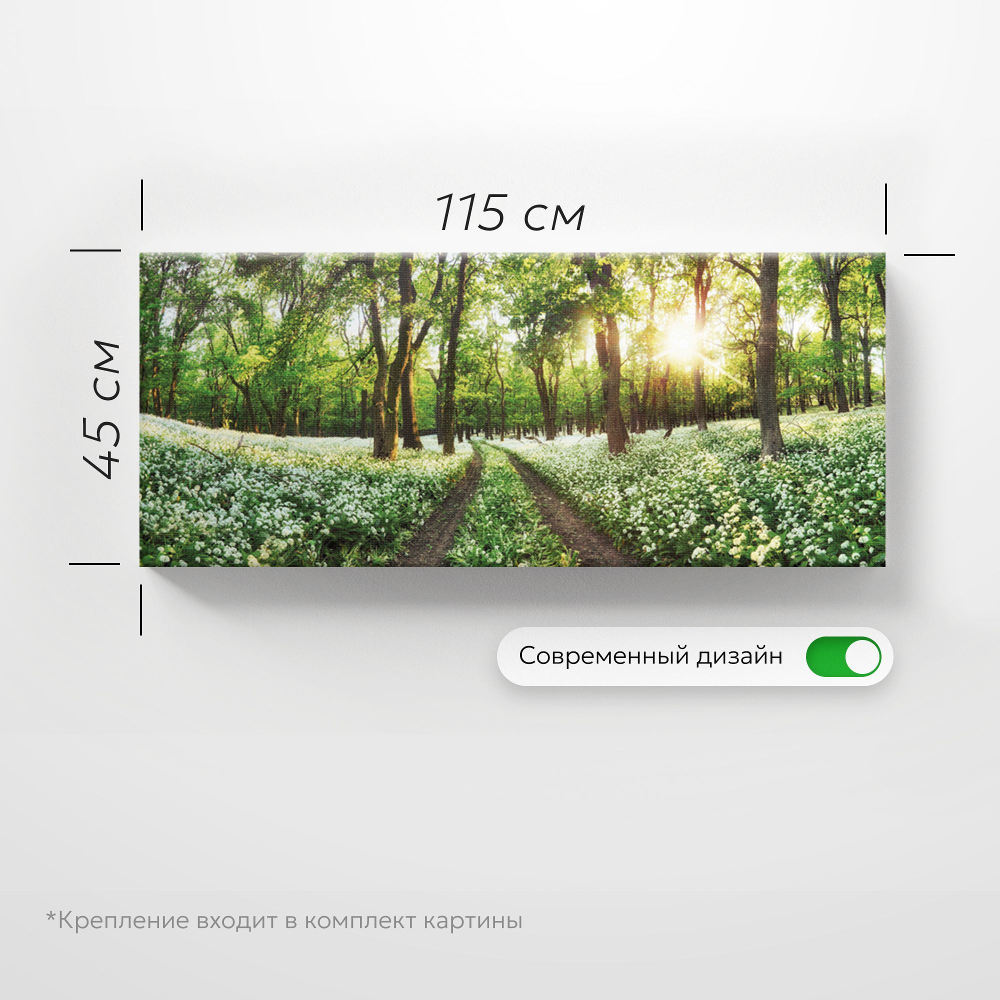 На картине изображён живописный лесной пейзаж: широкая лесная тропа уходит вдаль, обрамлённая высокими стройными деревьями с густой зелёной листвой. По обе стороны тропы раскинулись поляны, усыпанные белыми полевыми цветами, создающими ощущение свежести и лёгкости. Солнечные лучи мягко пробиваются сквозь кроны деревьев, заливая сцену тёплым золотистым светом. Композиция горизонтальная, что создаёт эффект панорамного вида, погружая зрителя в атмосферу спокойствия и умиротворения. Преобладающие цвета — зелёный, белый и золотистый, гармонично сочетающиеся между собой. Эта картина идеально впишется в интерьер с натуральными материалами, растениями и природными оттенками. Станет центральным элементом, подчёркивающим концепцию единения с природой.