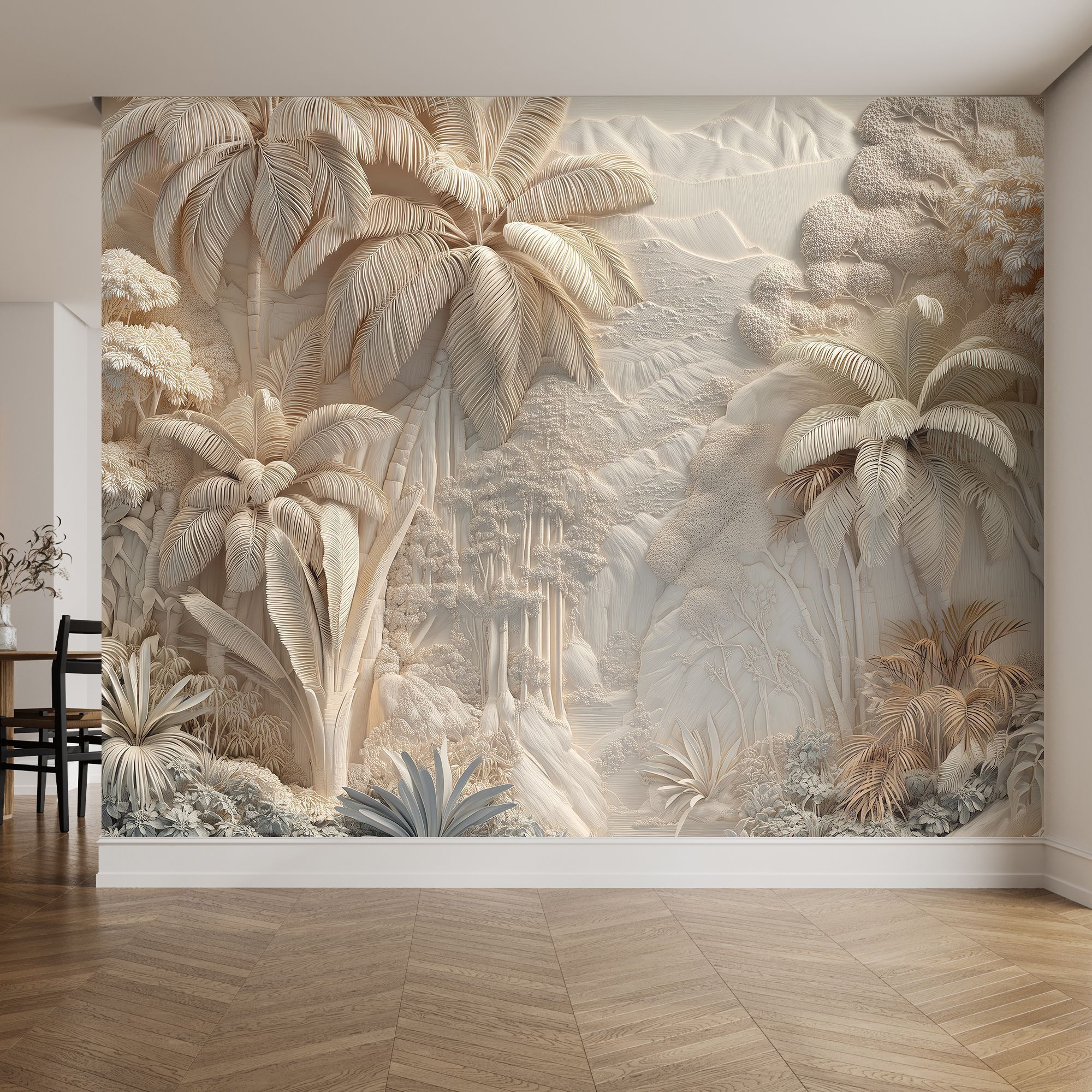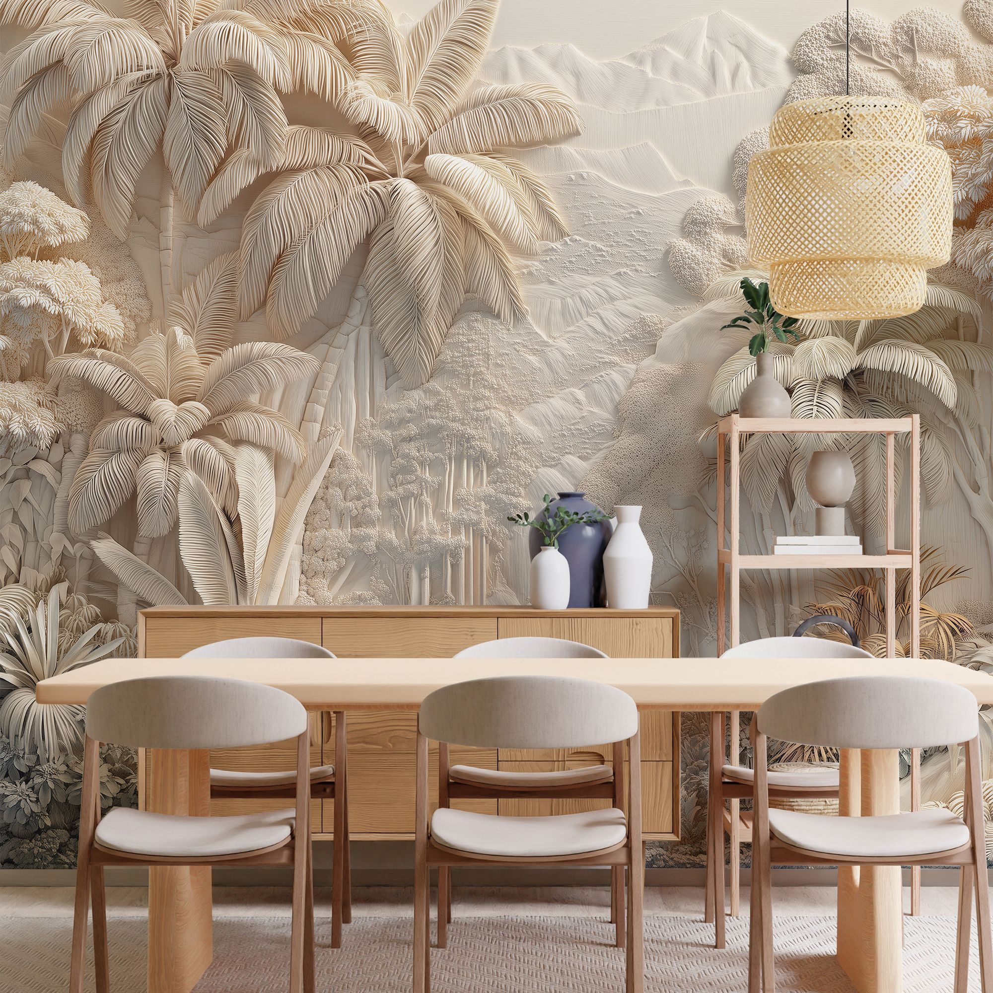 Эти фотообои — настоящее произведение искусства, воплощающее магию тропического леса в изысканной монохромной гамме. Композиция выполнена с эффектом объёмной барельефной резьбы: детально прорисованные пальмы, экзотические растения и горные контуры словно вылеплены из светлого мрамора или алебастра. Эффект трёхмерности — рельефная структура создаёт иллюзию глубины, будто стена превращается в часть природного пейзажа. Игра света и тени подчёркивает текстуру листьев и стволов. Нейтральная бежево-кремовая палитра — оттенки слоновой кости, песка и светлого дерева наполняют пространство теплом и спокойствием, не перегружая интерьер. Детализированная прорисовка — каждый лист, прожилка и завиток выполнены с ювелирной точностью, что придаёт обоям художественную ценность. Гармоничная композиция — сочетание высоких пальм, густых зарослей и далёких горных хребтов создаёт баланс между динамикой и умиротворением. Эстетика скульптурной живописи — сочетание природной тематики и художественной обработки делает дизайн универсальным и элегантным. Фотообои станут центральным акцентом, придадут интерьеру изысканность с нотками экзотики. Идеально для современных, эко- и минималистичных стилей.