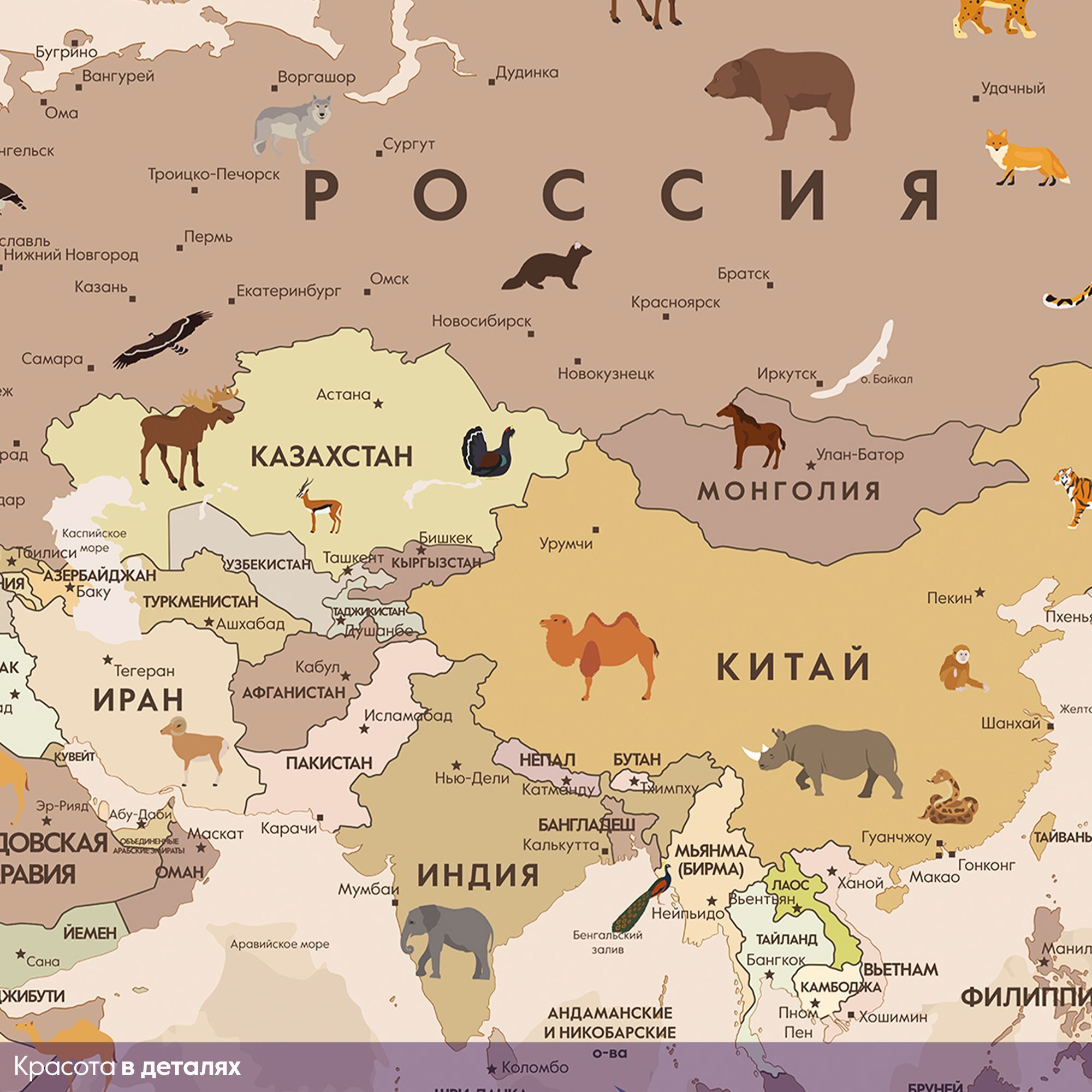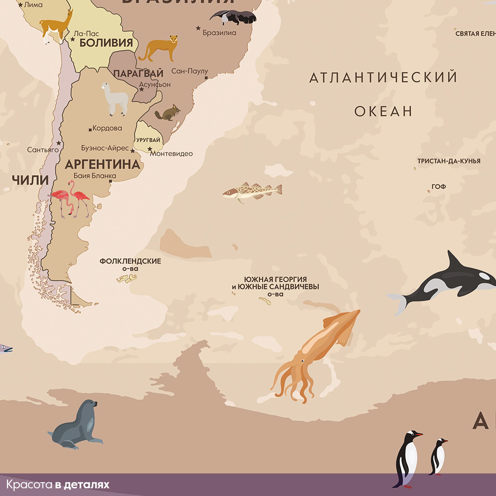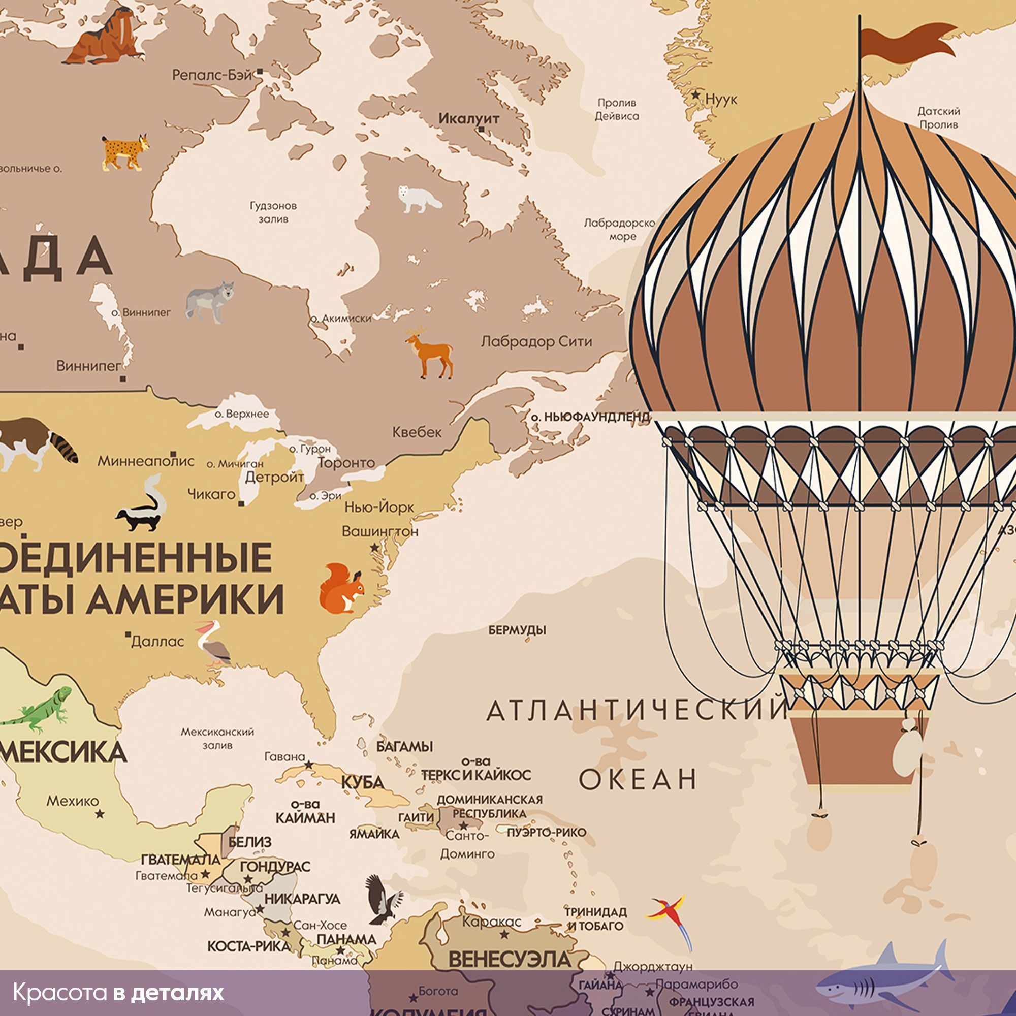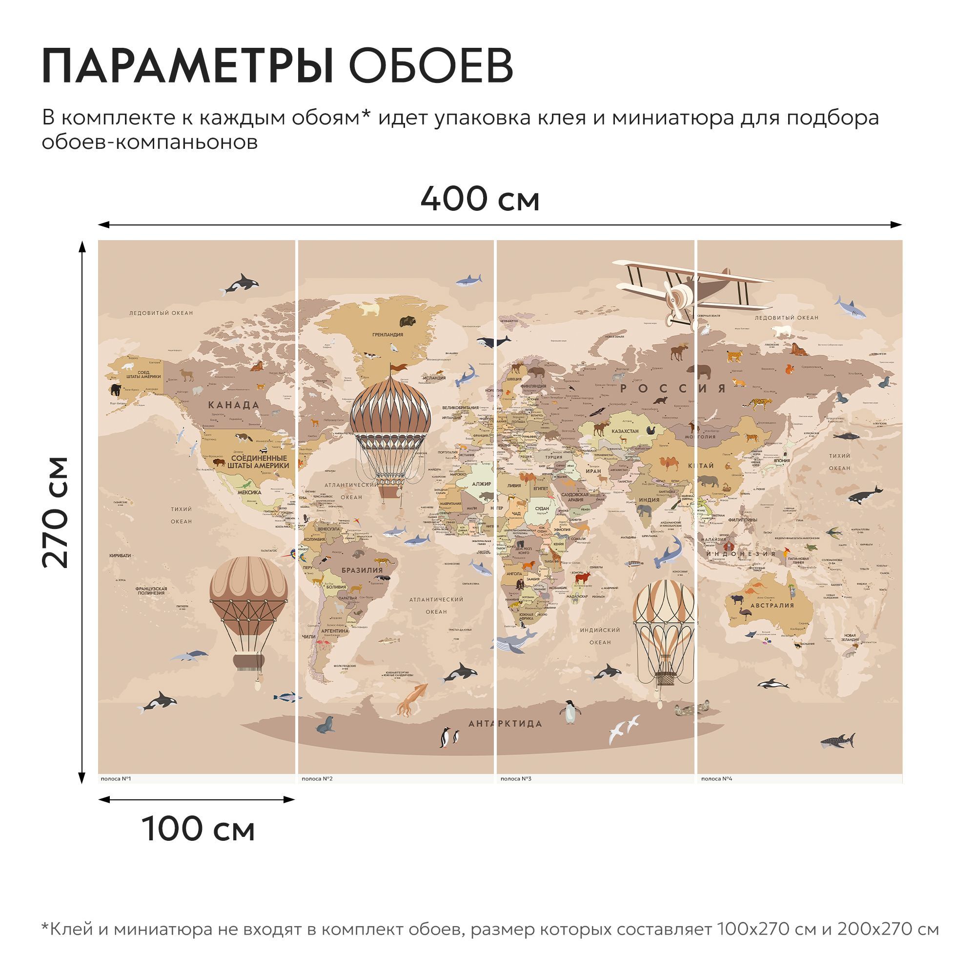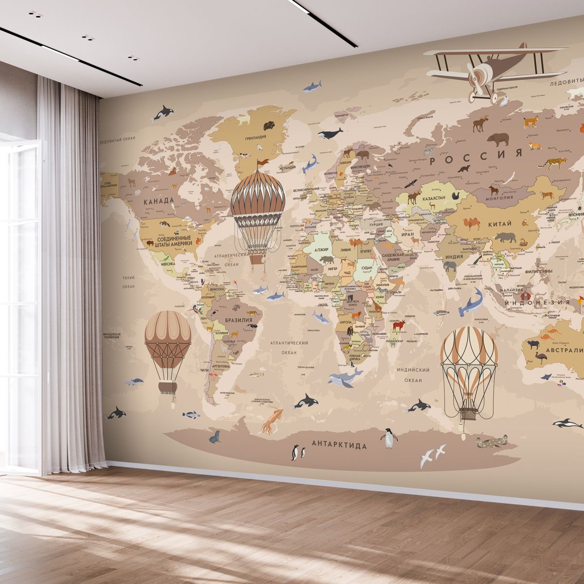 Эти фотообои — увлекательное и познавательное украшение для детской комнаты, где каждый ребёнок сможет с лёгкостью познакомиться с географией мира. Карта выполнена в мягких пастельных тонах, что создаёт спокойную и дружественную атмосферу, идеально подходящую для детского пространства. На карте изображены не только страны и континенты с подписями на русском языке, но и разнообразные животные, характерные для тех или иных регионов. Это помогает ребёнку развивать память и расширять кругозор, знакомясь с животным миром нашей планеты в игровой форме. Воздушные шары и ретро-самолёт добавляют образу элемент фантазии и путешествий, вдохновляя на мечты и исследования. Карта грамотно сочетает образовательную функцию и яркий, привлекательный дизайн, делая процесс изучения мира интересным и захватывающим. Эти фотообои создадут в детской комнате атмосферу приключения и открытий, способствуя развитию любознательности и любви к знаниям.