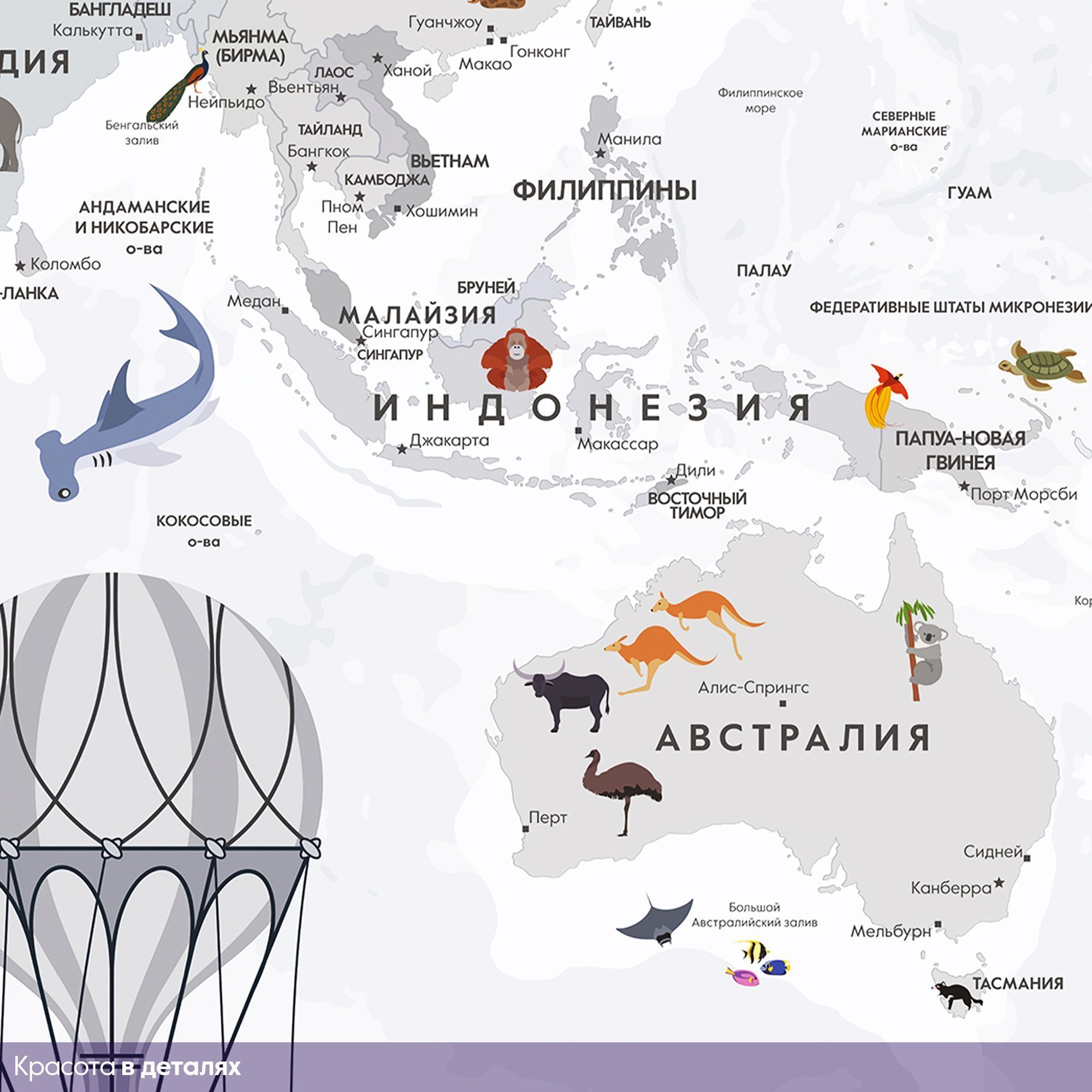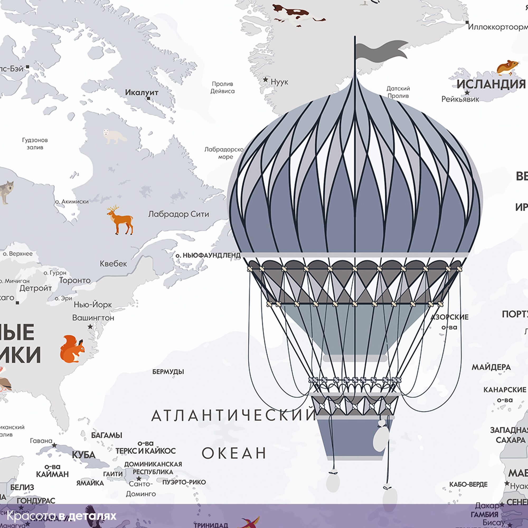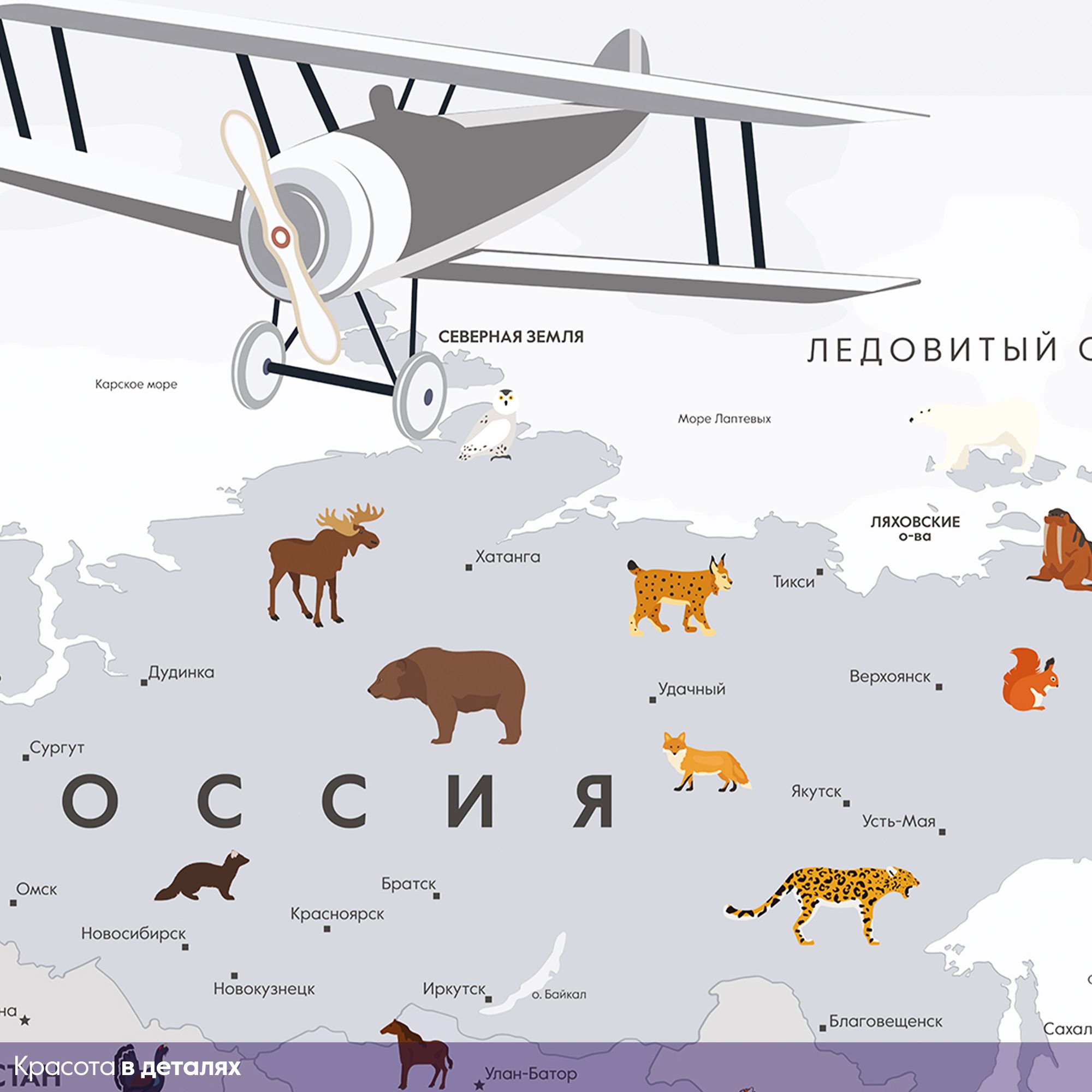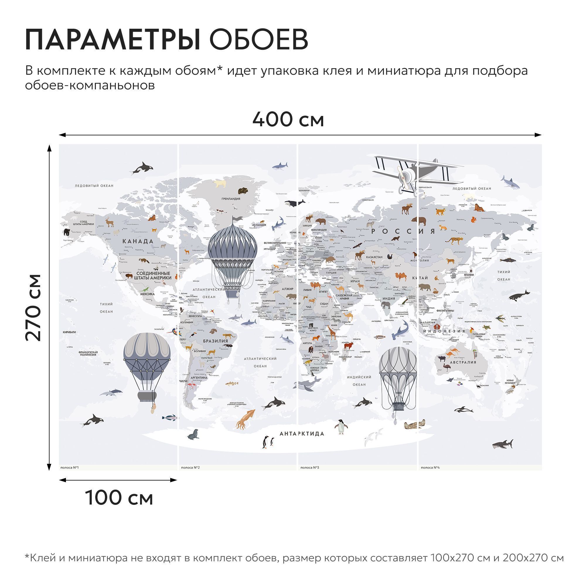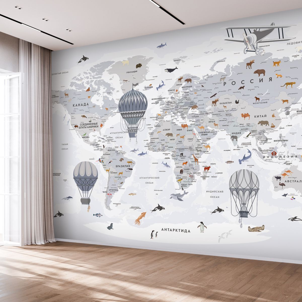 Эти фотообои — увлекательное и познавательное украшение для детской комнаты, где каждый ребёнок сможет с лёгкостью познакомиться с географией мира. Карта выполнена в мягких пастельных тонах, что создаёт спокойную и дружественную атмосферу, идеально подходящую для детского пространства. На карте изображены не только страны и континенты с подписями на русском языке, но и разнообразные животные, характерные для тех или иных регионов. Это помогает ребёнку развивать память и расширять кругозор, знакомясь с животным миром нашей планеты в игровой форме. Воздушные шары и ретро-самолёт добавляют образу элемент фантазии и путешествий, вдохновляя на мечты и исследования. Карта грамотно сочетает образовательную функцию и яркий, привлекательный дизайн, делая процесс изучения мира интересным и захватывающим. Эти фотообои создадут в детской комнате атмосферу приключения и открытий, способствуя развитию любознательности и любви к знаниям.