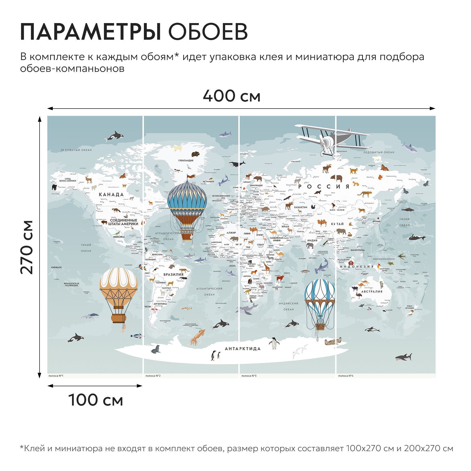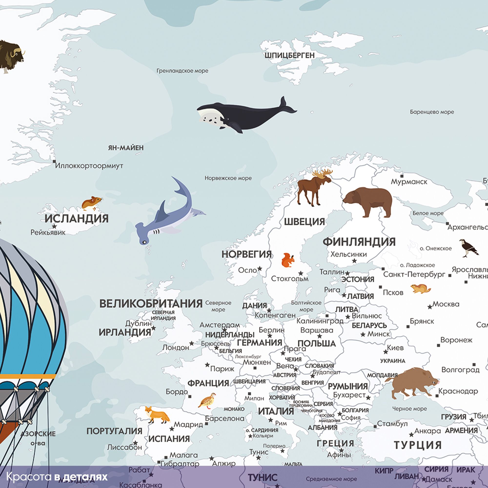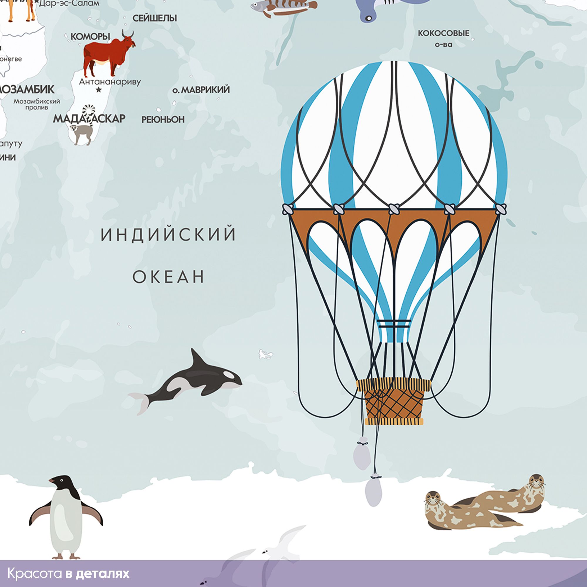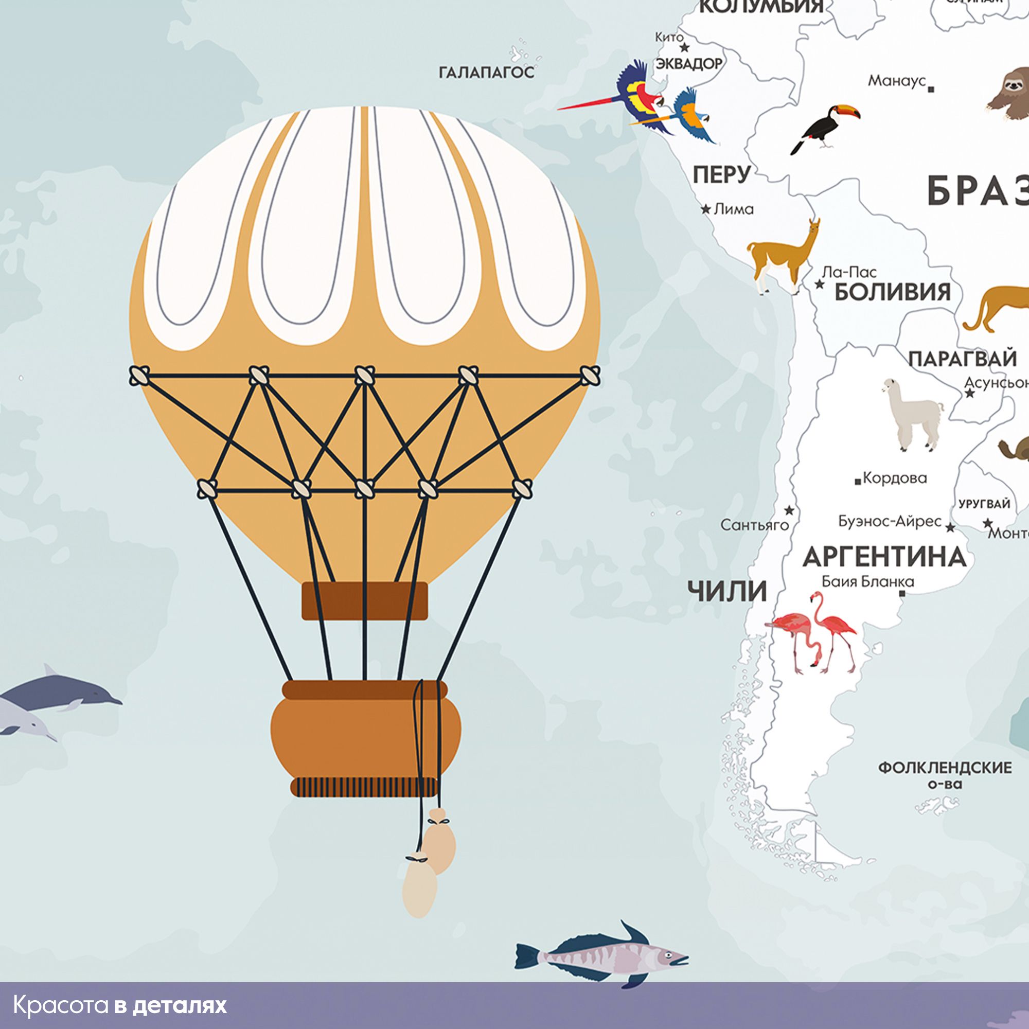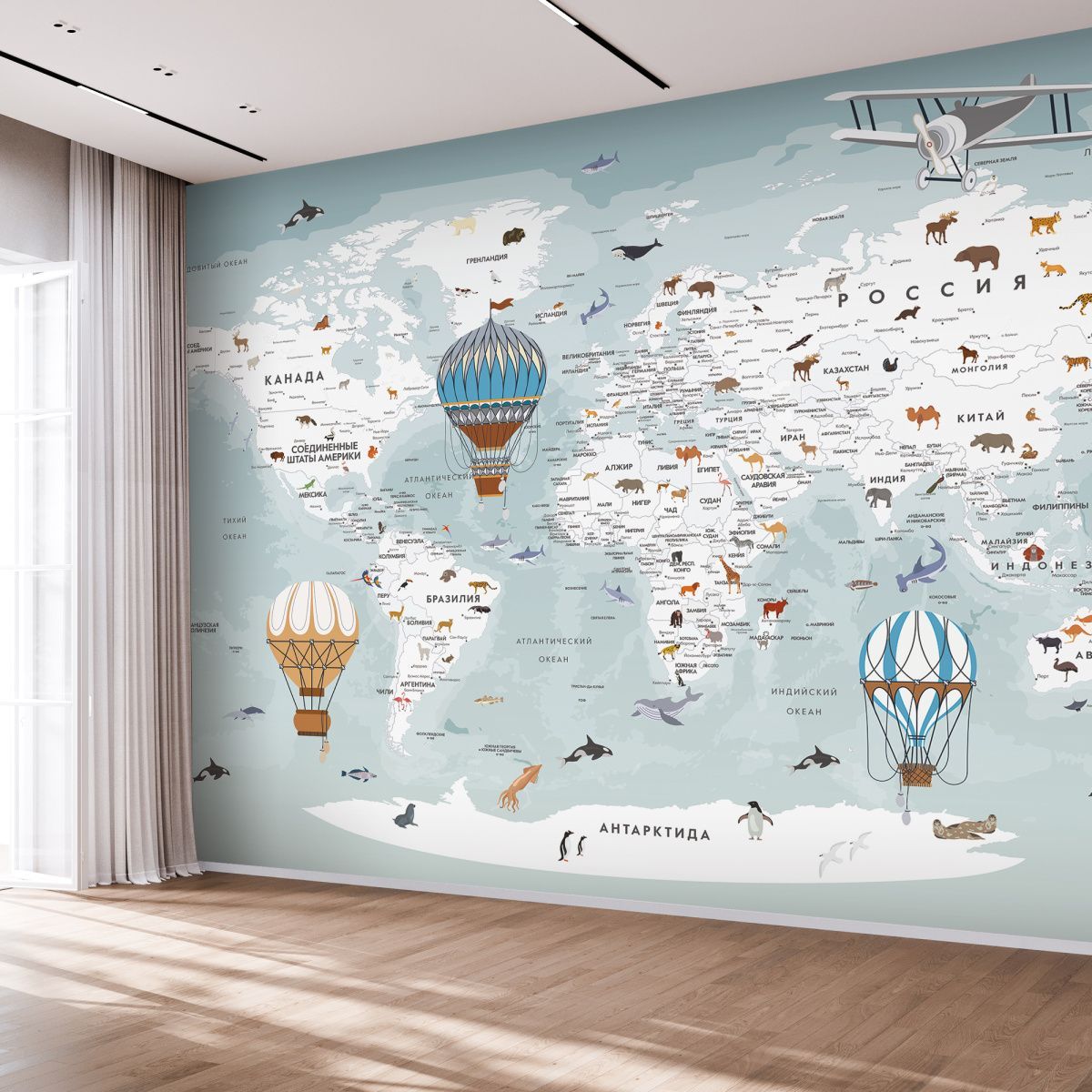 Эти фотообои — увлекательное и яркое путешествие по планете. Изящная карта мира выполнена в светлой, спокойной цветовой гамме, создавая атмосферу лёгкости и гармонии. На изображении аккуратно обозначены страны, моря и океаны с подписями на русском языке. Особое очарование придают детализированные изображения животных, характерных для каждого региона, а также старинные воздушные шары и самолёт, символизирующие дух исследования и приключений. Такой дизайн идеально подходит для детских и образовательных пространств, развивая познания и интерес к географии и природе. Фотообои способствуют расширению кругозора и пробуждают чувство любознательности, делая интерьер не только декоративным, но и познавательным.