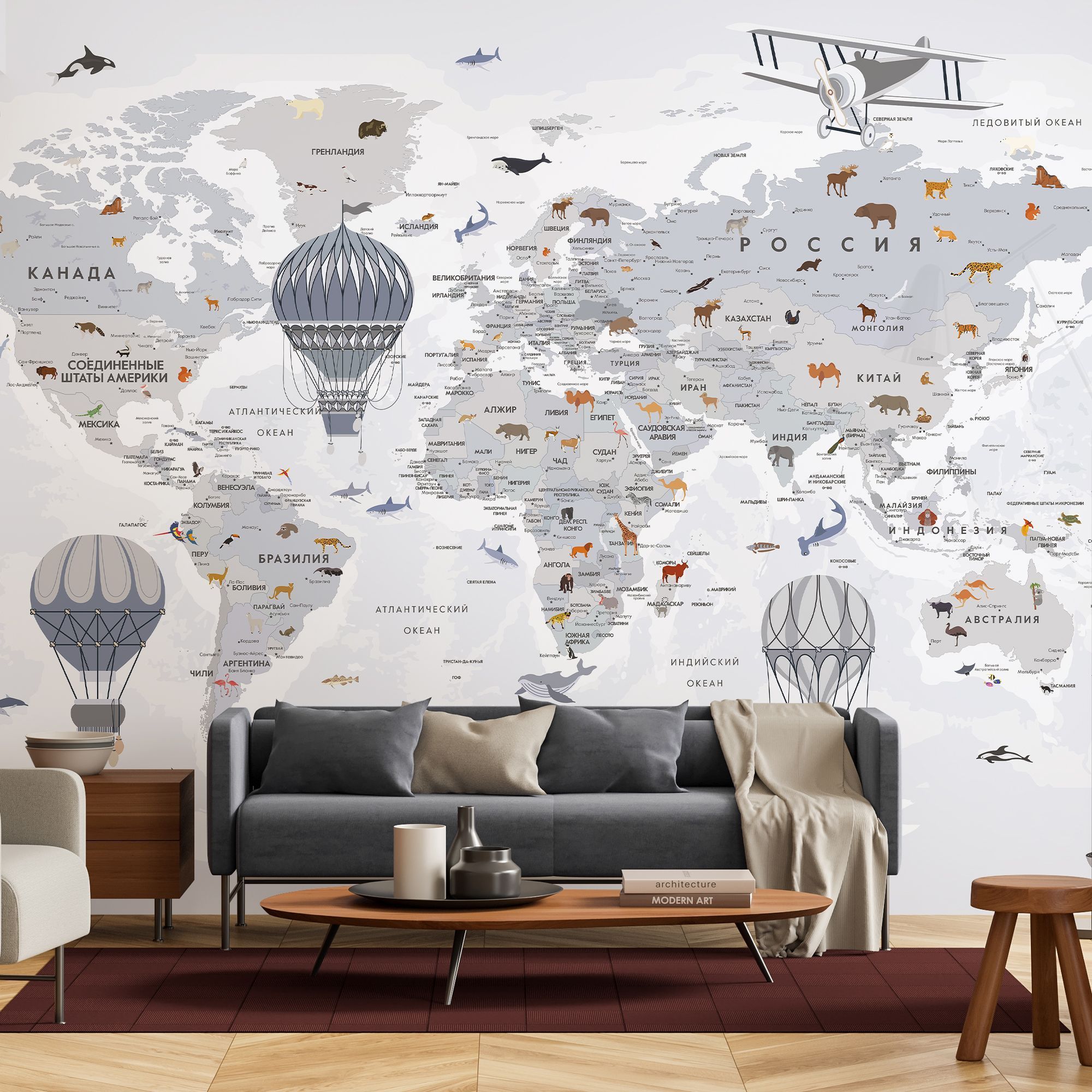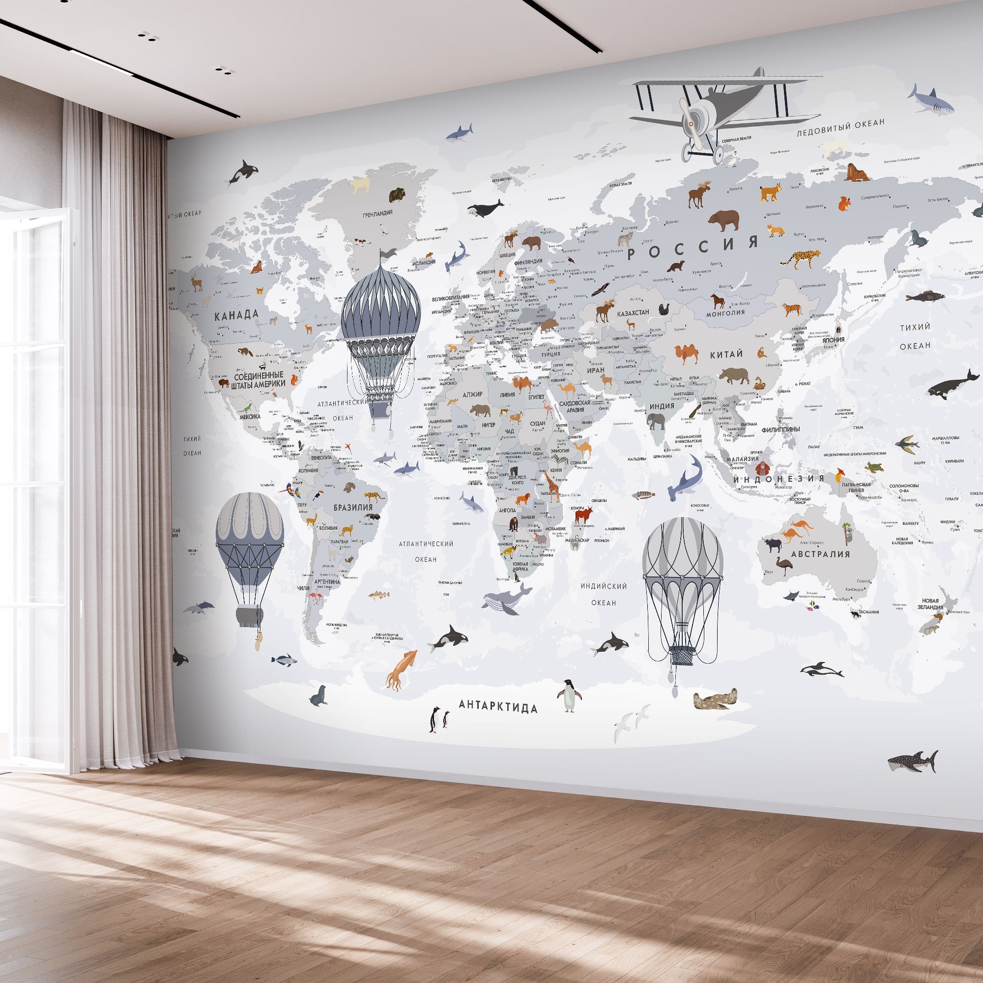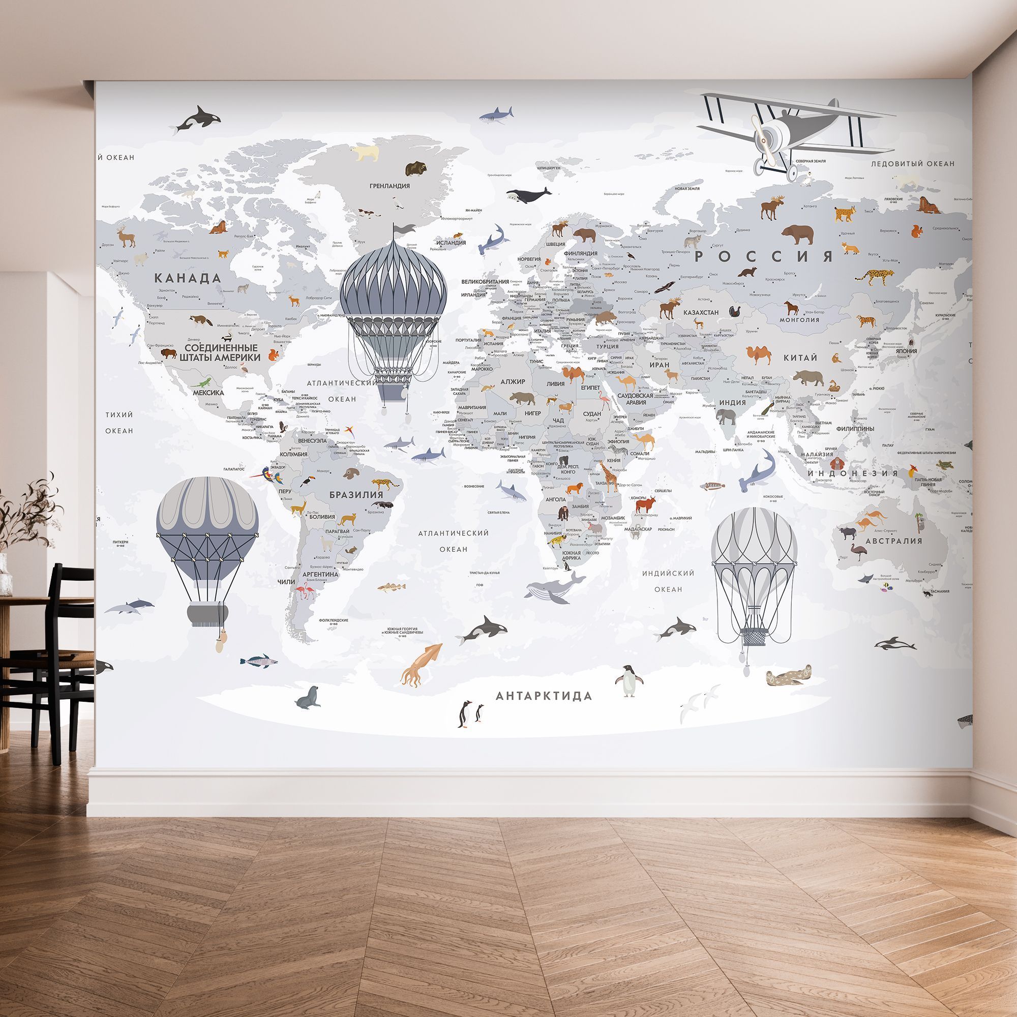 Эти фотообои — увлекательное и яркое путешествие по планете. Изящная карта мира выполнена в светлой, спокойной цветовой гамме, создавая атмосферу лёгкости и гармонии. На изображении аккуратно обозначены страны, моря и океаны с подписями на русском языке. Особое очарование придают детализированные изображения животных, характерных для каждого региона, а также старинные воздушные шары и самолёт, символизирующие дух исследования и приключений. Такой дизайн идеально подходит для детских и образовательных пространств, развивая познания и интерес к географии и природе. Фотообои способствуют расширению кругозора и пробуждают чувство любознательности, делая интерьер не только декоративным, но и познавательным.