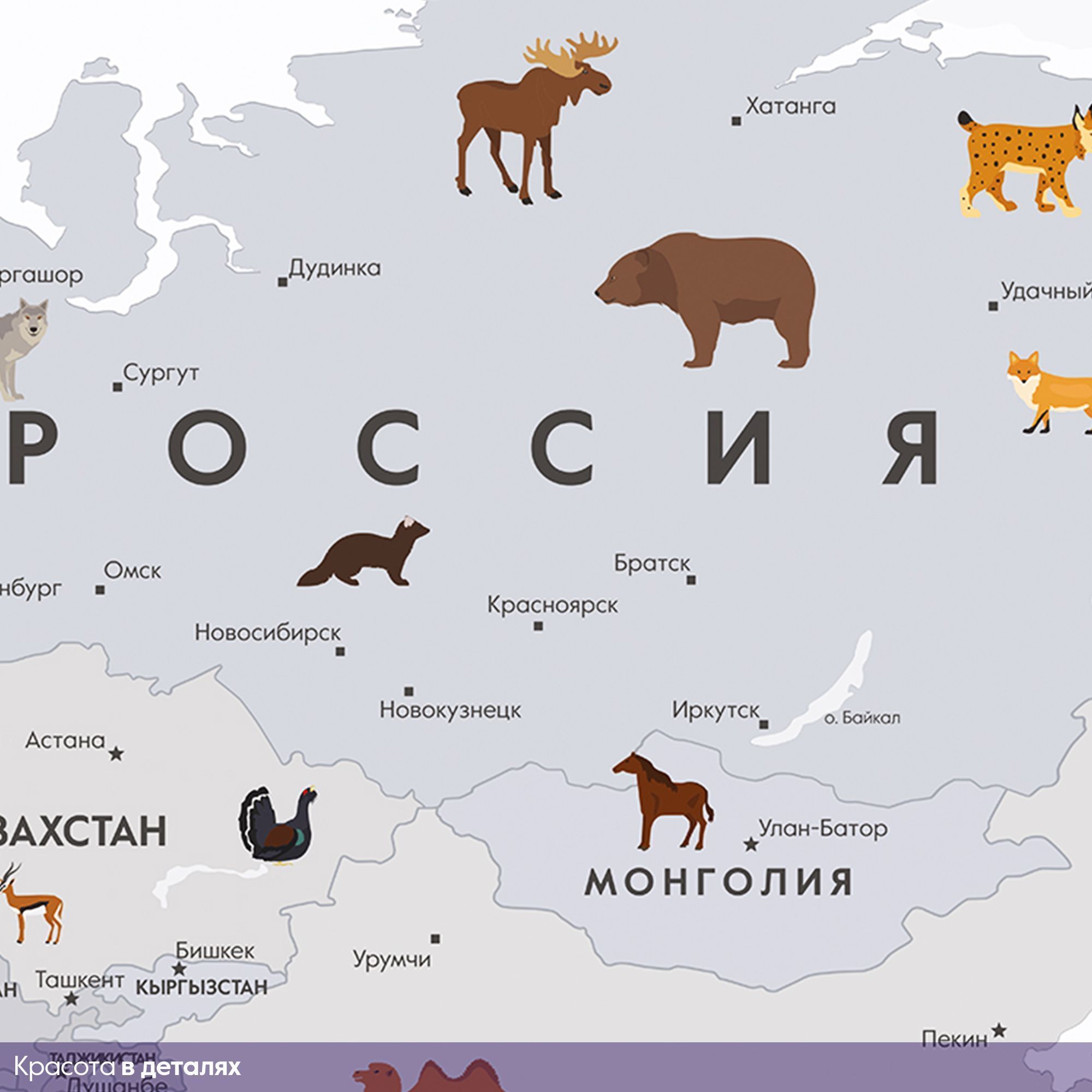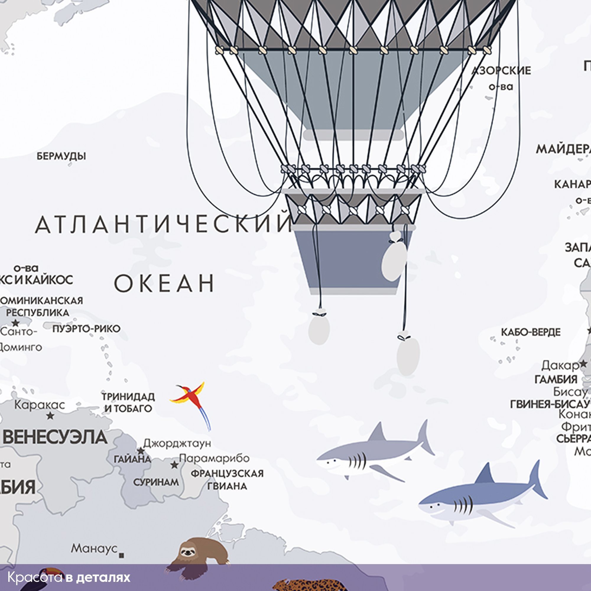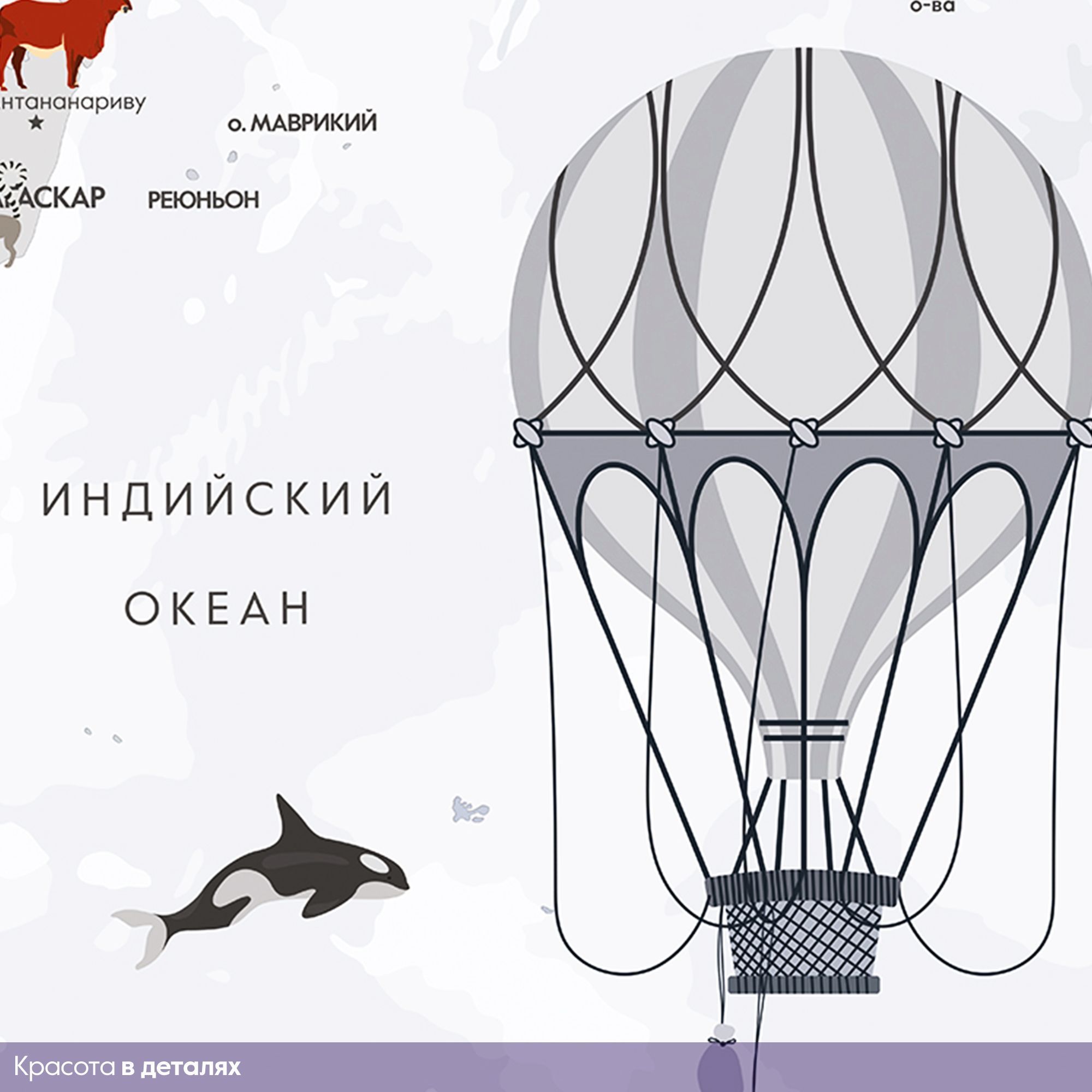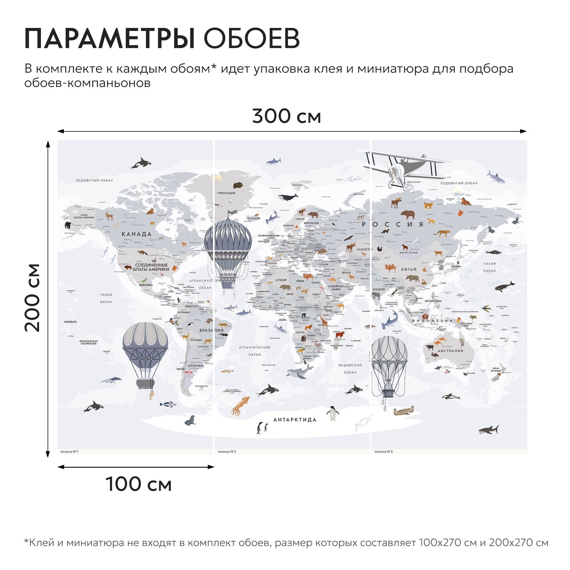 Эти фотообои — увлекательное и яркое путешествие по планете. Изящная карта мира выполнена в светлой, спокойной цветовой гамме, создавая атмосферу лёгкости и гармонии. На изображении аккуратно обозначены страны, моря и океаны с подписями на русском языке. Особое очарование придают детализированные изображения животных, характерных для каждого региона, а также старинные воздушные шары и самолёт, символизирующие дух исследования и приключений. Такой дизайн идеально подходит для детских и образовательных пространств, развивая познания и интерес к географии и природе. Фотообои способствуют расширению кругозора и пробуждают чувство любознательности, делая интерьер не только декоративным, но и познавательным.