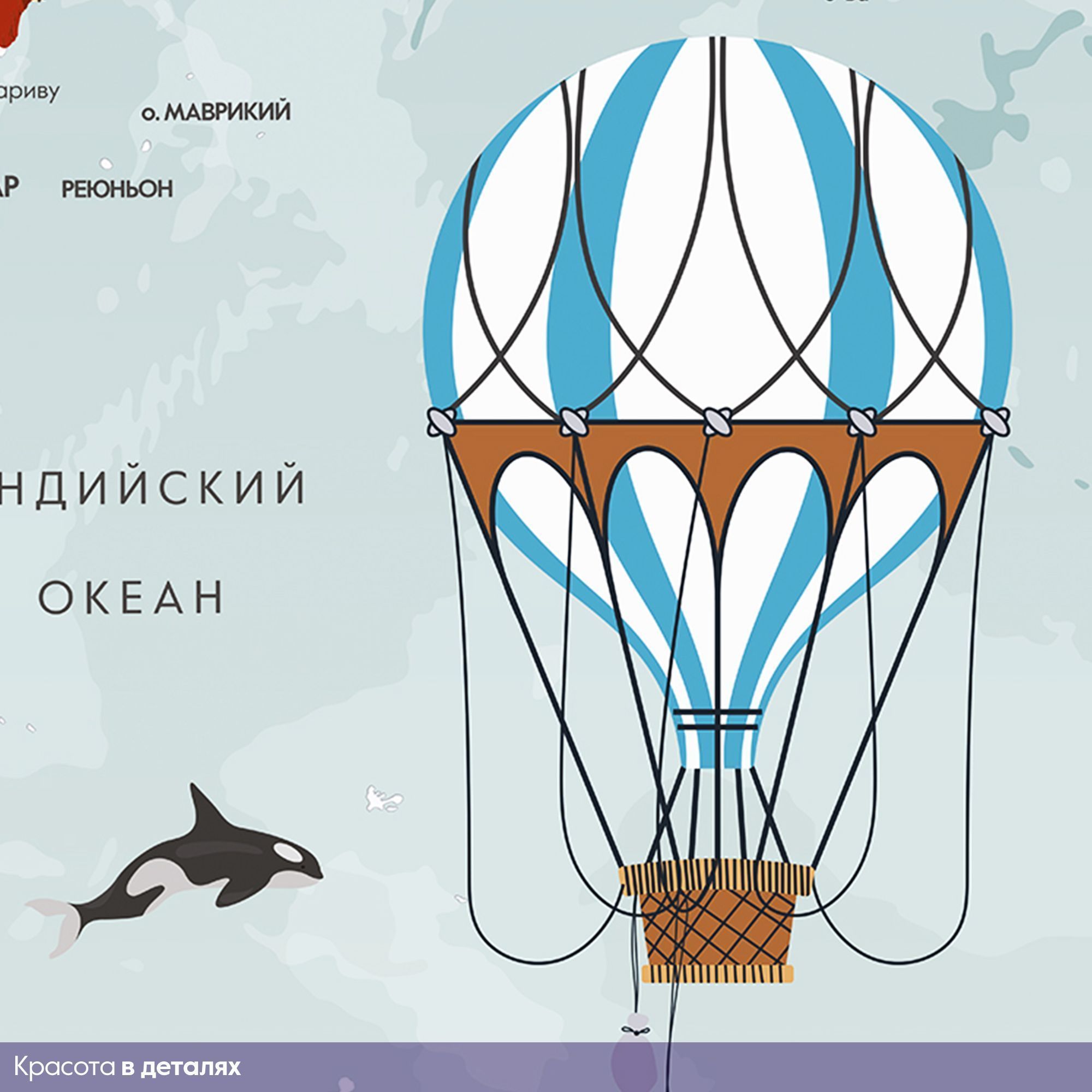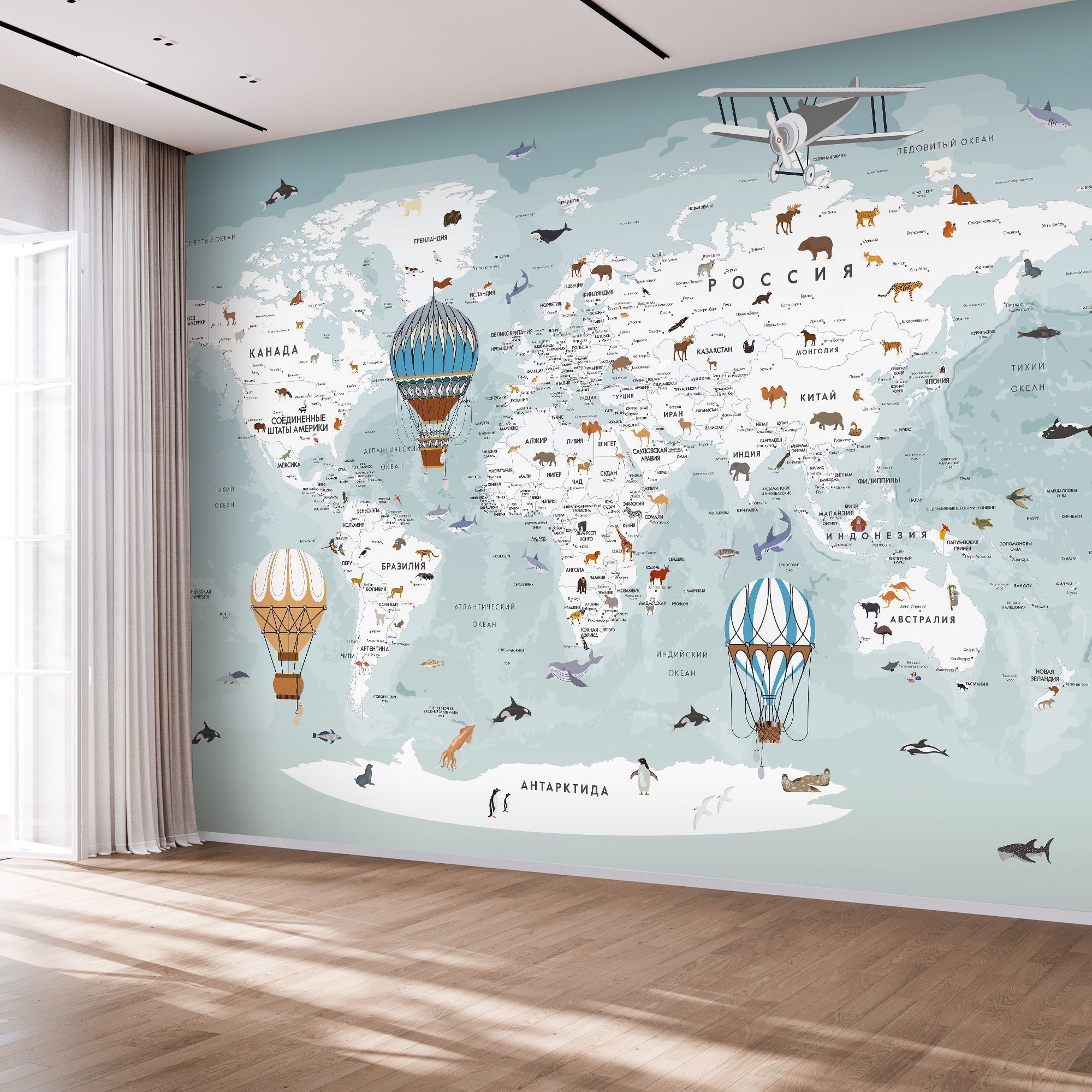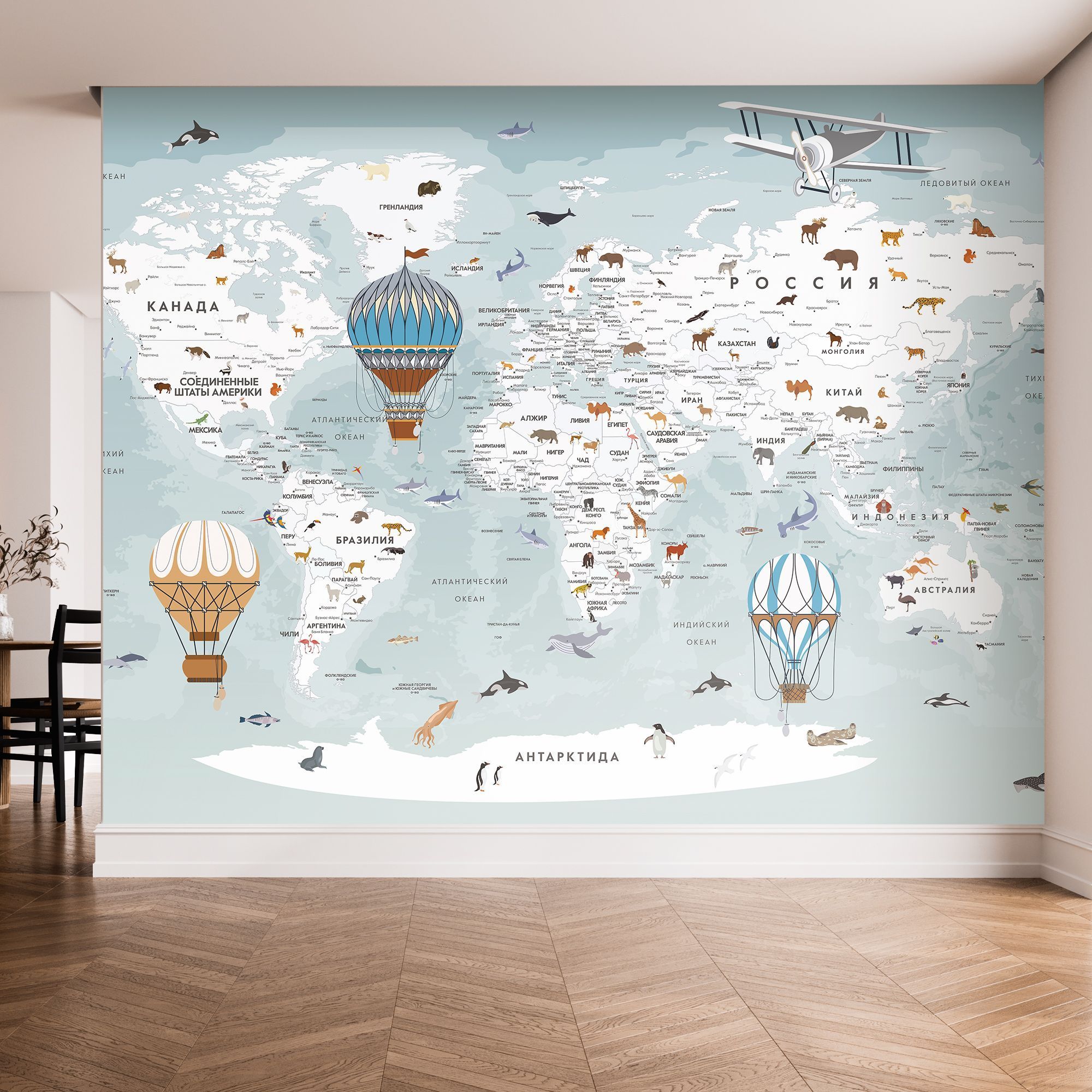 Эти фотообои — увлекательное и яркое путешествие по планете. Изящная карта мира выполнена в светлой, спокойной цветовой гамме, создавая атмосферу лёгкости и гармонии. На изображении аккуратно обозначены страны, моря и океаны с подписями на русском языке. Особое очарование придают детализированные изображения животных, характерных для каждого региона, а также старинные воздушные шары и самолёт, символизирующие дух исследования и приключений. Такой дизайн идеально подходит для детских и образовательных пространств, развивая познания и интерес к географии и природе. Фотообои способствуют расширению кругозора и пробуждают чувство любознательности, делая интерьер не только декоративным, но и познавательным.