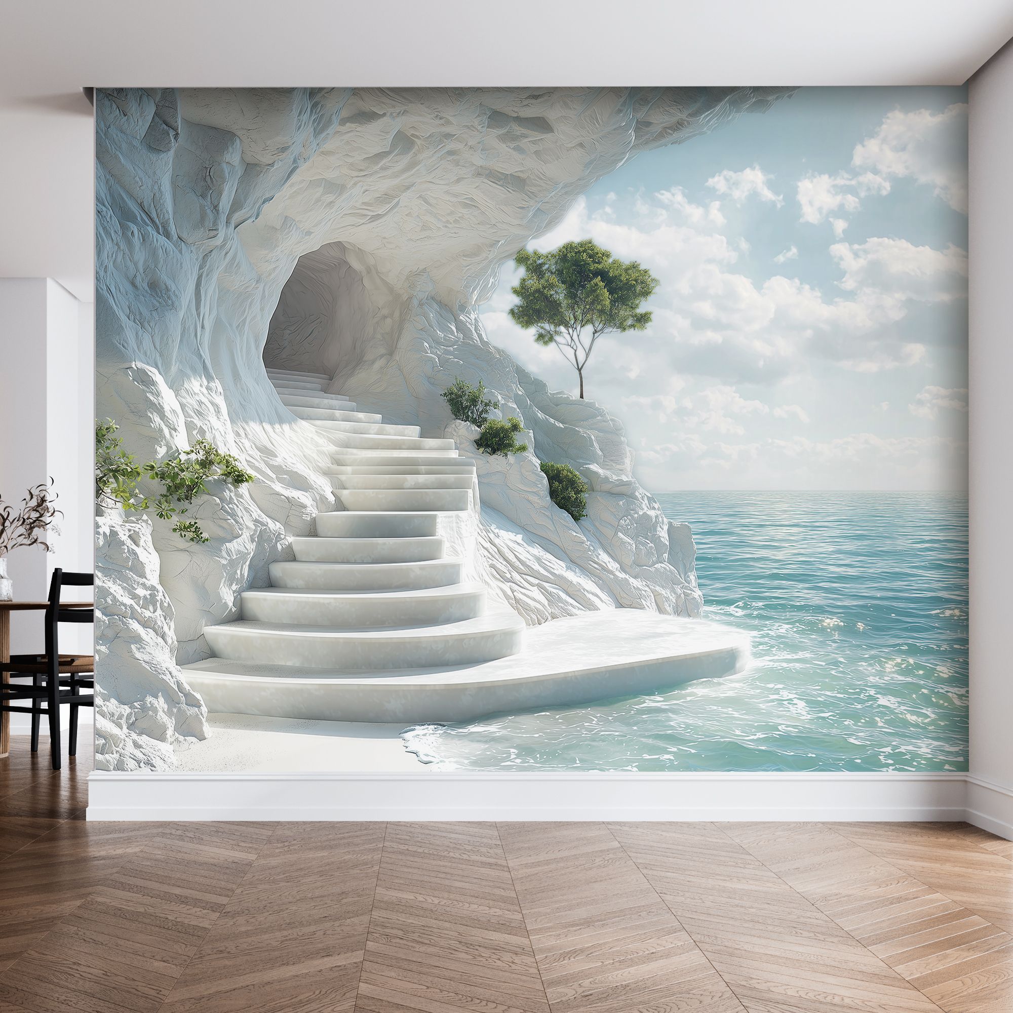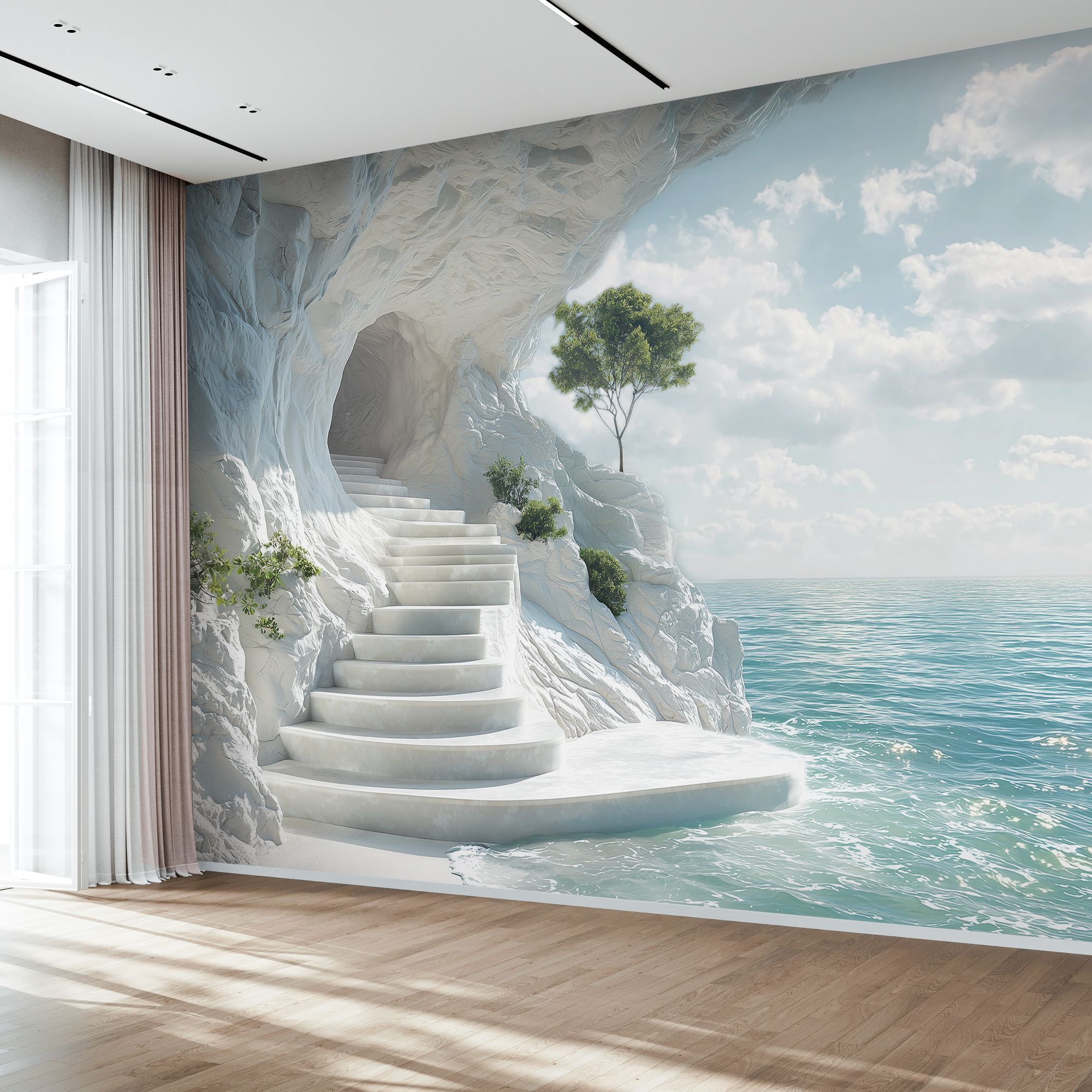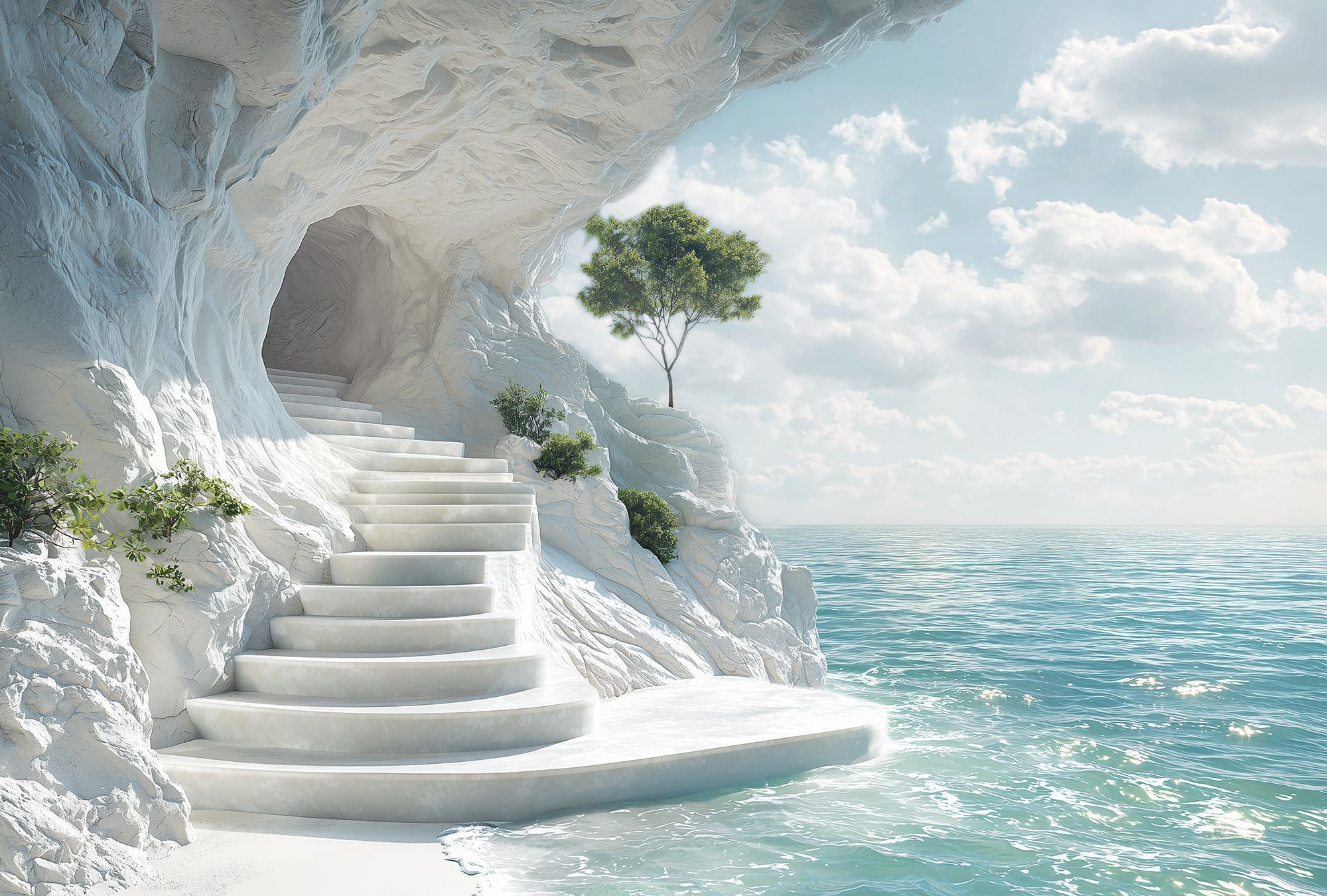 На этих фотообоях изображён фантастический пейзаж с белоснежной пещерой, состоящей из величественных арок, напоминающих архитектурное чудо природы. Белые стены создают ощущение чистоты и свежести, а через арки виднеется спокойная лазурная вода, переходящая в бескрайний океан под светлым небом с лёгкими облаками. По краям фотообоев растут пышные тропические растения — пальмы и кустарники, придающие живой зелёный акцент и контраст белоснежным каменным стенам. Такие фотообои создают атмосферу умиротворённости и расширяют пространство комнаты, будто открывая окно в волшебный морской пейзаж.