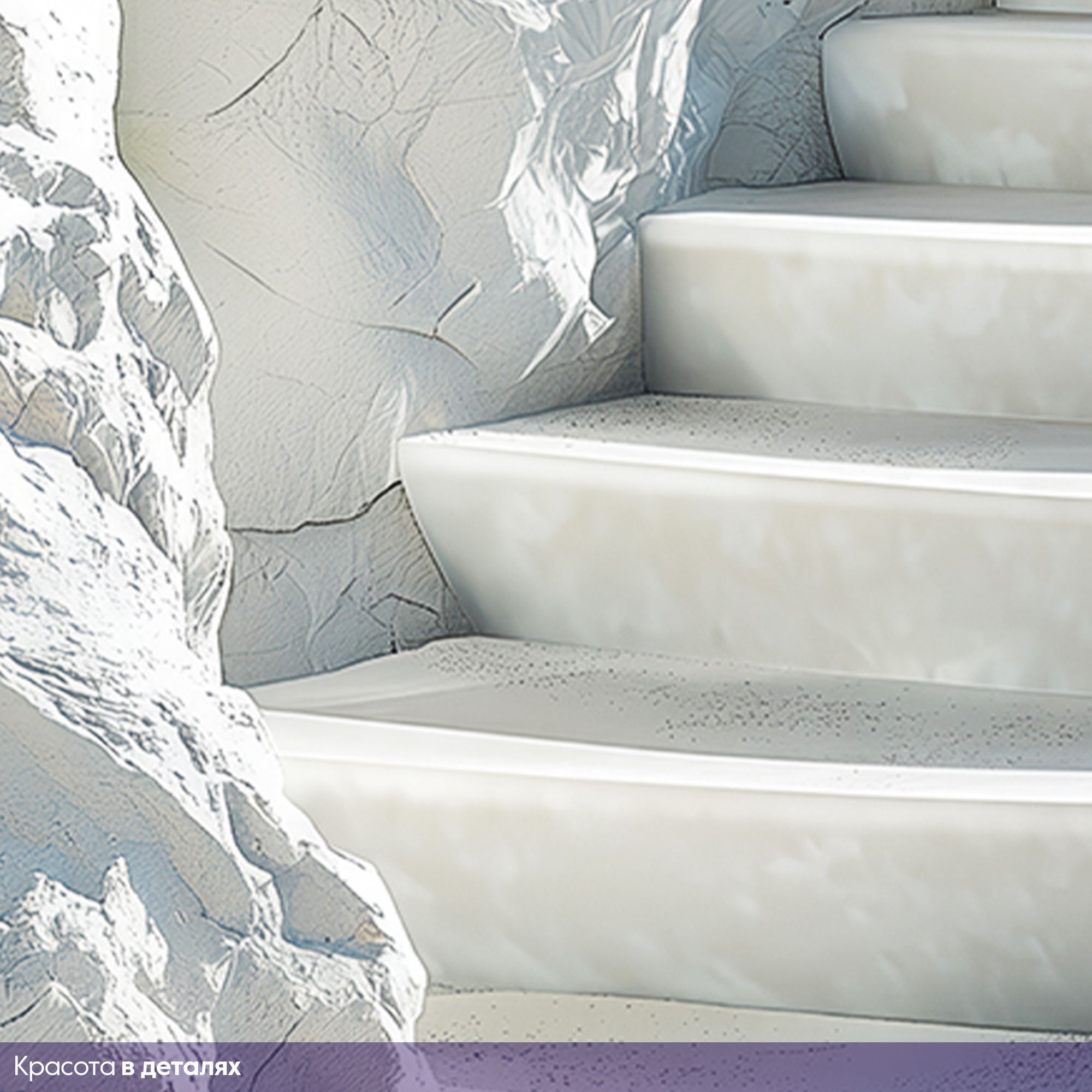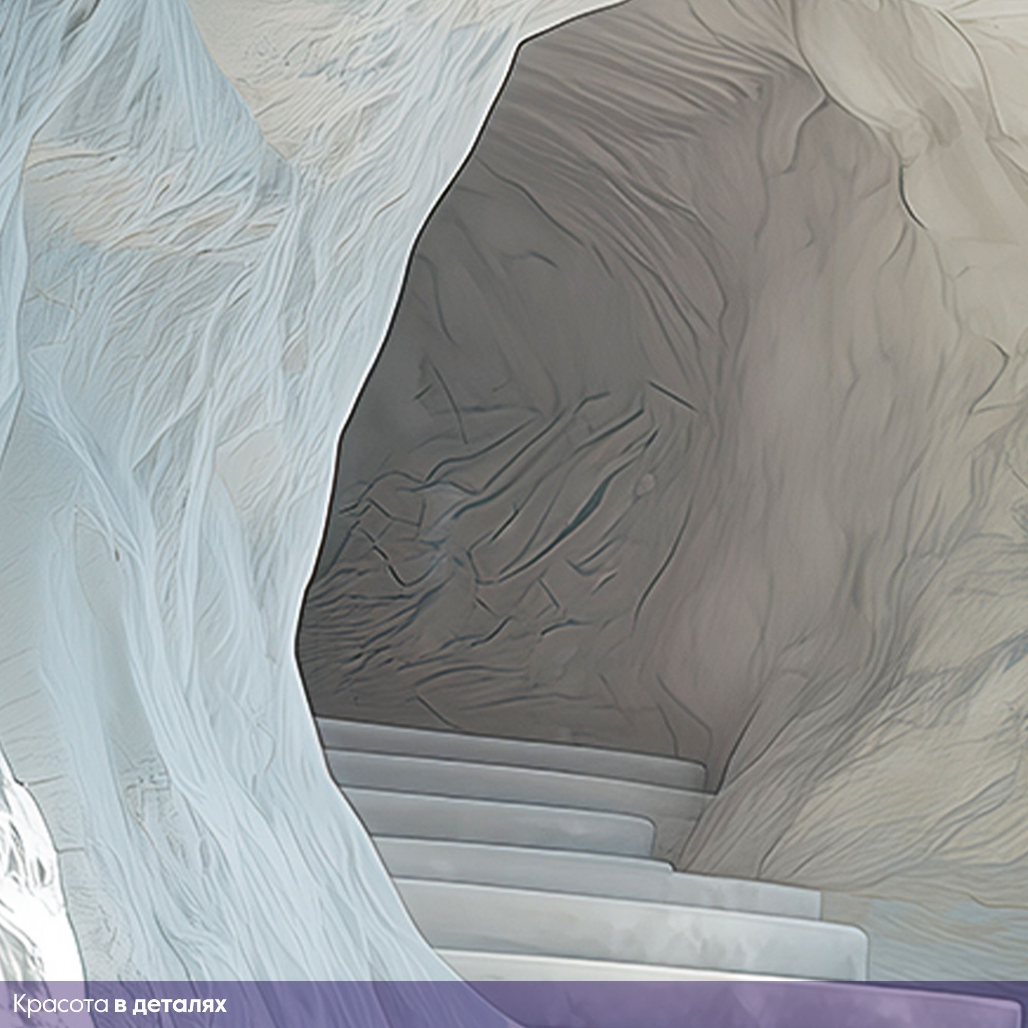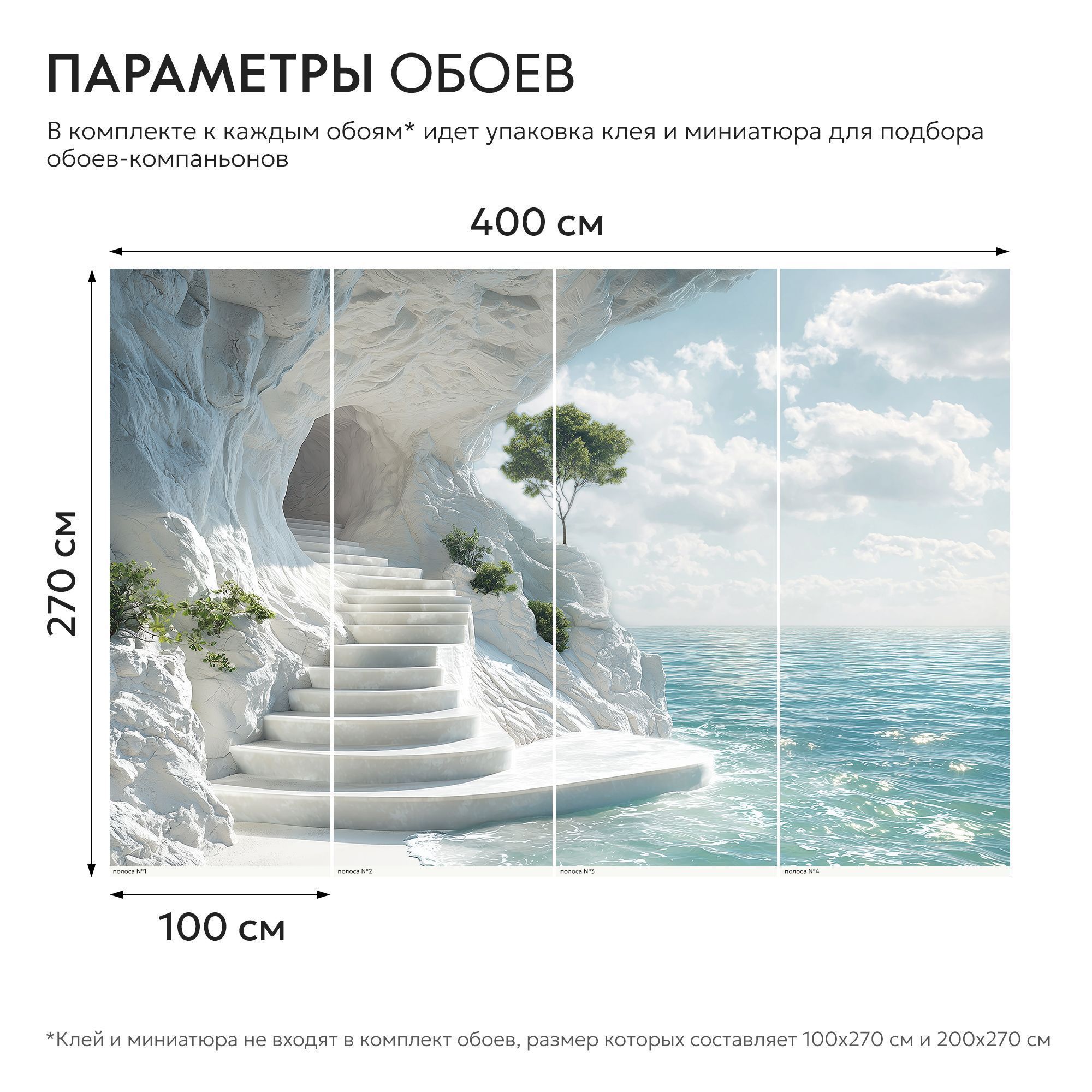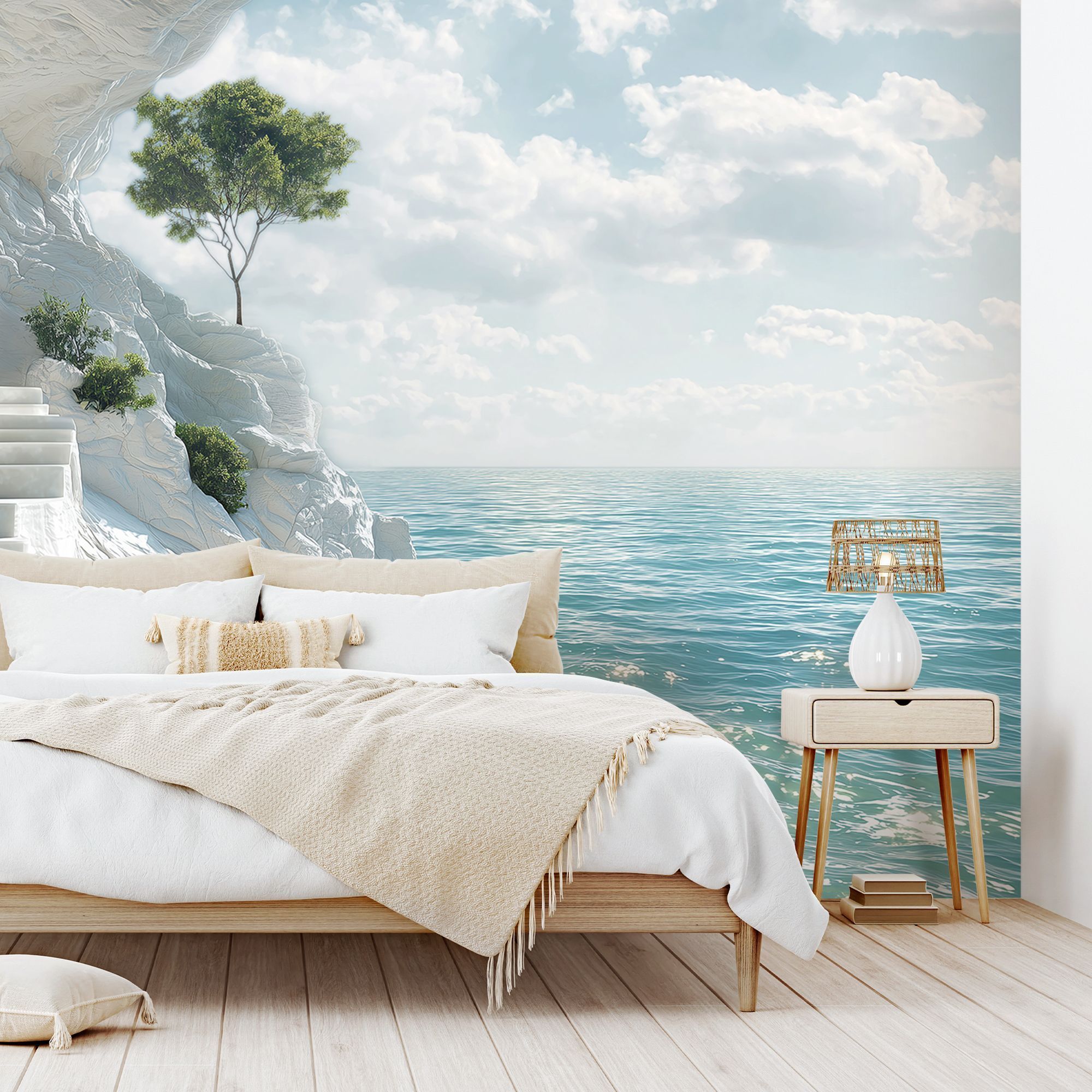 На этих фотообоях изображён фантастический пейзаж с белоснежной пещерой, состоящей из величественных арок, напоминающих архитектурное чудо природы. Белые стены создают ощущение чистоты и свежести, а через арки виднеется спокойная лазурная вода, переходящая в бескрайний океан под светлым небом с лёгкими облаками. По краям фотообоев растут пышные тропические растения — пальмы и кустарники, придающие живой зелёный акцент и контраст белоснежным каменным стенам. Такие фотообои создают атмосферу умиротворённости и расширяют пространство комнаты, будто открывая окно в волшебный морской пейзаж.