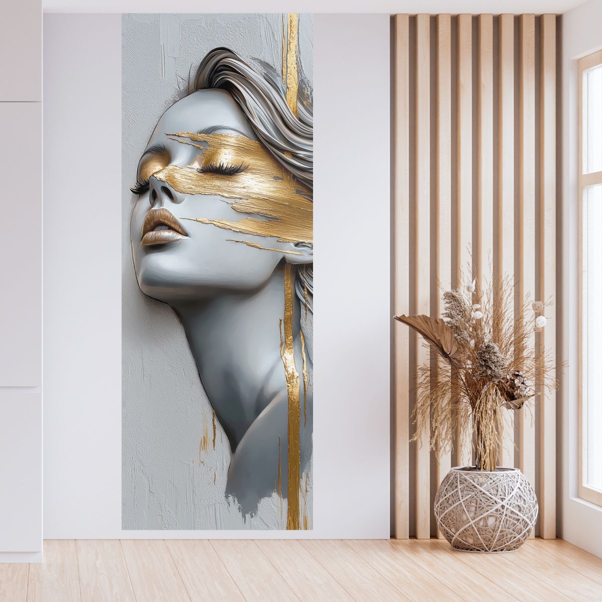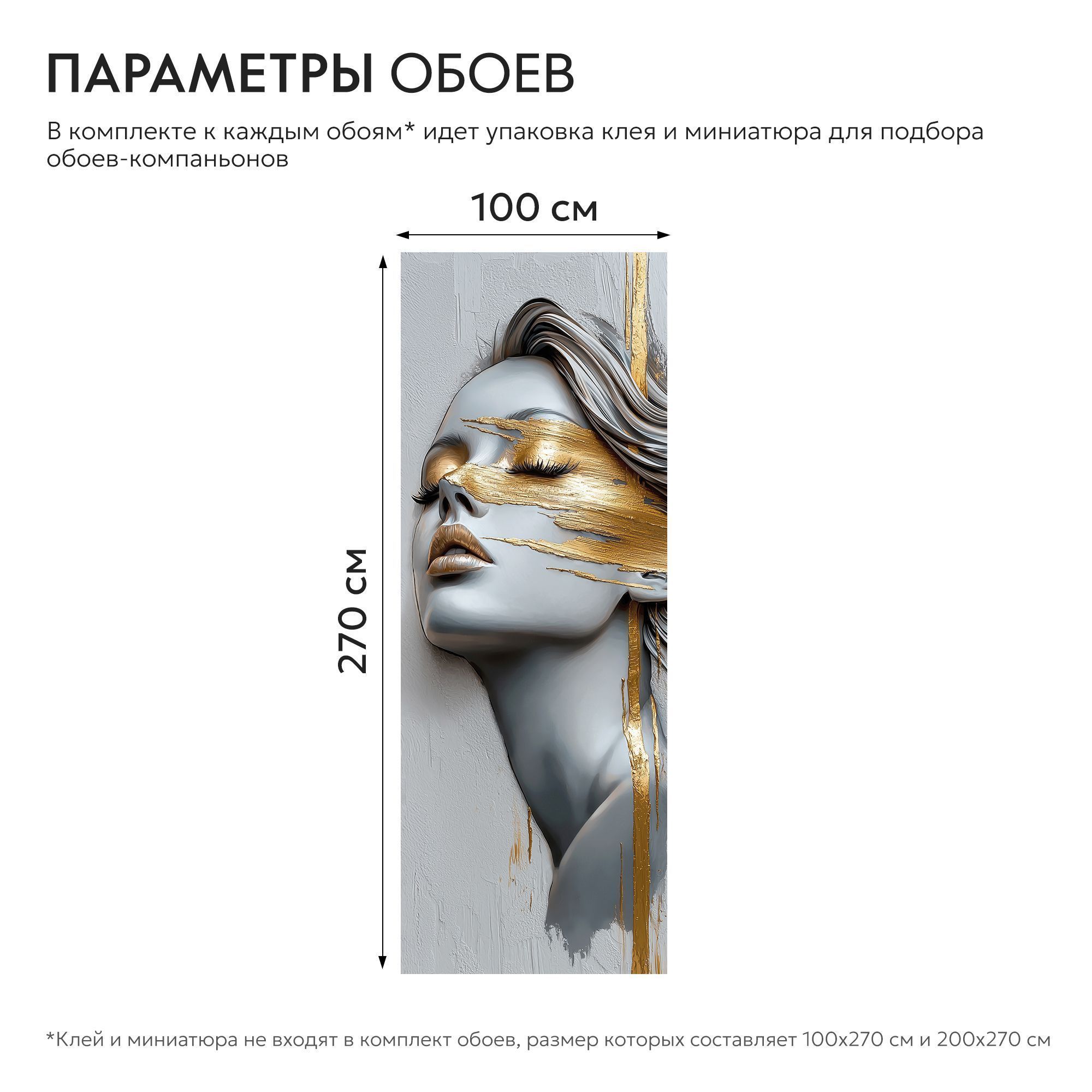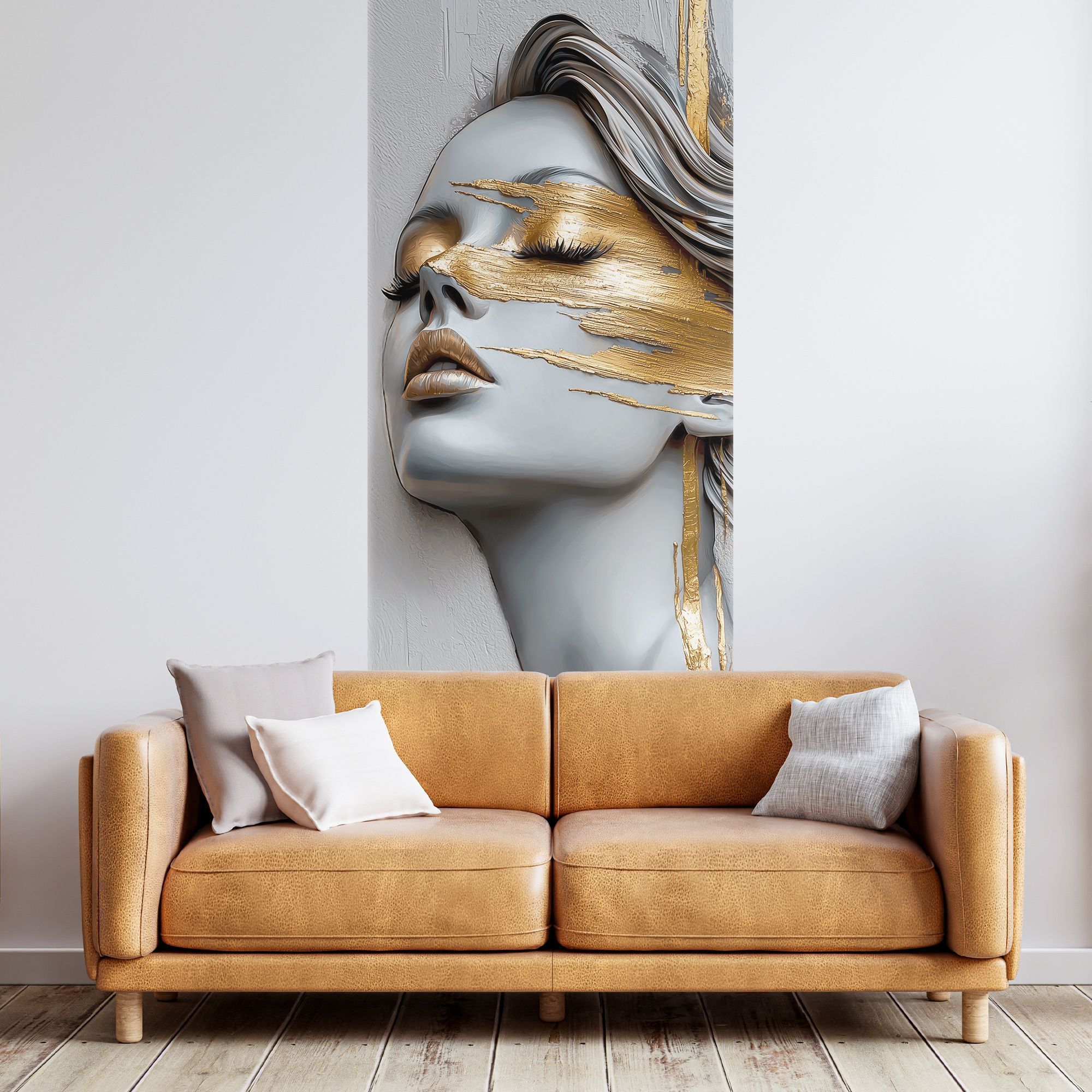 Эти фотообои представляют собой уникальное сочетание современного искусства и утончённой эстетики. Центральным элементом является женский портрет, выполненный в холодных серо-голубых тонах, которые создают эффект мягкой статуэтки. Особое внимание привлекает контрастное использование насыщенного золотого цвета: он словно растекается по лицу, подчеркивая глаза, губы и отдельные части лица, создавая эффект текучей, живой живописи. Техника исполнения с элементами актуального абстрактного искусства передает динамику и глубину эмоций, а закрытые глаза добавляют портрету таинственности и внутренней гармонии. Потеки и мазки золота создают ощущение роскоши и изысканности. Такие фотообои станут идеальным решением для современного интерьера, добавляя ему нотки драматизма и художественного шарма. Они отлично подойдут для гостиных, кабинетов и пространств, где ценится креативность и элегантность.