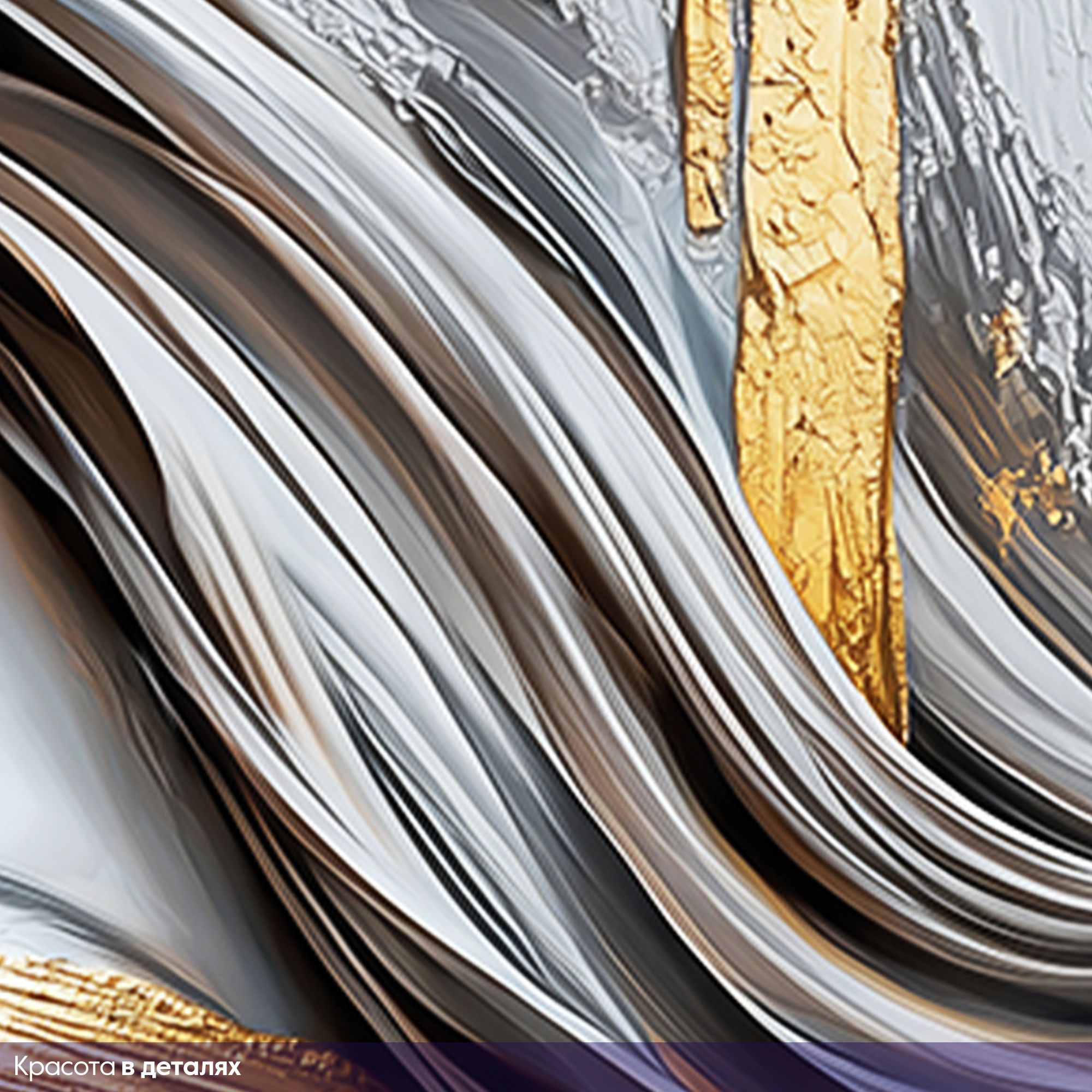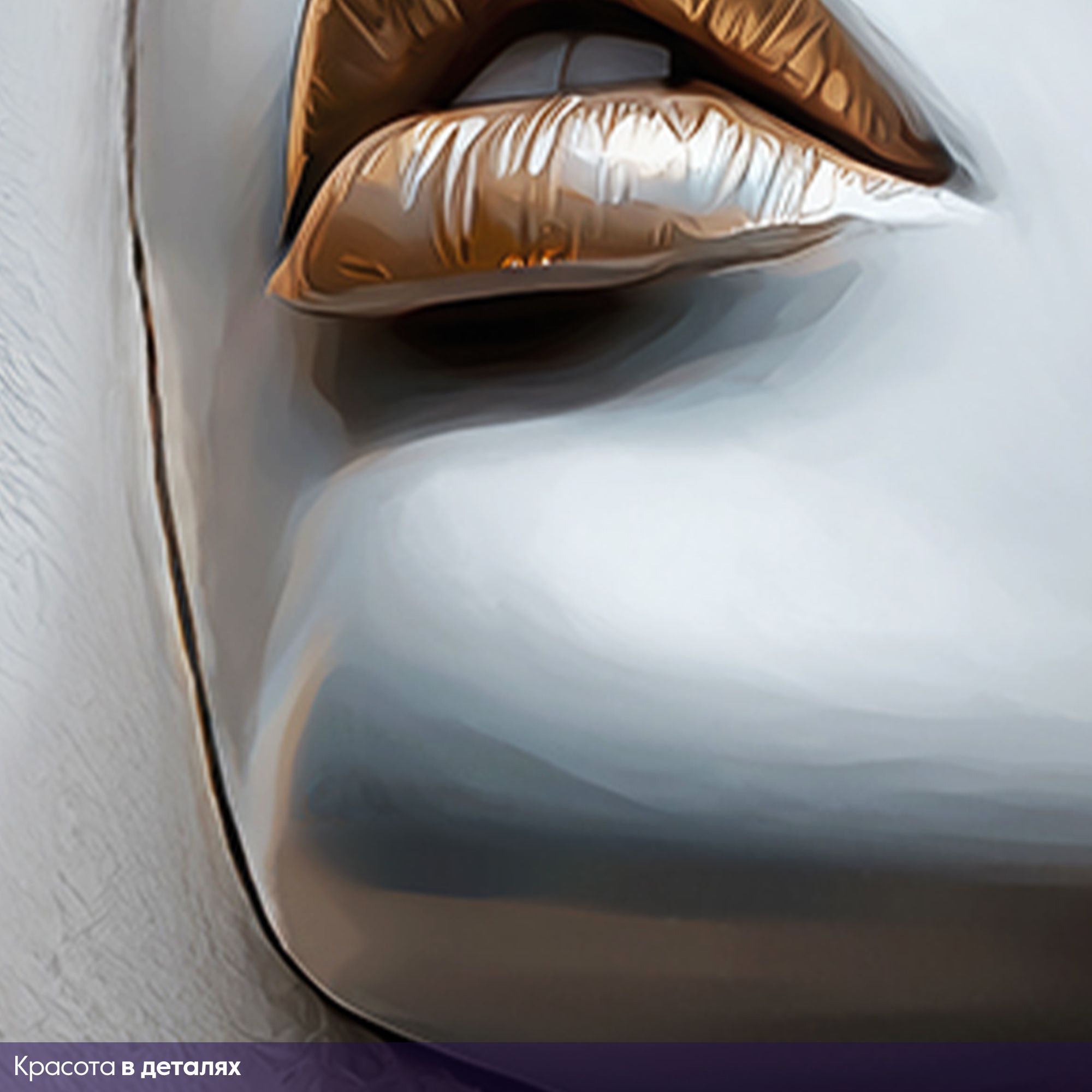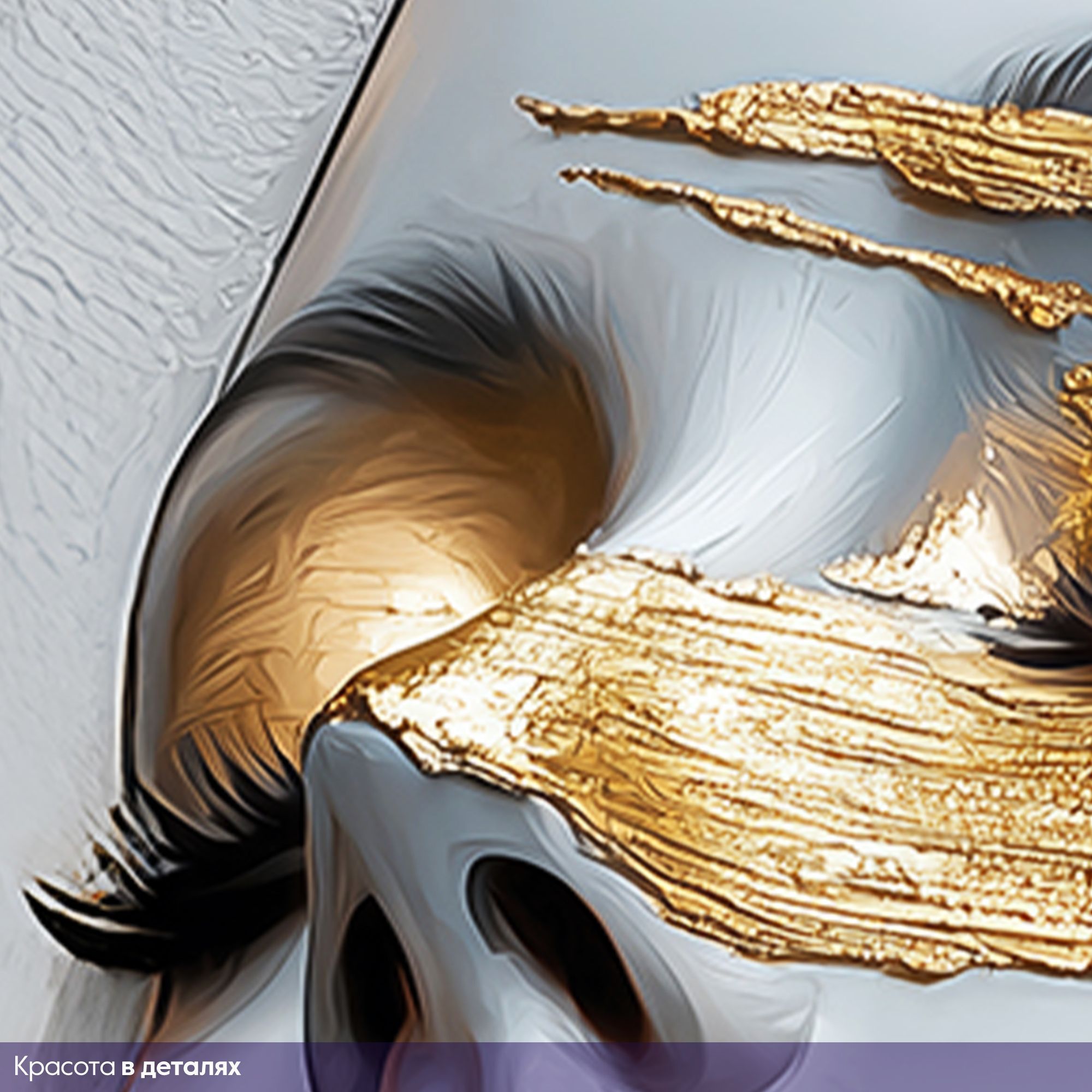 Эти фотообои представляют собой уникальное сочетание современного искусства и утончённой эстетики. Центральным элементом является женский портрет, выполненный в холодных серо-голубых тонах, которые создают эффект мягкой статуэтки. Особое внимание привлекает контрастное использование насыщенного золотого цвета: он словно растекается по лицу, подчеркивая глаза, губы и отдельные части лица, создавая эффект текучей, живой живописи. Техника исполнения с элементами актуального абстрактного искусства передает динамику и глубину эмоций, а закрытые глаза добавляют портрету таинственности и внутренней гармонии. Потеки и мазки золота создают ощущение роскоши и изысканности. Такие фотообои станут идеальным решением для современного интерьера, добавляя ему нотки драматизма и художественного шарма. Они отлично подойдут для гостиных, кабинетов и пространств, где ценится креативность и элегантность.