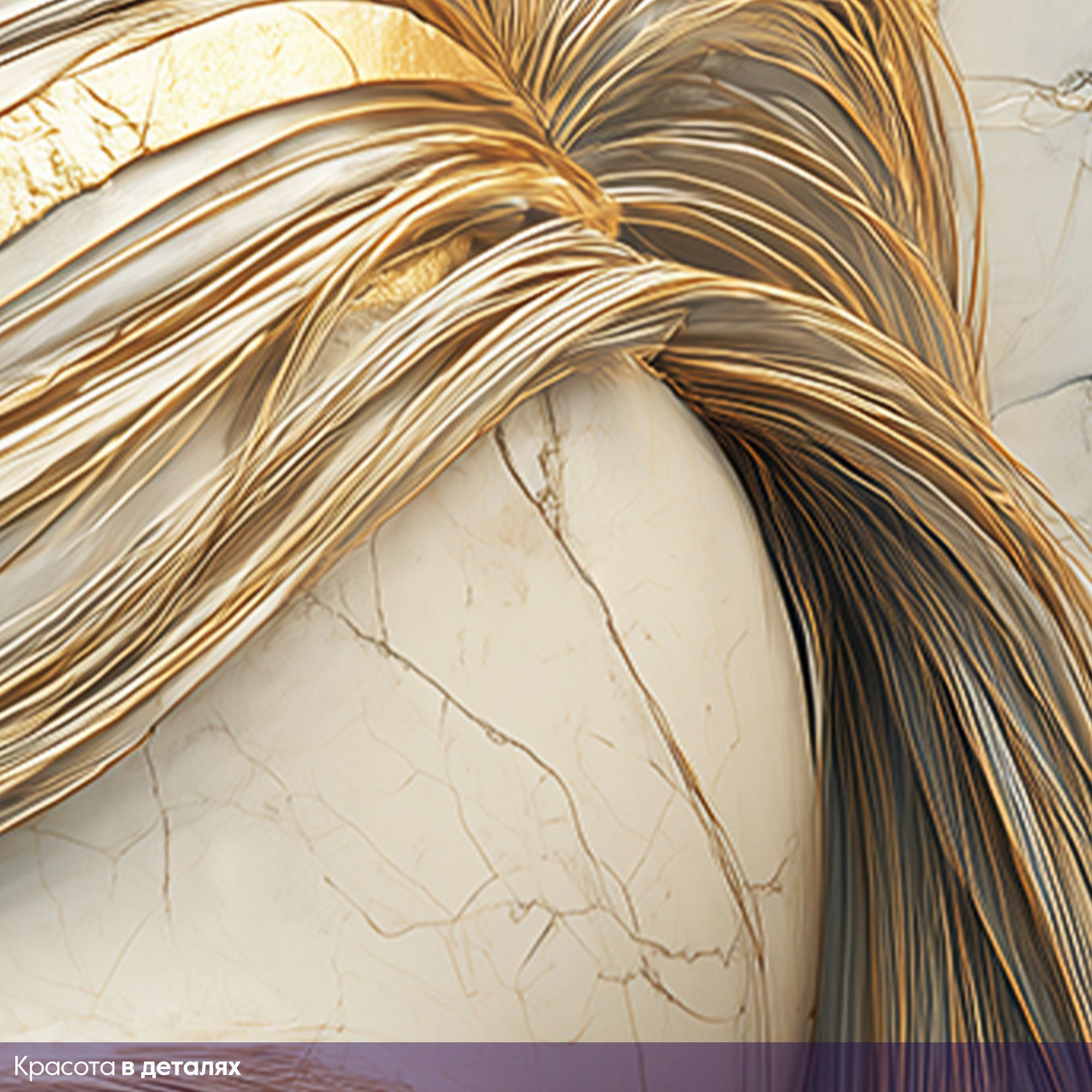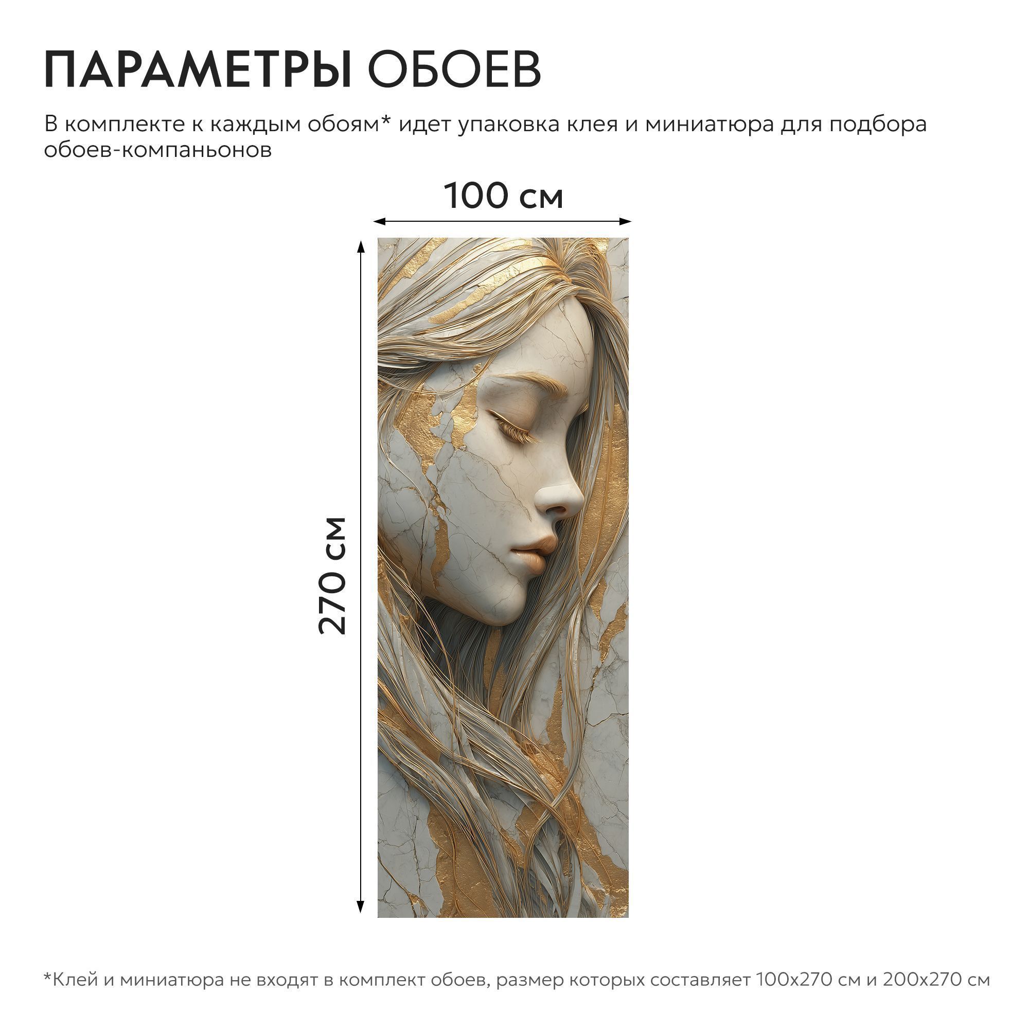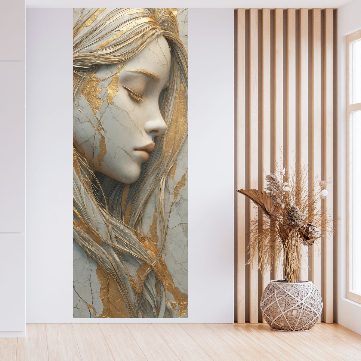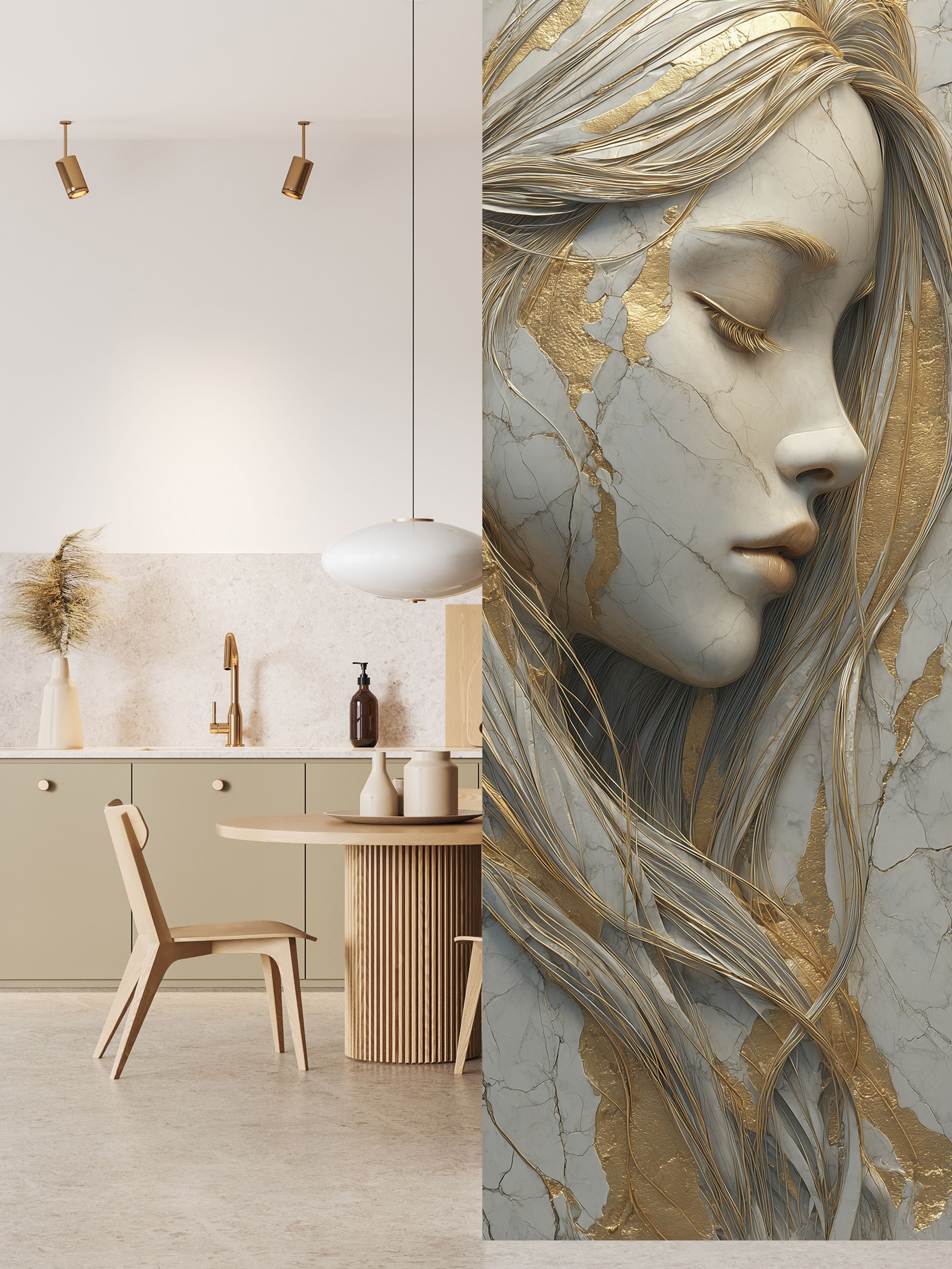 Эти фотообои представляют собой уникальное сочетание современного искусства и утончённой эстетики. Центральным элементом является женский портрет, выполненный в холодных серо-голубых тонах, которые создают эффект мягкой статуэтки. Особое внимание привлекает контрастное использование насыщенного золотого цвета: он словно растекается по лицу, подчеркивая глаза, губы и отдельные части лица, создавая эффект текучей, живой живописи. Техника исполнения с элементами актуального абстрактного искусства передает динамику и глубину эмоций, а закрытые глаза добавляют портрету таинственности и внутренней гармонии. Потеки и мазки золота создают ощущение роскоши и изысканности. Такие фотообои станут идеальным решением для современного интерьера, добавляя ему нотки драматизма и художественного шарма. Они отлично подойдут для гостиных, кабинетов и пространств, где ценится креативность и элегантность.