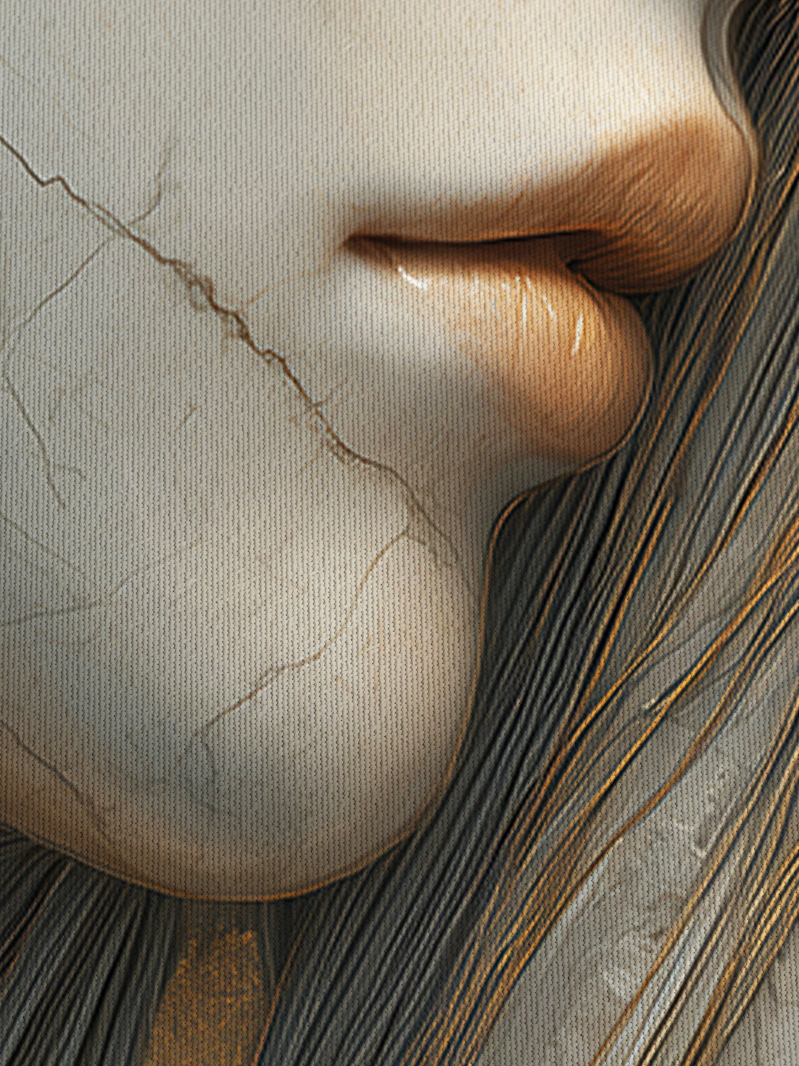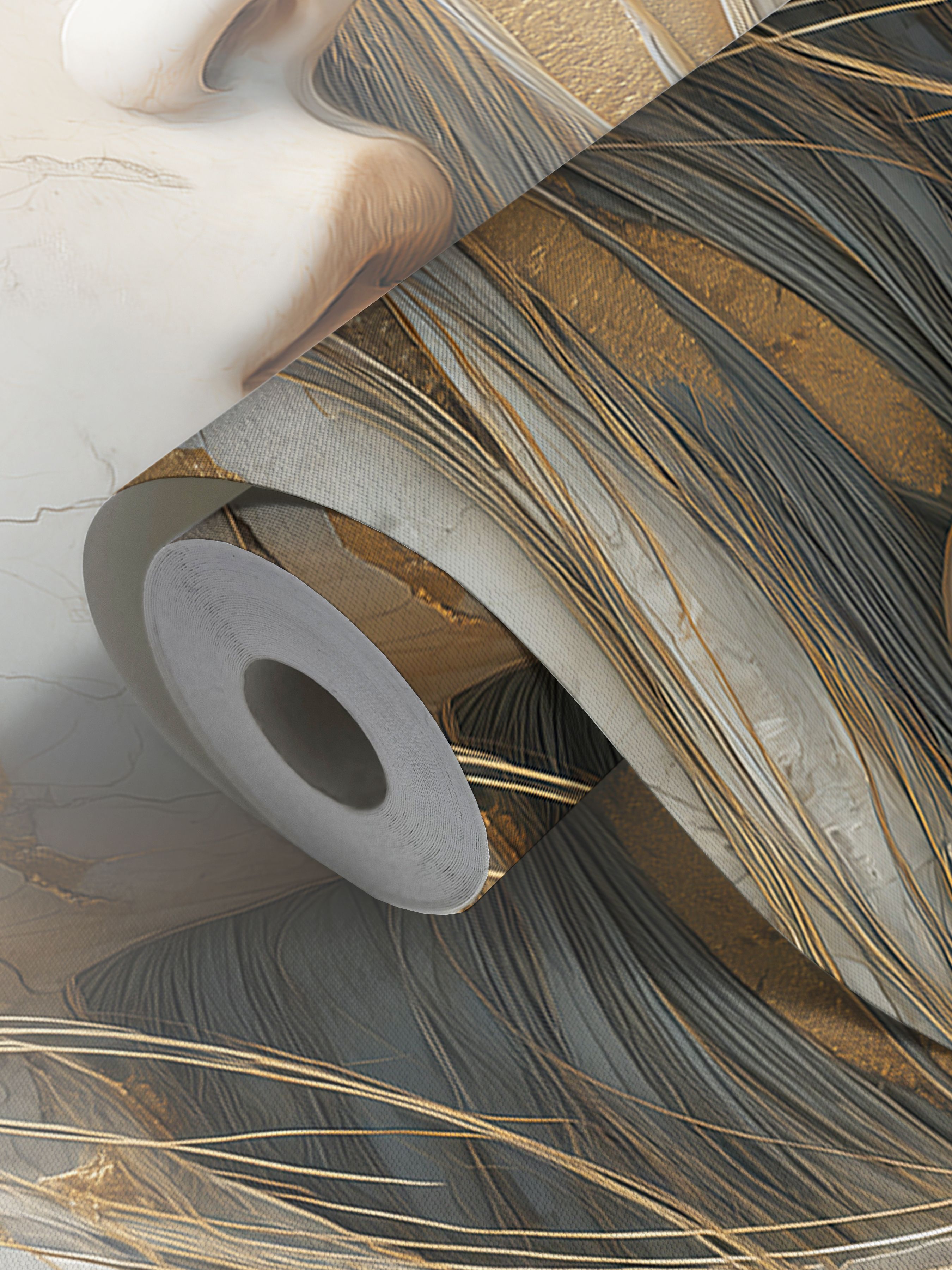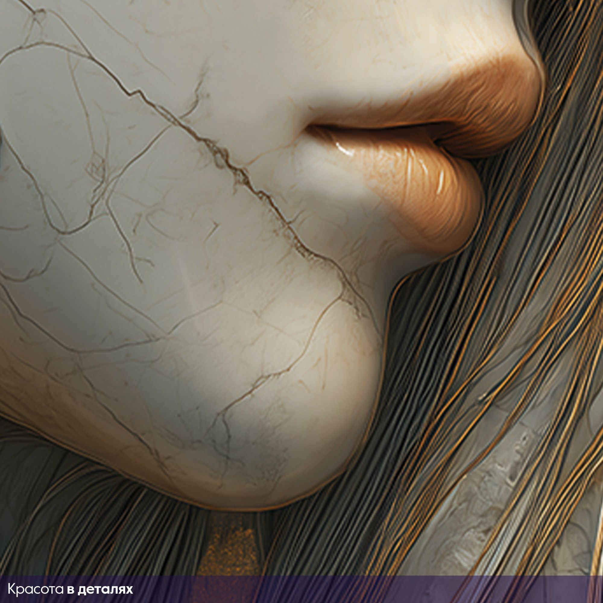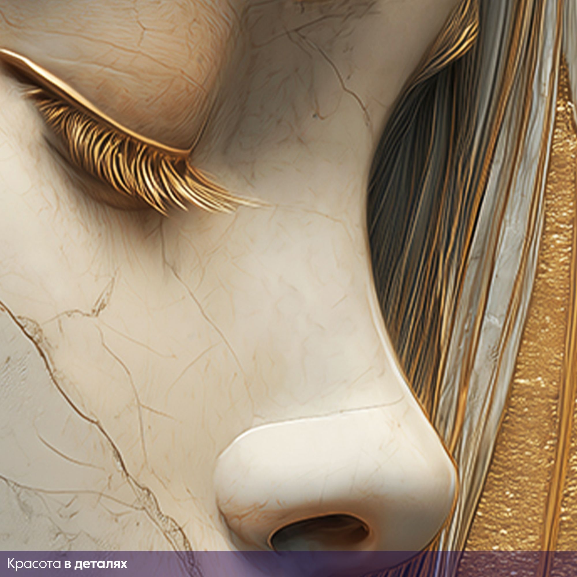 Эти фотообои представляют собой уникальное сочетание современного искусства и утончённой эстетики. Центральным элементом является женский портрет, выполненный в холодных серо-голубых тонах, которые создают эффект мягкой статуэтки. Особое внимание привлекает контрастное использование насыщенного золотого цвета: он словно растекается по лицу, подчеркивая глаза, губы и отдельные части лица, создавая эффект текучей, живой живописи. Техника исполнения с элементами актуального абстрактного искусства передает динамику и глубину эмоций, а закрытые глаза добавляют портрету таинственности и внутренней гармонии. Потеки и мазки золота создают ощущение роскоши и изысканности. Такие фотообои станут идеальным решением для современного интерьера, добавляя ему нотки драматизма и художественного шарма. Они отлично подойдут для гостиных, кабинетов и пространств, где ценится креативность и элегантность.