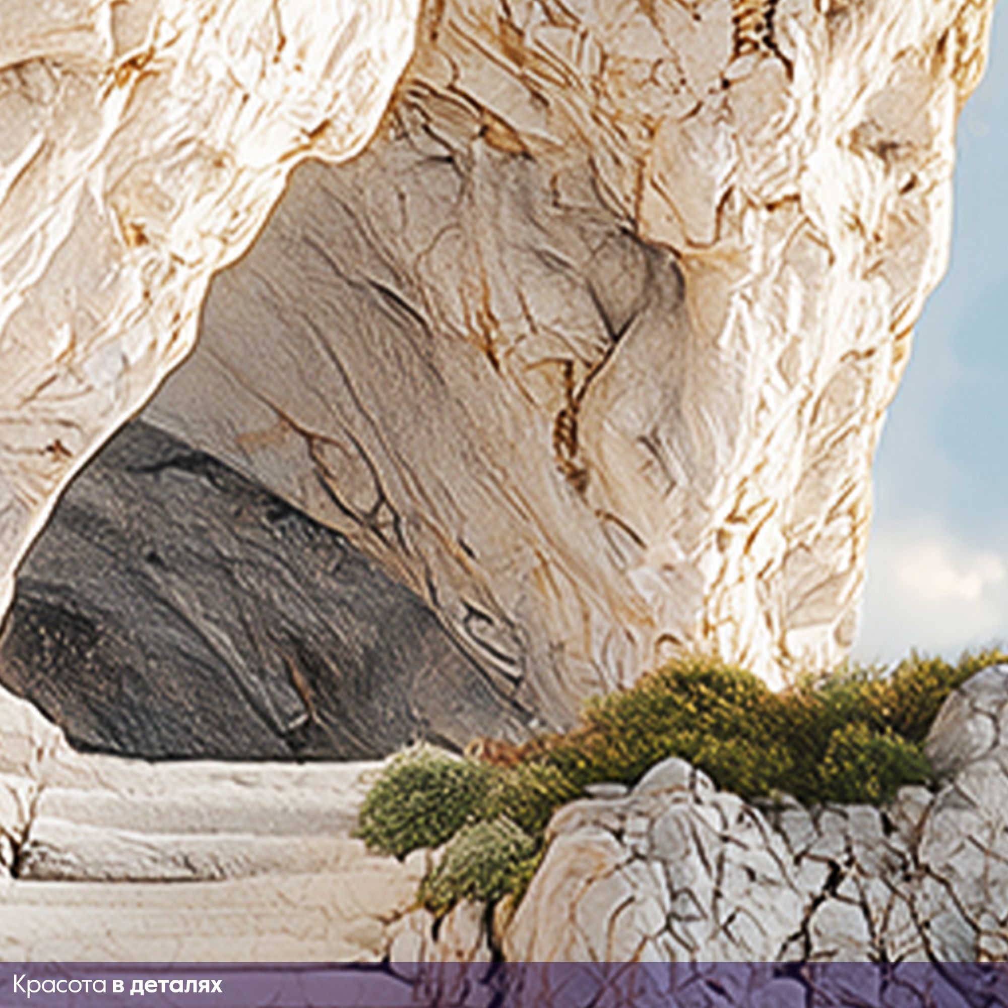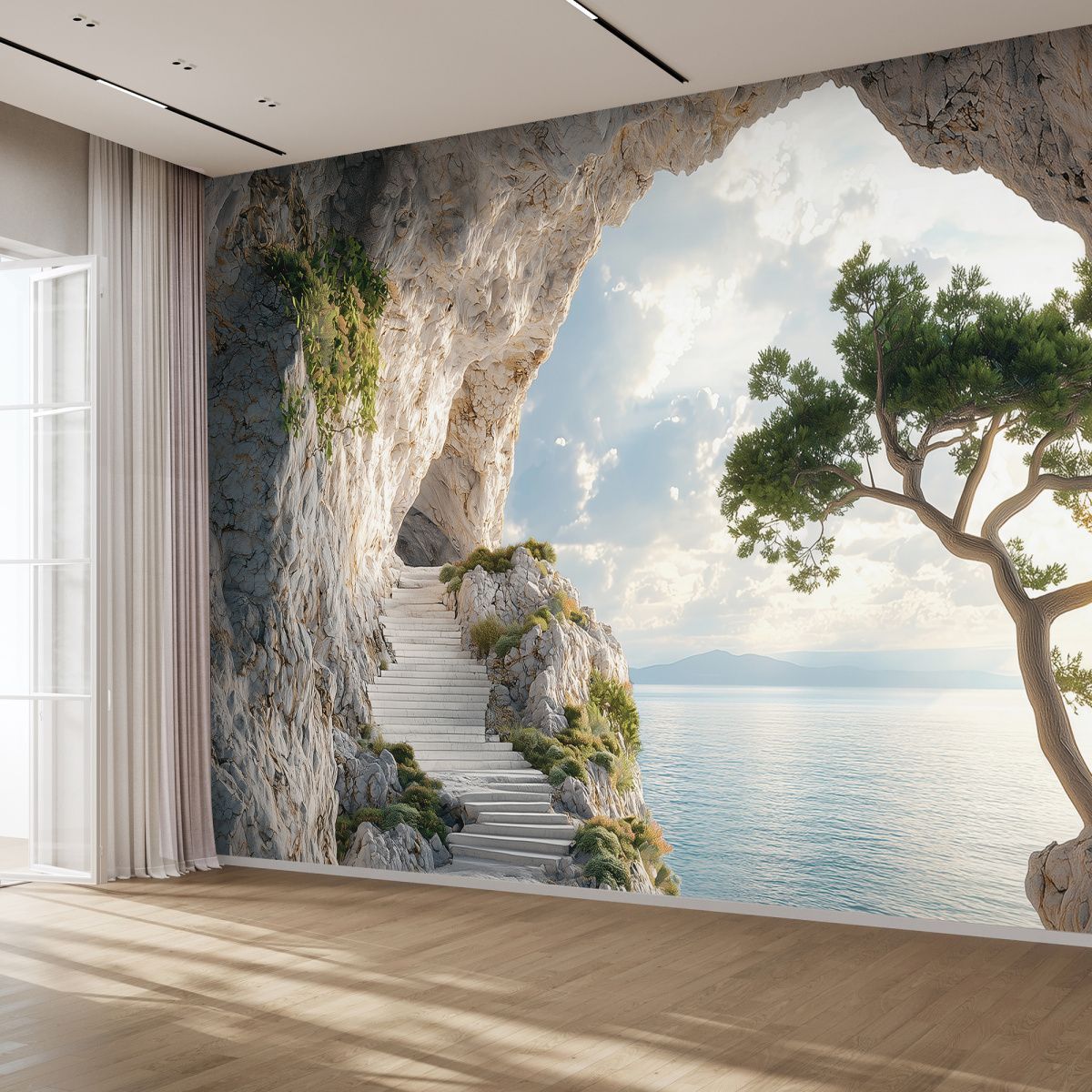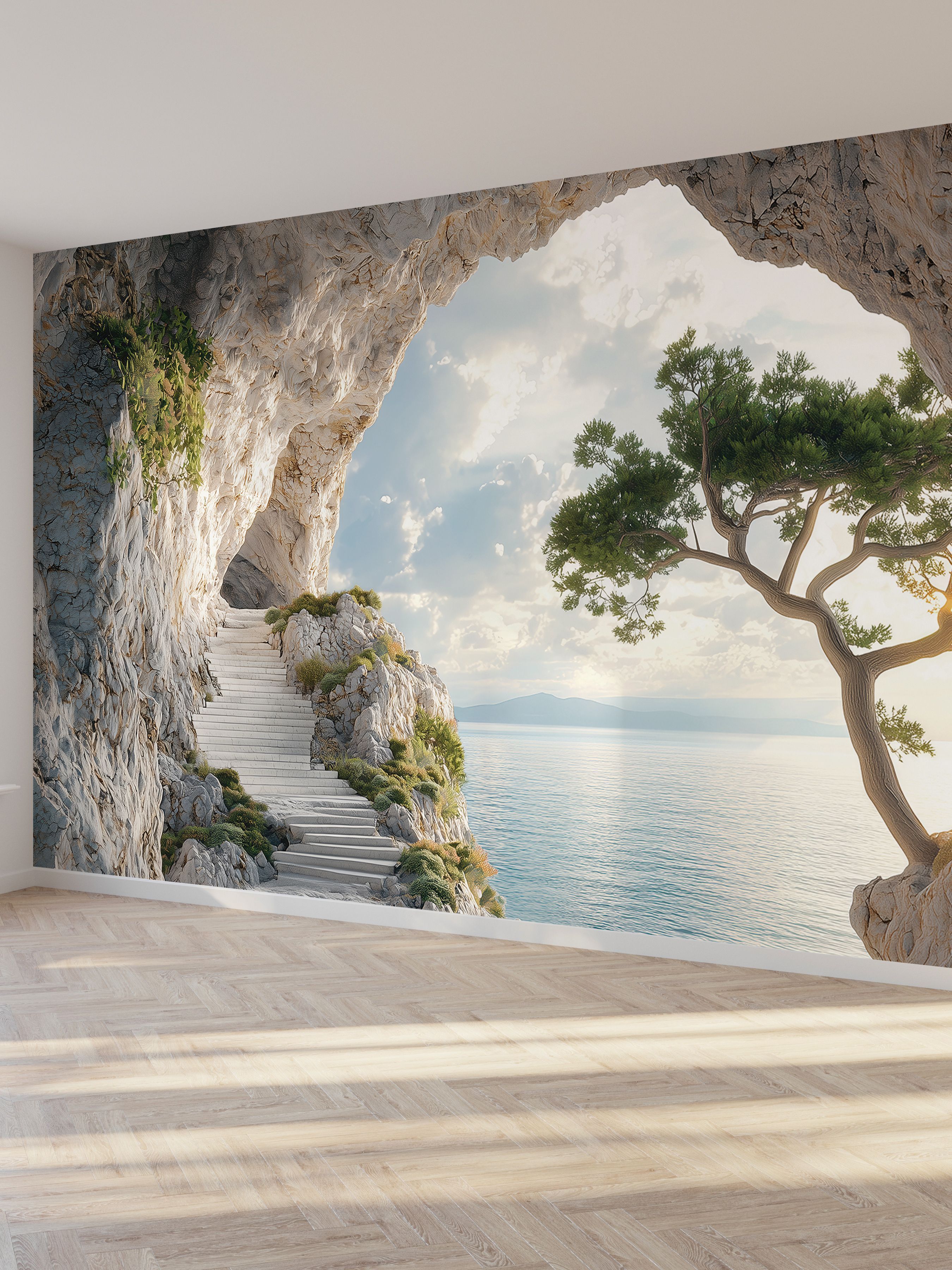 На картине раскрывается волшебный пейзаж, словно вышедший из глубин сказочной мечты. Изящные ступени, словно вырезанные из чистейшего мрамора, нежно поднимаются к пещере с причудливо изогнутыми и богато текстурированными стенами. Через её арочный проём открывается бескрайний океан под светлым, завораживающим небом, усыпанным мягкими, словно пух, облаками. На скалах изящно возвышается одинокое дерево, его пышная зелень утончённо сочетается с белоснежной гармонией окружающего ландшафта. Вся композиция дышит умиротворённостью, внутренней гармонией и лёгкостью, словно приглашая погрузиться в мечты и уединение у самого берега великого простора.