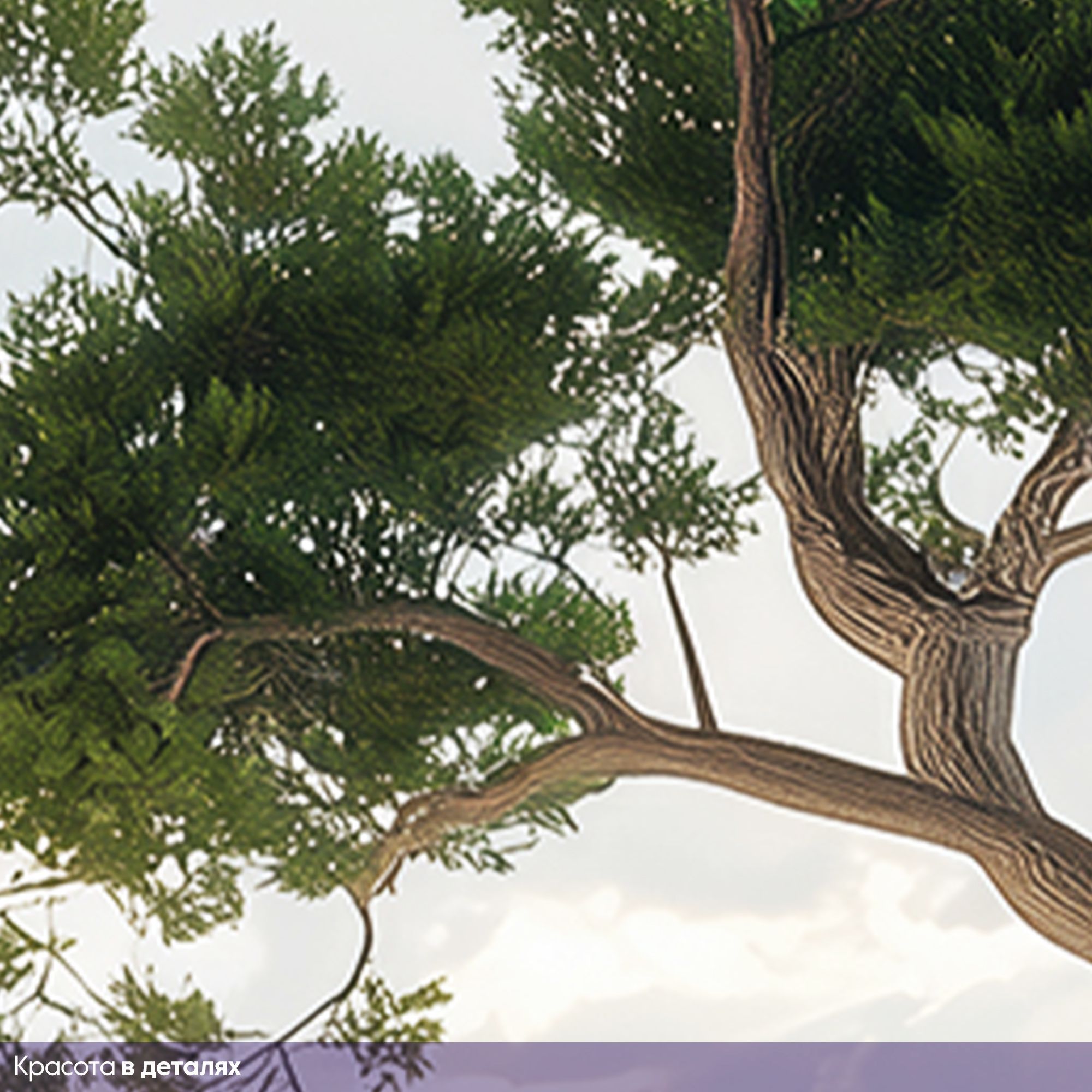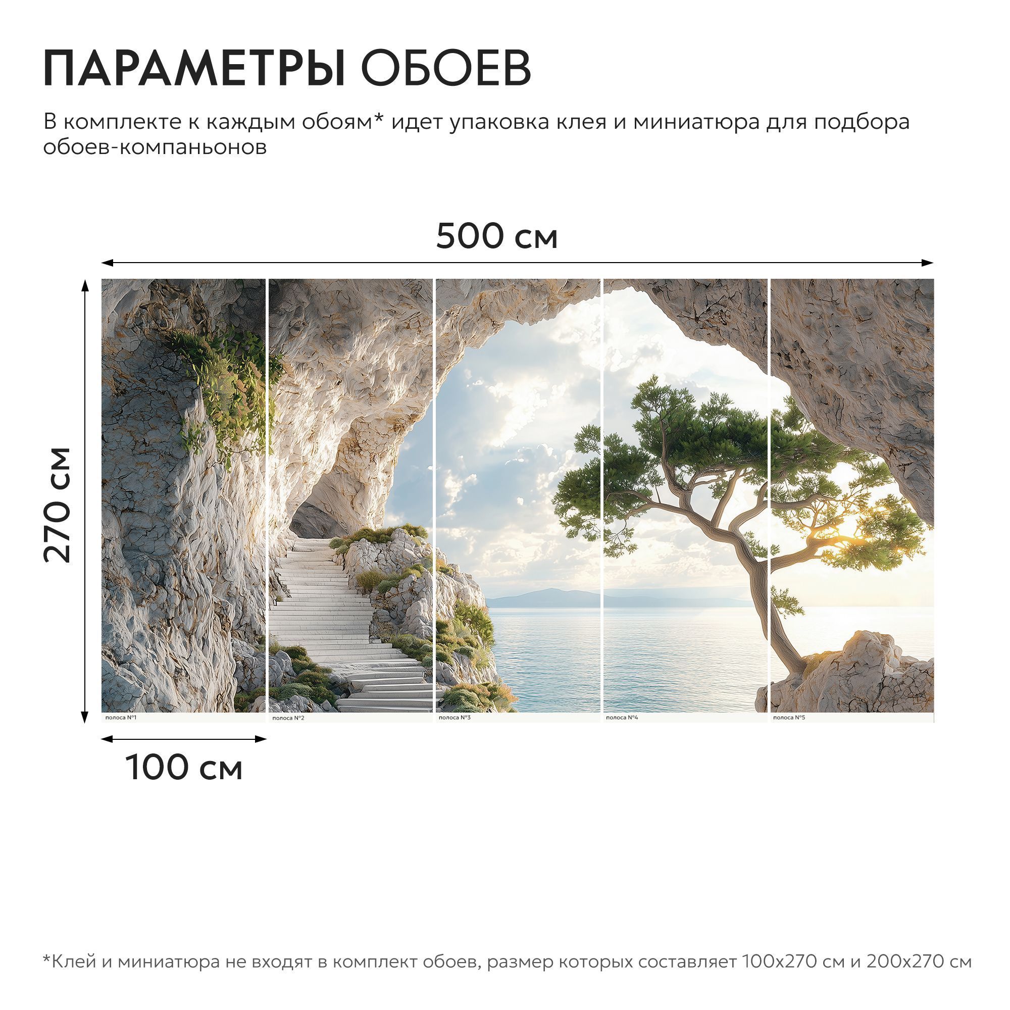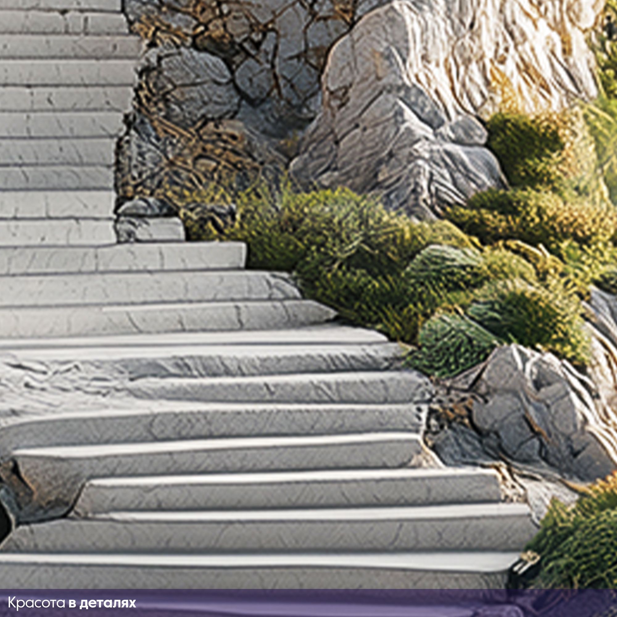 На картине раскрывается волшебный пейзаж, словно вышедший из глубин сказочной мечты. Изящные ступени, словно вырезанные из чистейшего мрамора, нежно поднимаются к пещере с причудливо изогнутыми и богато текстурированными стенами. Через её арочный проём открывается бескрайний океан под светлым, завораживающим небом, усыпанным мягкими, словно пух, облаками. На скалах изящно возвышается одинокое дерево, его пышная зелень утончённо сочетается с белоснежной гармонией окружающего ландшафта. Вся композиция дышит умиротворённостью, внутренней гармонией и лёгкостью, словно приглашая погрузиться в мечты и уединение у самого берега великого простора.