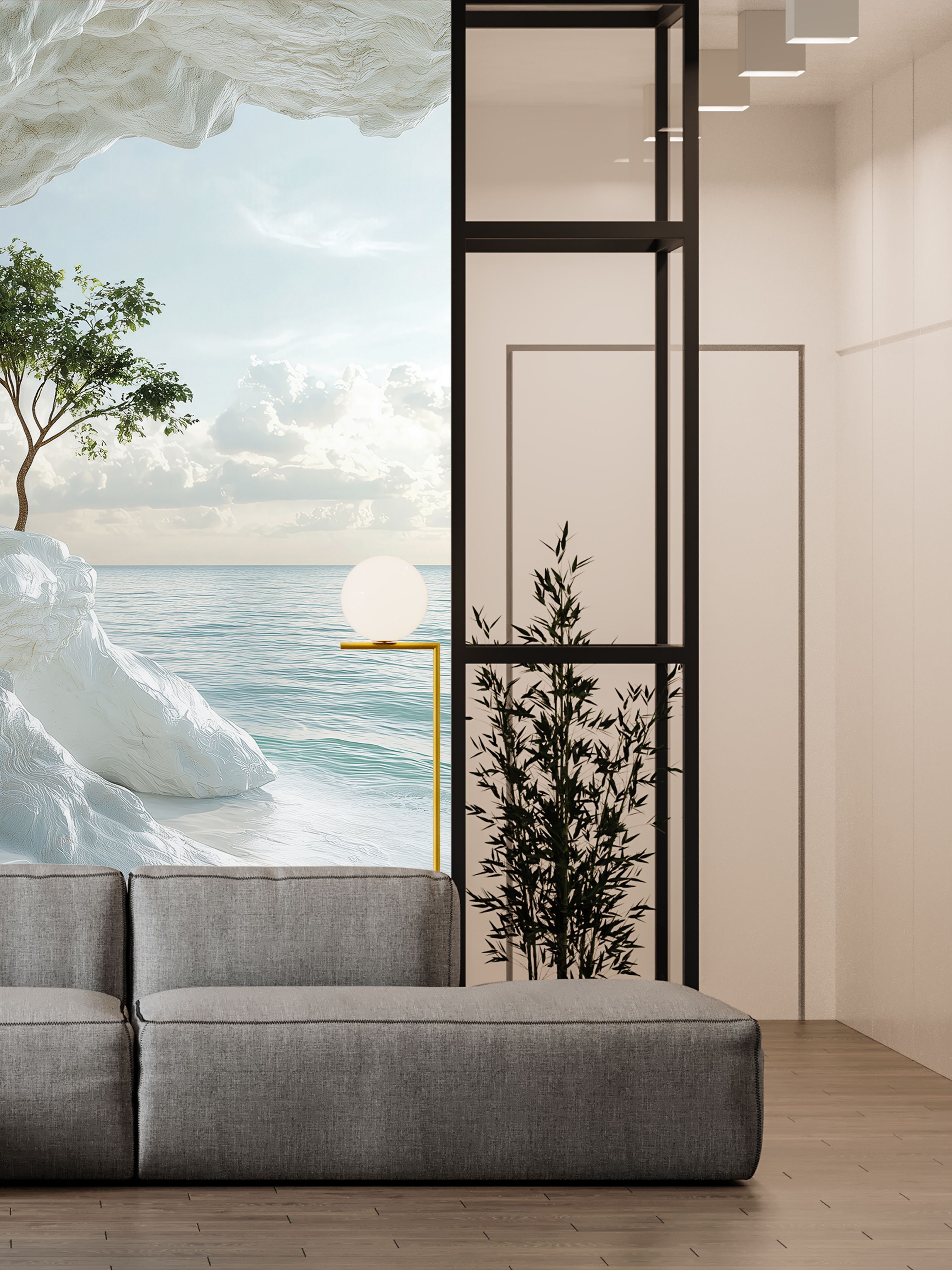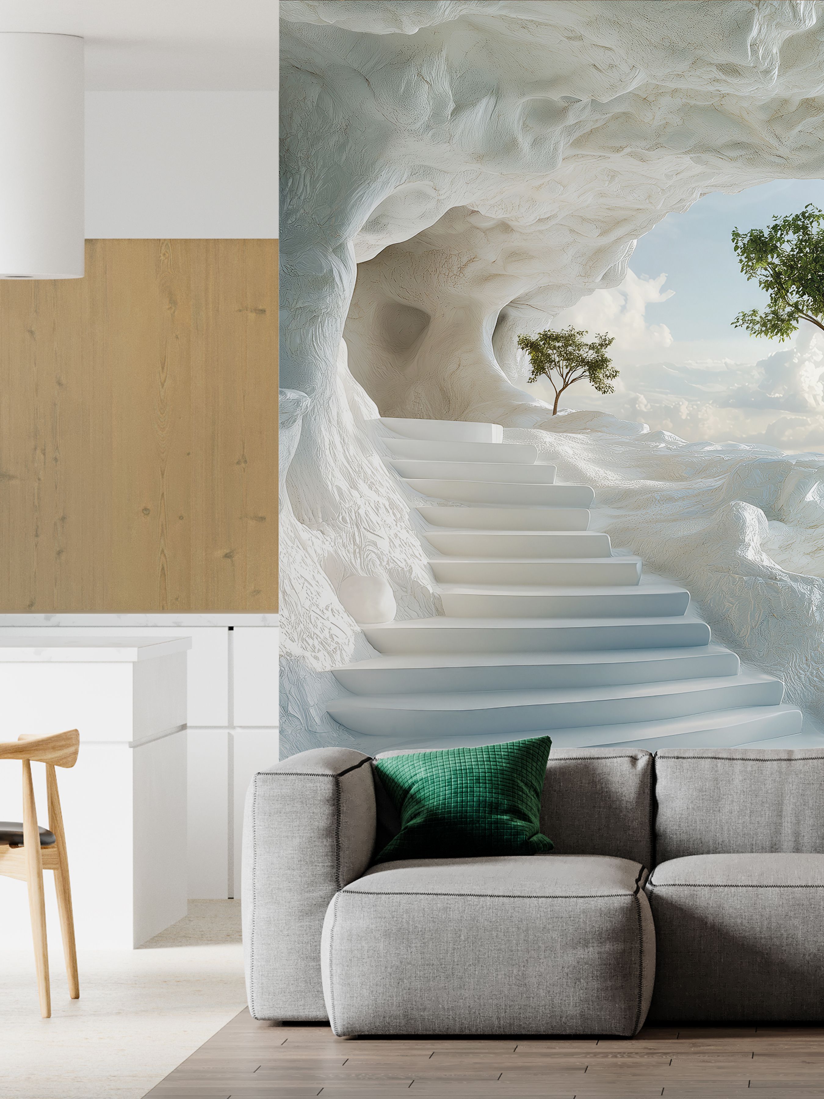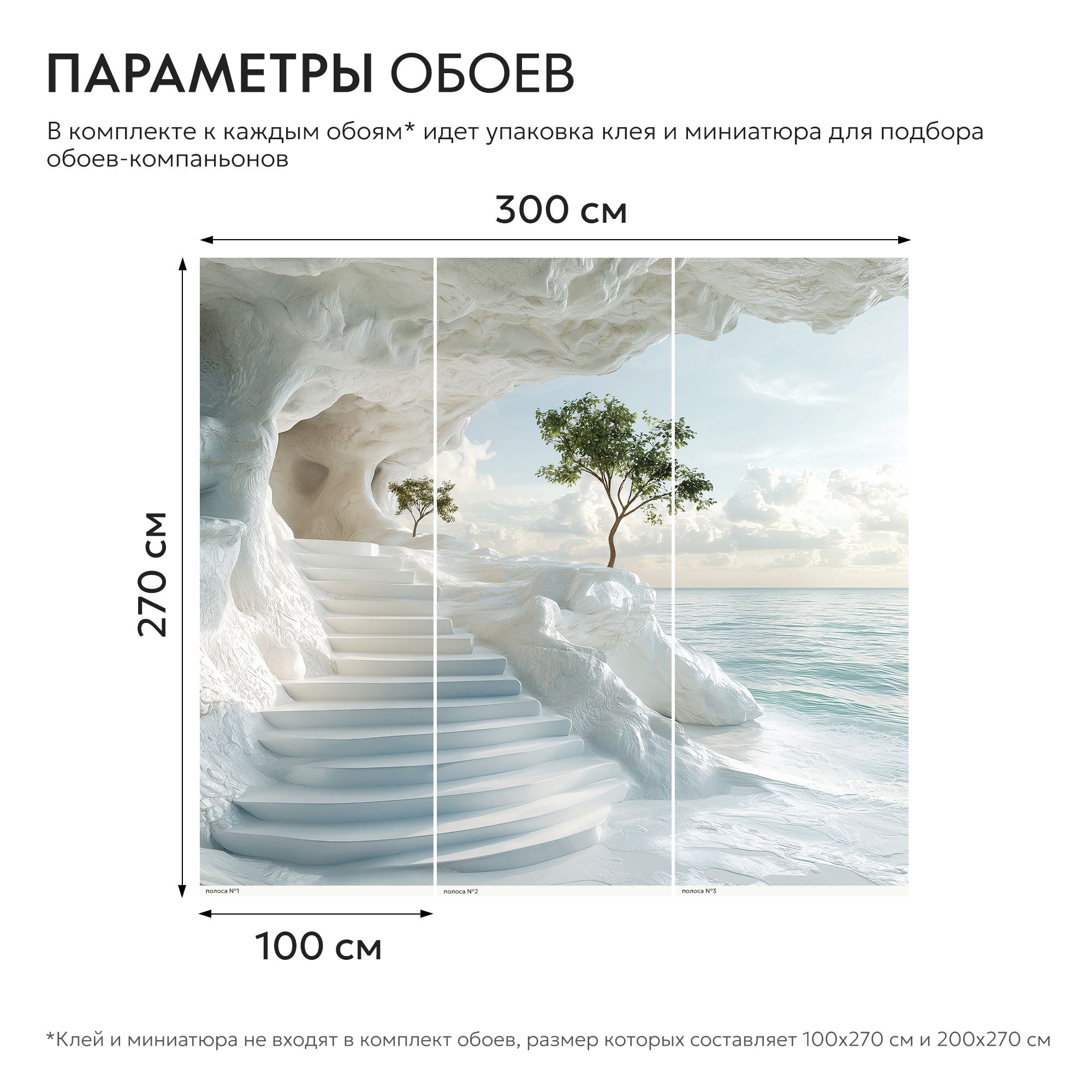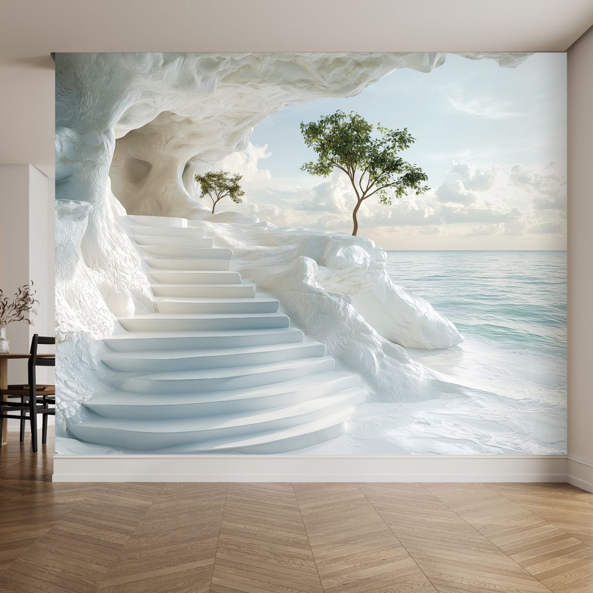 На этих фотообоях изображён фантастический пейзаж с белоснежной пещерой, состоящей из величественных арок, напоминающих архитектурное чудо природы. Белые стены создают ощущение чистоты и свежести, а через арки виднеется спокойная лазурная вода, переходящая в бескрайний океан под светлым небом с лёгкими облаками. По краям фотообоев растут пышные тропические растения — пальмы и кустарники, придающие живой зелёный акцент и контраст белоснежным каменным стенам. Такие фотообои создают атмосферу умиротворённости и расширяют пространство комнаты, будто открывая окно в волшебный морской пейзаж.