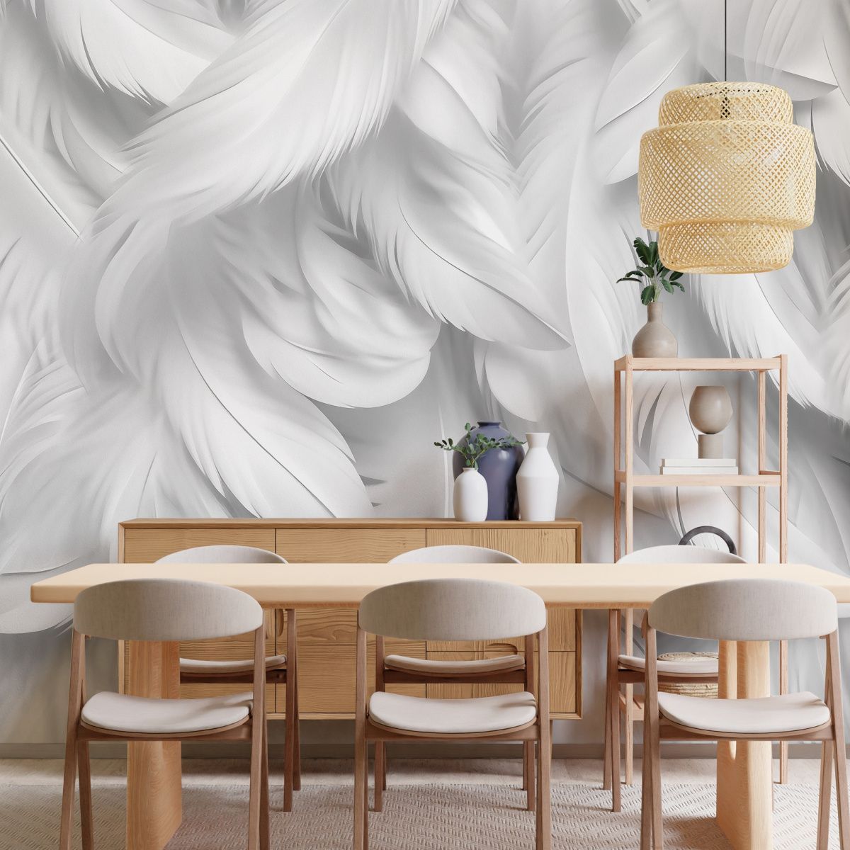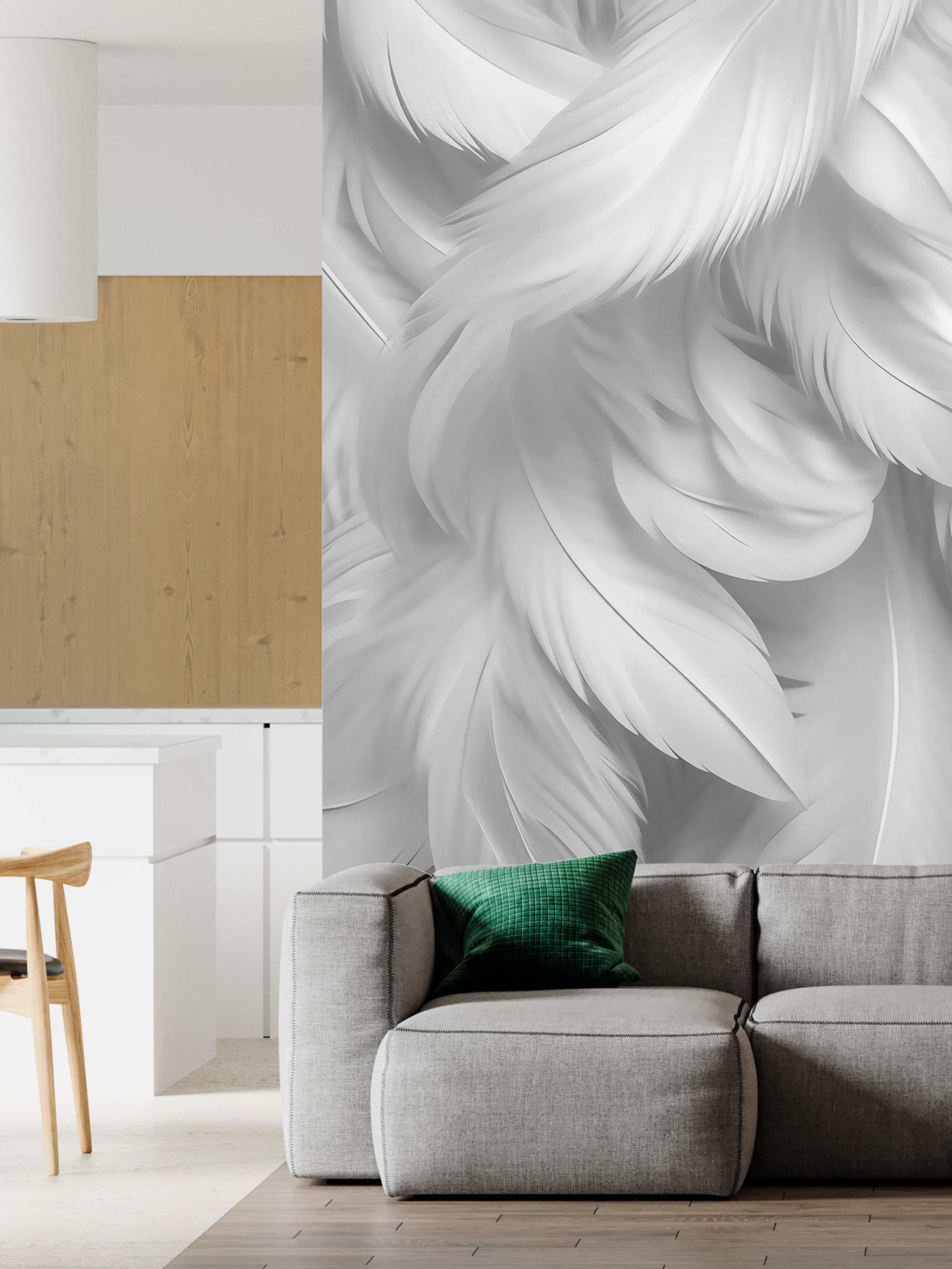 Эти фотообои создают впечатление лёгкости и воздушности, благодаря детально прорисованным белоснежным перьям, которые плавно перекрывают друг друга, образуя мягкий, почти осязаемый рельеф. Монохромная гамма подчёркивает утончённую элегантность и сдержанность дизайна, позволяя перьям выглядеть нежно и естественно. Такие обои гармонично впишутся в интерьер, добавляя ему нотки лёгкости и утончённости. Они хорошо подойдут для спальни, гостиной или кабинета, создавая атмосферу спокойствия и уюта. Светлые тона визуально расширяют пространство и способствуют расслаблению.