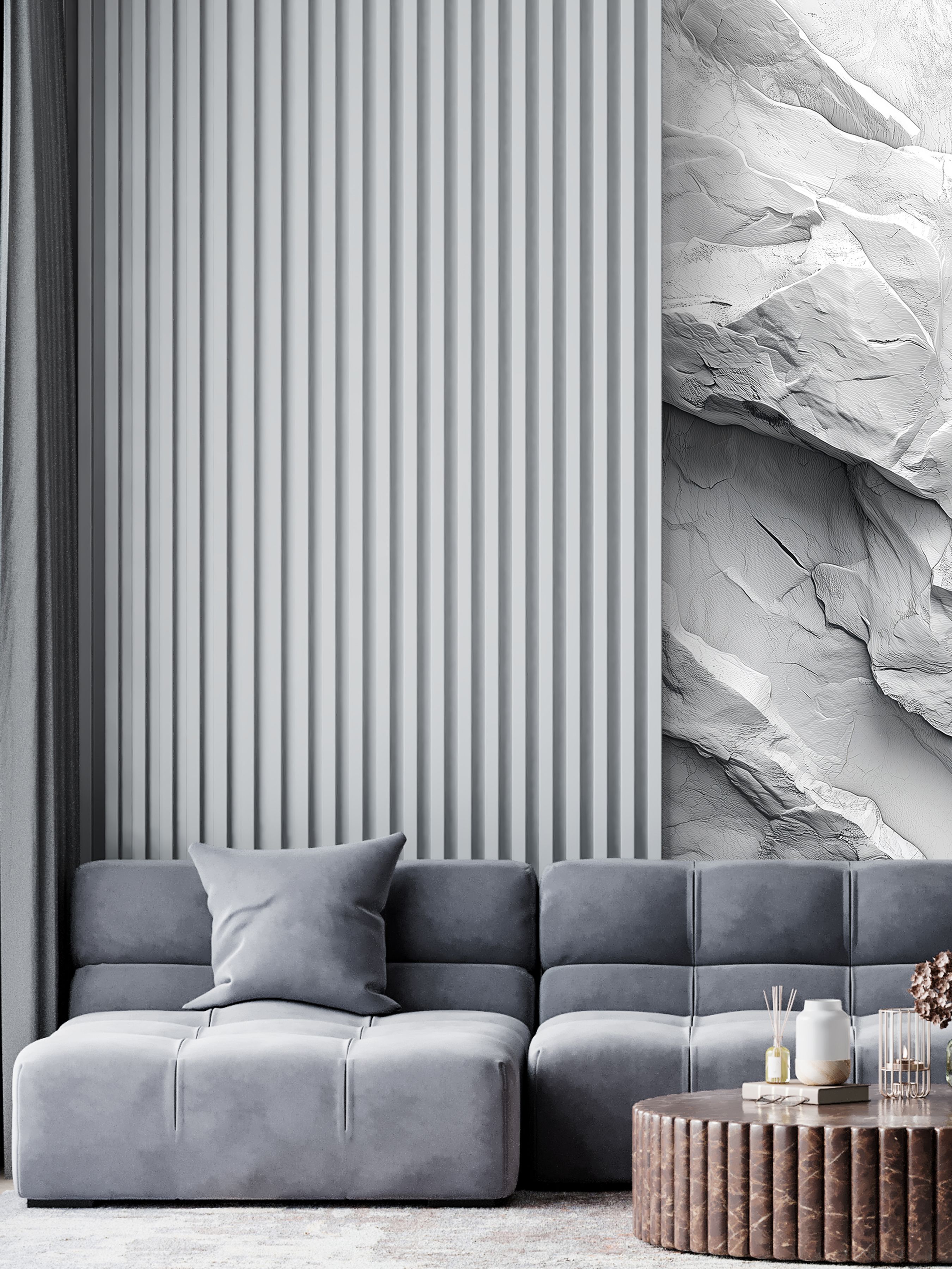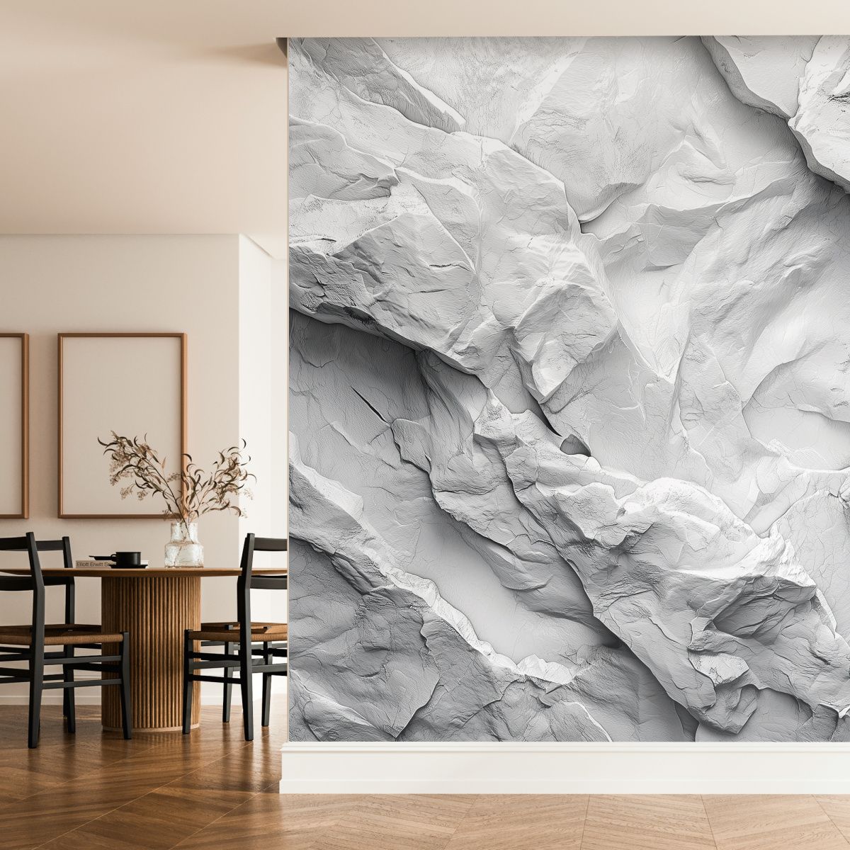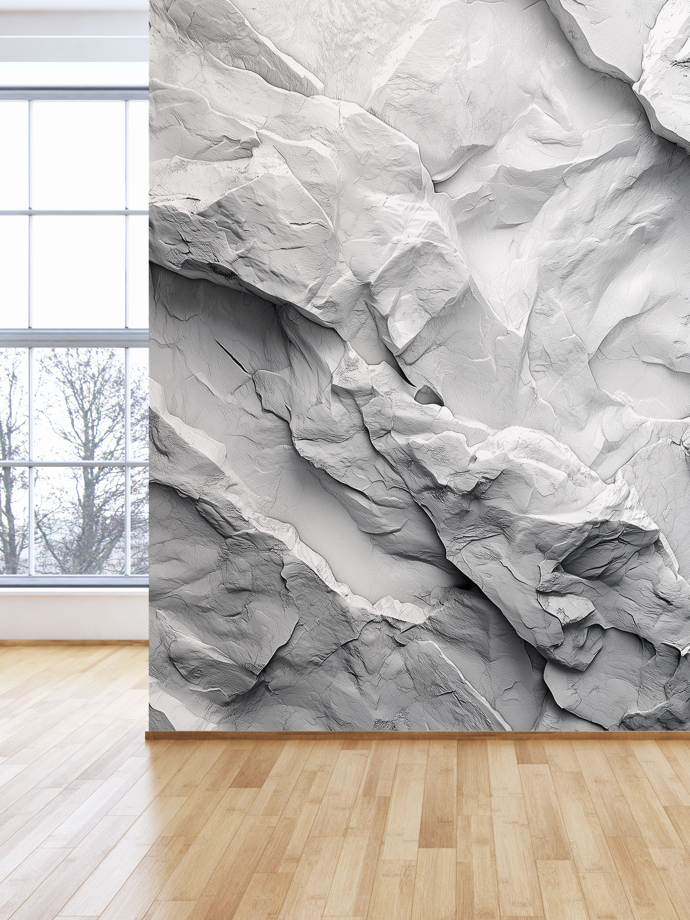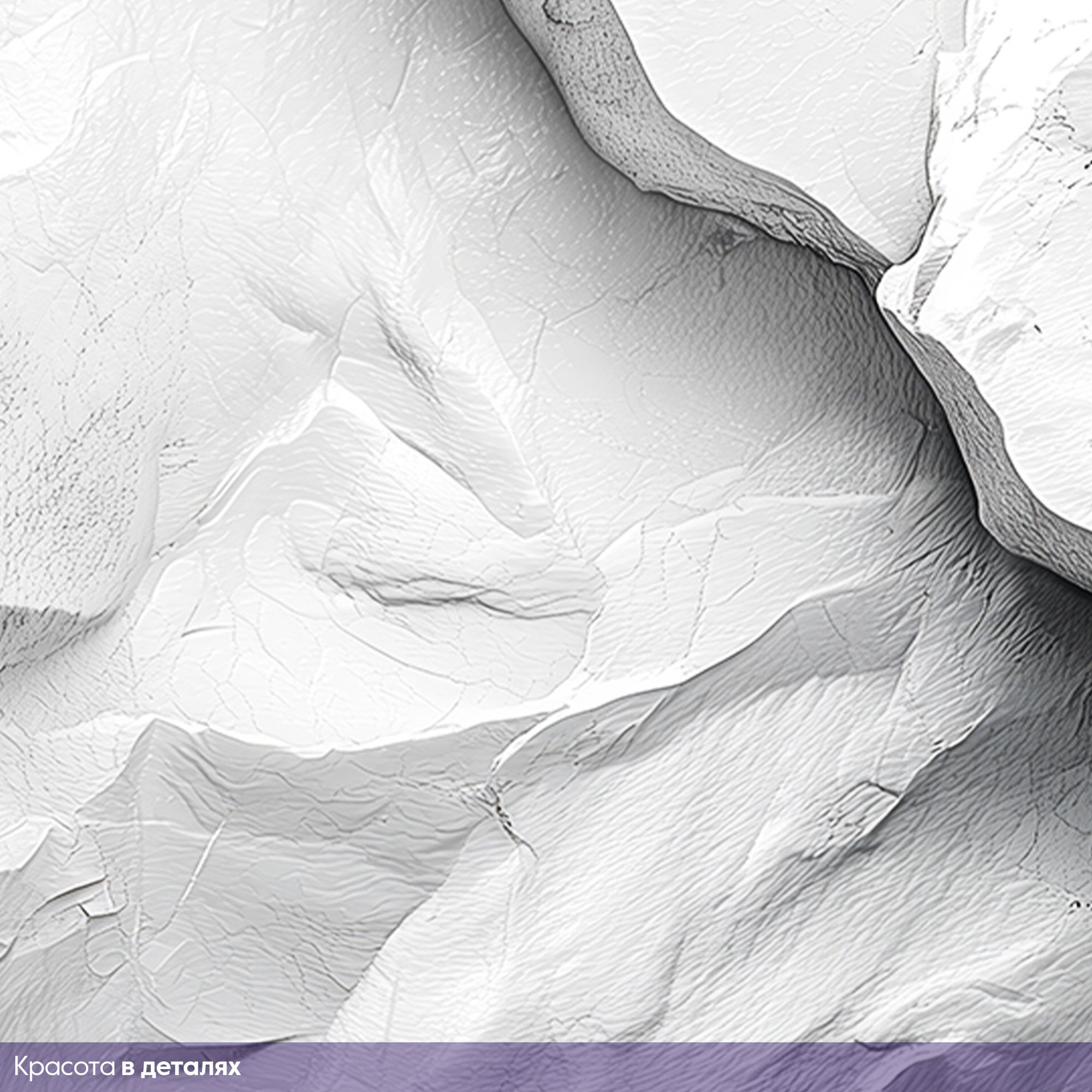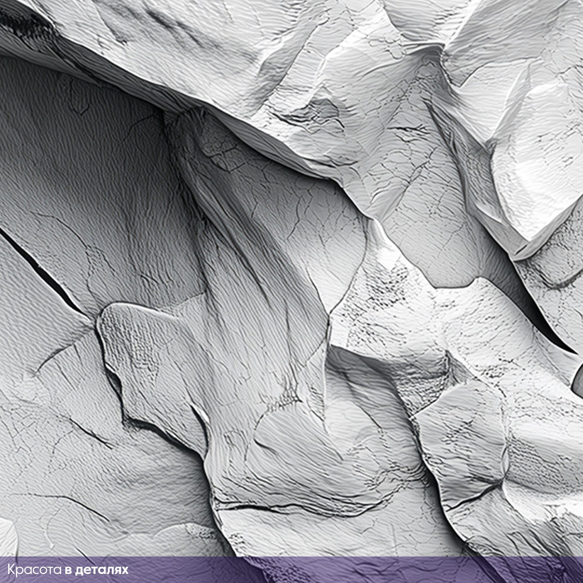 Эти фотообои представляют собой изысканную игру света и тени на изящной поверхности, напоминающей художественный барельеф из мрамора или мела. Тонкая текстура, словно природа сама вырезала волны и складки, создаёт ощущение лёгкости и воздушности, несмотря на каменную основу. Плавные переходы оттенков белого и светло-серого рождают глубину и объём, наполняя пространство утончённой элегантностью и стилем. Такая фактура станет идеальным акцентом в современном интерьере, добавляя атмосфере тонкую гармонию природной красоты и созерцательного спокойствия.