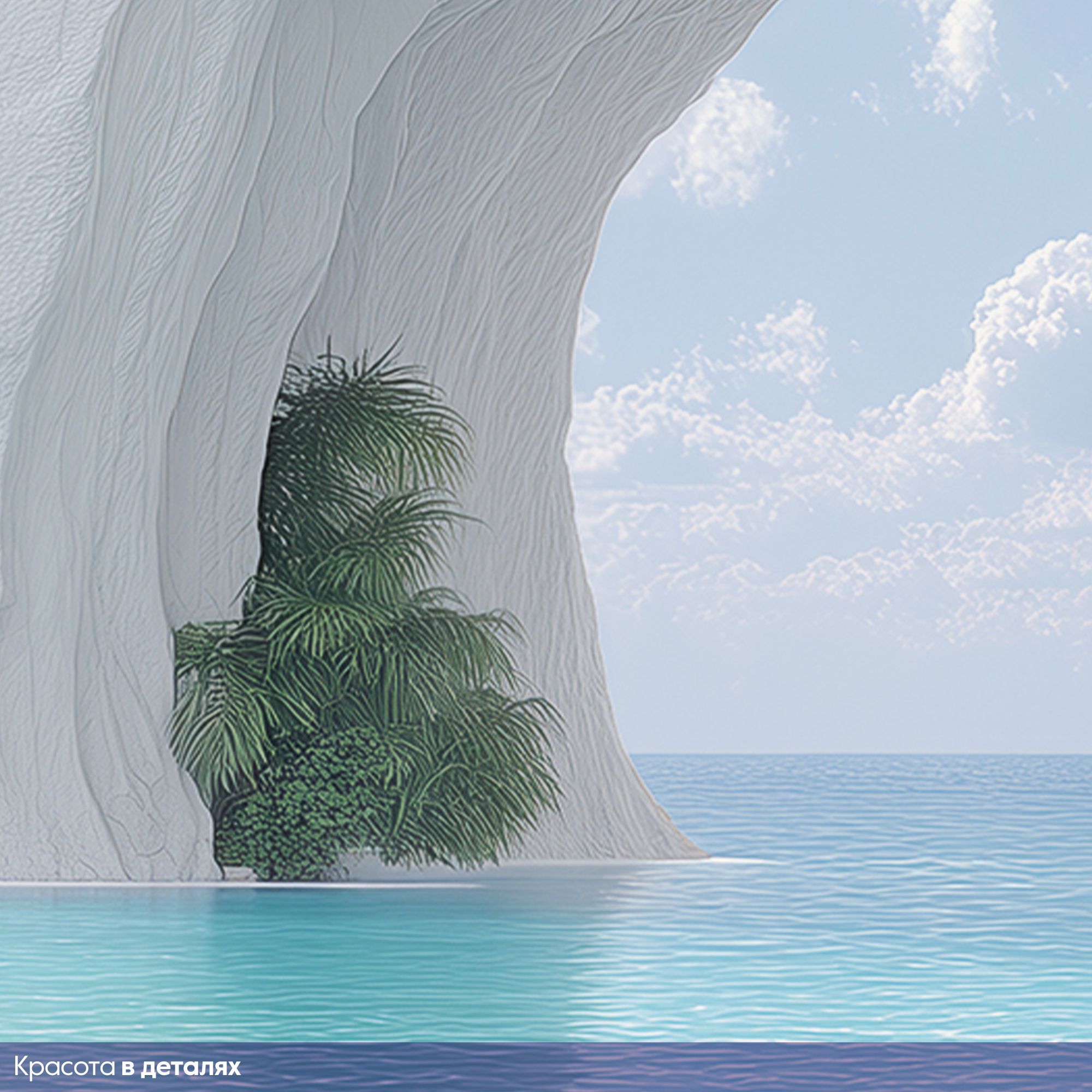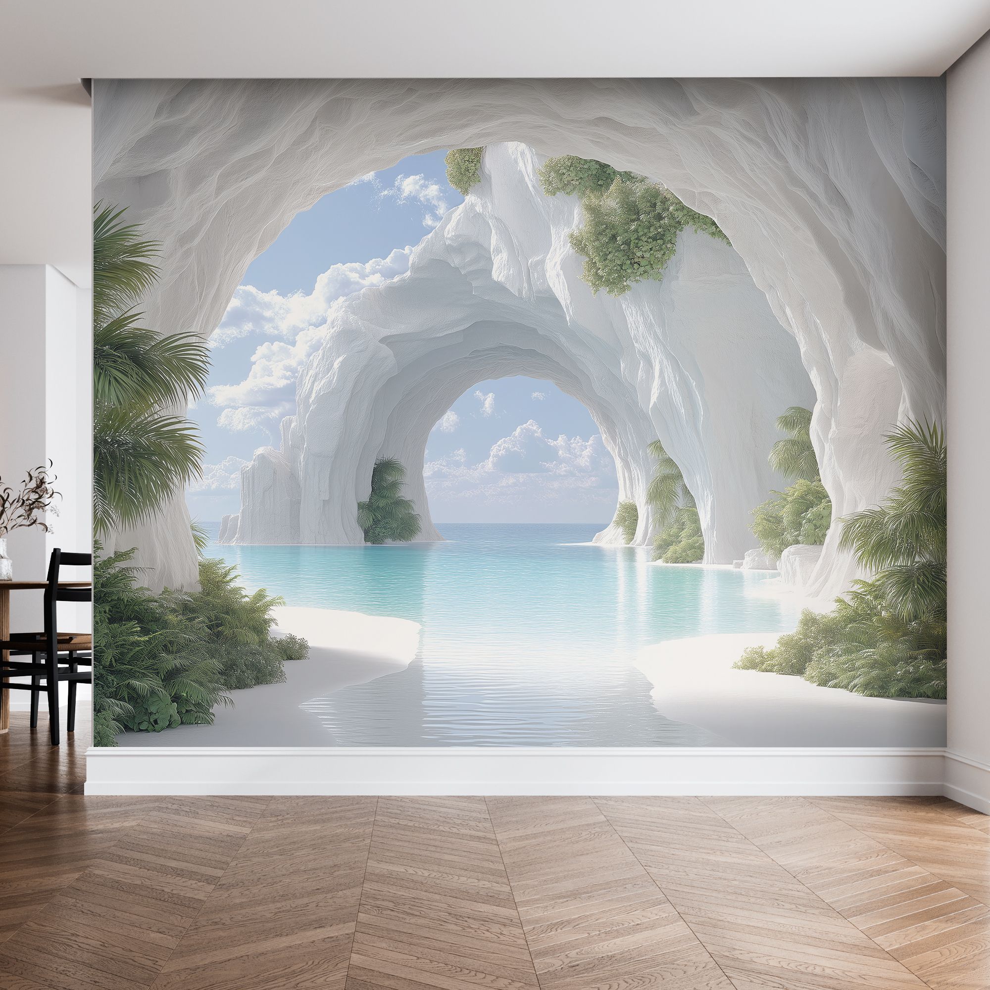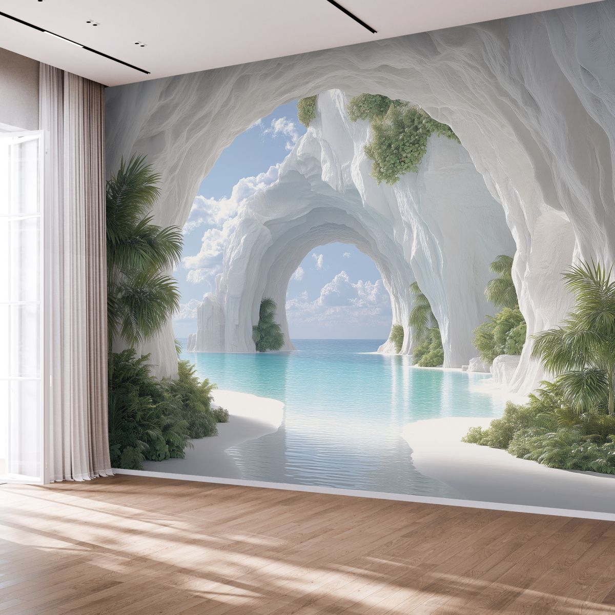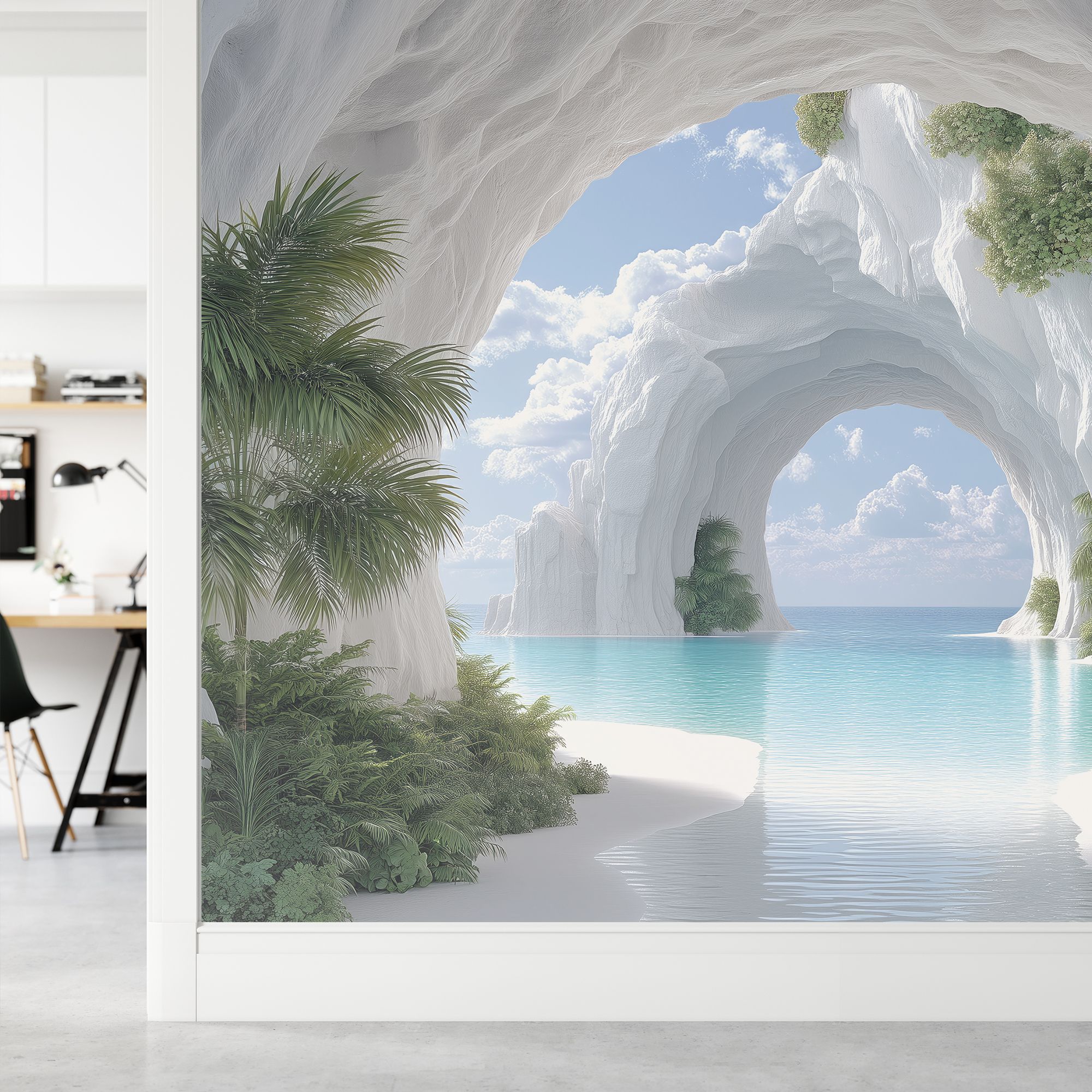 На этих фотообоях изображён фантастический пейзаж с белоснежной пещерой, состоящей из величественных арок, напоминающих архитектурное чудо природы. Белые стены создают ощущение чистоты и свежести, а через арки виднеется спокойная лазурная вода, переходящая в бескрайний океан под светлым небом с лёгкими облаками. По краям фотообоев растут пышные тропические растения — пальмы и кустарники, придающие живой зелёный акцент и контраст белоснежным каменным стенам. Такие фотообои создают атмосферу умиротворённости и расширяют пространство комнаты, будто открывая окно в волшебный морской пейзаж.