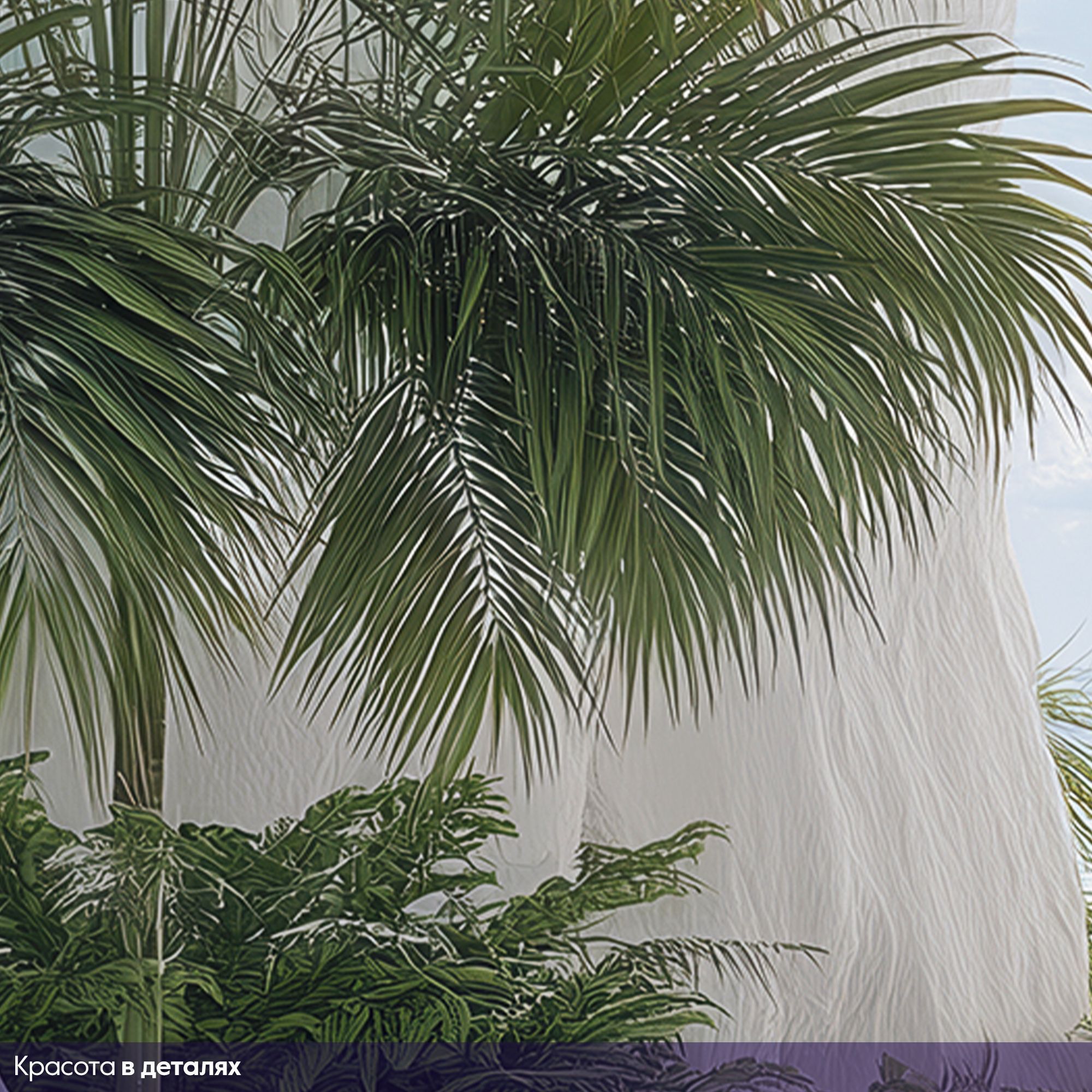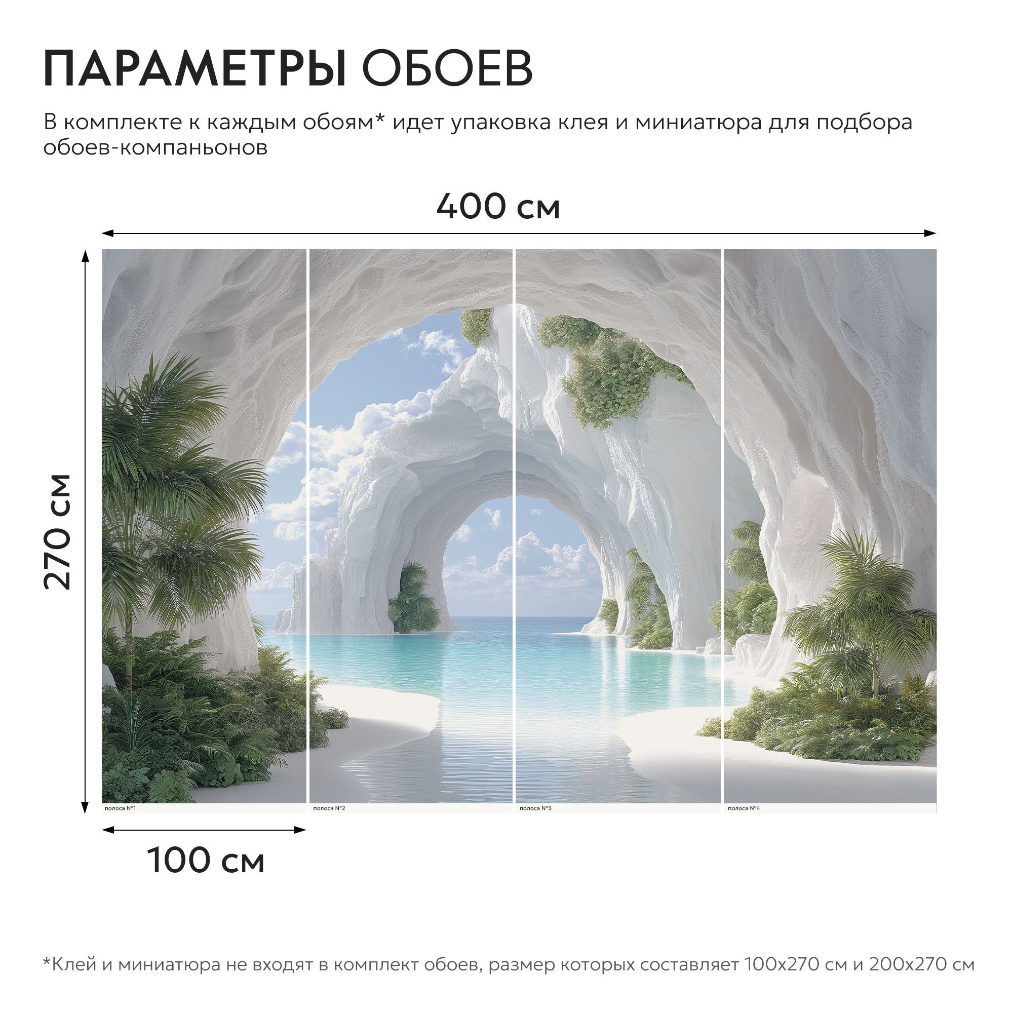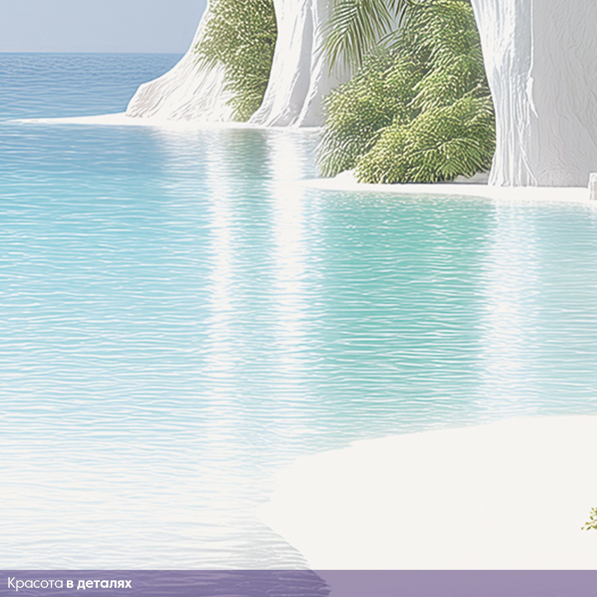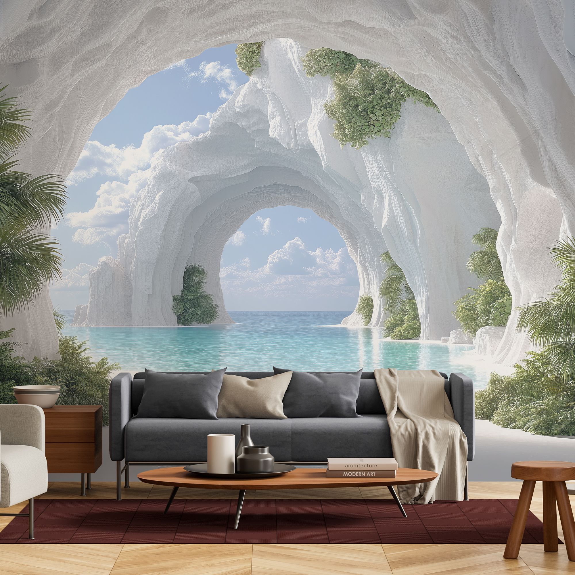 На этих фотообоях изображён фантастический пейзаж с белоснежной пещерой, состоящей из величественных арок, напоминающих архитектурное чудо природы. Белые стены создают ощущение чистоты и свежести, а через арки виднеется спокойная лазурная вода, переходящая в бескрайний океан под светлым небом с лёгкими облаками. По краям фотообоев растут пышные тропические растения — пальмы и кустарники, придающие живой зелёный акцент и контраст белоснежным каменным стенам. Такие фотообои создают атмосферу умиротворённости и расширяют пространство комнаты, будто открывая окно в волшебный морской пейзаж.