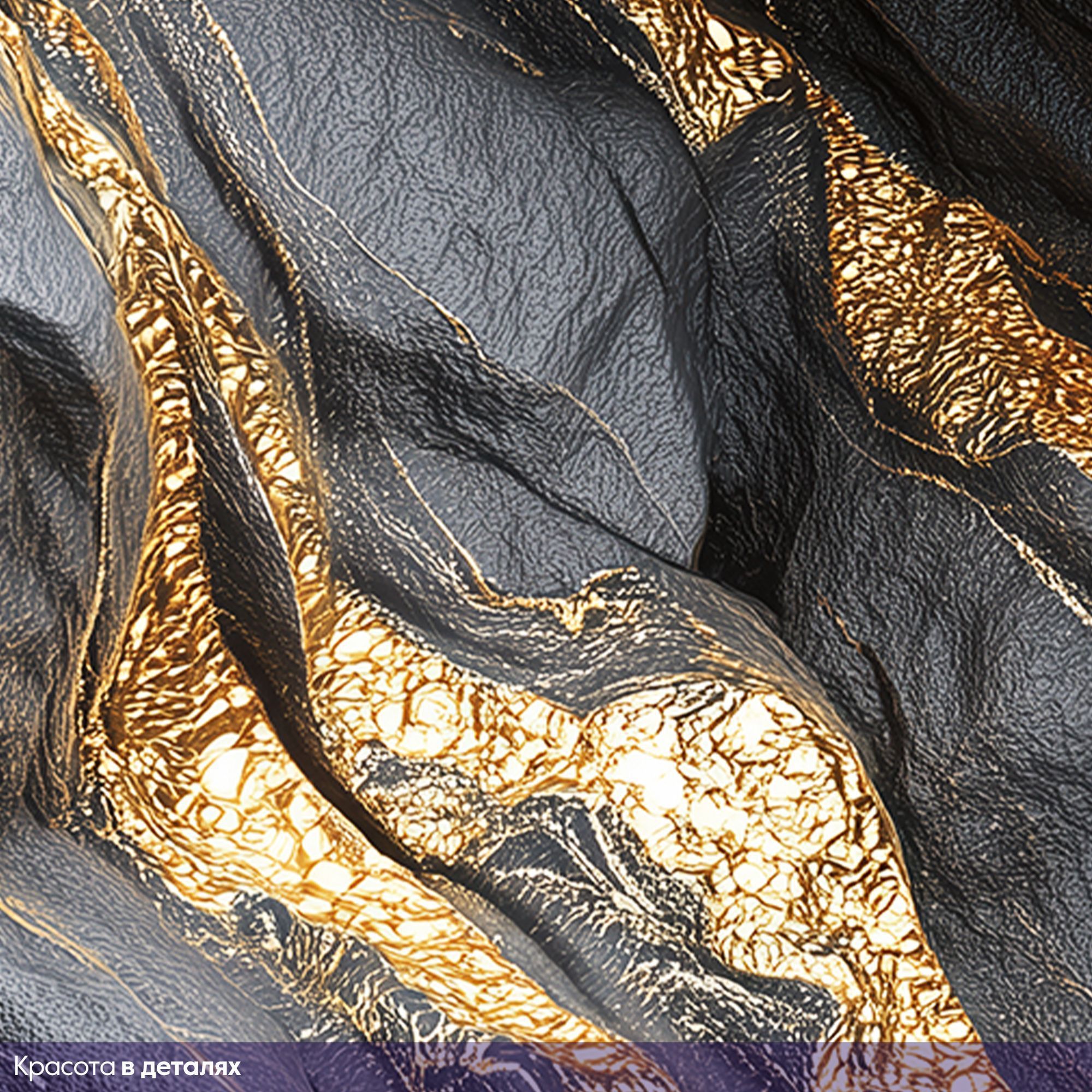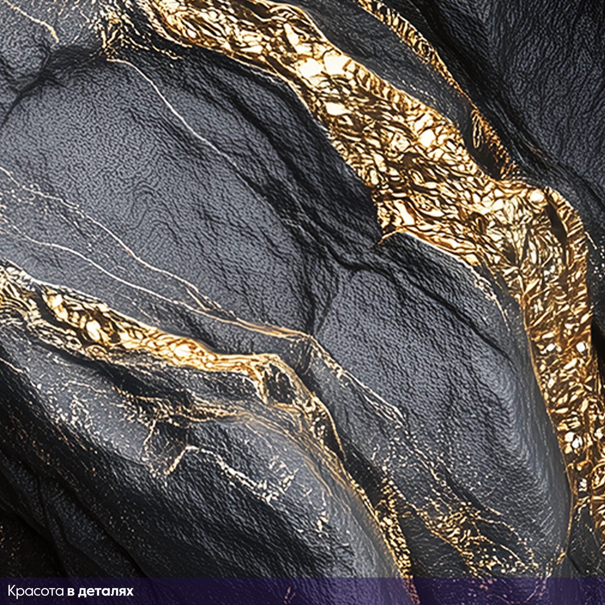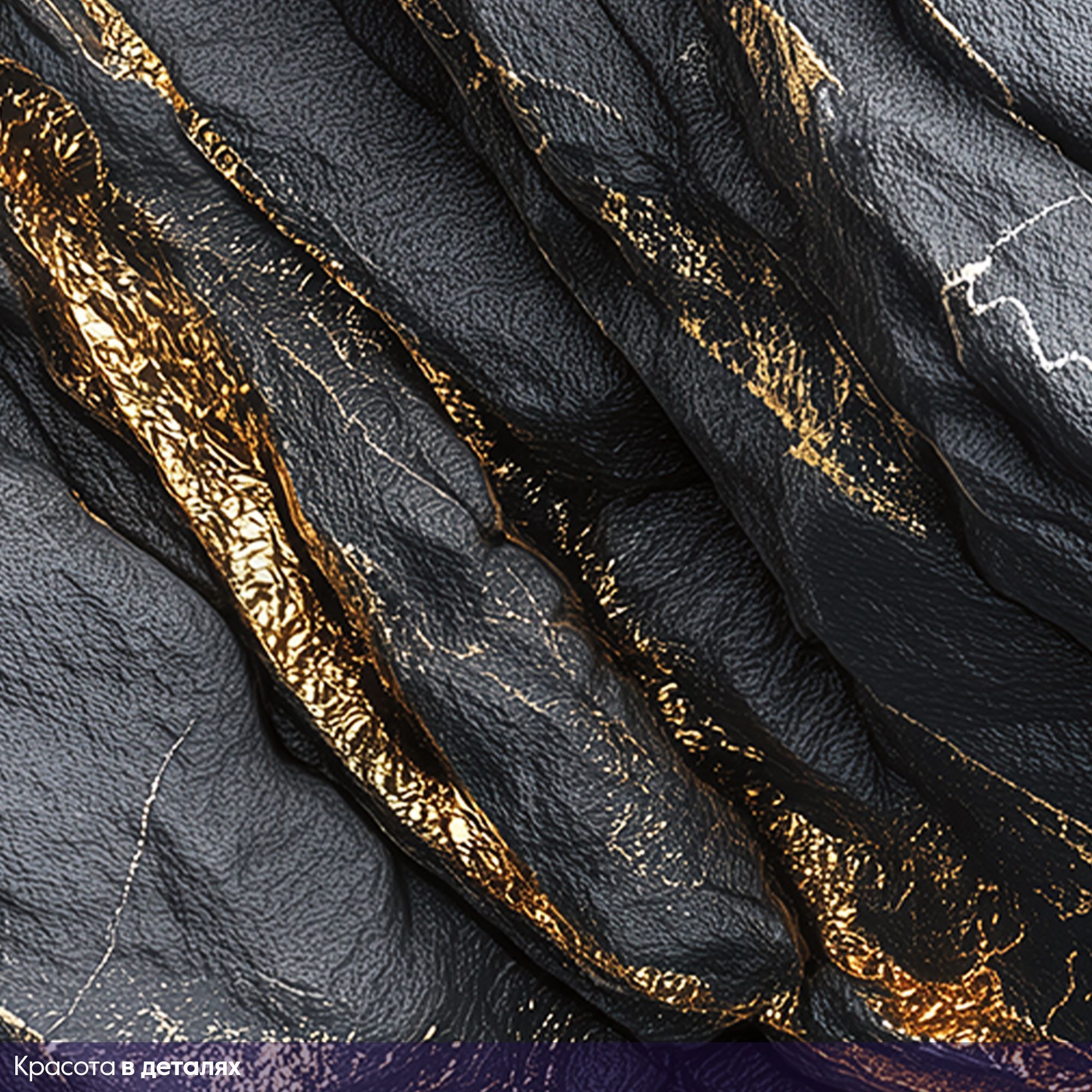 Эти фотообои — воплощение роскоши и природной мощи, словно фрагмент драгоценного чёрного мрамора с золотыми прожилками, перенесённый прямо на стену вашего дома. Глубокий, насыщенный чёрный фон, будто ночное небо, пронизан мерцающими золотыми линиями, напоминающими потоки расплавленного золота, застывшие в камне. Текстура поверхности поражает своей реалистичностью: кажется, что можно провести рукой по рельефу, ощутить прохладную твёрдость мрамора и блеск золотых вкраплений. Игра света и тени на прожилках создаёт завораживающий эффект глубины, превращая стену в динамичную композицию. Золотые линии то утончаются, то расширяются, образуя причудливые узоры, которые притягивают взгляд и не оставляют равнодушным. Этот дизайн сочетает в себе одновременно: таинственность — благодаря тёмному фону; роскошь — за счёт золотых акцентов; силу природы — в фактуре и рельефе камня. Станут центральным акцентом в современном или арт-деко интерьере. Отлично сочетаются с глянцевой мебелью, хромированными элементами и стеклянными поверхностями. Они станут не просто украшением, а ключевым элементом дизайна, задающим характер всему пространству.