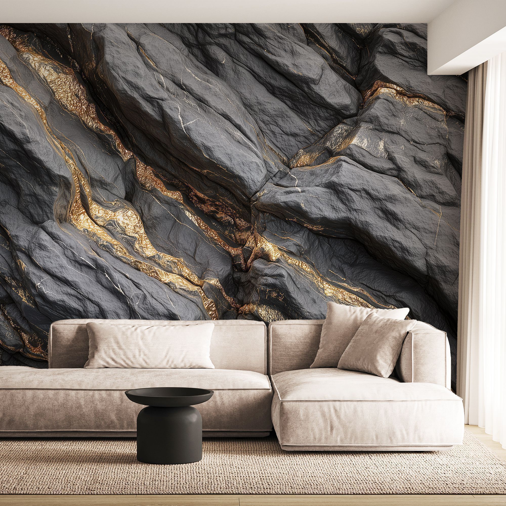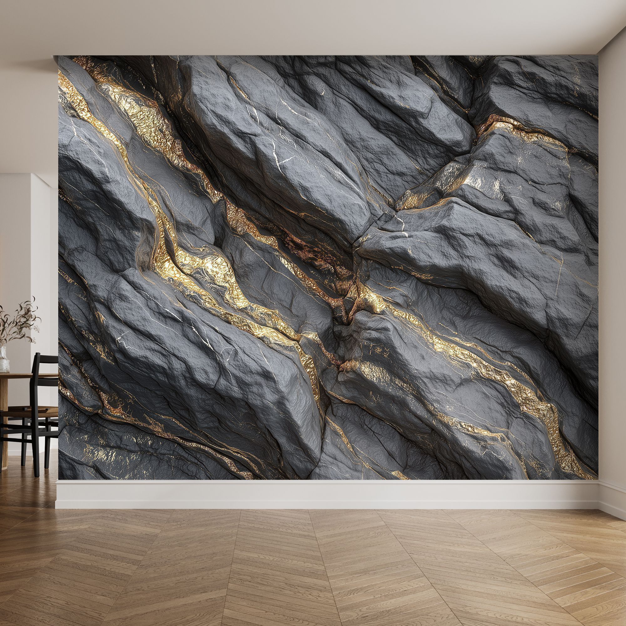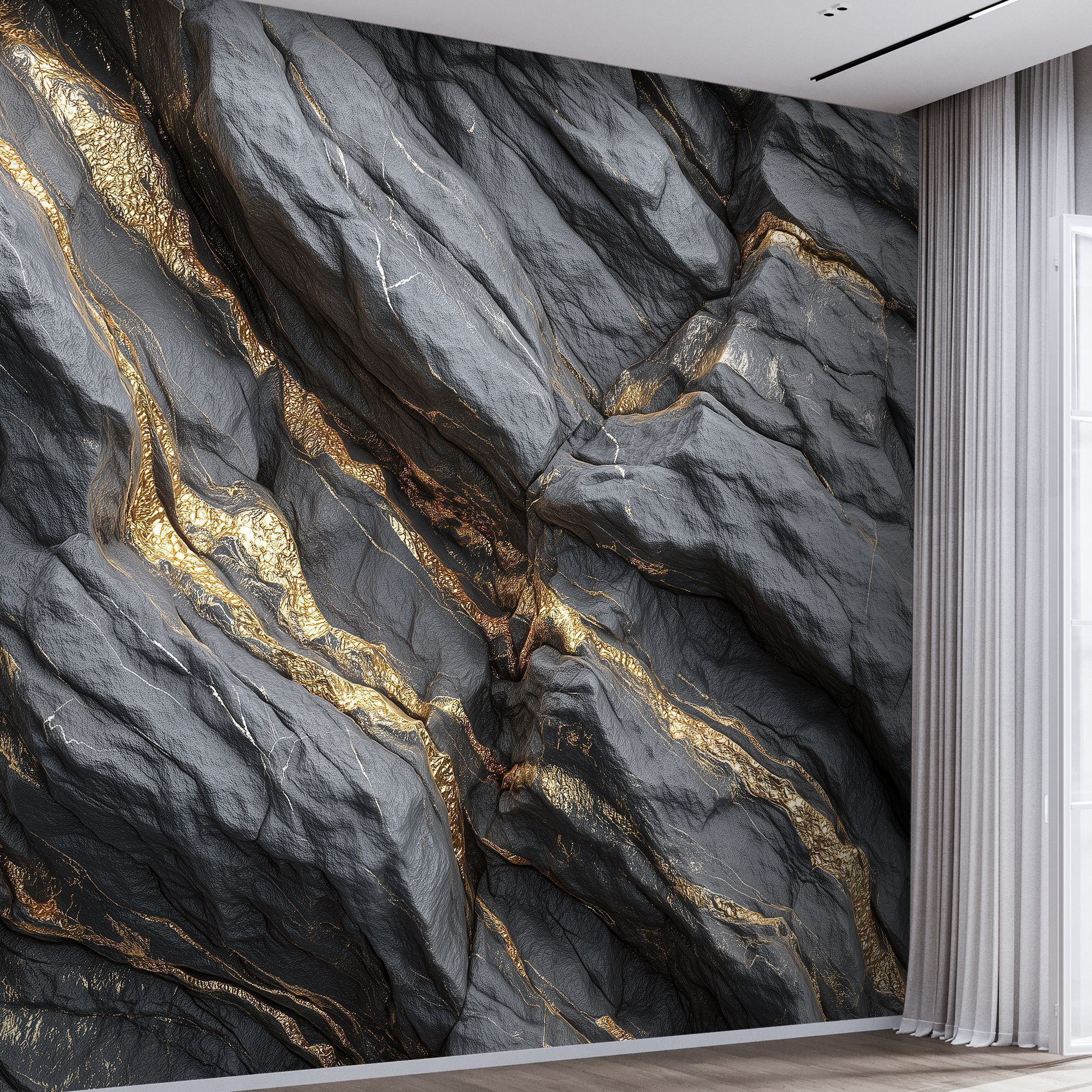 Эти фотообои — воплощение роскоши и природной мощи, словно фрагмент драгоценного чёрного мрамора с золотыми прожилками, перенесённый прямо на стену вашего дома. Глубокий, насыщенный чёрный фон, будто ночное небо, пронизан мерцающими золотыми линиями, напоминающими потоки расплавленного золота, застывшие в камне. Текстура поверхности поражает своей реалистичностью: кажется, что можно провести рукой по рельефу, ощутить прохладную твёрдость мрамора и блеск золотых вкраплений. Игра света и тени на прожилках создаёт завораживающий эффект глубины, превращая стену в динамичную композицию. Золотые линии то утончаются, то расширяются, образуя причудливые узоры, которые притягивают взгляд и не оставляют равнодушным. Этот дизайн сочетает в себе одновременно: таинственность — благодаря тёмному фону; роскошь — за счёт золотых акцентов; силу природы — в фактуре и рельефе камня. Станут центральным акцентом в современном или арт-деко интерьере. Отлично сочетаются с глянцевой мебелью, хромированными элементами и стеклянными поверхностями. Они станут не просто украшением, а ключевым элементом дизайна, задающим характер всему пространству.