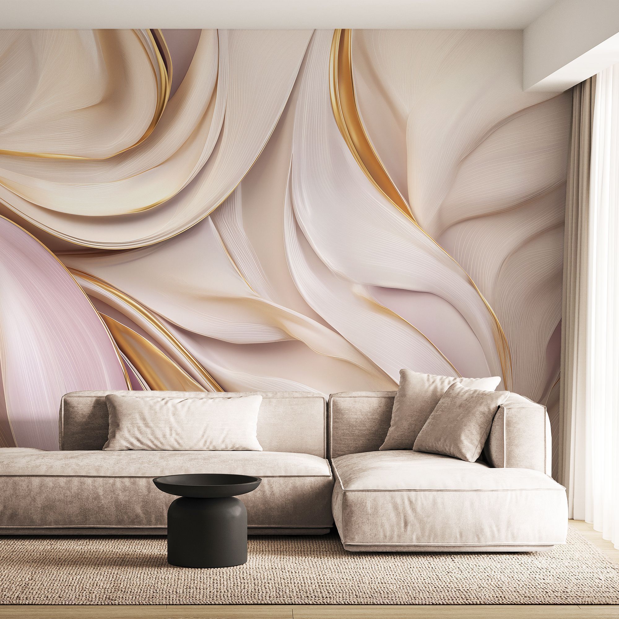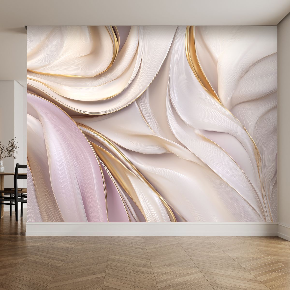 Эти фотообои — воплощение утончённой элегантности и изысканности, способное преобразить любое пространство. Абстрактный дизайн напоминает струящуюся ткань или шёлковые волны, окутанные мягким светом. Плавные линии и изгибы создают ощущение движения, лёгкости и воздушности. Цветовая гамма: нежные пастельные оттенки — кремовый, бежевый, светло-розовый — гармонично сочетаются с благородными золотыми линиями, придающими обоям роскошный акцент. Текстурная иллюзия: изображение имитирует шелковистую поверхность, создавая эффект трёхмерности и тактильной глубины. Динамика композиции: волнообразные линии будто застыли в танце, наполняя пространство энергией и грацией. Баланс контраста: золотые акценты подчёркивают изгибы, добавляют блеска и делают дизайн более выразительным, не перегружая его. Универсальность: абстрактный мотив не привязан к определённой тематике, что позволяет органично вписать обои в разные стили интерьера. Эти фотообои не просто украсят стену, а превратят помещение в пространство высокой эстетики, где каждая деталь работает на создание атмосферы роскоши и гармонии. Идеальный выбор для тех, кто ценит утончённость и стремится добавить в интерьер нотку аристократизма!