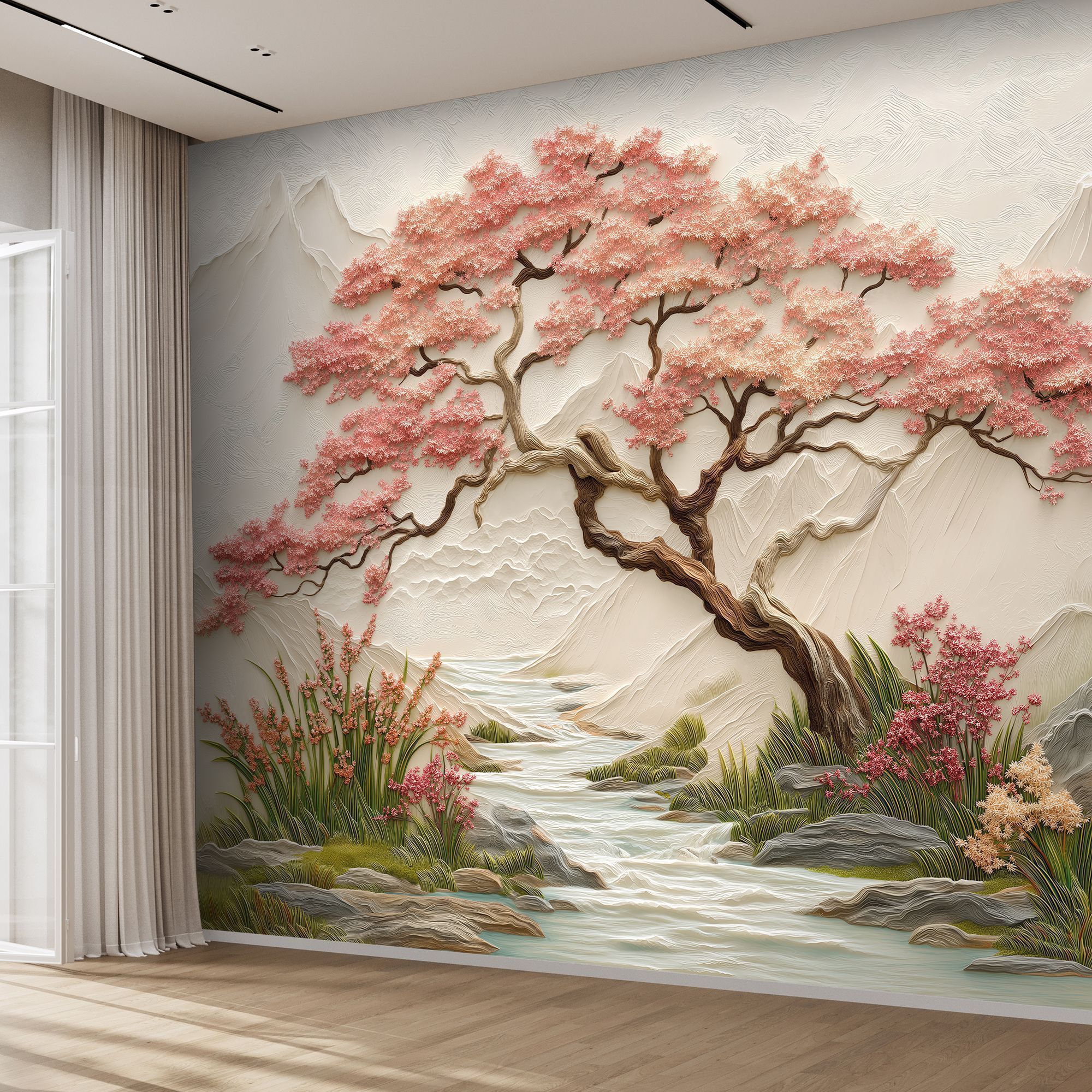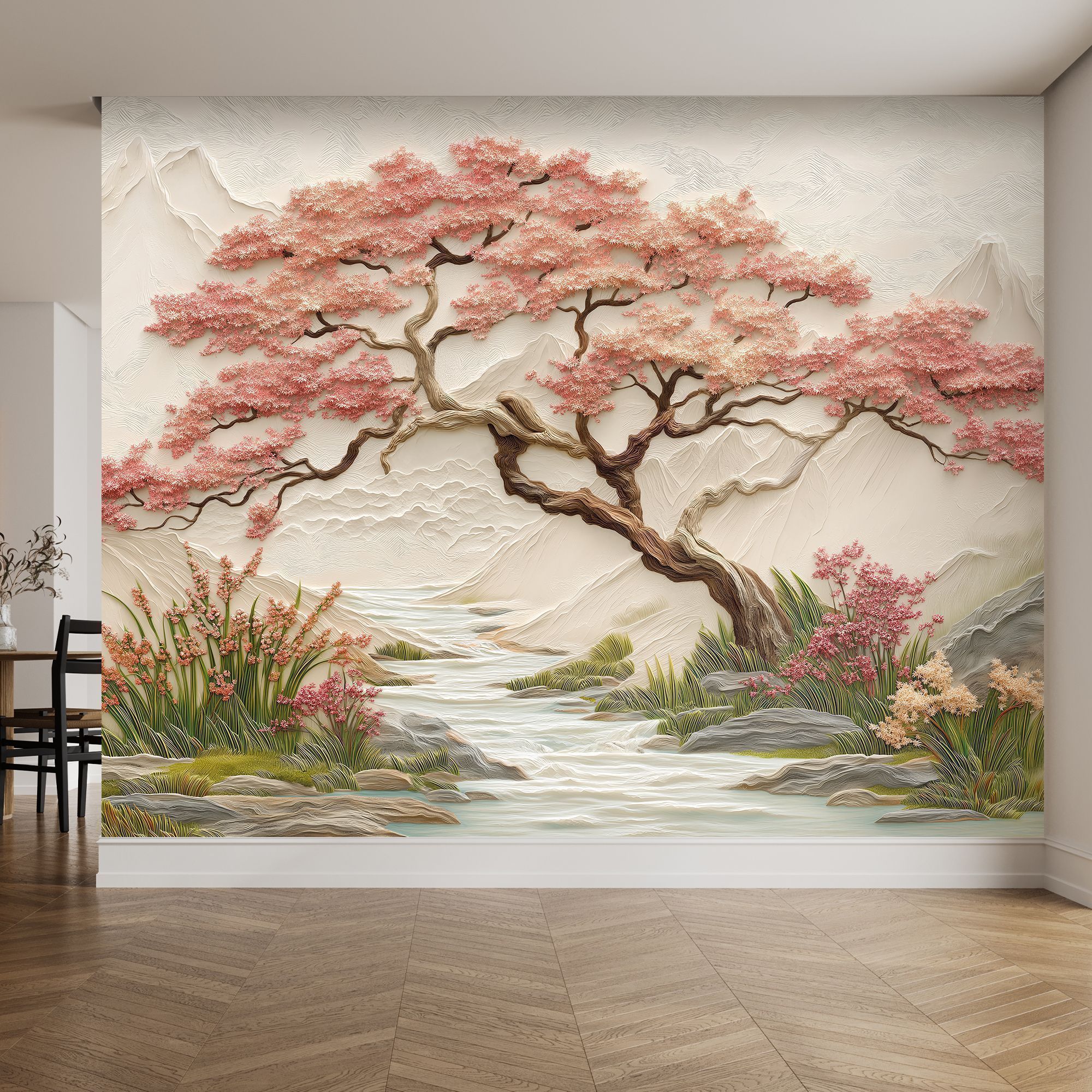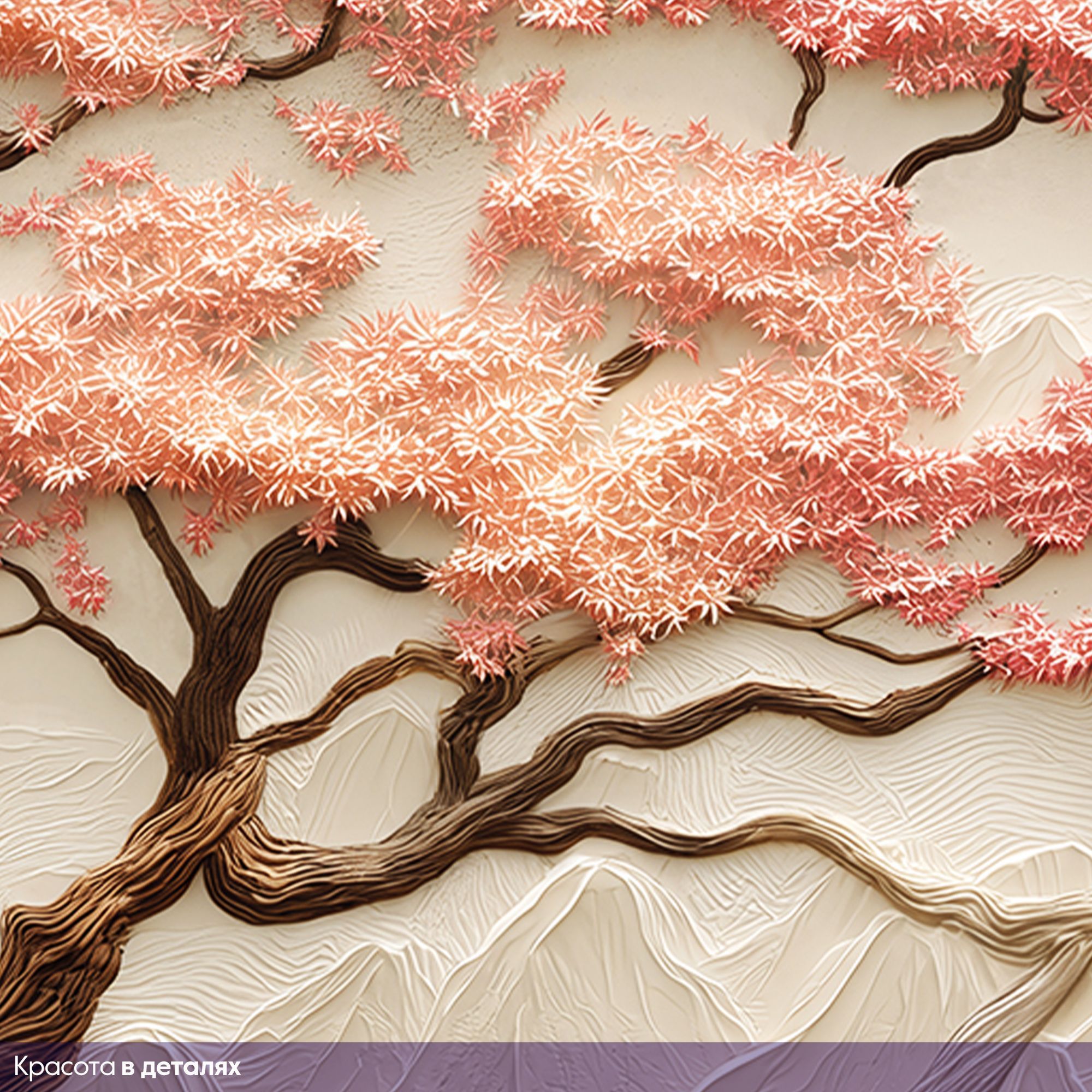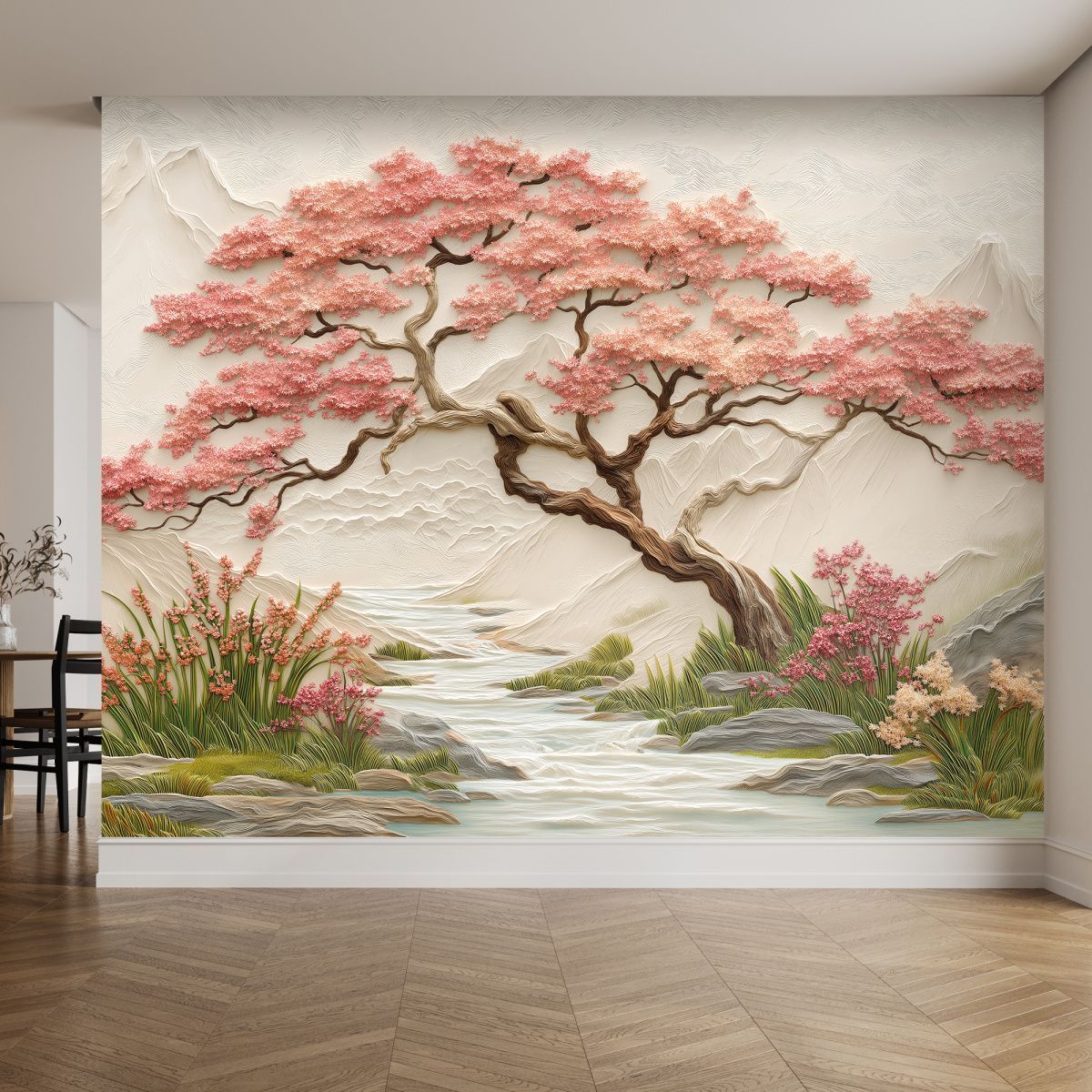Эти фотообои — истинное воплощение восточной эстетики и природной гармонии. На них изображён изысканный пейзаж: величественная сакура с пышными розовыми соцветиями склоняется над извилистым ручьём, обрамлённым сочной зеленью и цветущими растениями. На заднем плане возвышаются мягкие контуры гор, словно выточенные из мрамора, придающие композиции глубину и умиротворённость. Объёмная текстура — создаёт эффект барельефа, будто сцена оживает прямо на стене. Нежная пастельная палитра — сочетание розовых, бежевых, зелёных и голубых оттенков наполняет пространство светом и спокойствием. Детализированная прорисовка — каждый лепесток сакуры, каждая травинка и камень у ручья прорисованы с удивительной точностью. Баланс между динамикой и спокойствием — изогнутые ветви дерева и плавное течение ручья создают ощущение лёгкого движения, не нарушая общей гармонии. Восточная стилистика — композиция напоминает традиционные японские гравюры, добавляя интерьеру нотку утончённости. Фотообои станут центральным акцентом, придадут пространству изысканность и создадут атмосферу умиротворения. Идеально подойдут для интерьеров в восточном, минималистичном или экостиле.