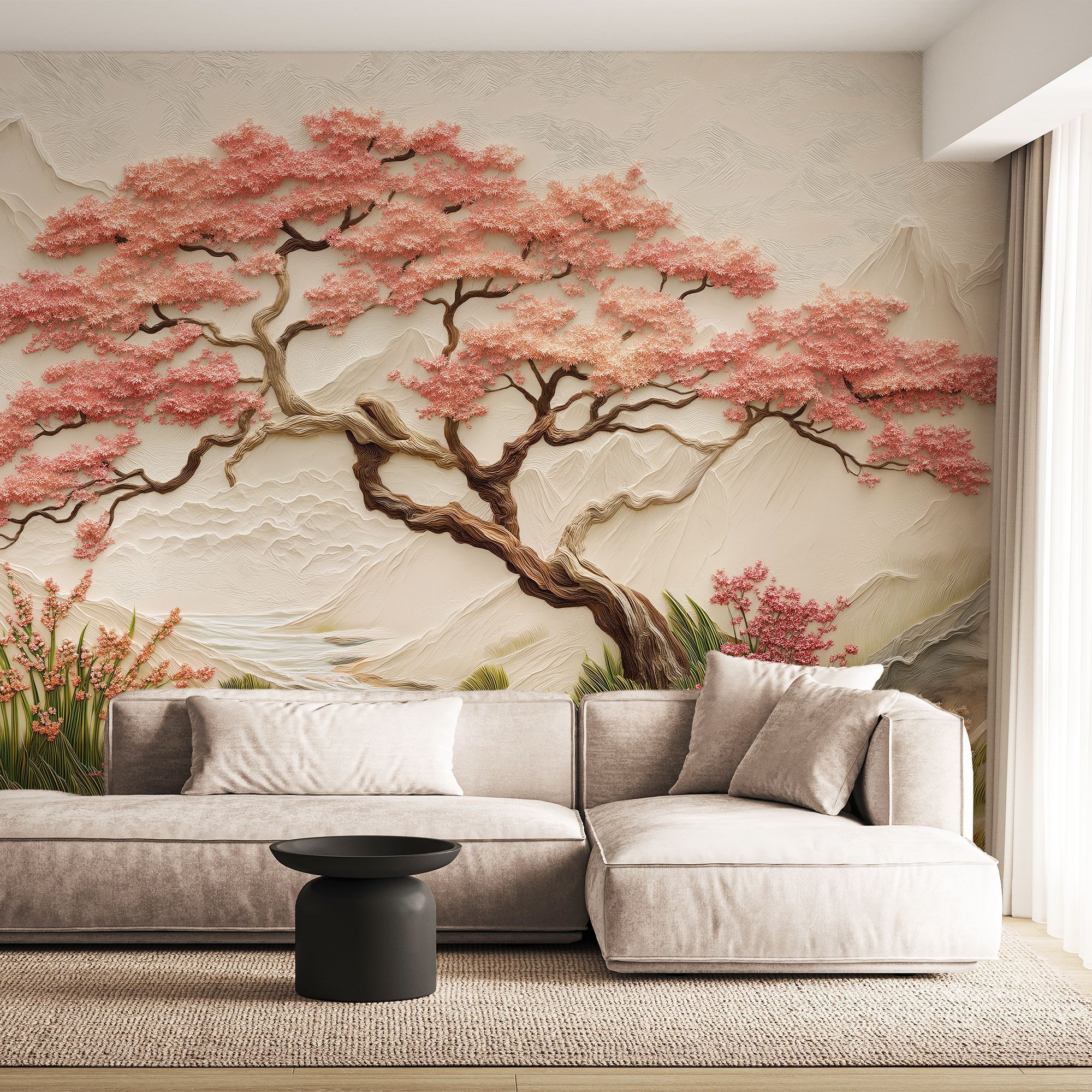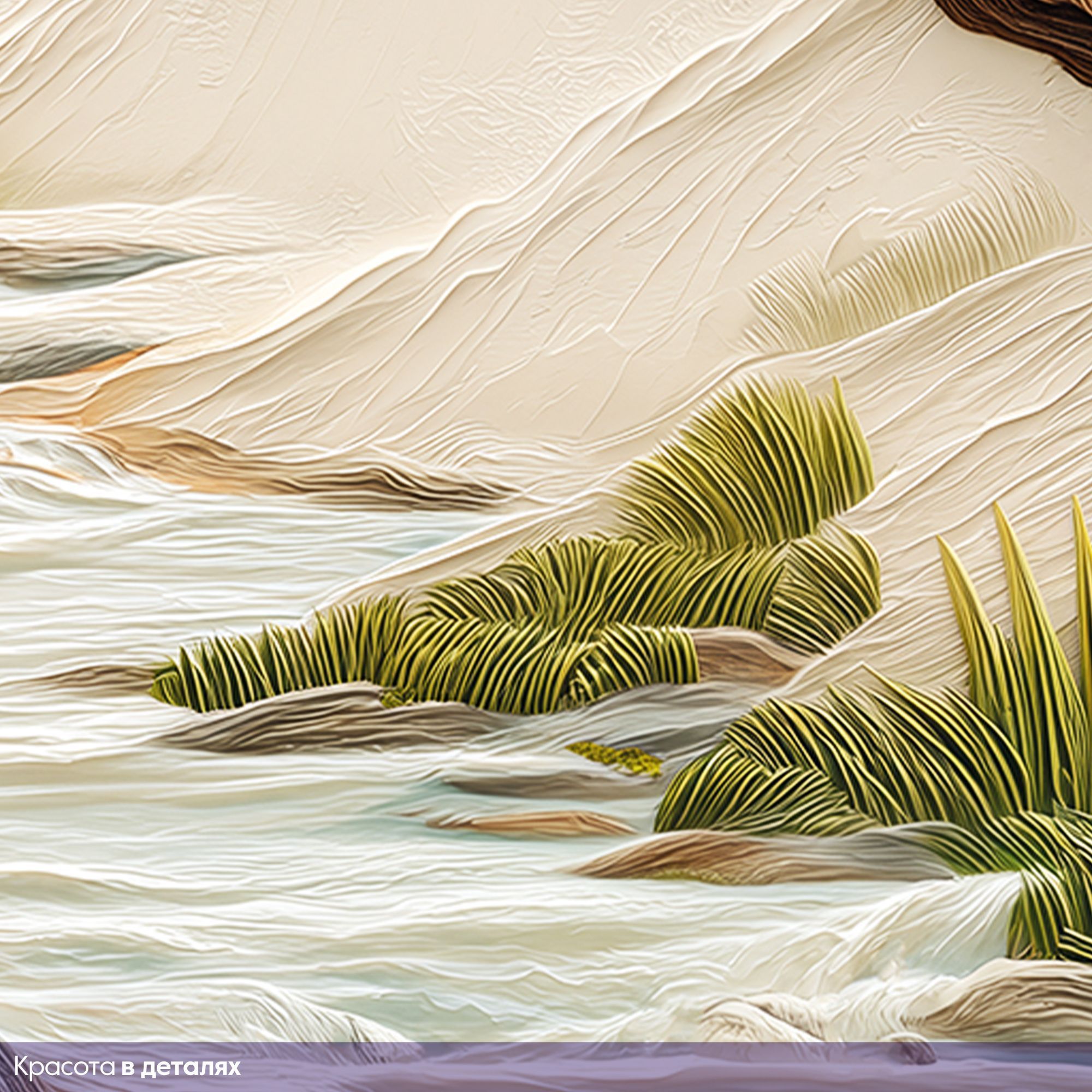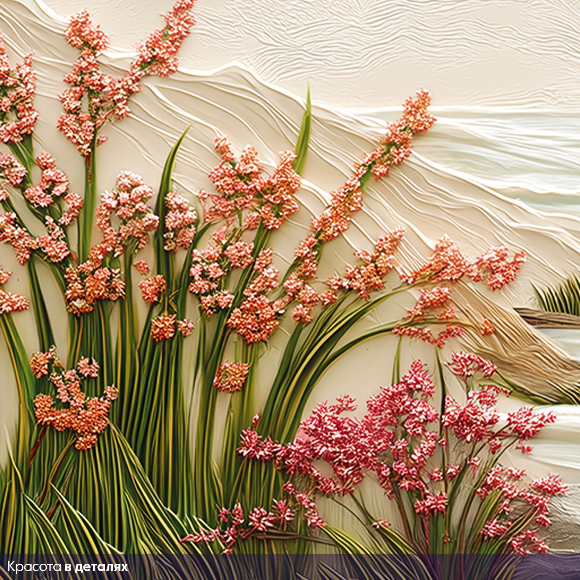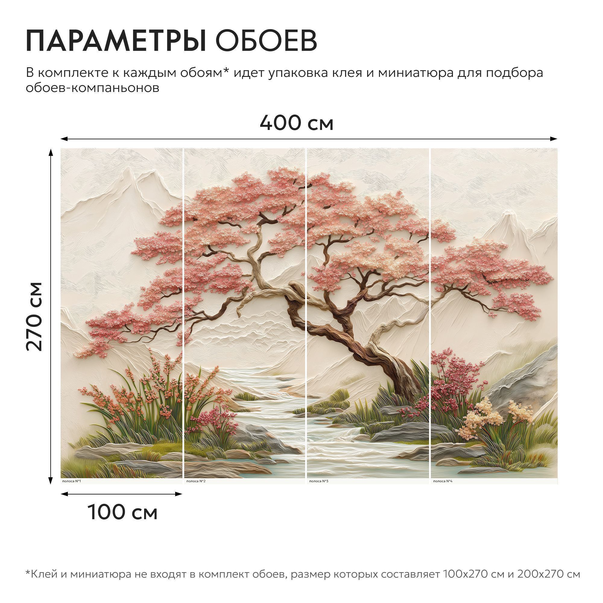 Эти фотообои — истинное воплощение восточной эстетики и природной гармонии. На них изображён изысканный пейзаж: величественная сакура с пышными розовыми соцветиями склоняется над извилистым ручьём, обрамлённым сочной зеленью и цветущими растениями. На заднем плане возвышаются мягкие контуры гор, словно выточенные из мрамора, придающие композиции глубину и умиротворённость. Объёмная текстура — создаёт эффект барельефа, будто сцена оживает прямо на стене. Нежная пастельная палитра — сочетание розовых, бежевых, зелёных и голубых оттенков наполняет пространство светом и спокойствием. Детализированная прорисовка — каждый лепесток сакуры, каждая травинка и камень у ручья прорисованы с удивительной точностью. Баланс между динамикой и спокойствием — изогнутые ветви дерева и плавное течение ручья создают ощущение лёгкого движения, не нарушая общей гармонии. Восточная стилистика — композиция напоминает традиционные японские гравюры, добавляя интерьеру нотку утончённости. Фотообои станут центральным акцентом, придадут пространству изысканность и создадут атмосферу умиротворения. Идеально подойдут для интерьеров в восточном, минималистичном или экостиле.