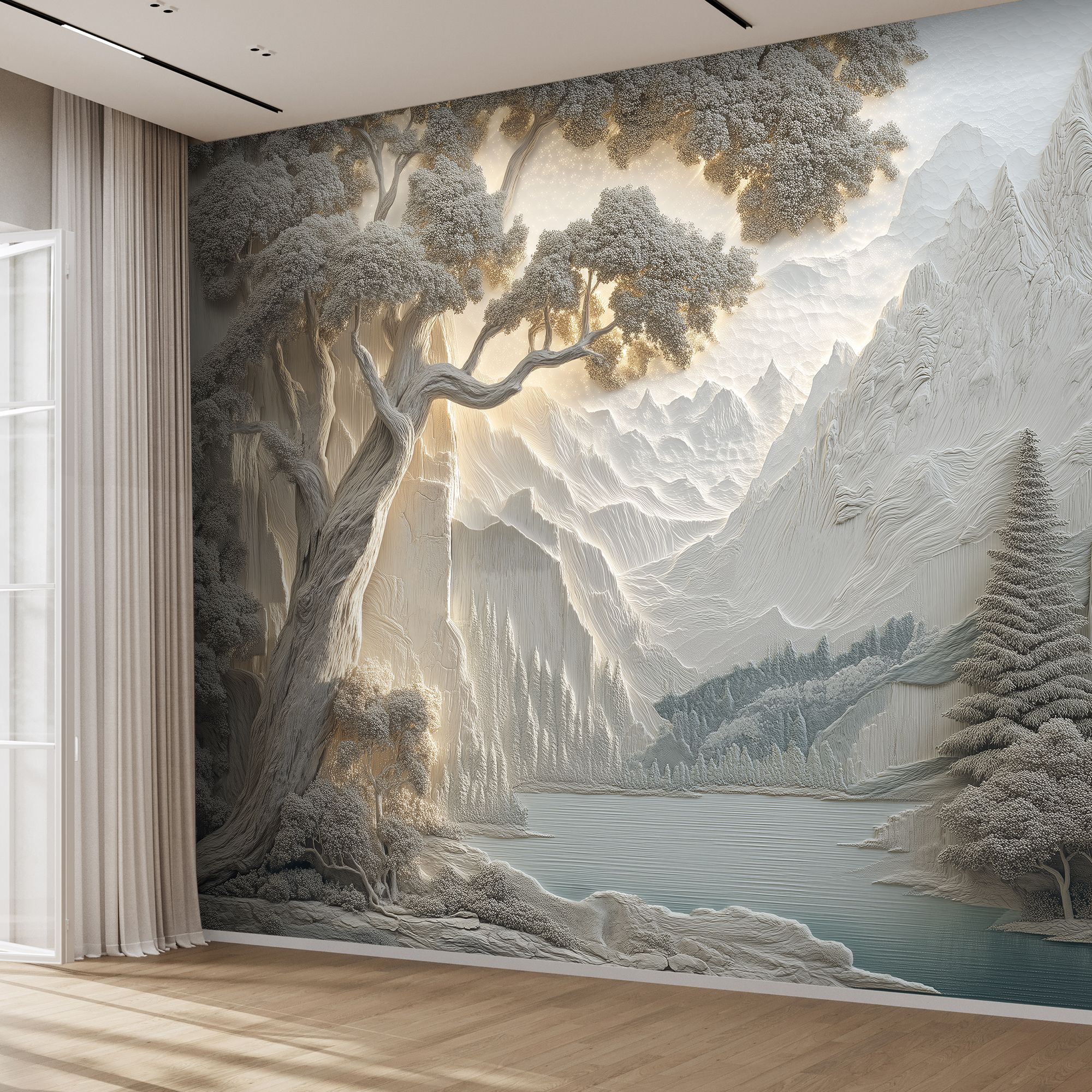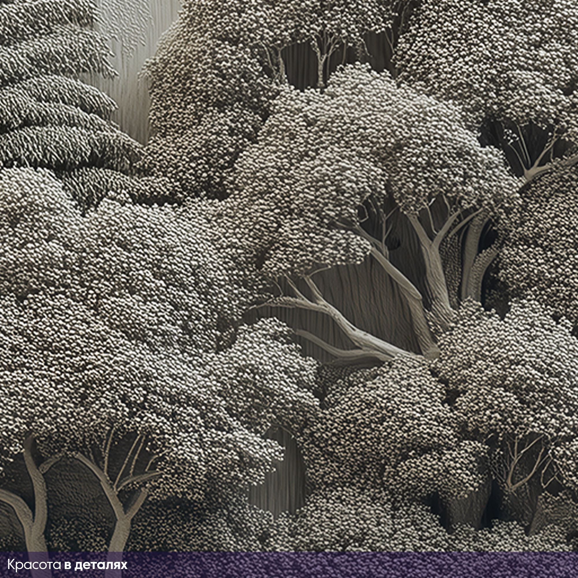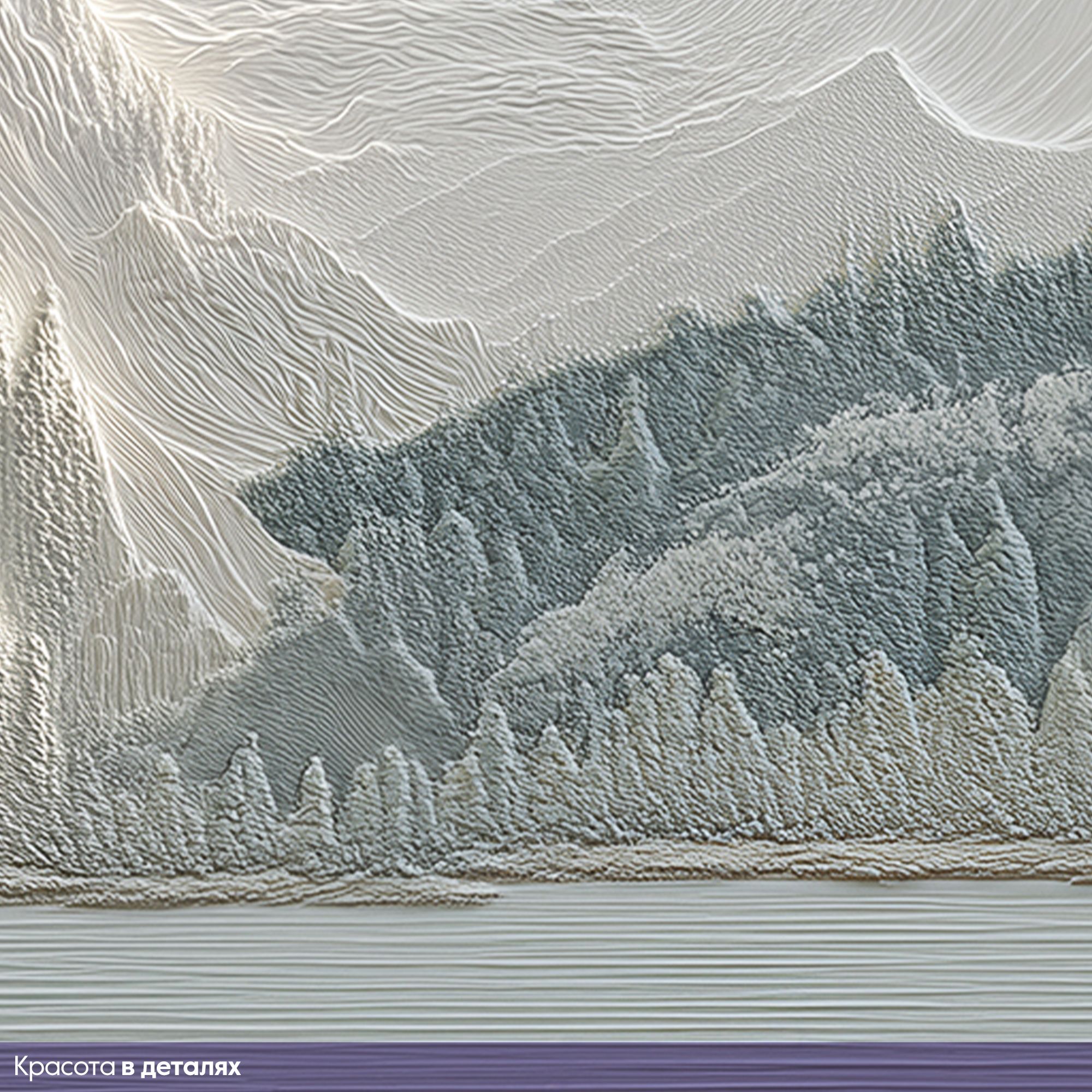 Эти фотообои — истинное воплощение природной гармонии и величия, выполненное в изысканной стилистике барельефа. На них запечатлён завораживающий горный пейзаж: величественные хребты, словно вырезанные из мрамора, плавно уходят вдаль, обрамлённые густыми лесами. На переднем плане раскинулось спокойное озеро, отражающее мягкие оттенки окружающего ландшафта. Особое очарование композиции придают массивные деревья с изогнутыми стволами и пышной кроной, словно сошедшие со страниц восточной живописи. Объёмность и рельефность — изображение имитирует трёхмерный барельеф, создавая иллюзию глубины и текстуры, будто стены комнаты становятся частью природного пейзажа. Нежная цветовая гамма — преобладают пастельные бежево-серые тона с лёгкими акцентами голубого в озере, что создаёт атмосферу умиротворения и лёгкости. Детализированная прорисовка — каждая ветка, складка гор и рябь на воде прорисованы с удивительной тщательностью, придавая обоям художественную ценность. Баланс между суровостью и нежностью — сочетание мощных горных массивов и изящных деревьев создаёт гармоничный контраст. Эффект мягкого освещения — световые блики на горах и листве добавляют реалистичности и глубины. Эти фотообои перенесут вас в мир первозданной красоты, наполнят дом атмосферой спокойствия и величия природы. Идеальный выбор для ценителей эстетики, гармонии и утончённого дизайна!