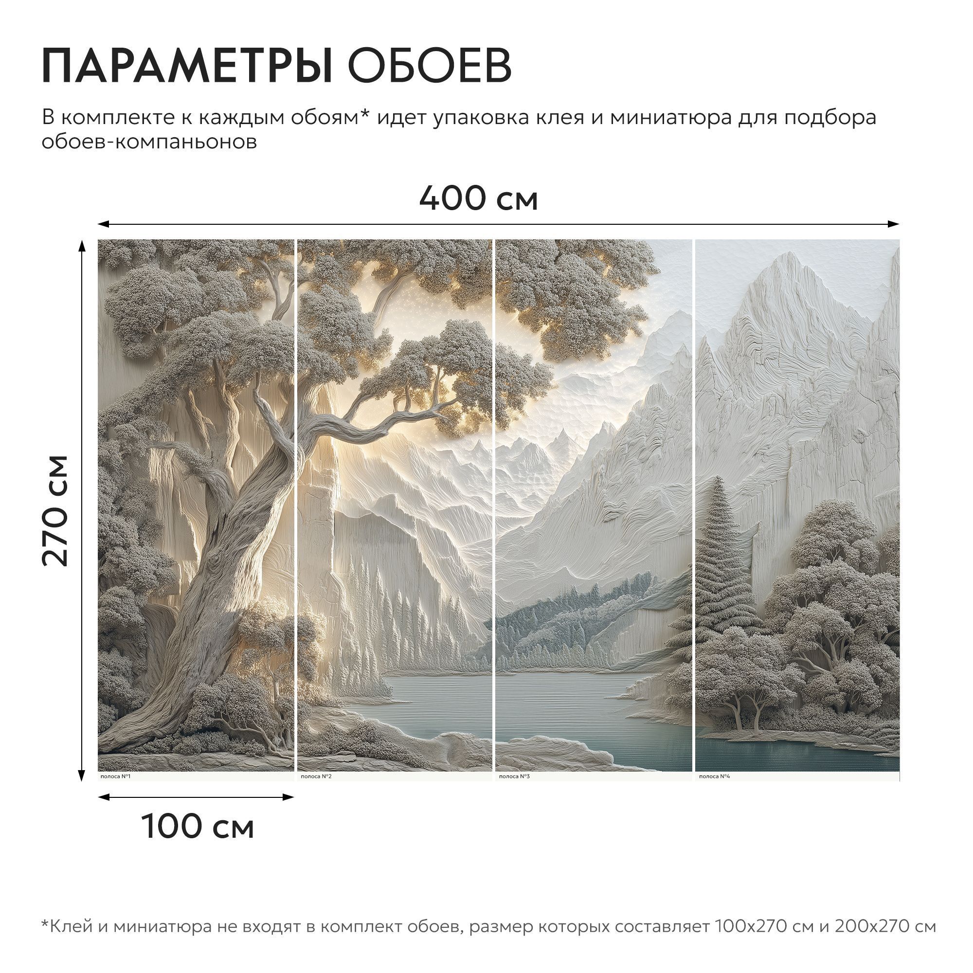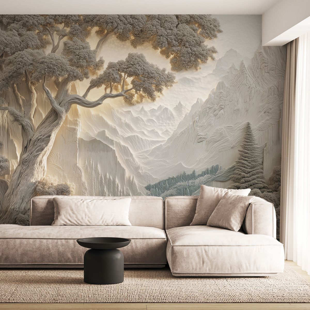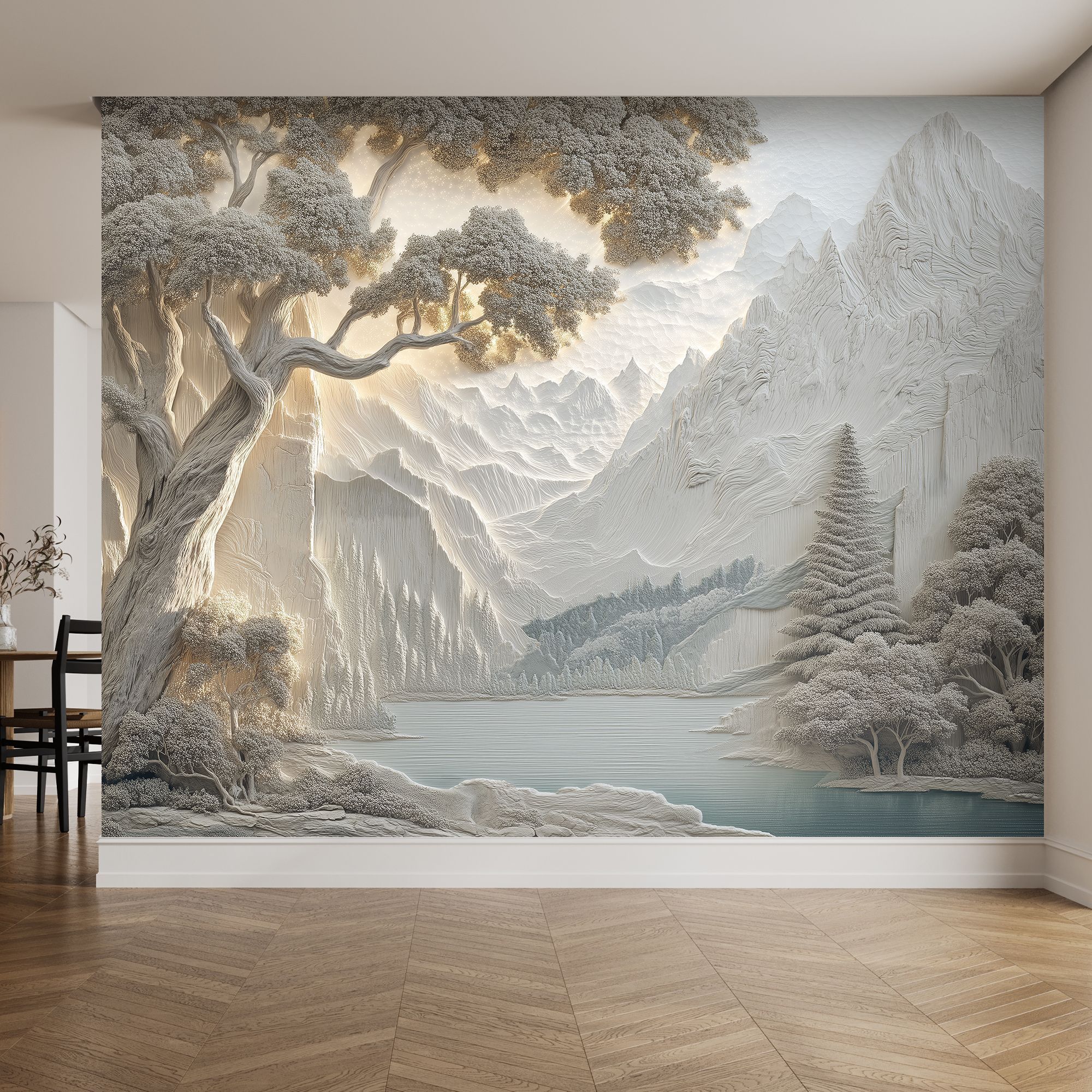 Эти фотообои — истинное воплощение природной гармонии и величия, выполненное в изысканной стилистике барельефа. На них запечатлён завораживающий горный пейзаж: величественные хребты, словно вырезанные из мрамора, плавно уходят вдаль, обрамлённые густыми лесами. На переднем плане раскинулось спокойное озеро, отражающее мягкие оттенки окружающего ландшафта. Особое очарование композиции придают массивные деревья с изогнутыми стволами и пышной кроной, словно сошедшие со страниц восточной живописи. Объёмность и рельефность — изображение имитирует трёхмерный барельеф, создавая иллюзию глубины и текстуры, будто стены комнаты становятся частью природного пейзажа. Нежная цветовая гамма — преобладают пастельные бежево-серые тона с лёгкими акцентами голубого в озере, что создаёт атмосферу умиротворения и лёгкости. Детализированная прорисовка — каждая ветка, складка гор и рябь на воде прорисованы с удивительной тщательностью, придавая обоям художественную ценность. Баланс между суровостью и нежностью — сочетание мощных горных массивов и изящных деревьев создаёт гармоничный контраст. Эффект мягкого освещения — световые блики на горах и листве добавляют реалистичности и глубины. Эти фотообои перенесут вас в мир первозданной красоты, наполнят дом атмосферой спокойствия и величия природы. Идеальный выбор для ценителей эстетики, гармонии и утончённого дизайна!