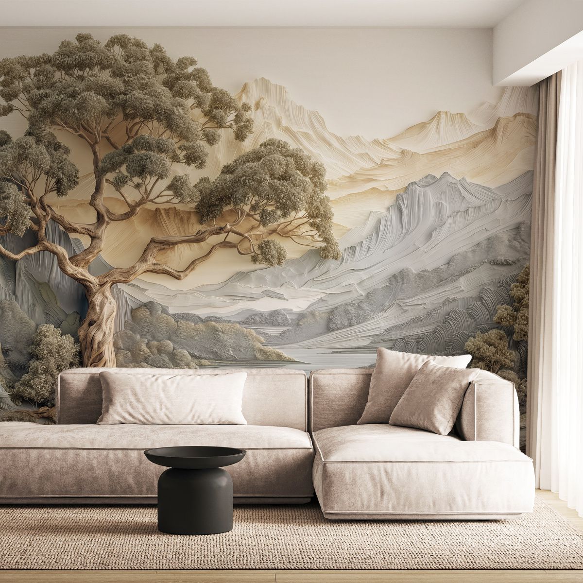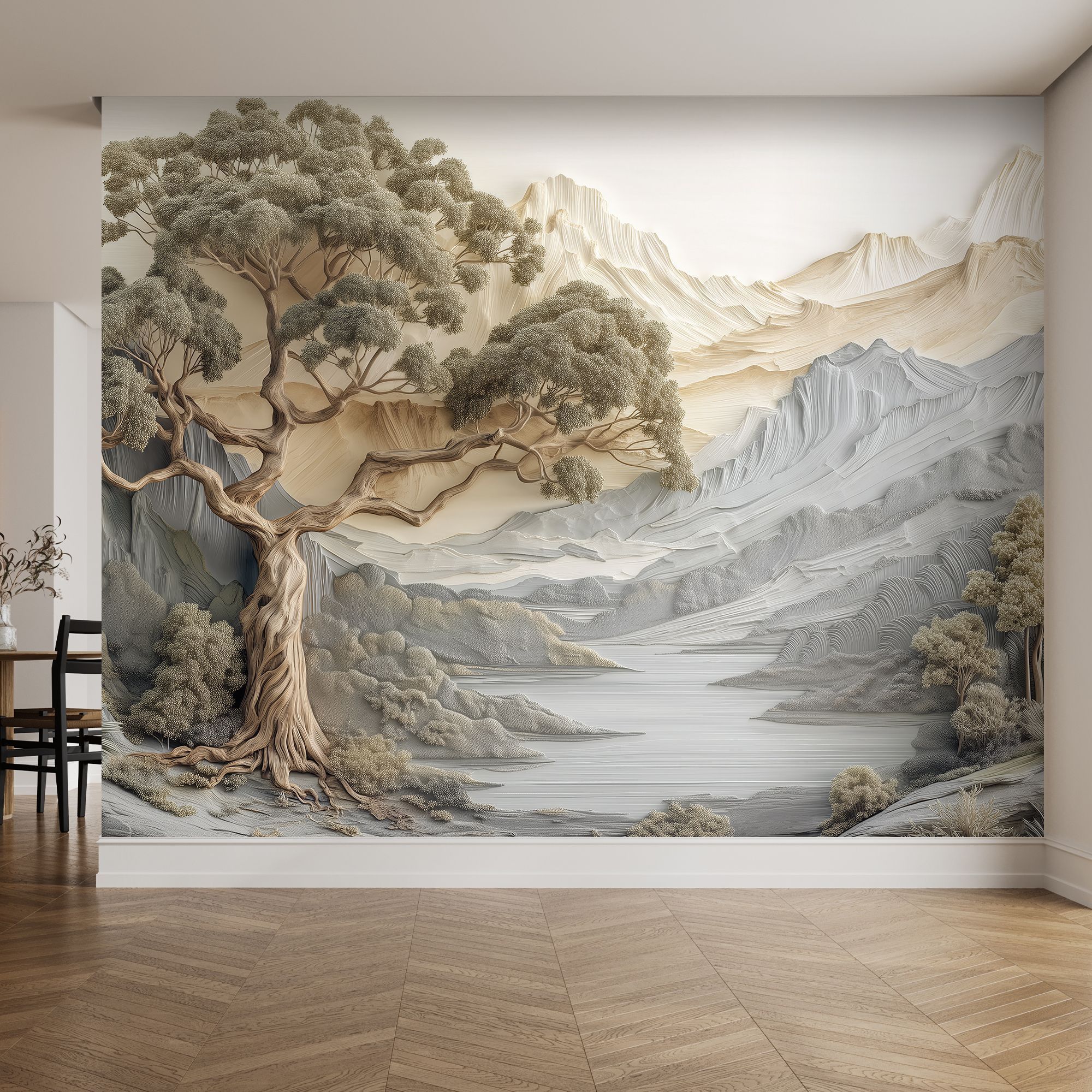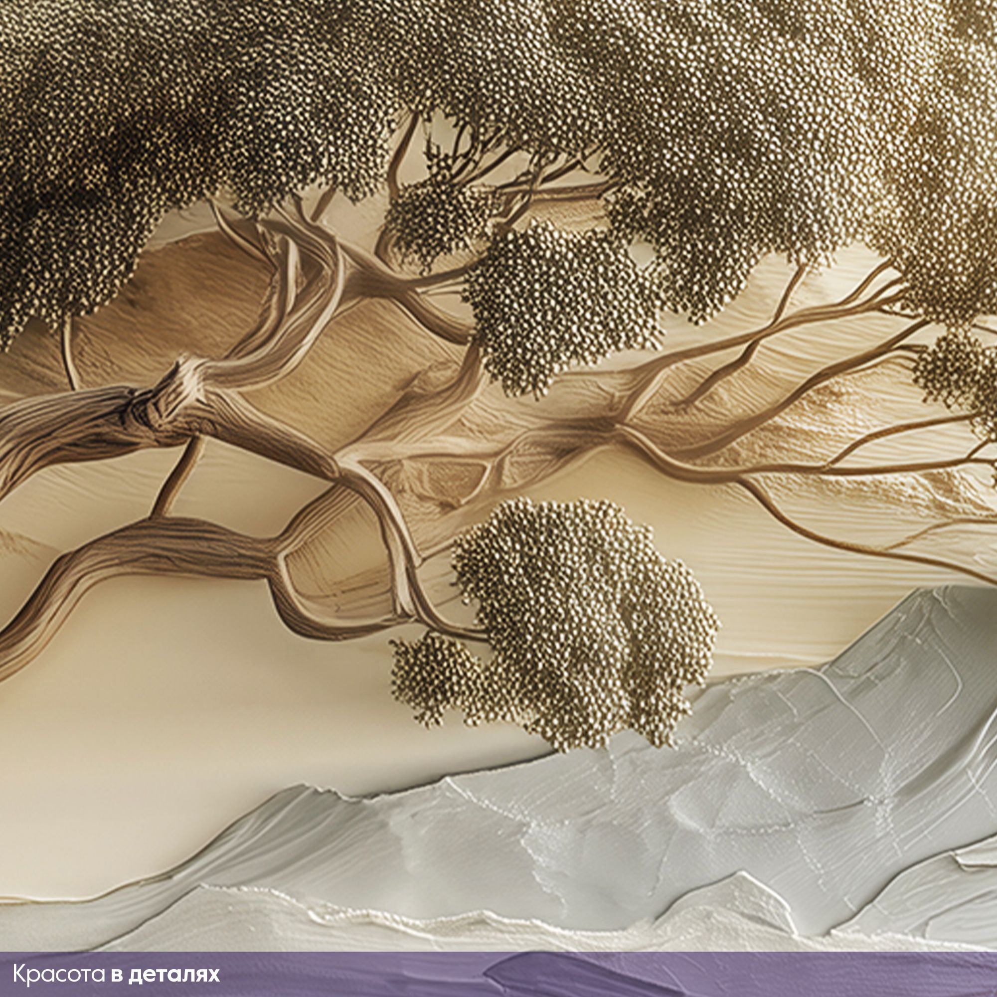 Эти фотообои — настоящий шедевр, воплощающий гармонию природы в изысканной художественной манере. На них запечатлён величественный пейзаж: могучее дерево с раскидистыми ветвями и мощной корневой системой занимает центральное место, словно страж, оберегающий покой долины. Вокруг — мягкие контуры горных хребтов, плавно перетекающих друг в друга, и спокойное озеро, отражающее приглушённые оттенки окружающего ландшафта. Объёмная стилизация: изображение напоминает барельеф или искусно вылепленную скульптуру, создающую иллюзию глубины и трёхмерности. Цветовая гамма: нежные пастельные тона — бежевые, серые, светло-зелёные — формируют умиротворяющую атмосферу, не перегружая взгляд. Детализация: каждая деталь проработана с удивительной тщательностью — от текстуры коры дерева до лёгких изгибов горных склонов и нежных очертаний кустарников. Композиционная выразительность: сочетание мощного дерева на переднем плане и уходящих вдаль гор создаёт ощущение простора и одновременно защищённости. Эстетика: дизайн сочетает природную красоту с художественной утончённостью, напоминая работы мастеров восточной живописи. Фотообои станут центральным акцентом, придадут пространству благородную сдержанность и создадут атмосферу умиротворения. Идеально для интерьеров в стиле эко, минимализм или скандинавский.