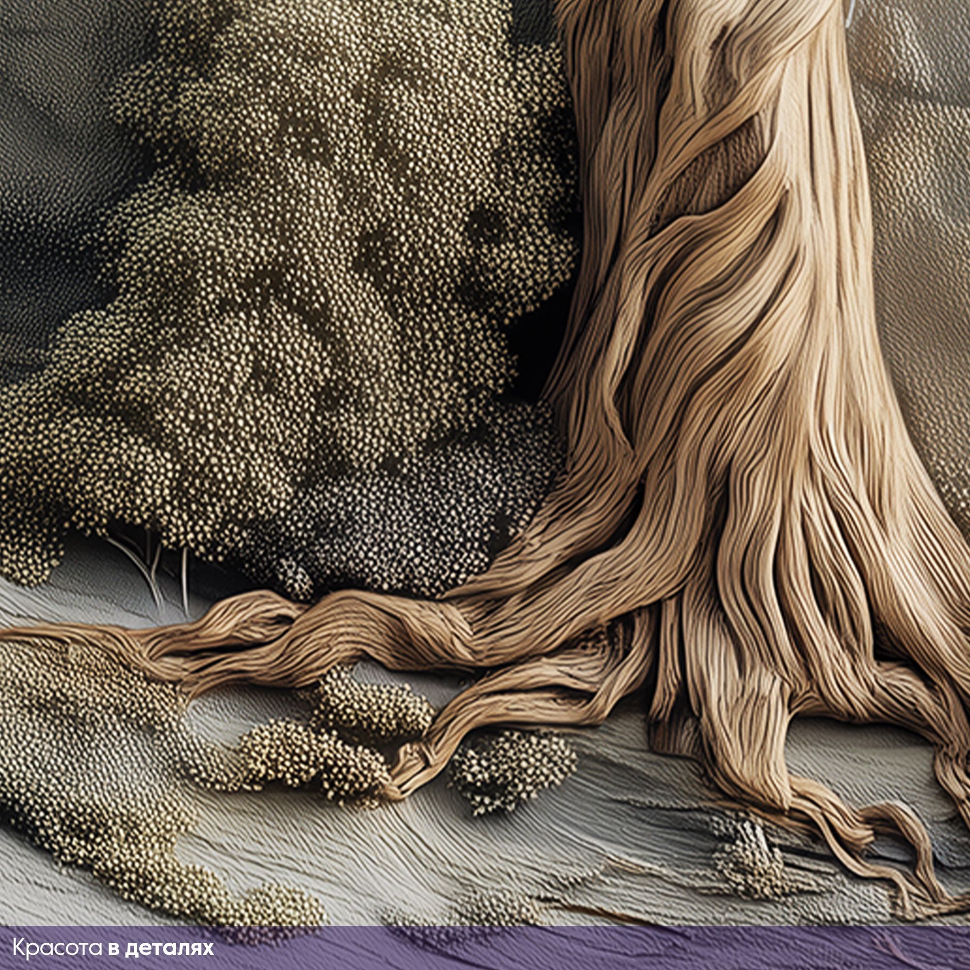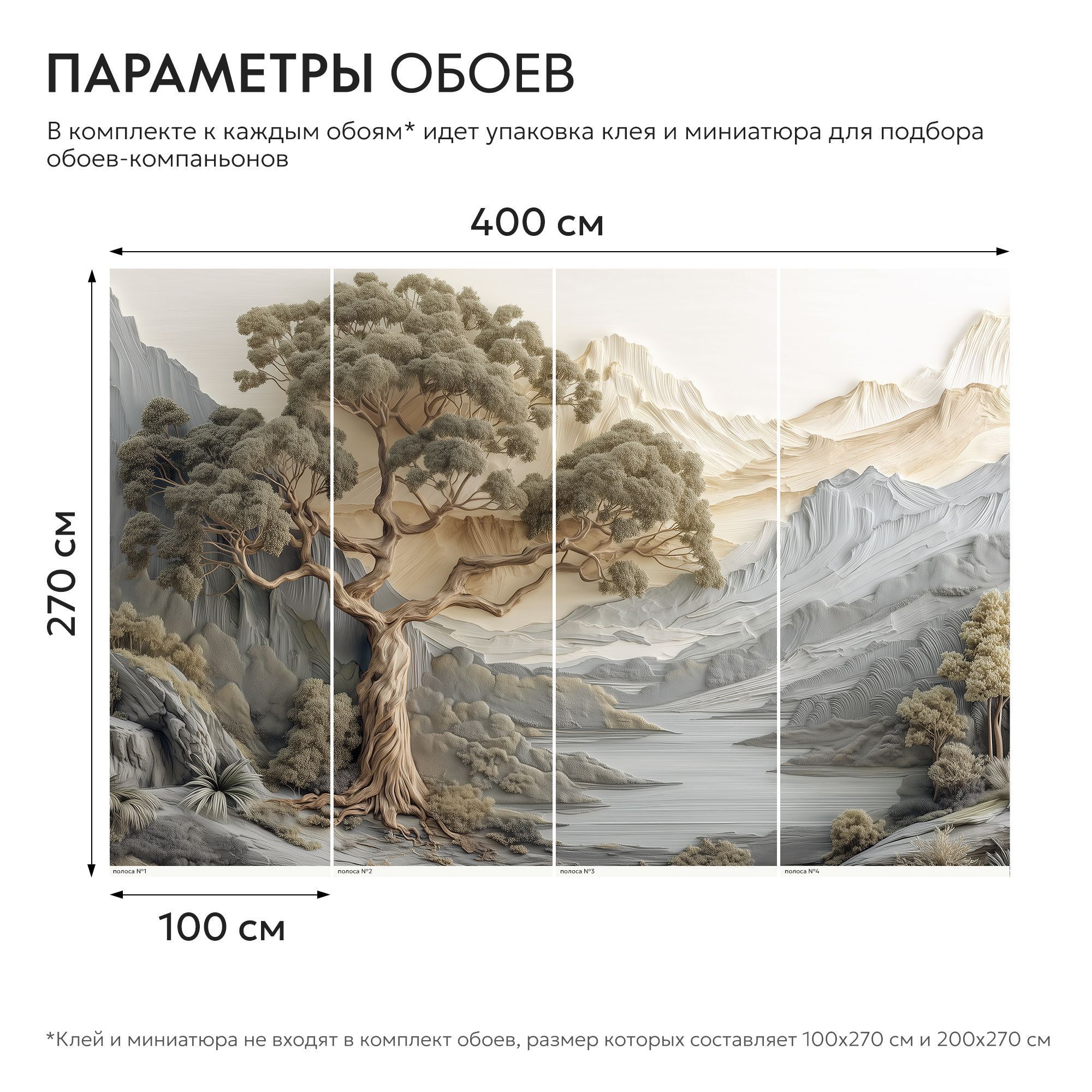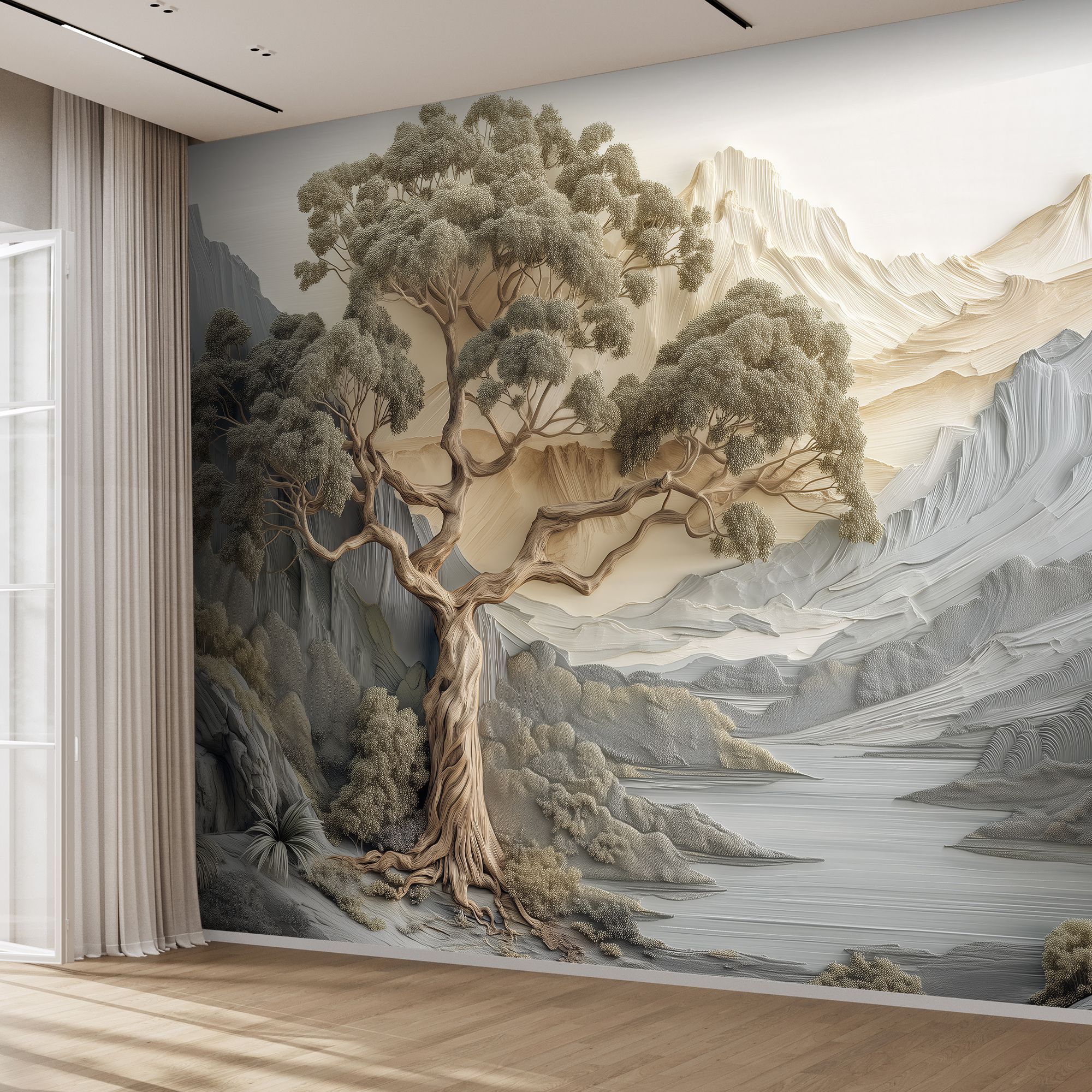Эти фотообои — настоящий шедевр, воплощающий гармонию природы в изысканной художественной манере. На них запечатлён величественный пейзаж: могучее дерево с раскидистыми ветвями и мощной корневой системой занимает центральное место, словно страж, оберегающий покой долины. Вокруг — мягкие контуры горных хребтов, плавно перетекающих друг в друга, и спокойное озеро, отражающее приглушённые оттенки окружающего ландшафта. Объёмная стилизация: изображение напоминает барельеф или искусно вылепленную скульптуру, создающую иллюзию глубины и трёхмерности. Цветовая гамма: нежные пастельные тона — бежевые, серые, светло-зелёные — формируют умиротворяющую атмосферу, не перегружая взгляд. Детализация: каждая деталь проработана с удивительной тщательностью — от текстуры коры дерева до лёгких изгибов горных склонов и нежных очертаний кустарников. Композиционная выразительность: сочетание мощного дерева на переднем плане и уходящих вдаль гор создаёт ощущение простора и одновременно защищённости. Эстетика: дизайн сочетает природную красоту с художественной утончённостью, напоминая работы мастеров восточной живописи. Фотообои станут центральным акцентом, придадут пространству благородную сдержанность и создадут атмосферу умиротворения. Идеально для интерьеров в стиле эко, минимализм или скандинавский.