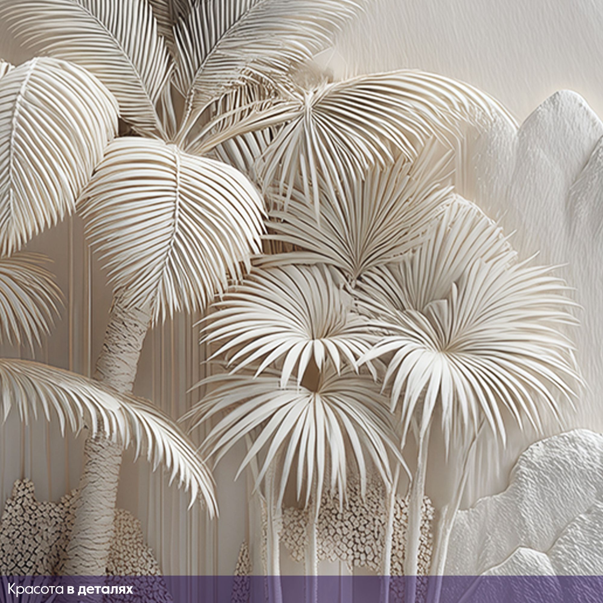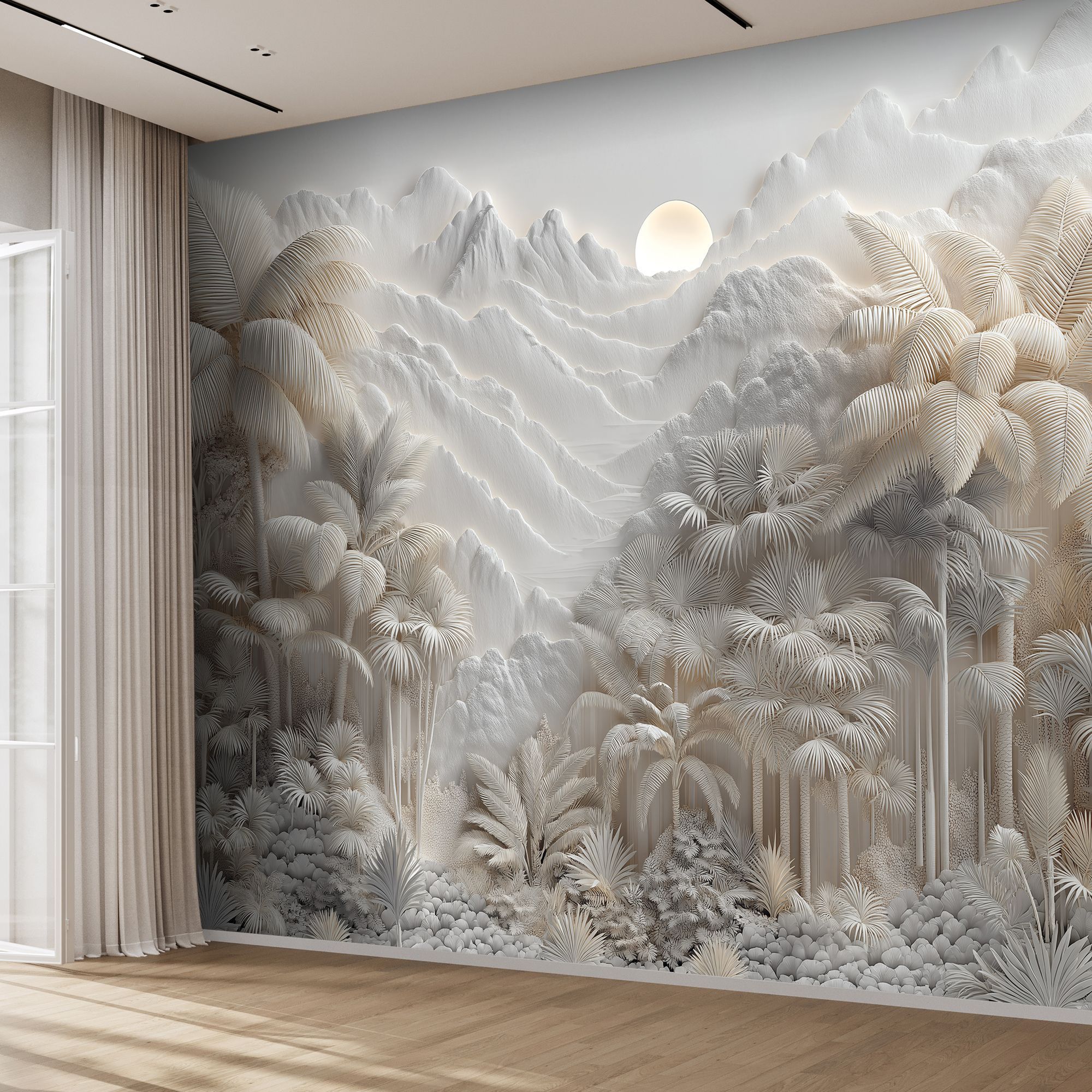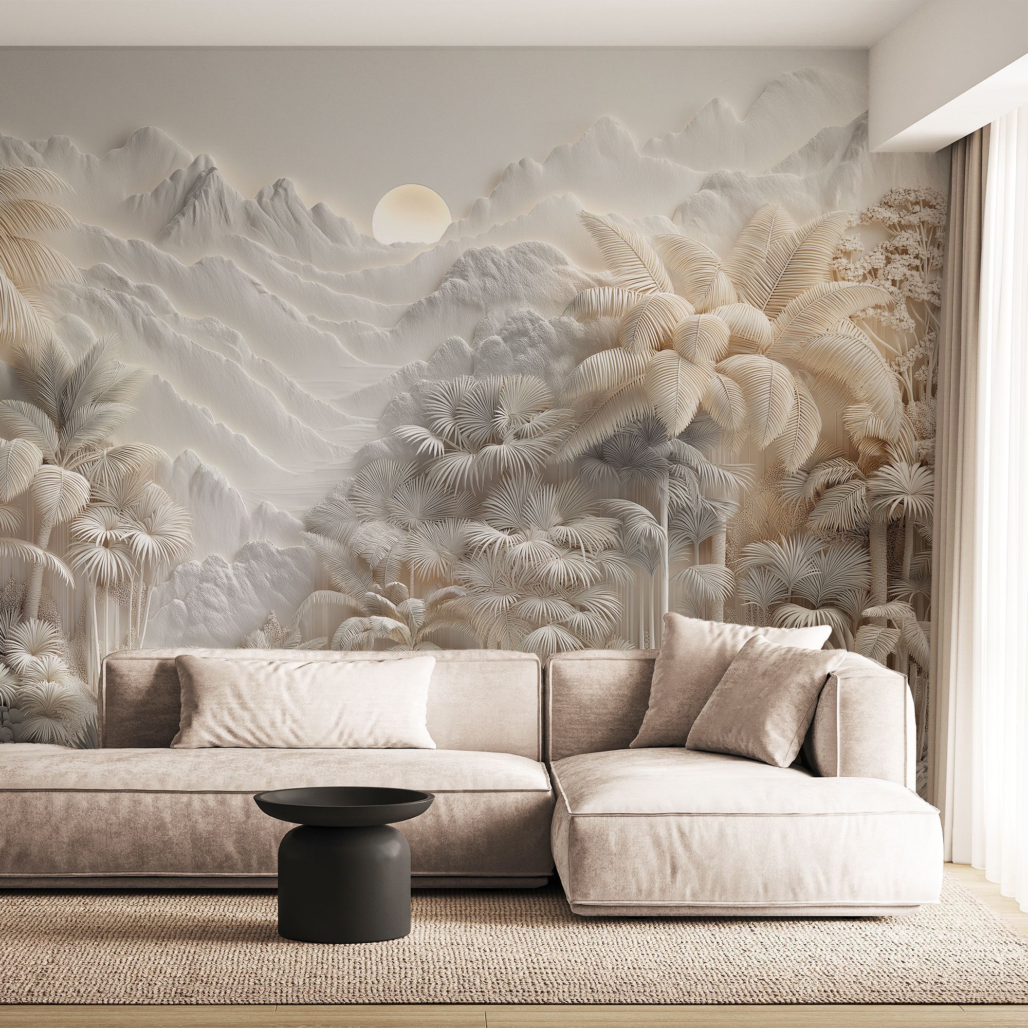 Эти фотообои — воплощение сказочного пейзажа, выполненного в изысканной монохромной гамме. Перед вами словно оживший барельеф: нежные контуры тропических пальм, густые заросли экзотических растений и величественные горные хребты, плавно уходящие вдаль. Мягкий свет заходящего или восходящего солнца, едва заметный диск которого венчает композицию, придаёт сцене особую магию и умиротворённость. Рельефная стилизация создаёт иллюзию трёхмерности — кажется, что можно протянуть руку и коснуться листьев пальм или прохладных горных склонов. Нежные оттенки бежевого, кремового и светло-серого создают ощущение лёгкости и воздушности, не перегружая пространство. Каждая деталь проработана с удивительной тщательностью — от изгибов пальмовых листьев до текстуры горных склонов. Сочетание густой растительности на переднем плане и открытых горных просторов на заднем создаёт баланс между насыщенностью и свободой. Эстетика: дизайн сочетает в себе природную красоту и художественную утончённость, напоминая одновременно скульптуру и картину. Фотообои станут центральным акцентом, придадут пространству элегантность и создадут атмосферу спокойствия. Идеально подойдут для интерьеров в стиле минимализм, арт-деко или эко-дизайн.