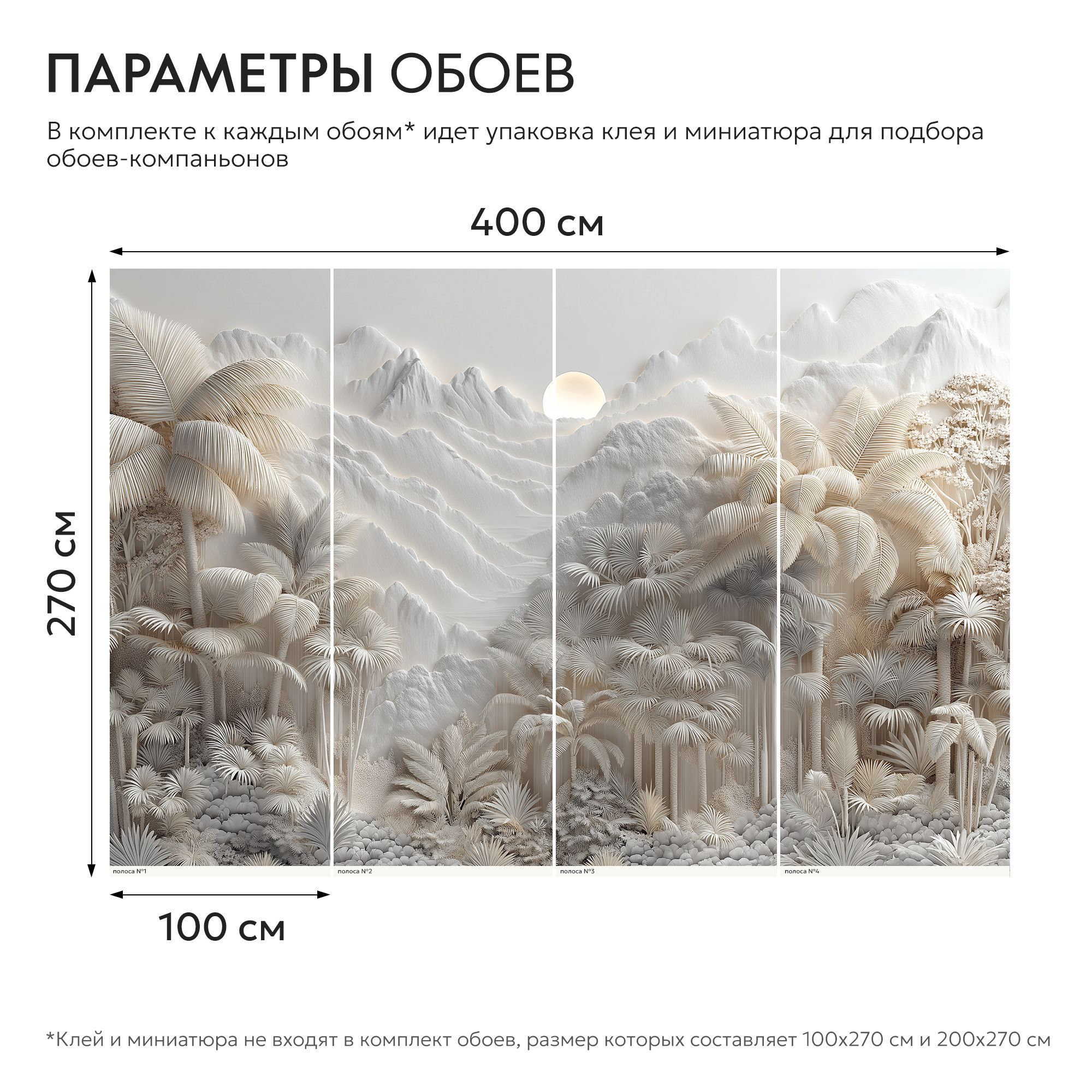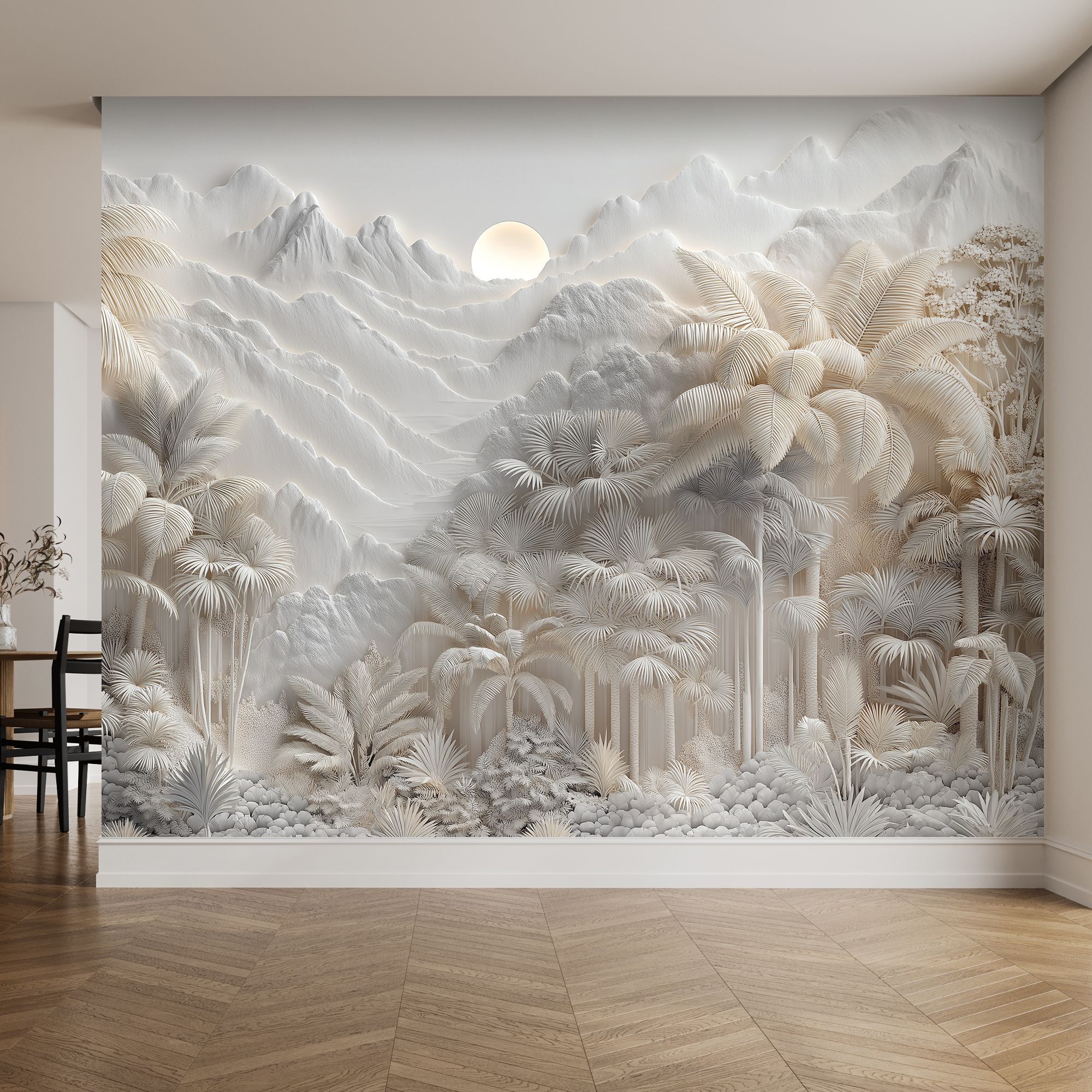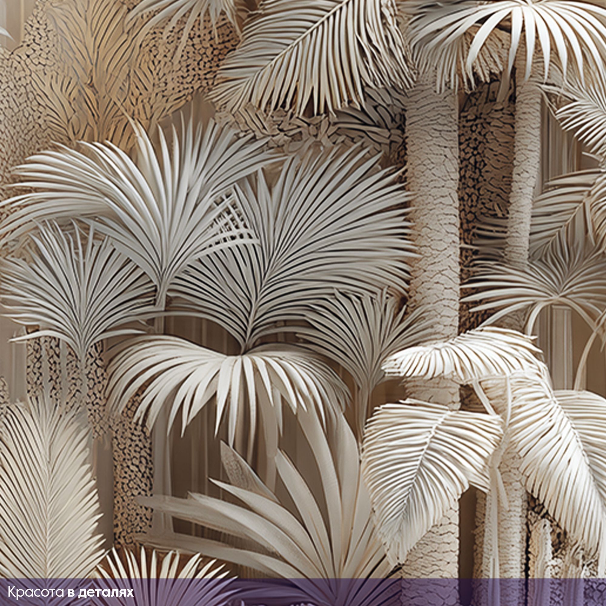 Эти фотообои — воплощение сказочного пейзажа, выполненного в изысканной монохромной гамме. Перед вами словно оживший барельеф: нежные контуры тропических пальм, густые заросли экзотических растений и величественные горные хребты, плавно уходящие вдаль. Мягкий свет заходящего или восходящего солнца, едва заметный диск которого венчает композицию, придаёт сцене особую магию и умиротворённость. Рельефная стилизация создаёт иллюзию трёхмерности — кажется, что можно протянуть руку и коснуться листьев пальм или прохладных горных склонов. Нежные оттенки бежевого, кремового и светло-серого создают ощущение лёгкости и воздушности, не перегружая пространство. Каждая деталь проработана с удивительной тщательностью — от изгибов пальмовых листьев до текстуры горных склонов. Сочетание густой растительности на переднем плане и открытых горных просторов на заднем создаёт баланс между насыщенностью и свободой. Эстетика: дизайн сочетает в себе природную красоту и художественную утончённость, напоминая одновременно скульптуру и картину. Фотообои станут центральным акцентом, придадут пространству элегантность и создадут атмосферу спокойствия. Идеально подойдут для интерьеров в стиле минимализм, арт-деко или эко-дизайн.