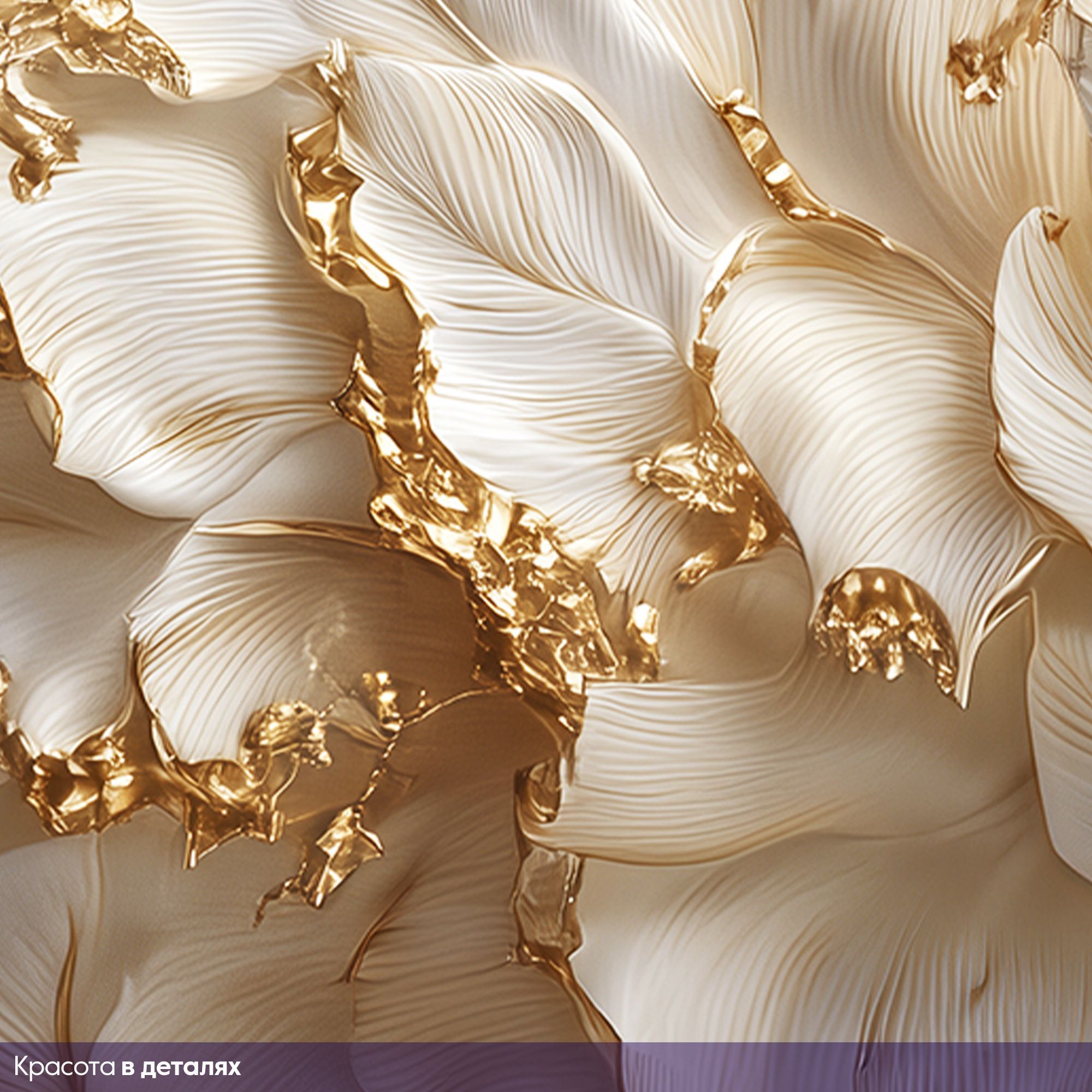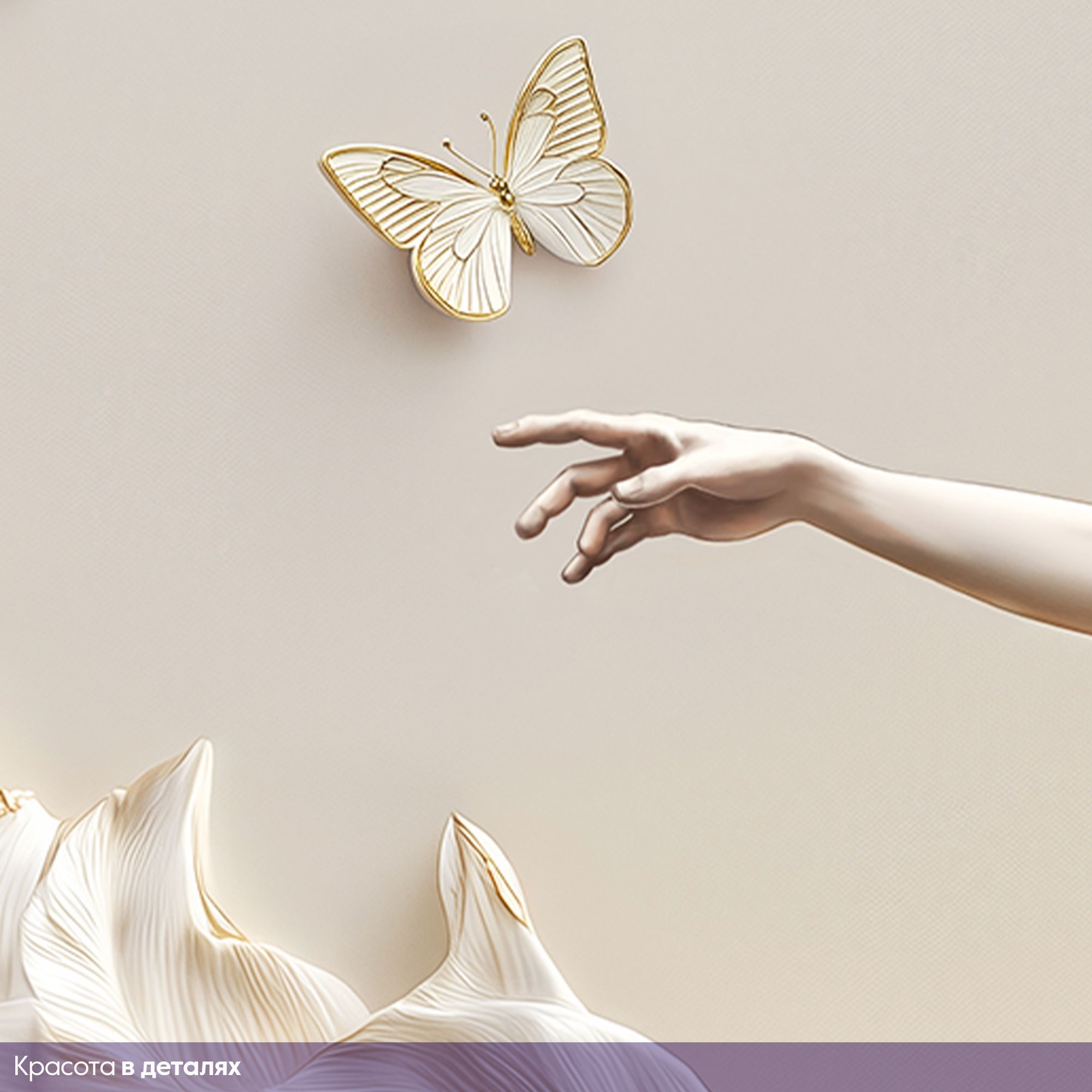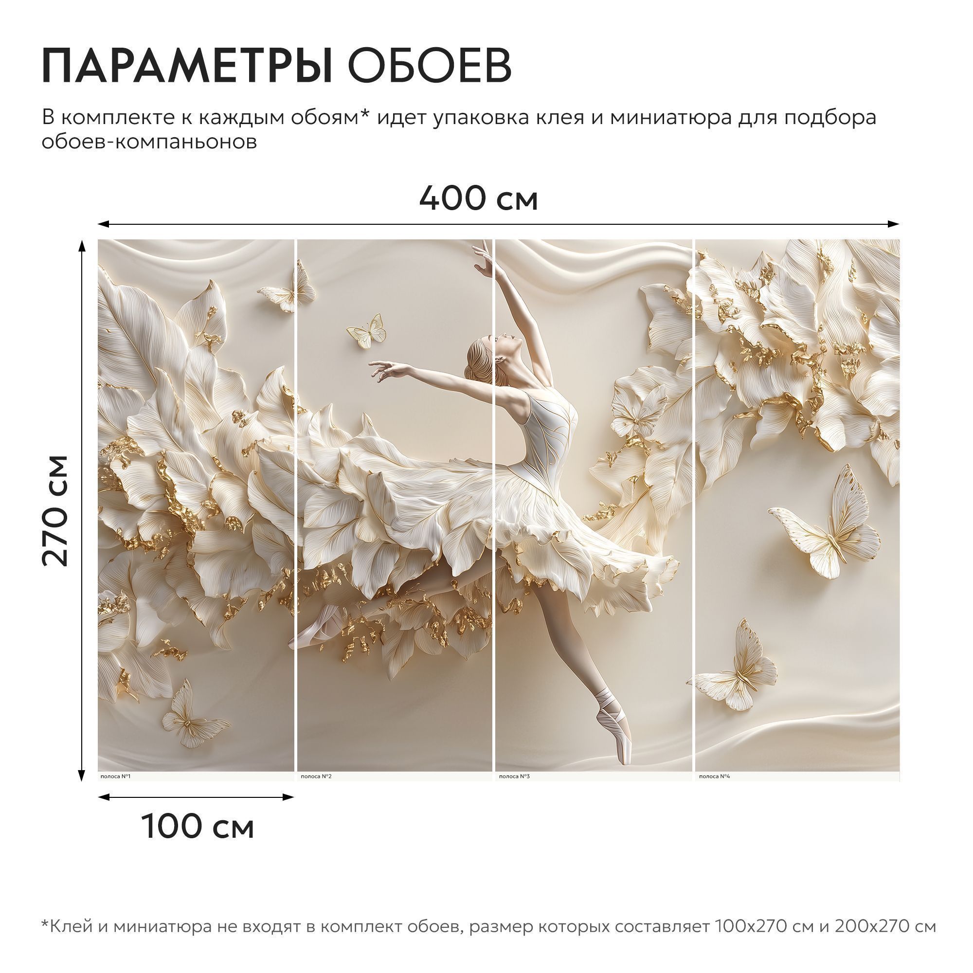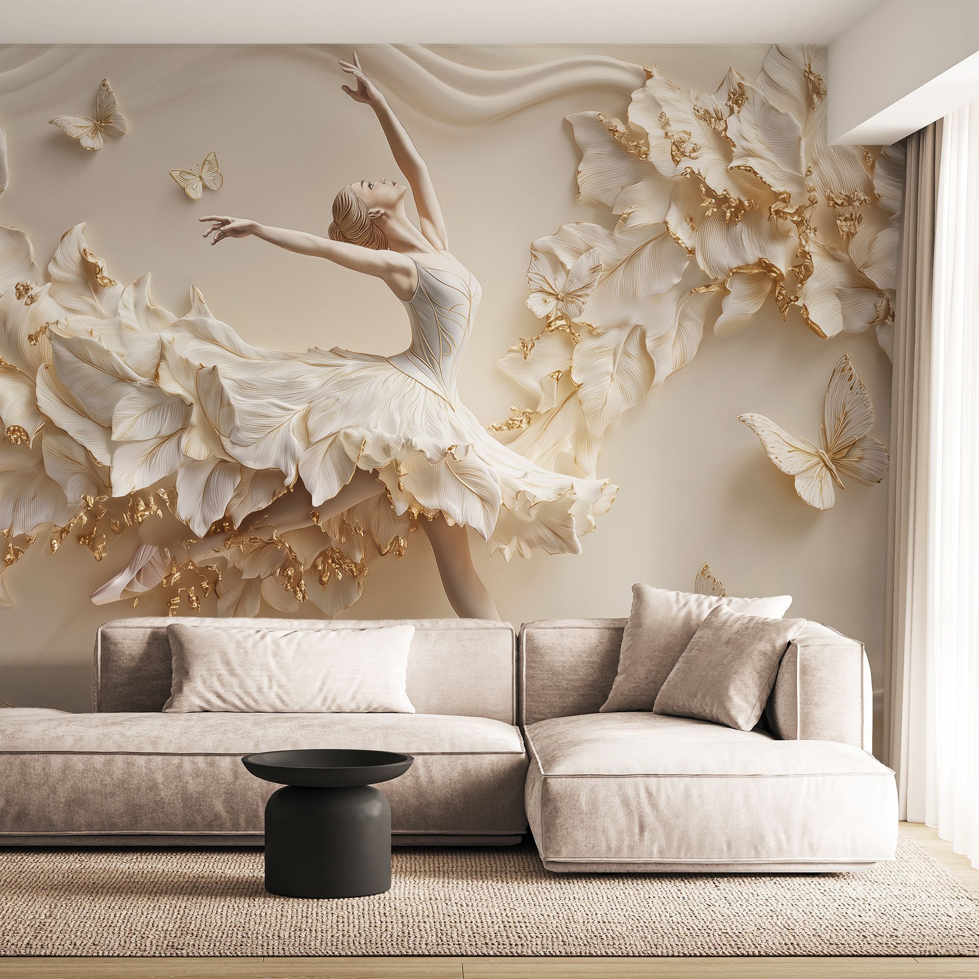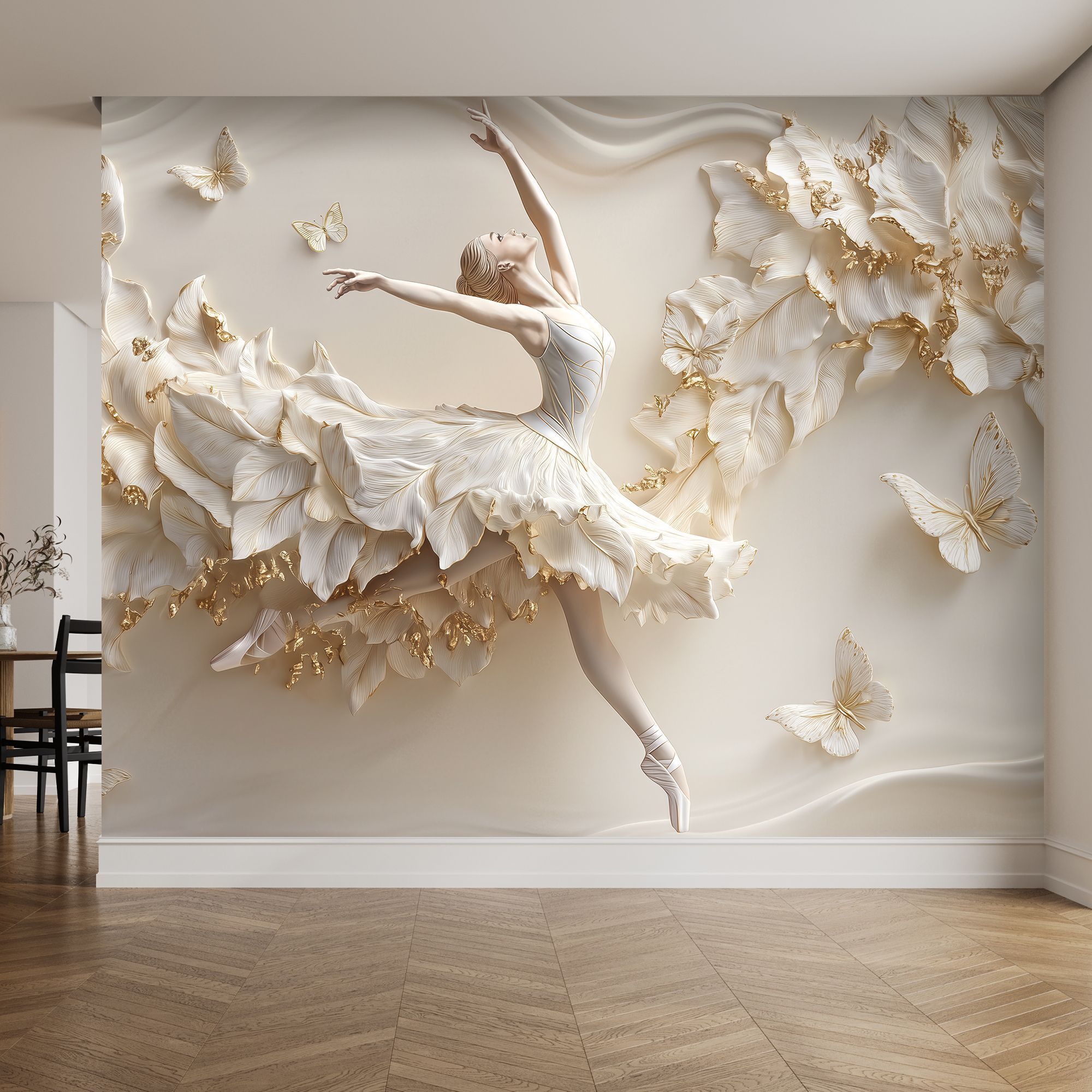 Эти фотообои — истинное произведение искусства, способное превратить любую стену в изысканную галерею. Центральным элементом композиции стала грациозная балерина, застывшая в изящном танцевальном па. Её поза полна лёгкости и элегантности: вытянутые руки словно ловят невидимые нити музыки, а устремлённый вверх взгляд создаёт ощущение полёта. Платье балерины сплетено из крупных лепестков, плавно переходящих в пышный цветочный каскад. Лепестки выполнены в нежных кремовых и бежевых оттенках с золотыми акцентами, что придаёт изображению объём и роскошь. Вокруг танцовщицы порхают бабочки — их ажурные крылья гармонично дополняют общую композицию, добавляя динамики и воздушности. Фон обоев выполнен в мягких, шелковистых тонах, напоминающих струящуюся ткань. Волнообразные линии создают иллюзию движения, усиливая ощущение лёгкости и невесомости всей сцены. Золотые блики на лепестках и бабочках ловят свет, оживляя изображение и наполняя комнату атмосферой утончённой красоты. Фотообои органично впишутся в интерьеры в стилях классика, неоклассика, арт-деко, модерн, шебби-шик. Они прекрасно сочетаются с деревянной мебелью тёплых оттенков, текстилем с деликатными узорами, хрустальными элементами и позолотой. Такой декор не просто украсит стены, а станет душой вашего дома, наполняя его изяществом и вдохновением.