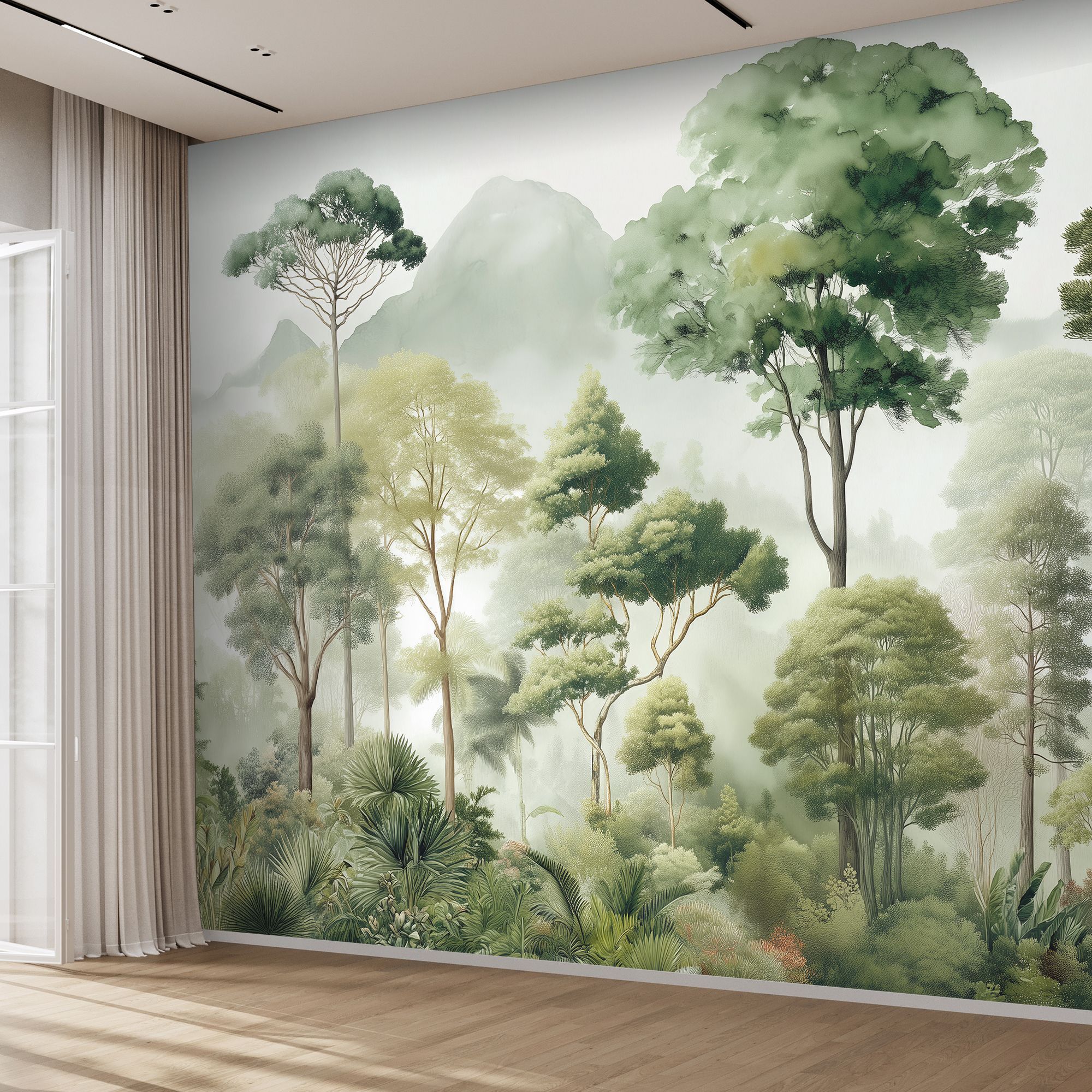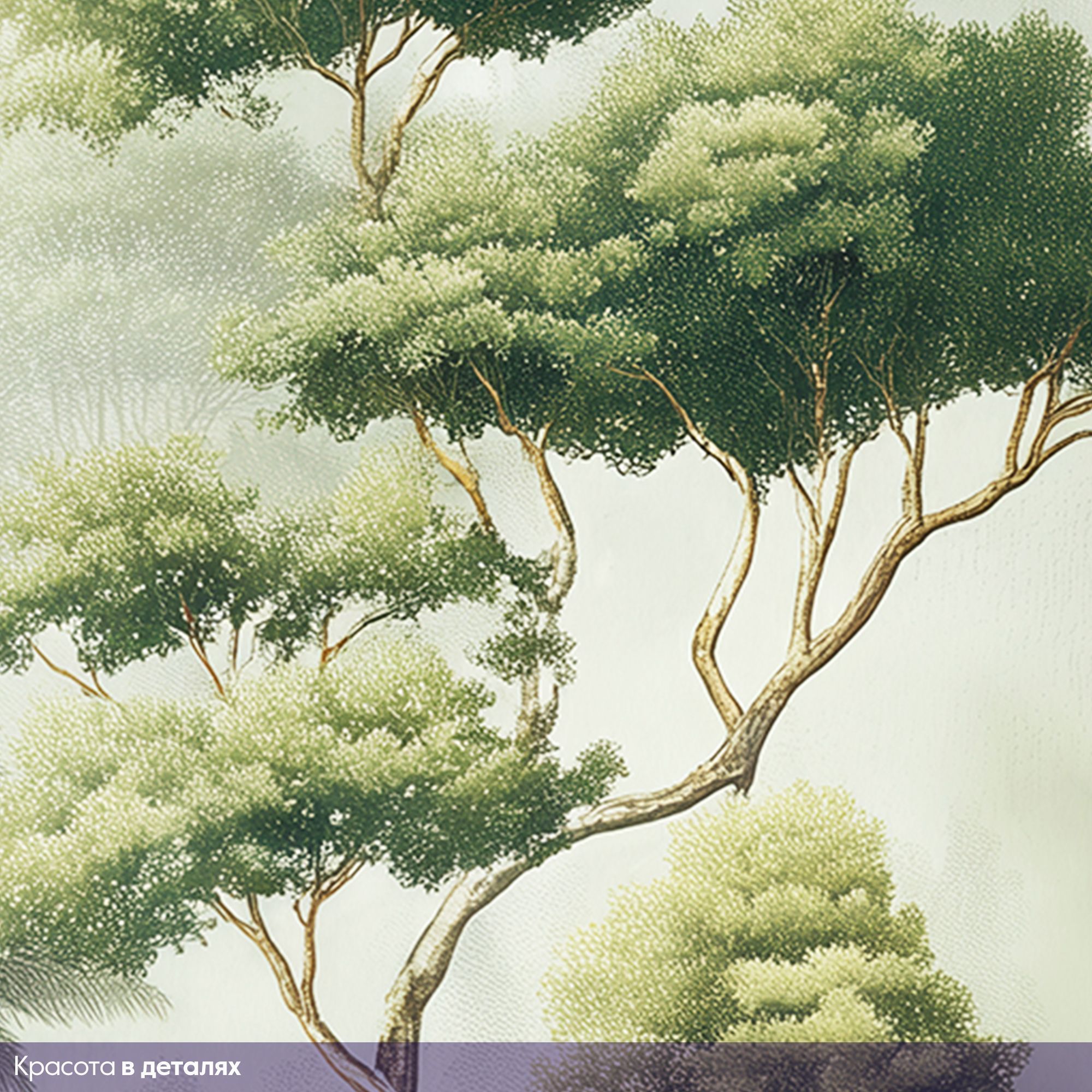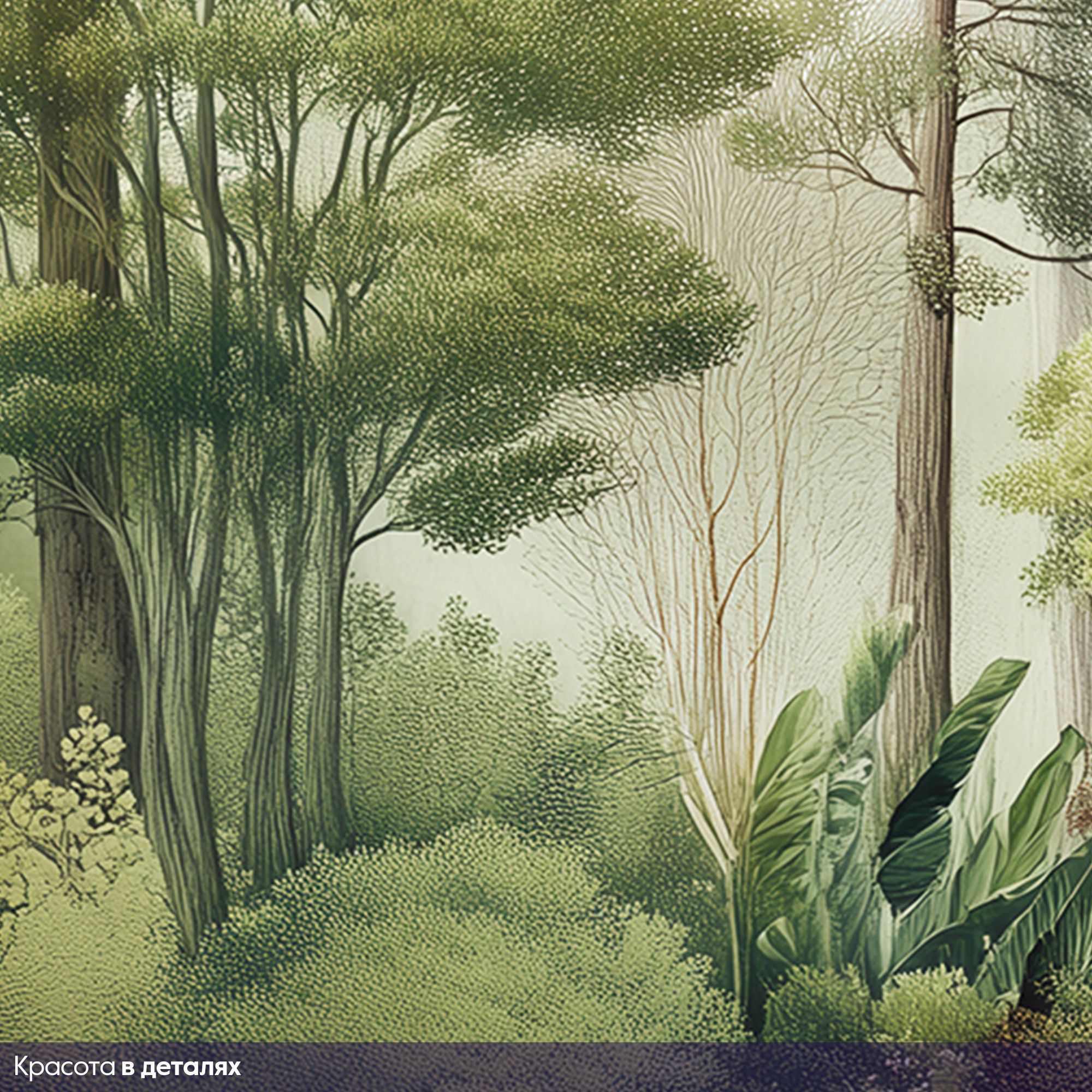 Эти фотообои — настоящая поэма о лесе, воплощённая в изысканной акварельной технике. На них запечатлён чарующий лесной пейзаж, где высокие деревья с пышными кронами устремляются к туманному небу, а вдали величественно возвышаются окутанные дымкой горы. Композиция наполнена разнообразием зелёных оттенков — от нежных, почти серебристых полутонов до глубоких изумрудных теней. Акварельная техника придаёт изображению лёгкость и воздушность, создаёт ощущение утренней свежести и прохлады. Многоуровневая композиция — на переднем плане густая растительность и экзотические пальмы, в центре — стройные деревья, на заднем плане — туманные горы. Это создаёт эффект глубины и перспективы. Гармоничная палитра зелёных, серых и бежевых оттенков успокаивает взгляд, наполняет пространство природной энергией. Естественные формы и линии — плавные контуры деревьев и мягкий туман создают атмосферу умиротворения и покоя. Детализация — прорисованы отдельные листья, ветви, текстуры коры, что делает изображение реалистичным и притягательным. Фотообои станут центральным акцентом, создадут атмосферу уюта и природной гармонии. Идеально подойдут для интерьеров в экостиле, скандинавском или минималистичном дизайне.