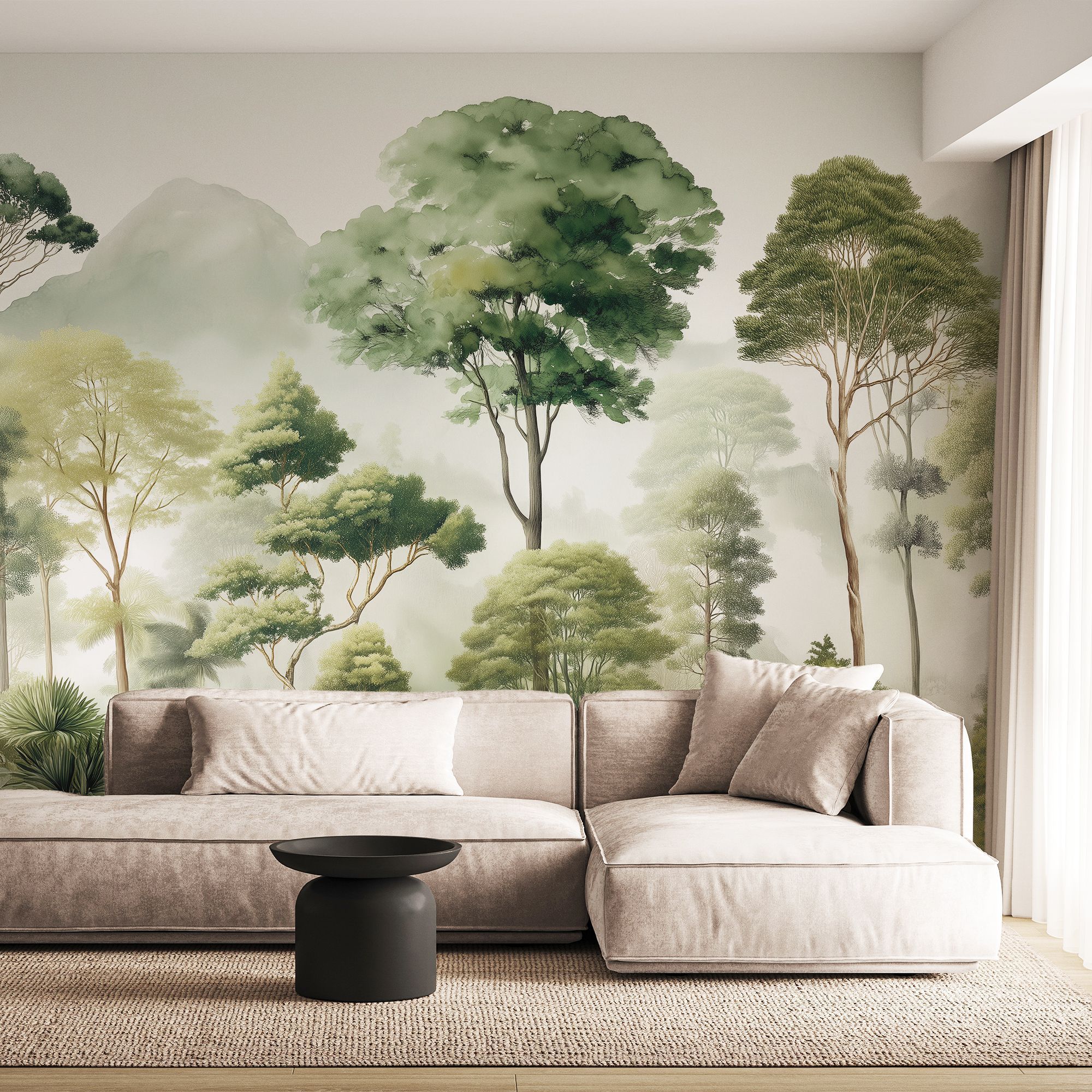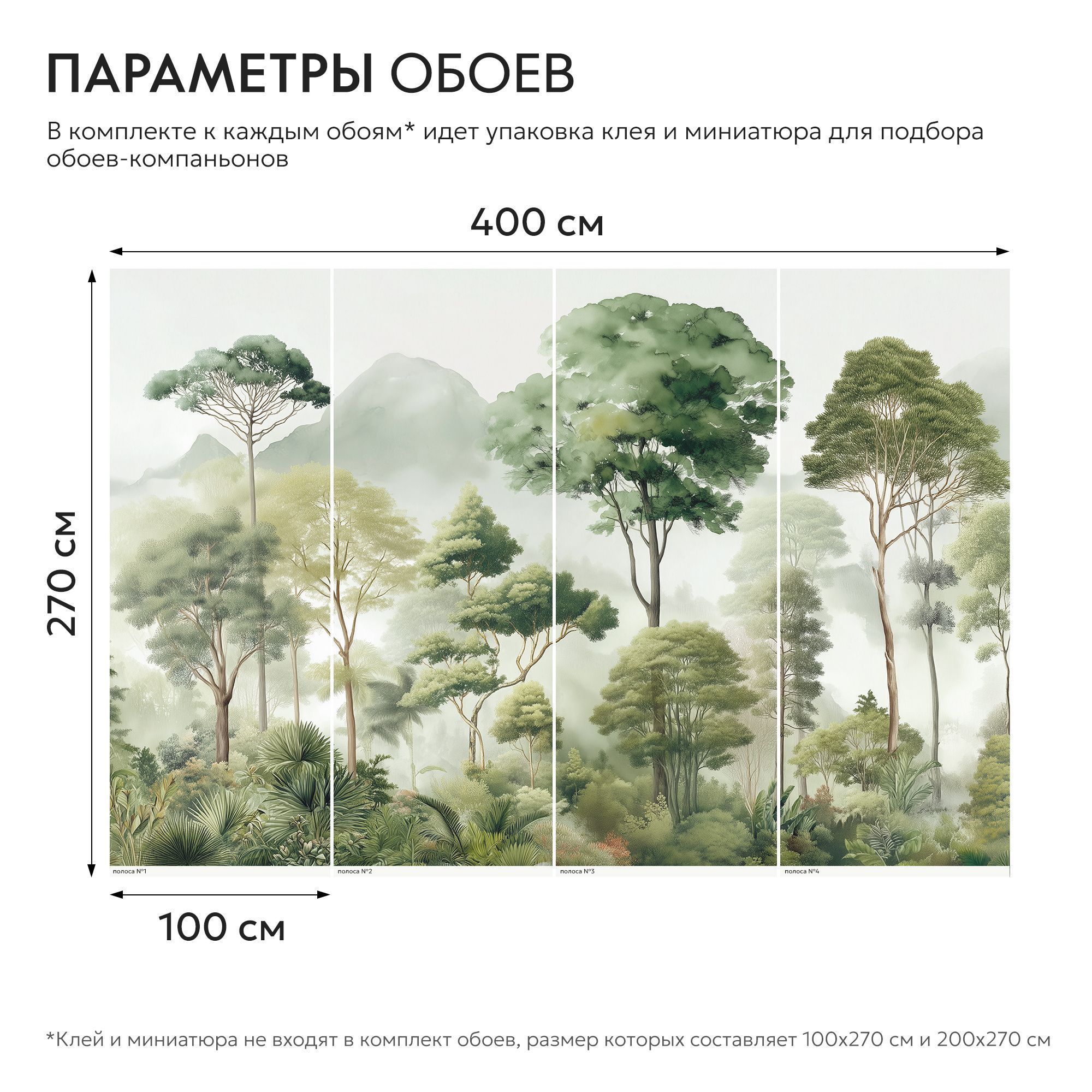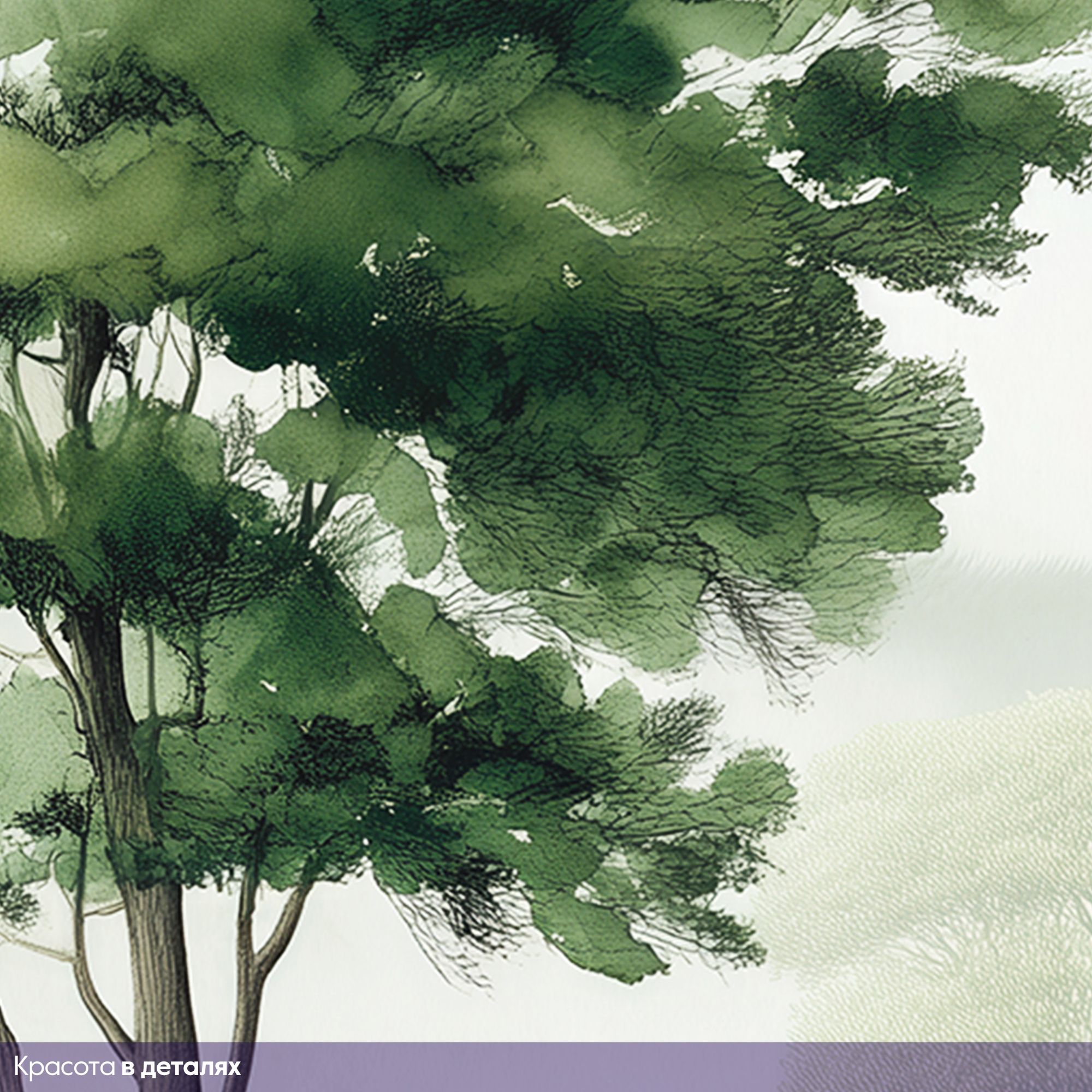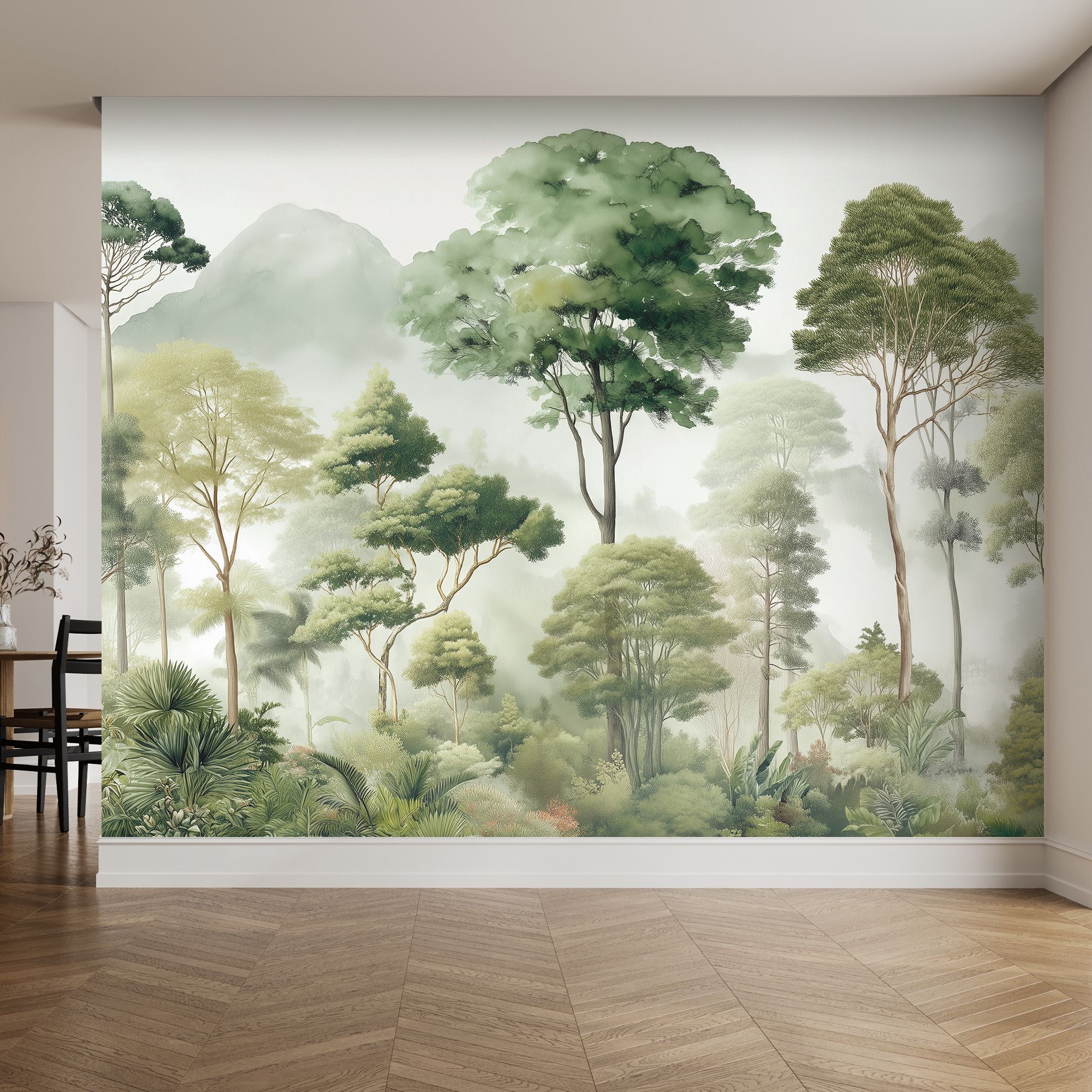 Эти фотообои — настоящая поэма о лесе, воплощённая в изысканной акварельной технике. На них запечатлён чарующий лесной пейзаж, где высокие деревья с пышными кронами устремляются к туманному небу, а вдали величественно возвышаются окутанные дымкой горы. Композиция наполнена разнообразием зелёных оттенков — от нежных, почти серебристых полутонов до глубоких изумрудных теней. Акварельная техника придаёт изображению лёгкость и воздушность, создаёт ощущение утренней свежести и прохлады. Многоуровневая композиция — на переднем плане густая растительность и экзотические пальмы, в центре — стройные деревья, на заднем плане — туманные горы. Это создаёт эффект глубины и перспективы. Гармоничная палитра зелёных, серых и бежевых оттенков успокаивает взгляд, наполняет пространство природной энергией. Естественные формы и линии — плавные контуры деревьев и мягкий туман создают атмосферу умиротворения и покоя. Детализация — прорисованы отдельные листья, ветви, текстуры коры, что делает изображение реалистичным и притягательным. Фотообои станут центральным акцентом, создадут атмосферу уюта и природной гармонии. Идеально подойдут для интерьеров в экостиле, скандинавском или минималистичном дизайне.