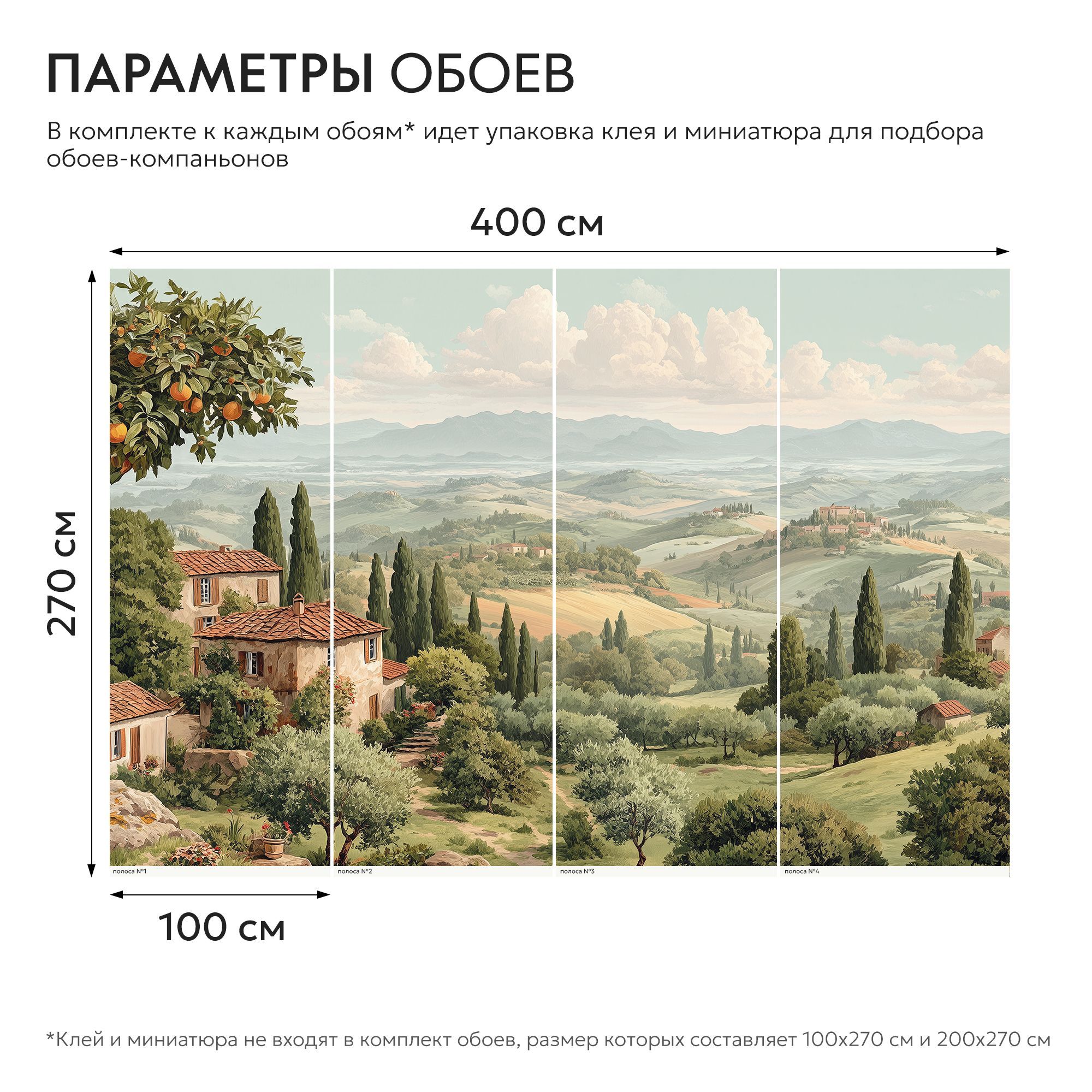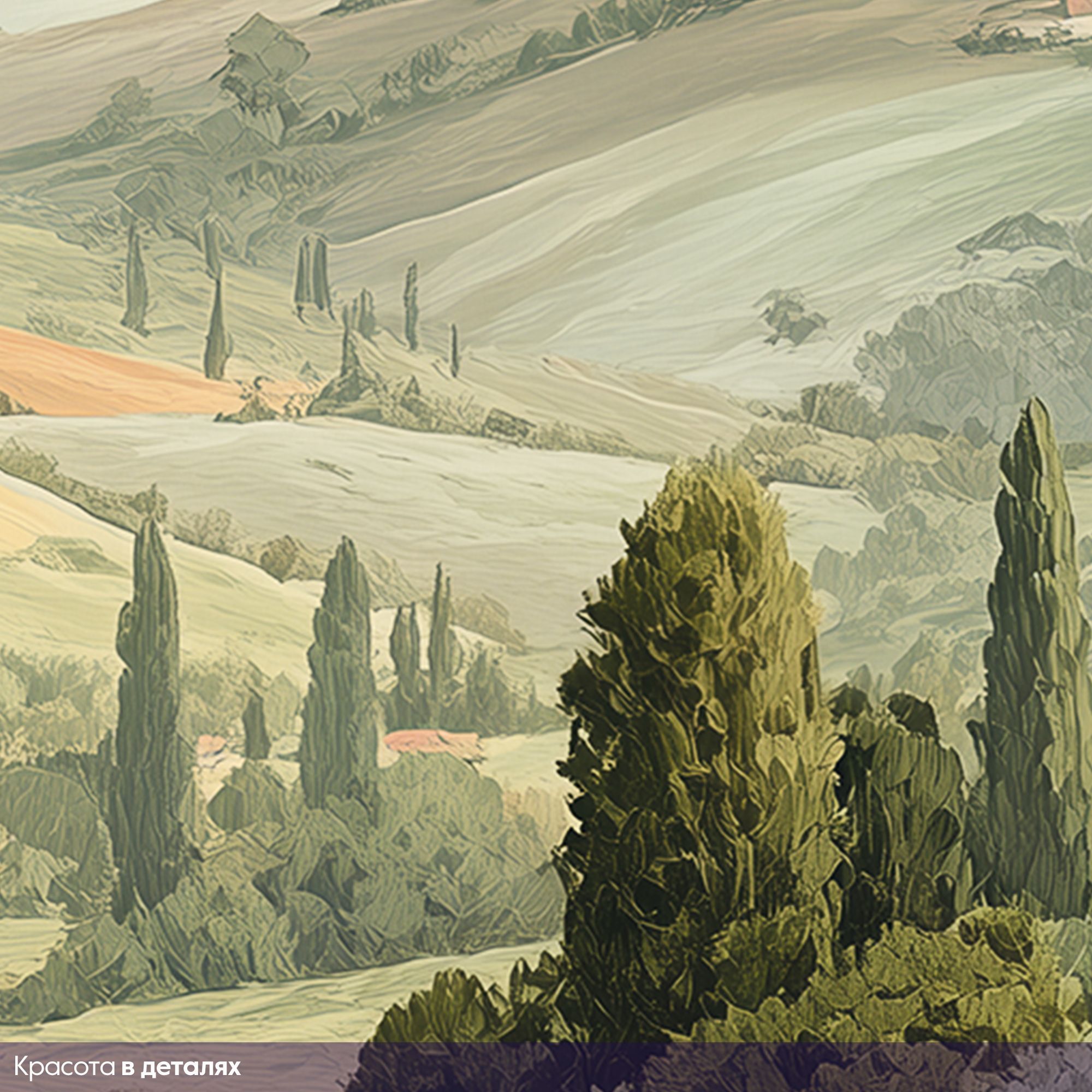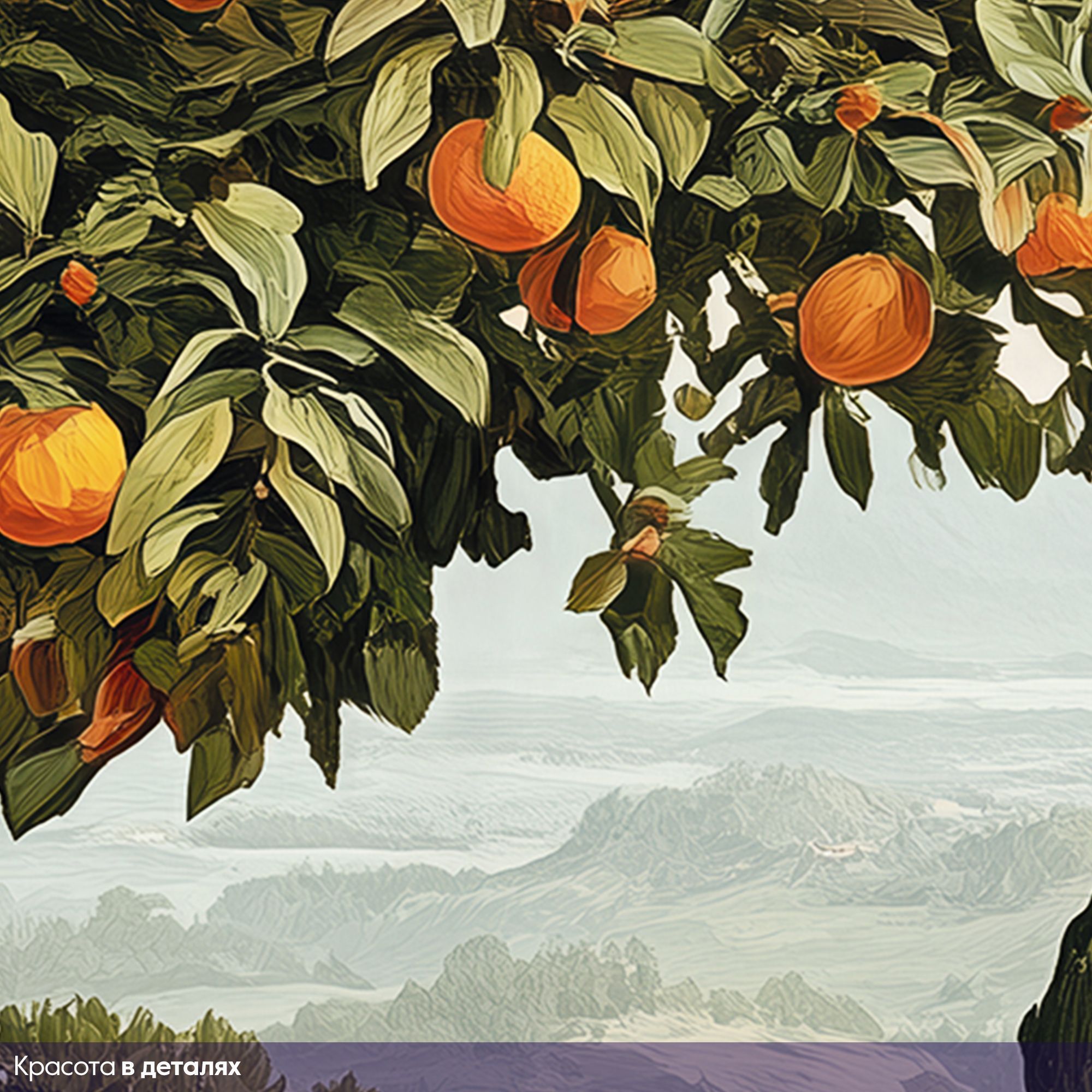 Эти фотообои — словно портал в сердце Тосканы, воплощение безмятежности и красоты итальянской природы. На них запечатлён идиллический пейзаж: уютные дома с терракотовой черепицей, утопающие в зелени кипарисов и оливковых деревьев. На переднем плане — ветви апельсинового дерева, усыпанные сочными плодами, которые добавляют композиции яркости и южного колорита. Вдали простираются волнистые холмы, покрытые золотистыми и изумрудными полями, плавно переходящие в линию величественных гор, окутанных лёгкой дымкой. Нежные пастельные оттенки голубого неба с пушистыми облаками создают ощущение лёгкости и простора. Каждый элемент картины продуман до мелочей: извилистые дорожки, аккуратные сады, разбросанные по склонам домики — всё это погружает в атмосферу спокойствия и умиротворения. Эти фотообои не просто украсят стену — они перенесут вас в сердце Италии, наполнят дом атмосферой южной безмятежности и природной красоты. Идеальный выбор для тех, кто мечтает о кусочке Тосканы у себя дома!