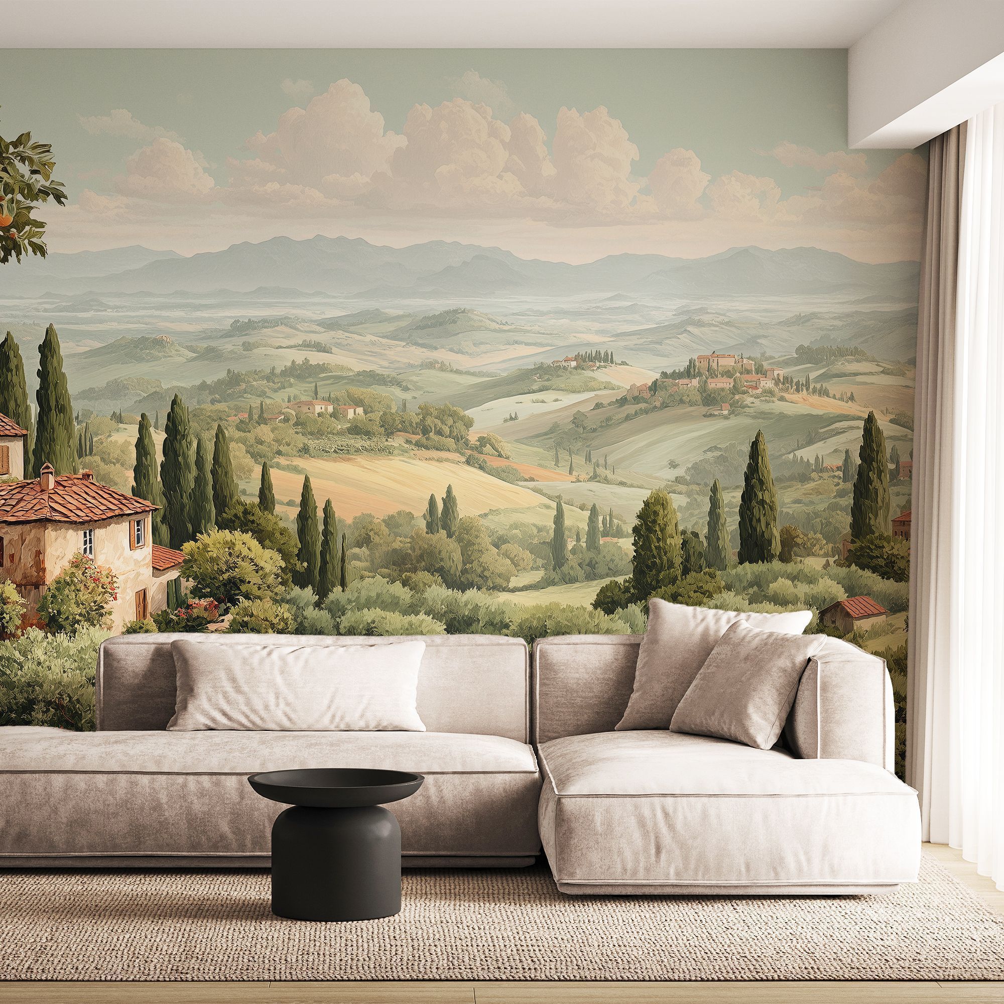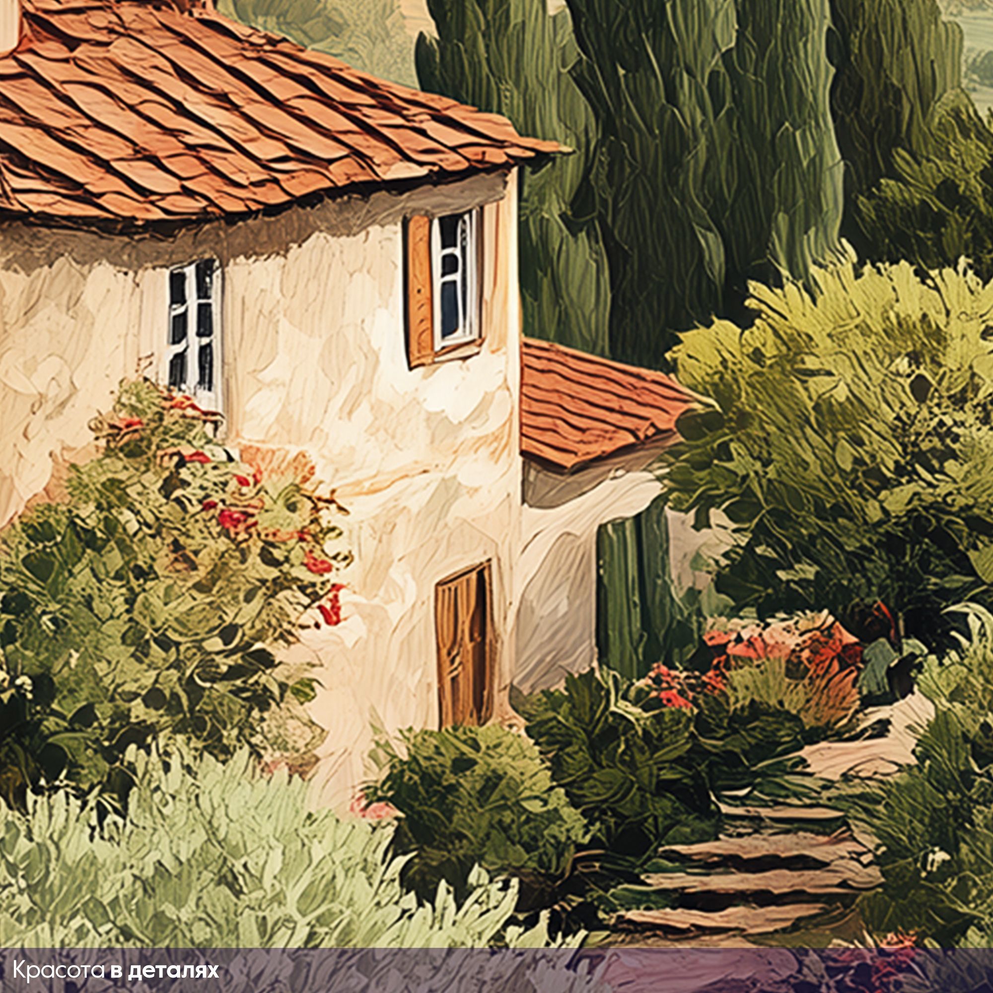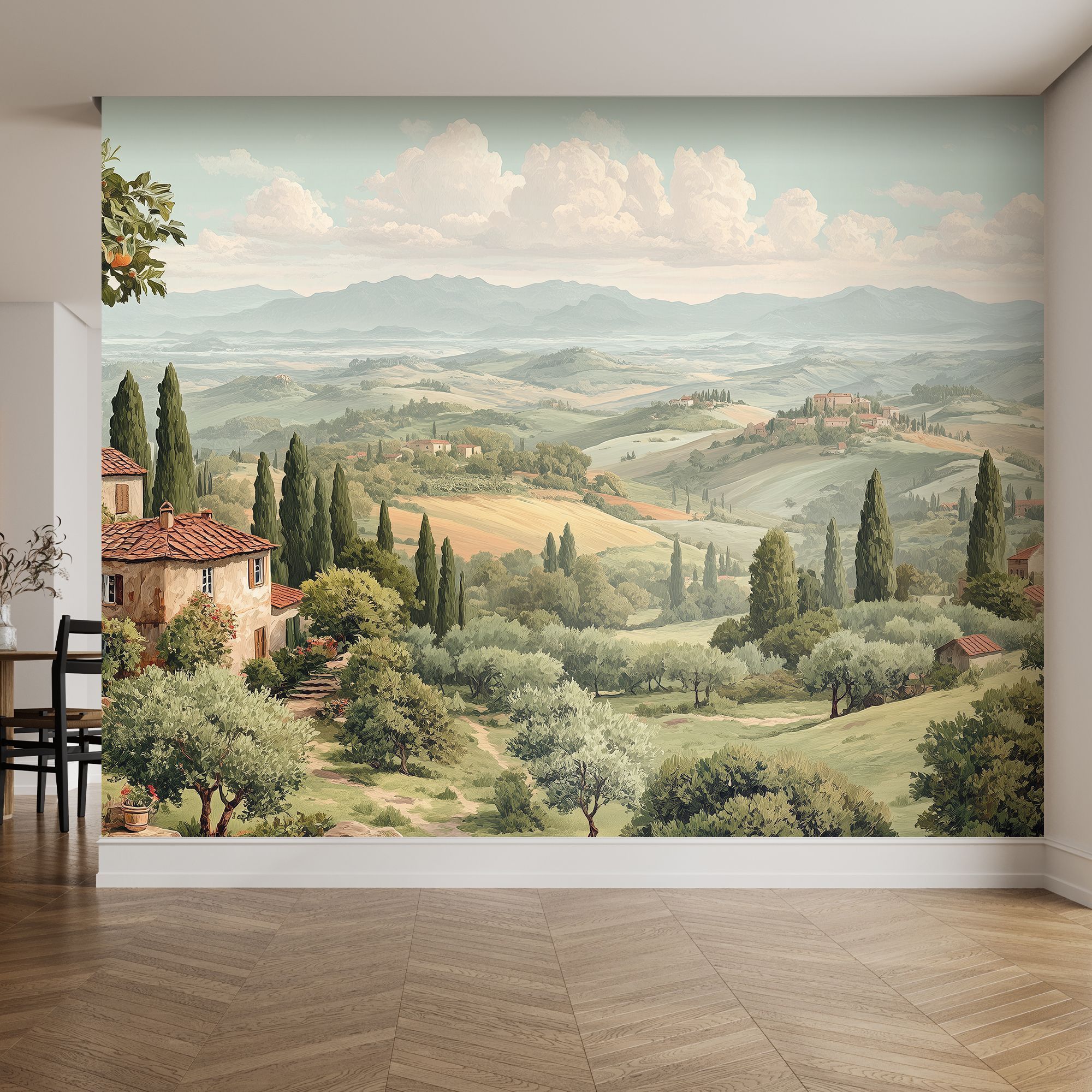 Эти фотообои — словно портал в сердце Тосканы, воплощение безмятежности и красоты итальянской природы. На них запечатлён идиллический пейзаж: уютные дома с терракотовой черепицей, утопающие в зелени кипарисов и оливковых деревьев. На переднем плане — ветви апельсинового дерева, усыпанные сочными плодами, которые добавляют композиции яркости и южного колорита. Вдали простираются волнистые холмы, покрытые золотистыми и изумрудными полями, плавно переходящие в линию величественных гор, окутанных лёгкой дымкой. Нежные пастельные оттенки голубого неба с пушистыми облаками создают ощущение лёгкости и простора. Каждый элемент картины продуман до мелочей: извилистые дорожки, аккуратные сады, разбросанные по склонам домики — всё это погружает в атмосферу спокойствия и умиротворения. Эти фотообои не просто украсят стену — они перенесут вас в сердце Италии, наполнят дом атмосферой южной безмятежности и природной красоты. Идеальный выбор для тех, кто мечтает о кусочке Тосканы у себя дома!