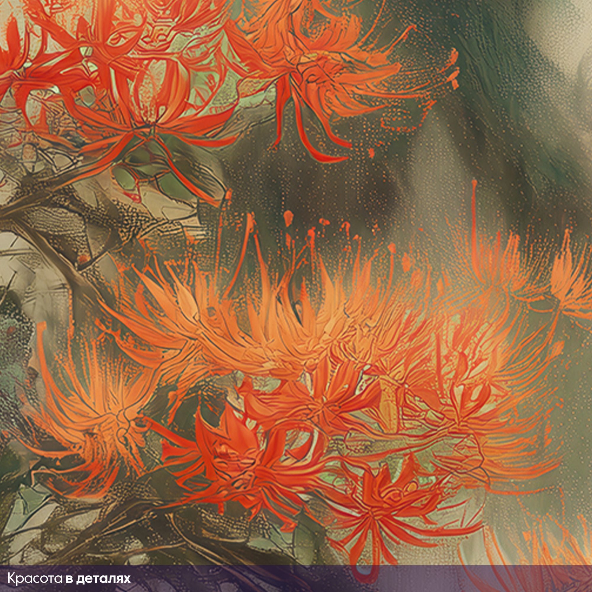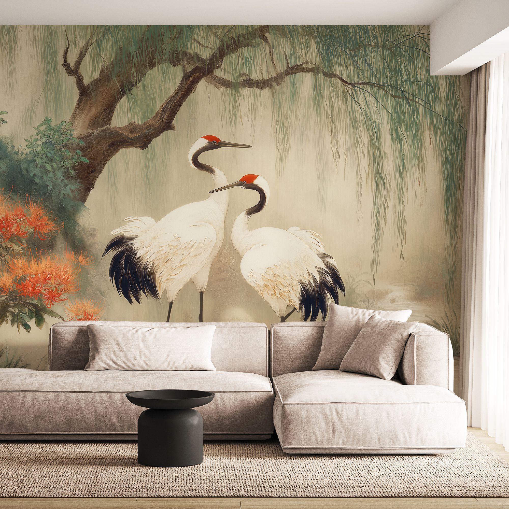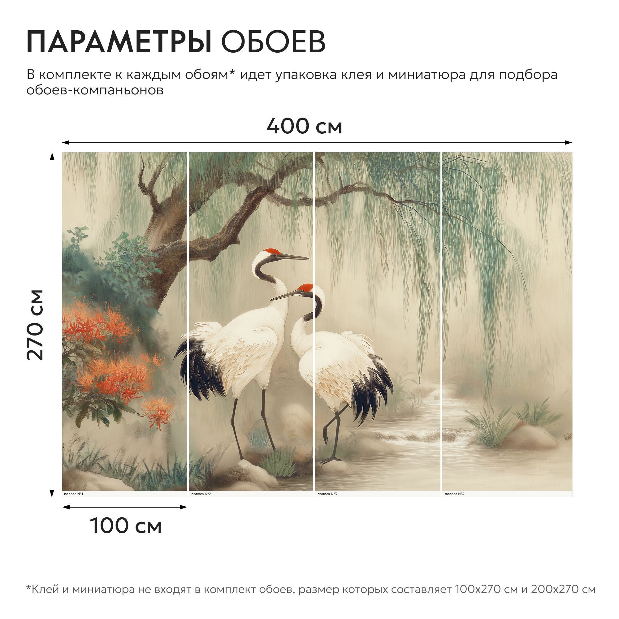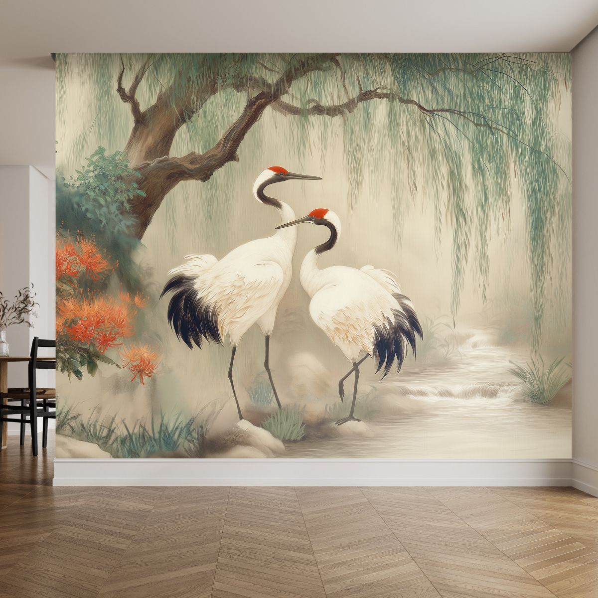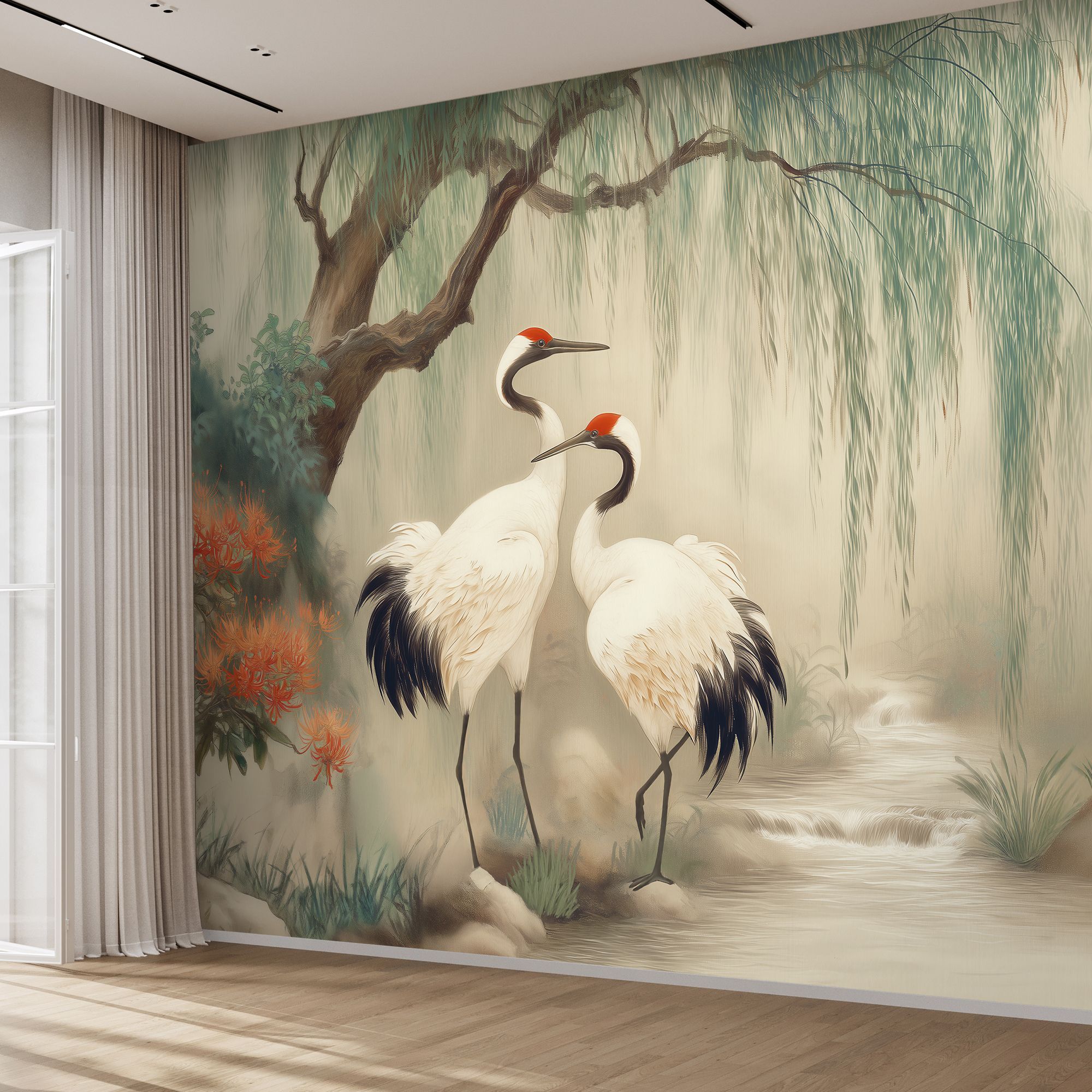 Эти фотообои — воплощение восточной эстетики и гармонии, словно фрагмент традиционной японской или китайской живописи. В центре композиции — пара величественных журавлей с изящными красными коронами, грациозно стоящих у журчащего ручья. Вокруг них раскинулся умиротворённый пейзаж: плакучая ива с тонкими ветвями, ниспадающими каскадом, пышные кусты с огненно-красными цветами и нежные травянистые заросли. Вся сцена окутана лёгкой дымкой, создающей ощущение утренней свежести и покоя. Художественная стилизация: имитация классической восточной живописи с мягкими переходами и тонкими линиями, создающая атмосферу утончённости. Цветовая палитра: сочетание нежных пастельных тонов (бежевые, светло-зелёные, бирюзовые) с яркими акцентами красных цветов и чёрных перьев журавлей. Гармония тёплых и холодных оттенков наполняет пространство спокойствием. Символика: журавли в восточной культуре — символ долголетия, счастья, семейного благополучия и мудрости. Их пара олицетворяет крепкий союз, гармонию и взаимную поддержку. Детализация: проработаны мельчайшие элементы — перья журавлей, текстура коры дерева, нежные лепестки цветов, рябь на воде. Это придаёт обоям глубину и реалистичность. Композиция: сбалансированное расположение элементов создаёт ощущение естественной сцены, будто кусочек природы перенесён в интерьер. Фотообои станут центральным акцентом, придадут пространству изысканность и восточную утончённость. Идеально для интерьеров в стиле минимализм, эко, азиатский или бохо.