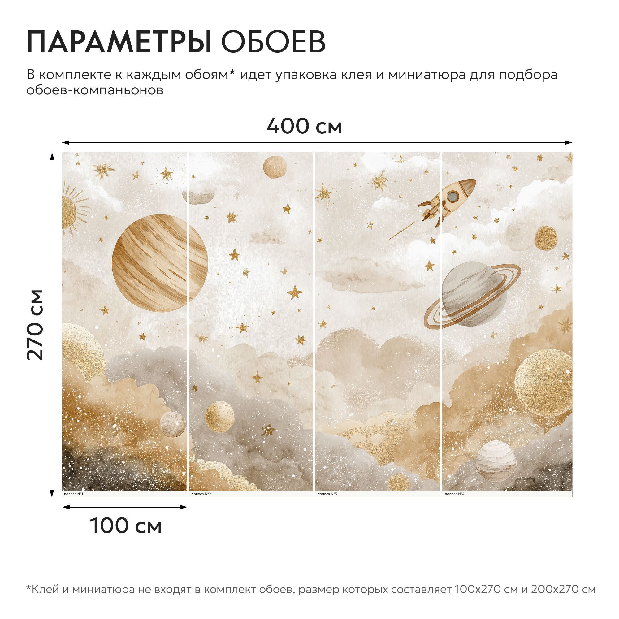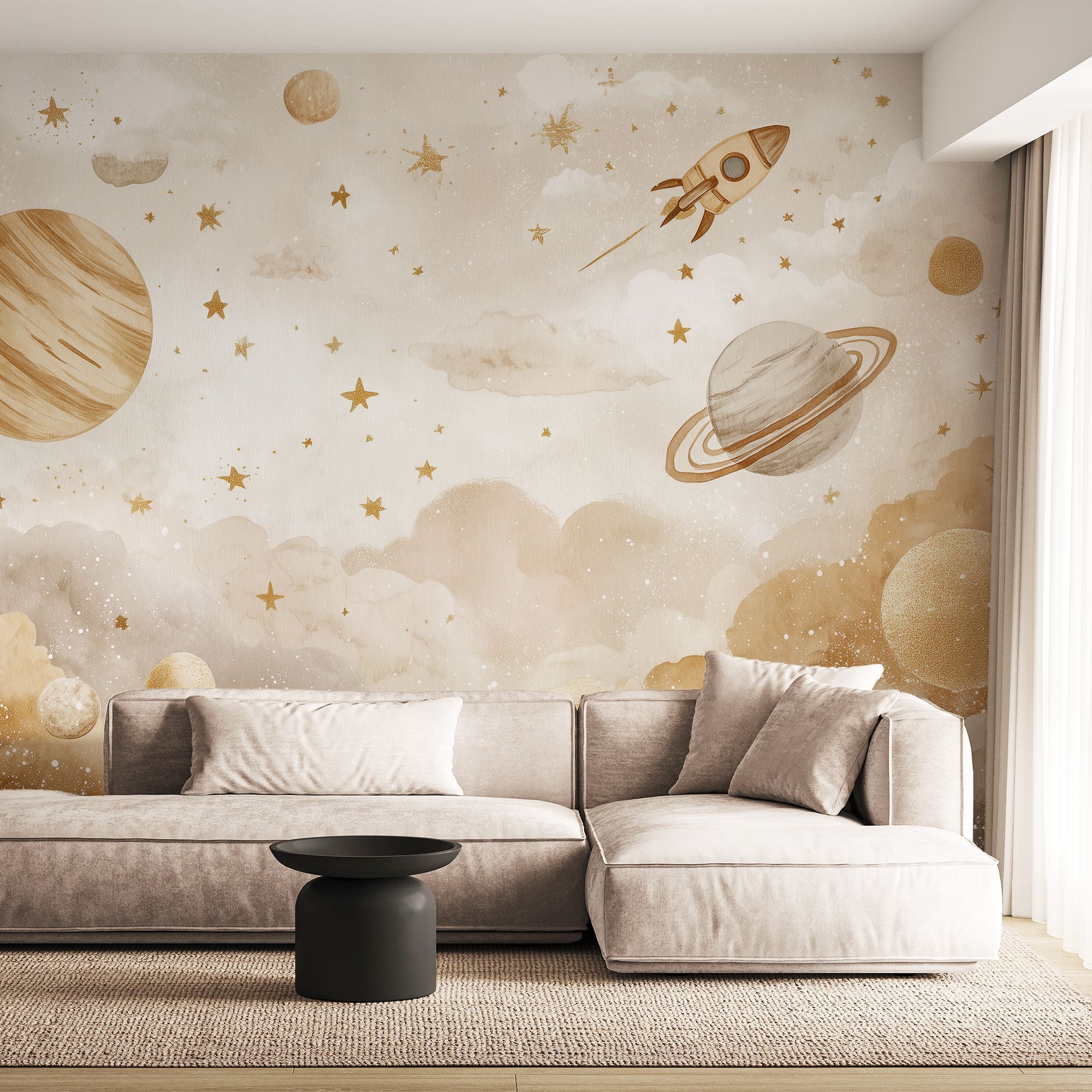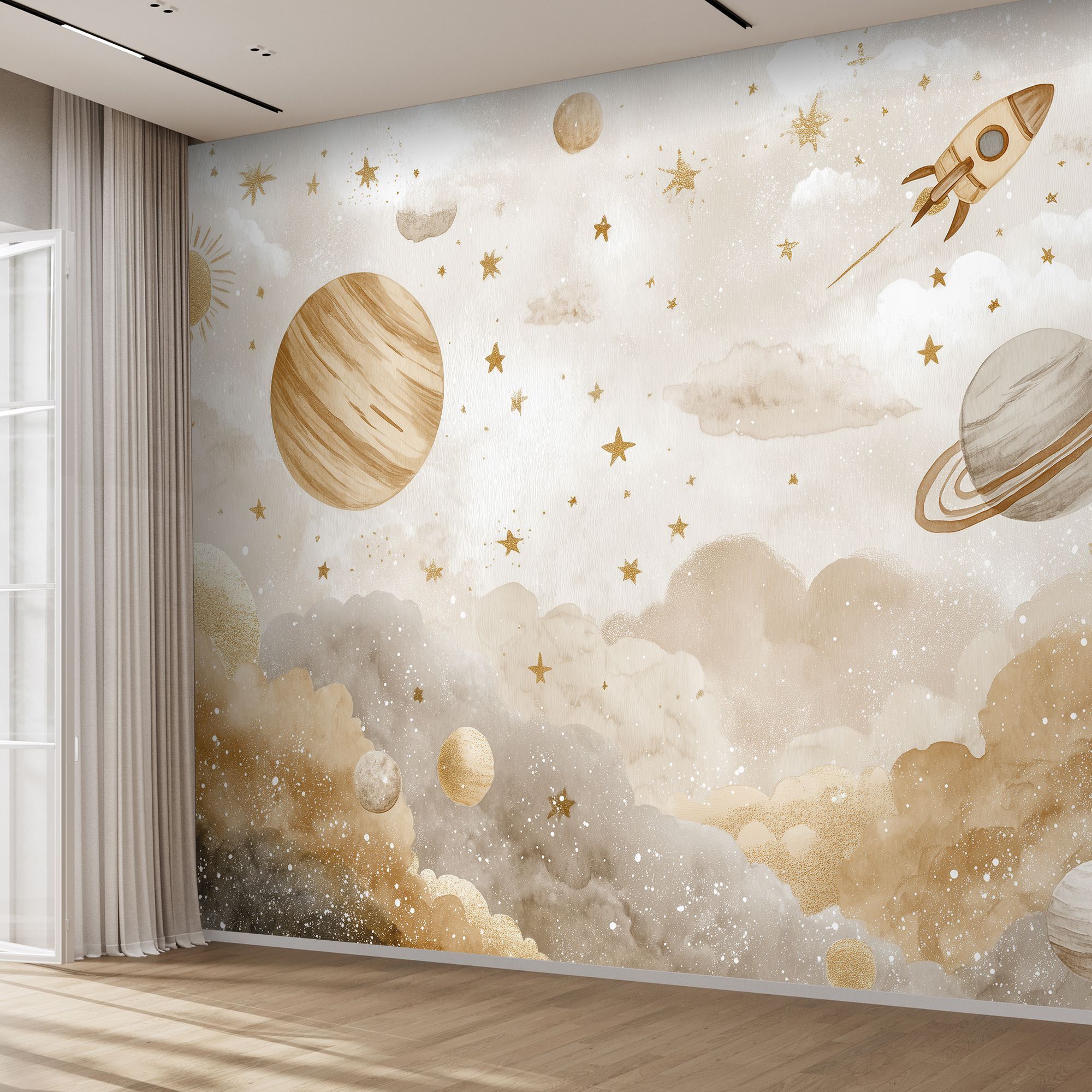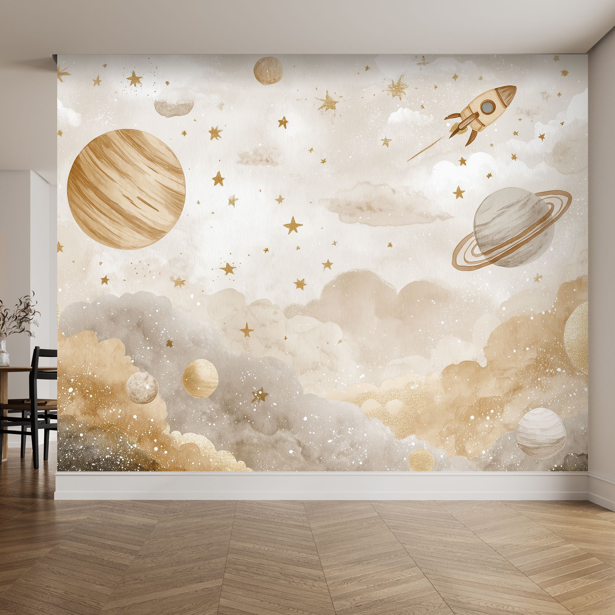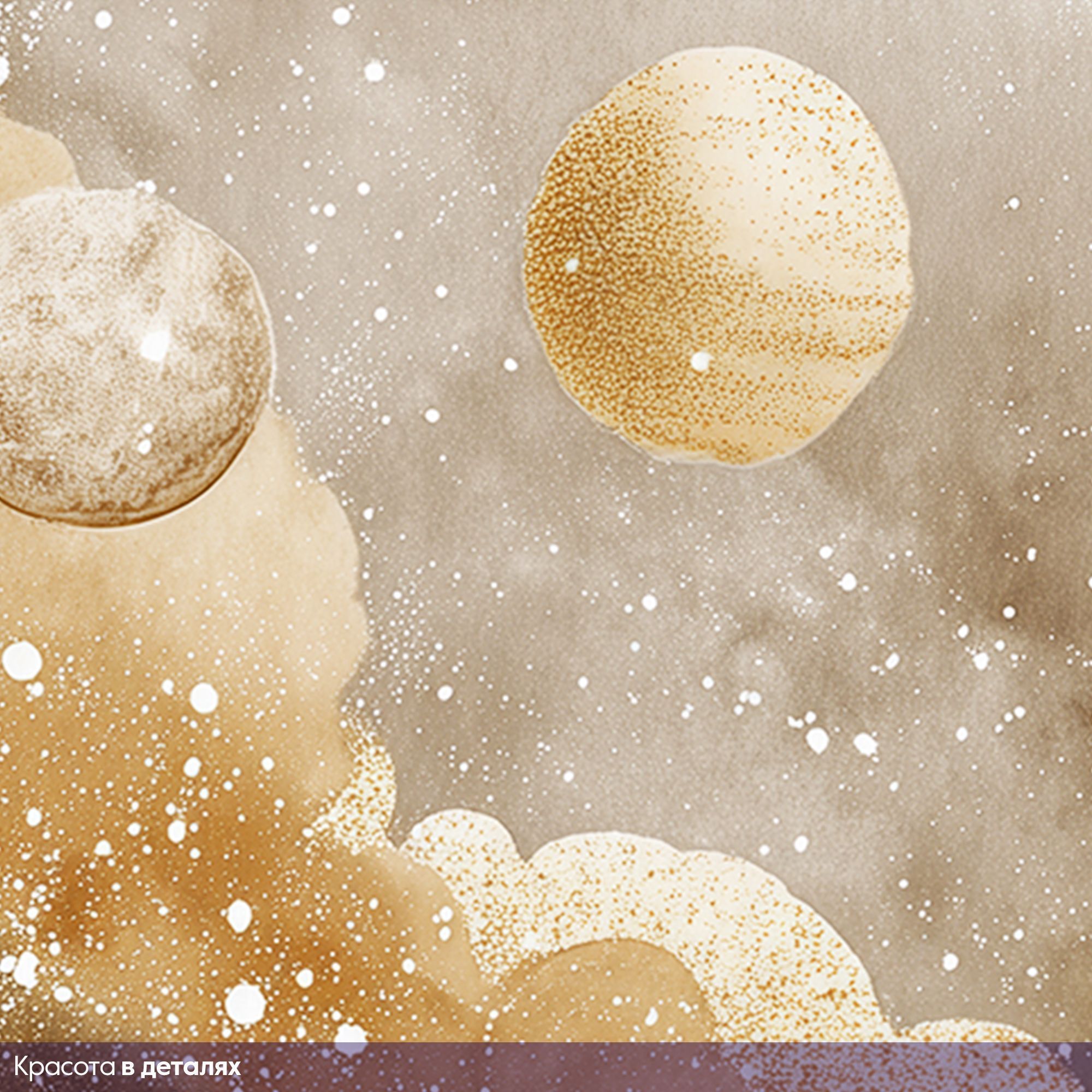 Эти фотообои — волшебное путешествие в мягкую, сказочную вселенную, где космос становится уютным и дружелюбным. На полотне разворачивается чарующая картина: Пышные облака в пастельных оттенках бежевого и серого создают ощущение лёгкости и воздушности, словно это не космос, а мечтательный сон. Золотистые звёзды разного размера рассыпаны по всему полотну, будто кто-то рассыпал звёздную пыль. Их тёплый оттенок придаёт композиции особую магию.