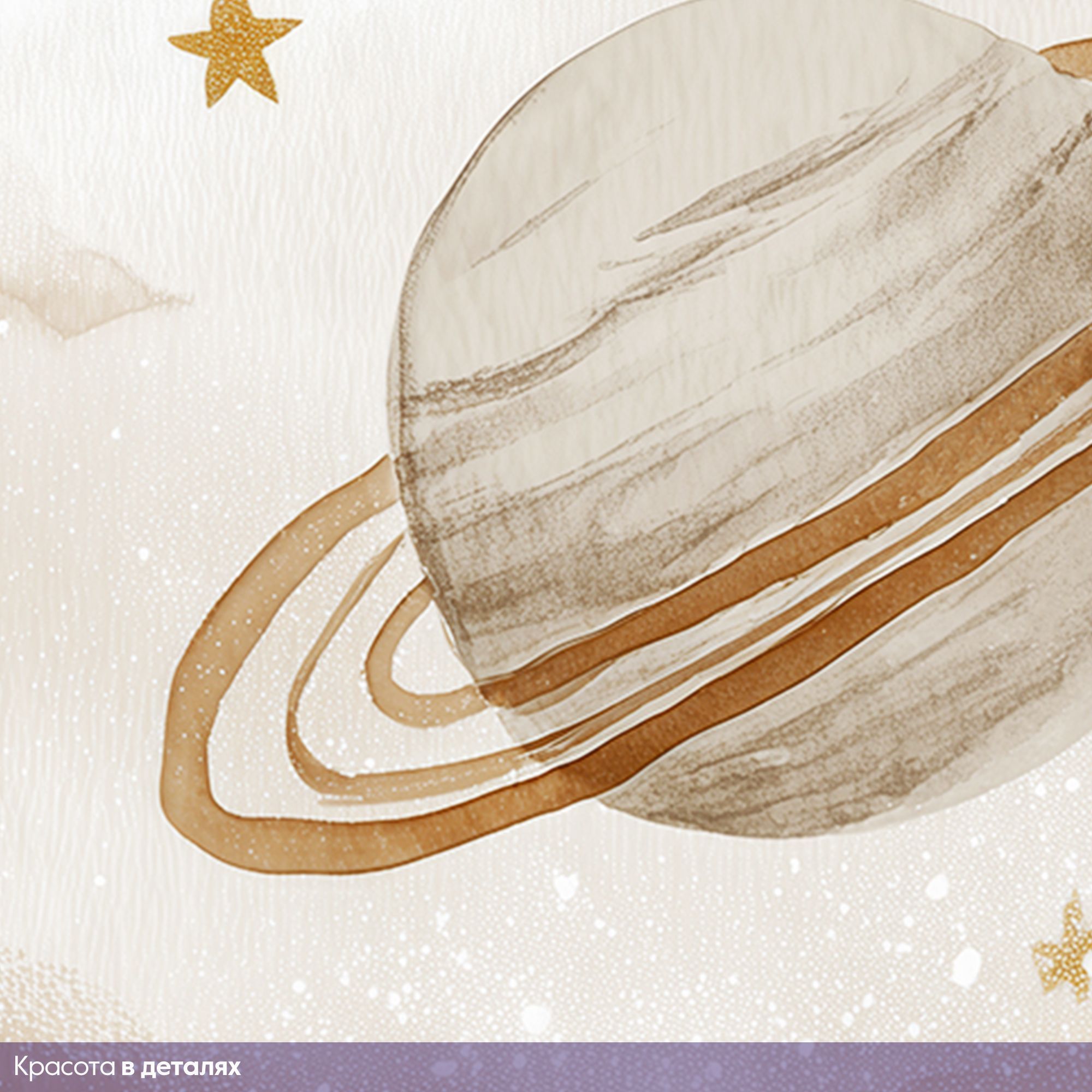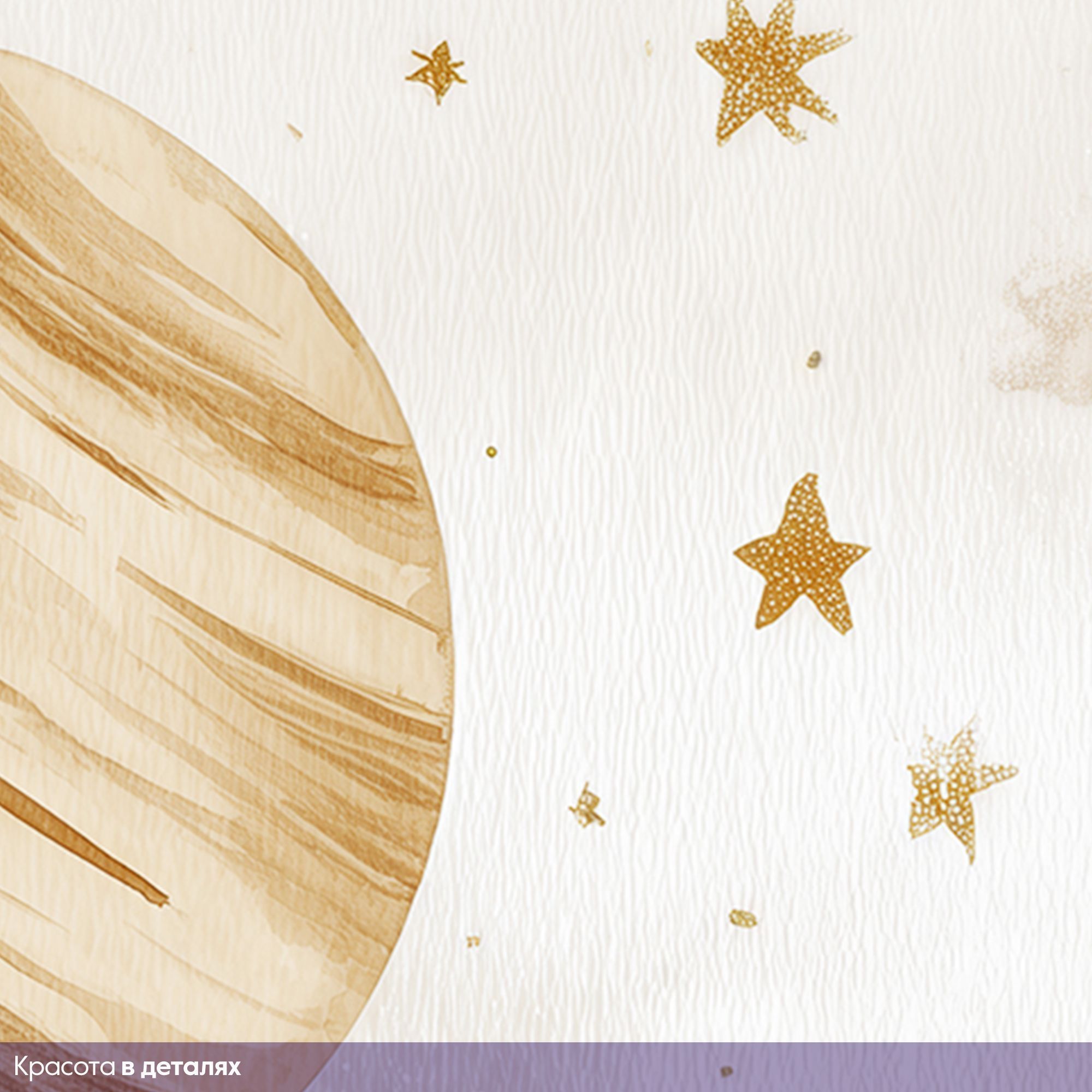 Баланс между фантазией и реальностью — узнаваемые космические объекты выполнены в стилизованной, почти сказочной манере.