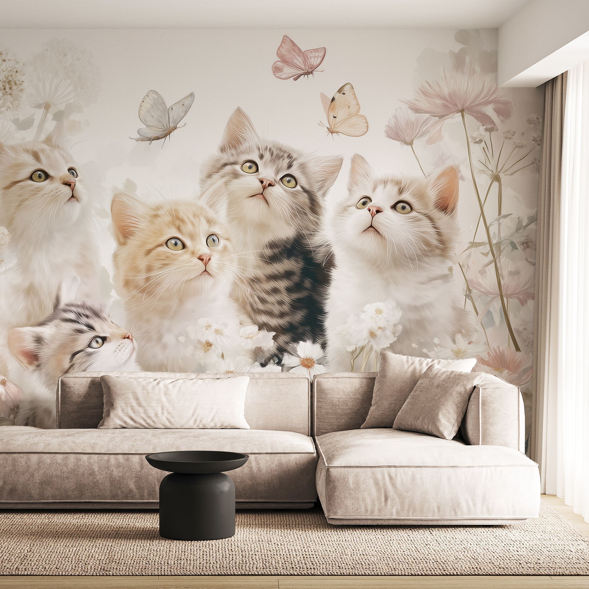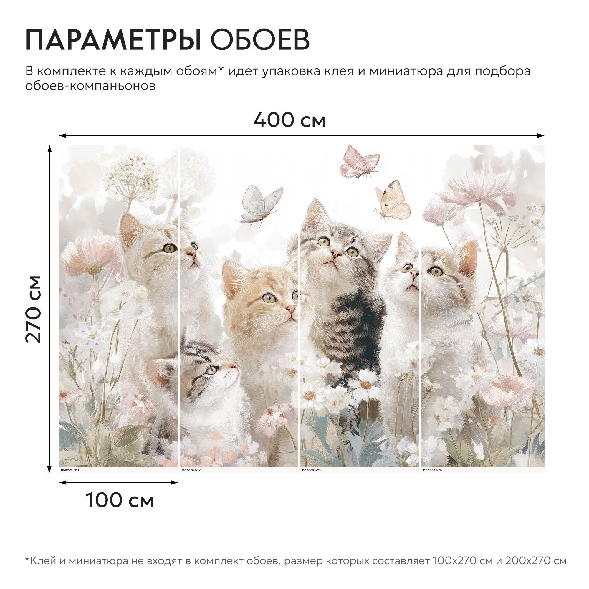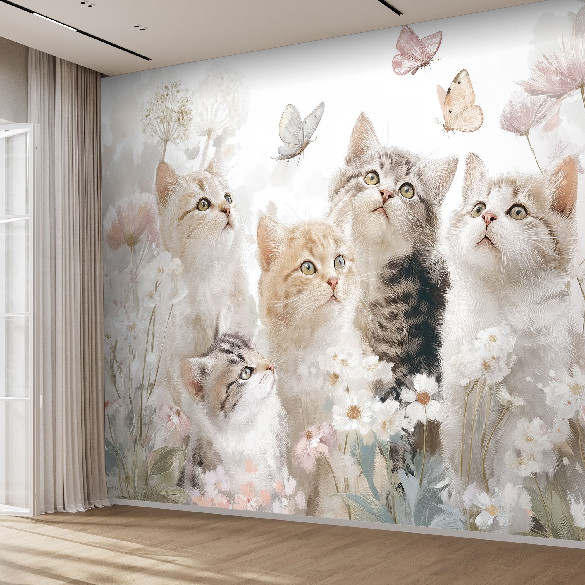 Эти фотообои — настоящая ода нежности и детской радости, воплощённая в художественной композиции. На них изображены пять очаровательных котят с выразительными глазами, которые с любопытством и восторгом наблюдают за порхающими вокруг бабочками. Котята окружены пышным ковром из полевых цветов — нежных ромашек, пушистых соцветий и изящных бутонов пастельных оттенков. Лёгкая акварельная техника исполнения придаёт изображению воздушность и сказочность. Пастельная цветовая гамма — мягкие оттенки розового, кремового, бежевого и светло-зелёного создают атмосферу лёгкости и умиротворения. Детализированная прорисовка — пушистая шерсть котят, тонкие прожилки на лепестках цветов и изящные узоры на крыльях бабочек выполнены с удивительной тщательностью. Гармония природы — сочетание животных и цветов создаёт цельную, сбалансированную картину, наполненную теплом и светом. Эти фотообои не просто украсят стену — они наполнят дом атмосферой беззаботного счастья, пробудят тёплые эмоции и станут источником вдохновения каждый день. Идеальный выбор для тех, кто ценит уют, любит животных и стремится создать в своём интерьере уголок сказки!