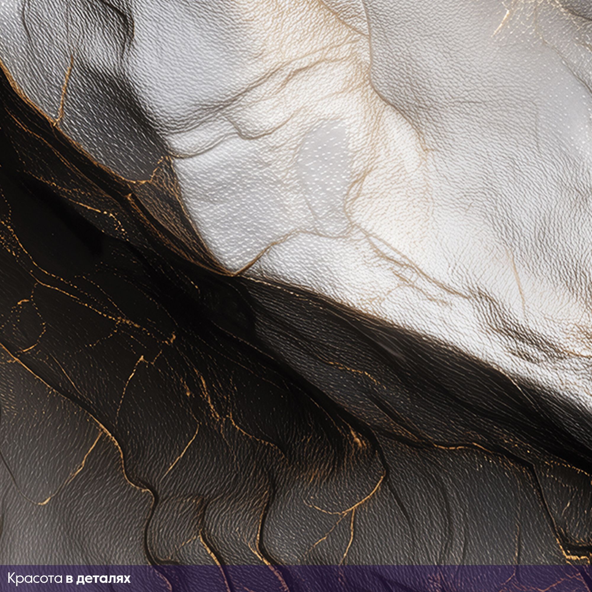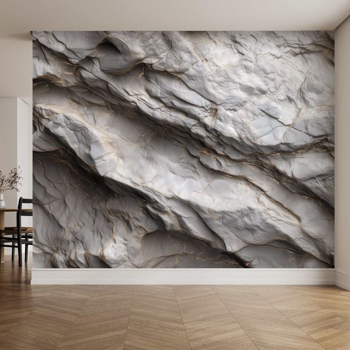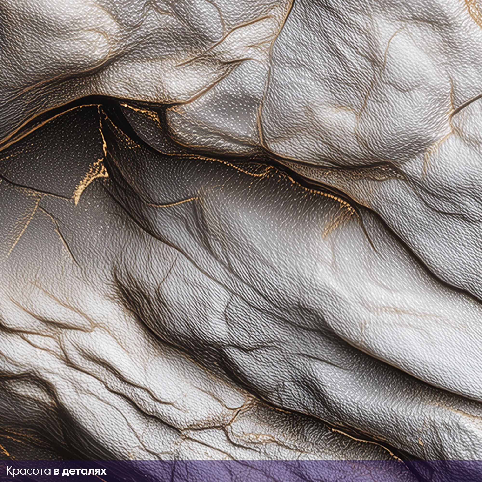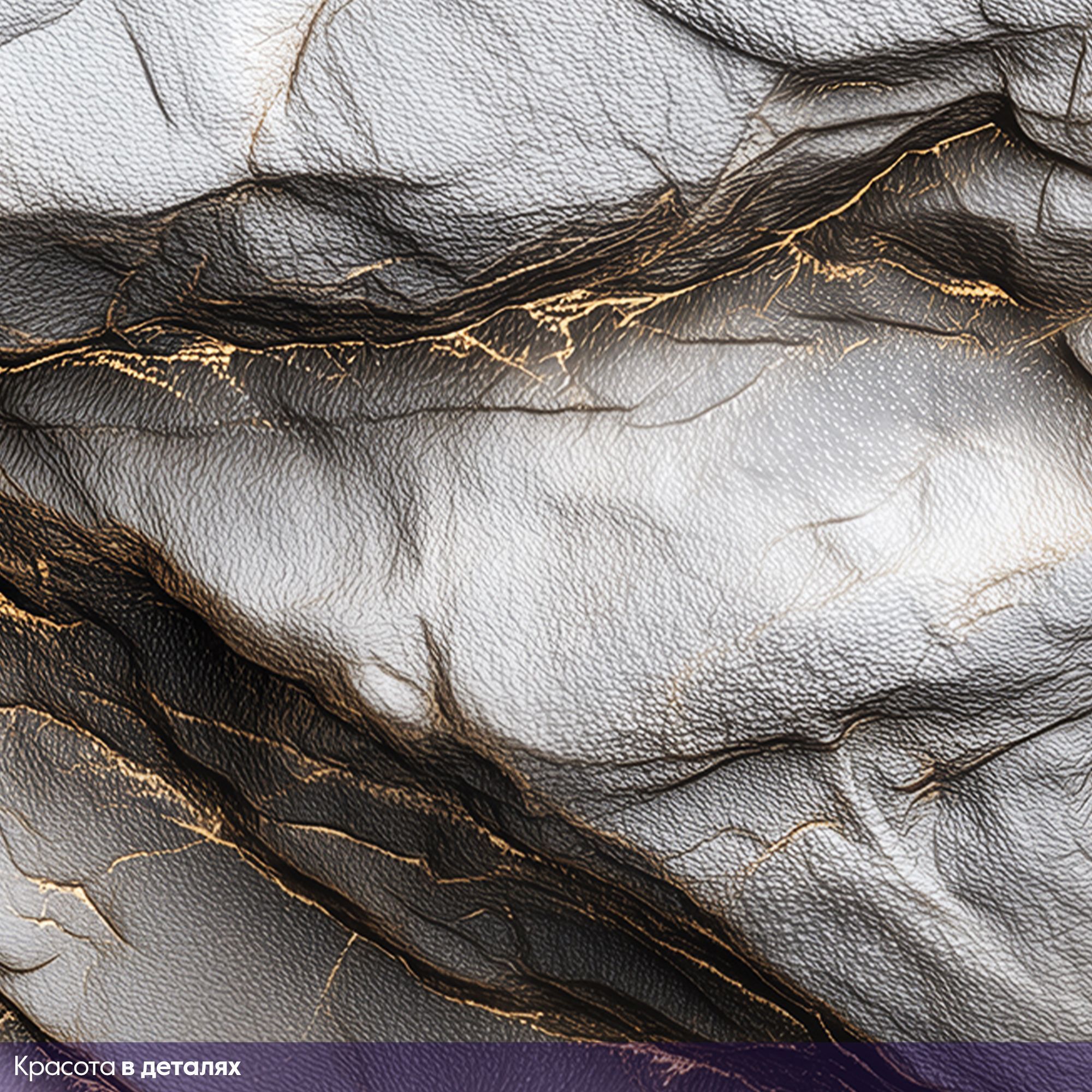 Эти фотообои — воплощение роскоши и природной мощи, способное преобразить любое помещение. Дизайн имитирует фактуру благородного камня с изысканными золотыми прожилками, создавая эффект трёхмерной поверхности. Кажется, будто перед вами фрагмент величественной горной породы, застывшей в вечном движении. Текстурная глубина: реалистичная имитация рельефа камня с мягкими изгибами и выразительными трещинами придаёт стене объём и тактильную привлекательность. Цветовая гамма: сочетание благородных серых оттенков с тёплыми золотыми акцентами создаёт баланс между строгостью и роскошью. Игра света: золотые прожилки ловят свет, оживляют композицию и добавляют динамичности. Абстрактность: отсутствие чётких форм позволяет воспринимать рисунок по-разному — как горные хребты, застывшие волны или таинственные лабиринты. Эстетика: сочетание природной грубости и изысканных деталей делает дизайн универсальным и в то же время эксклюзивным. Идеальный выбор для тех, кто ценит сочетание природной силы и изысканной элегантности!