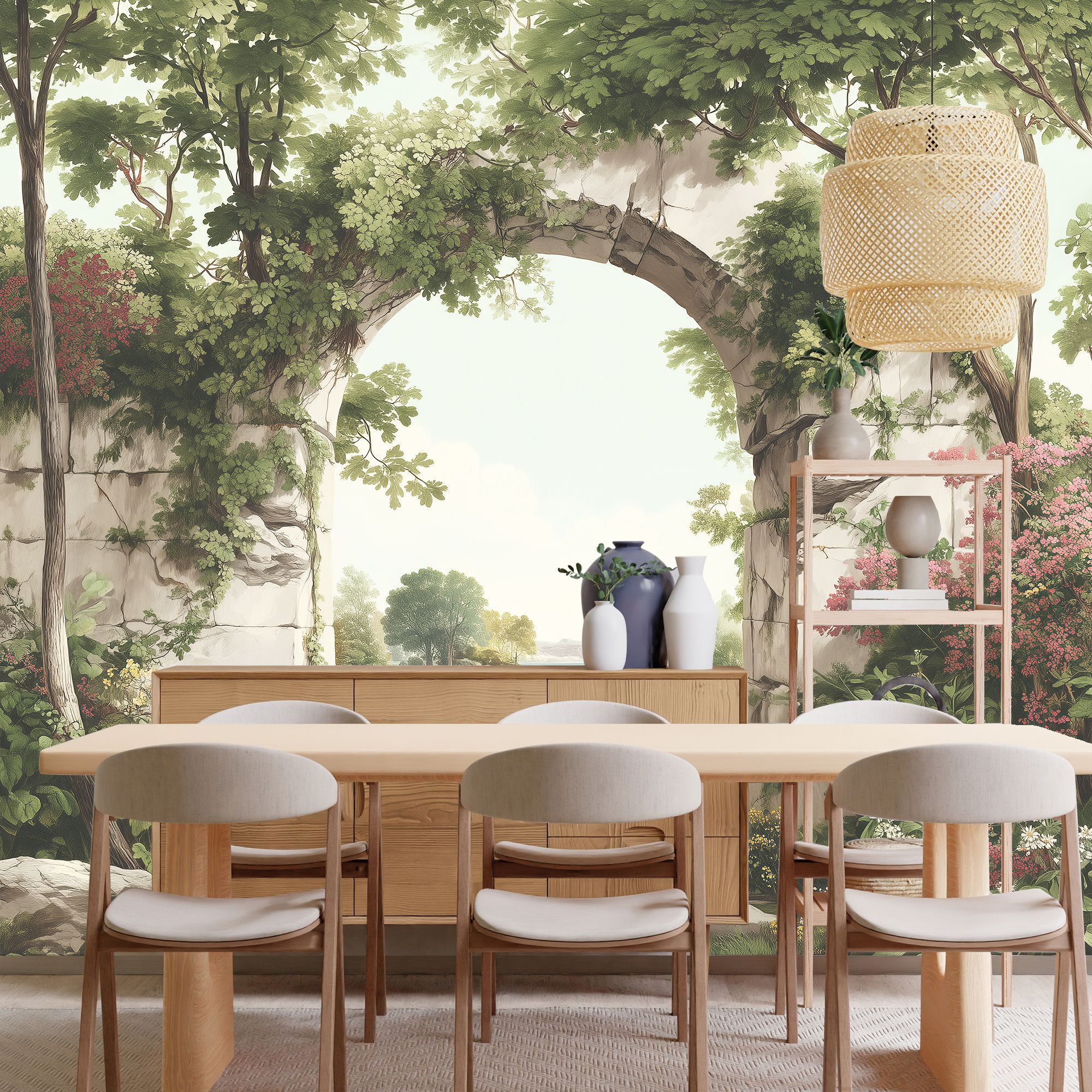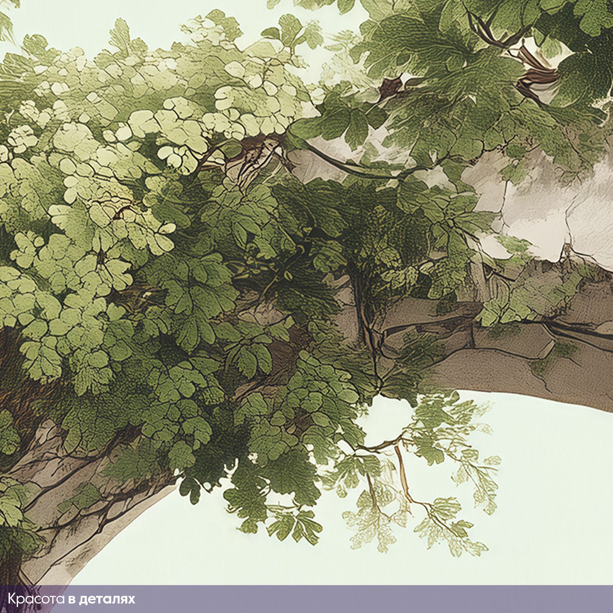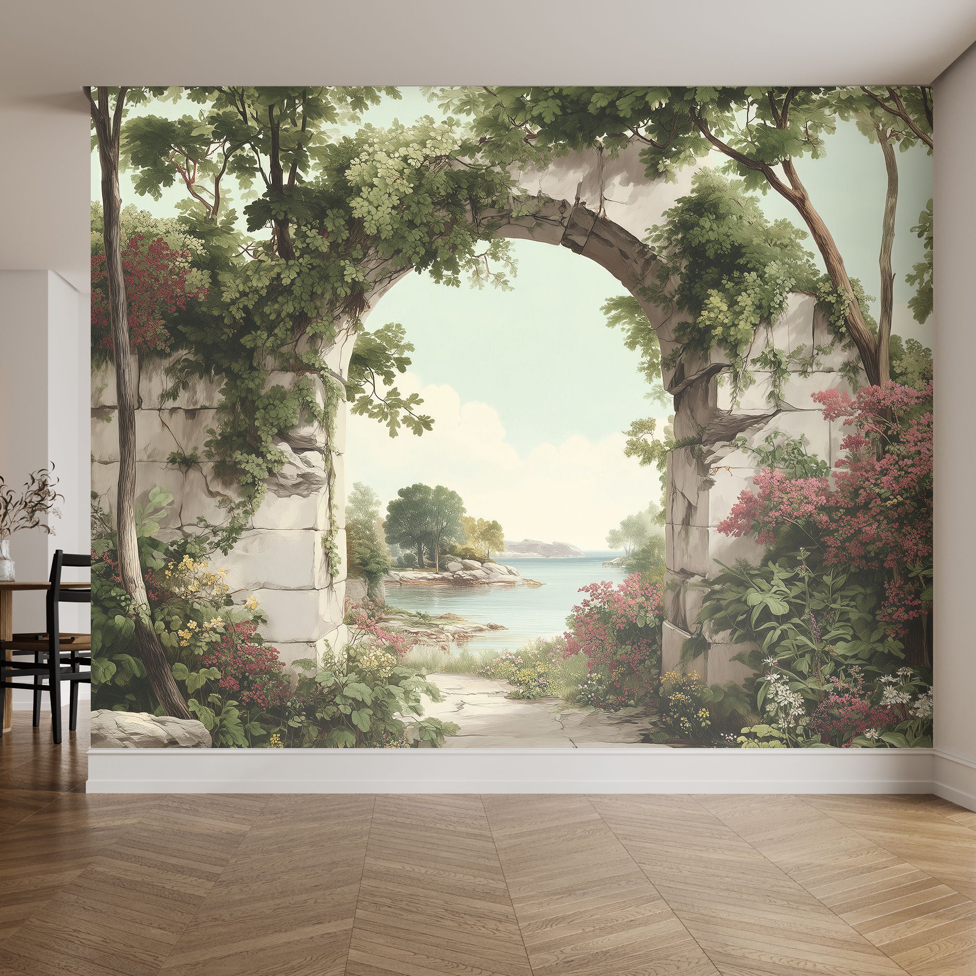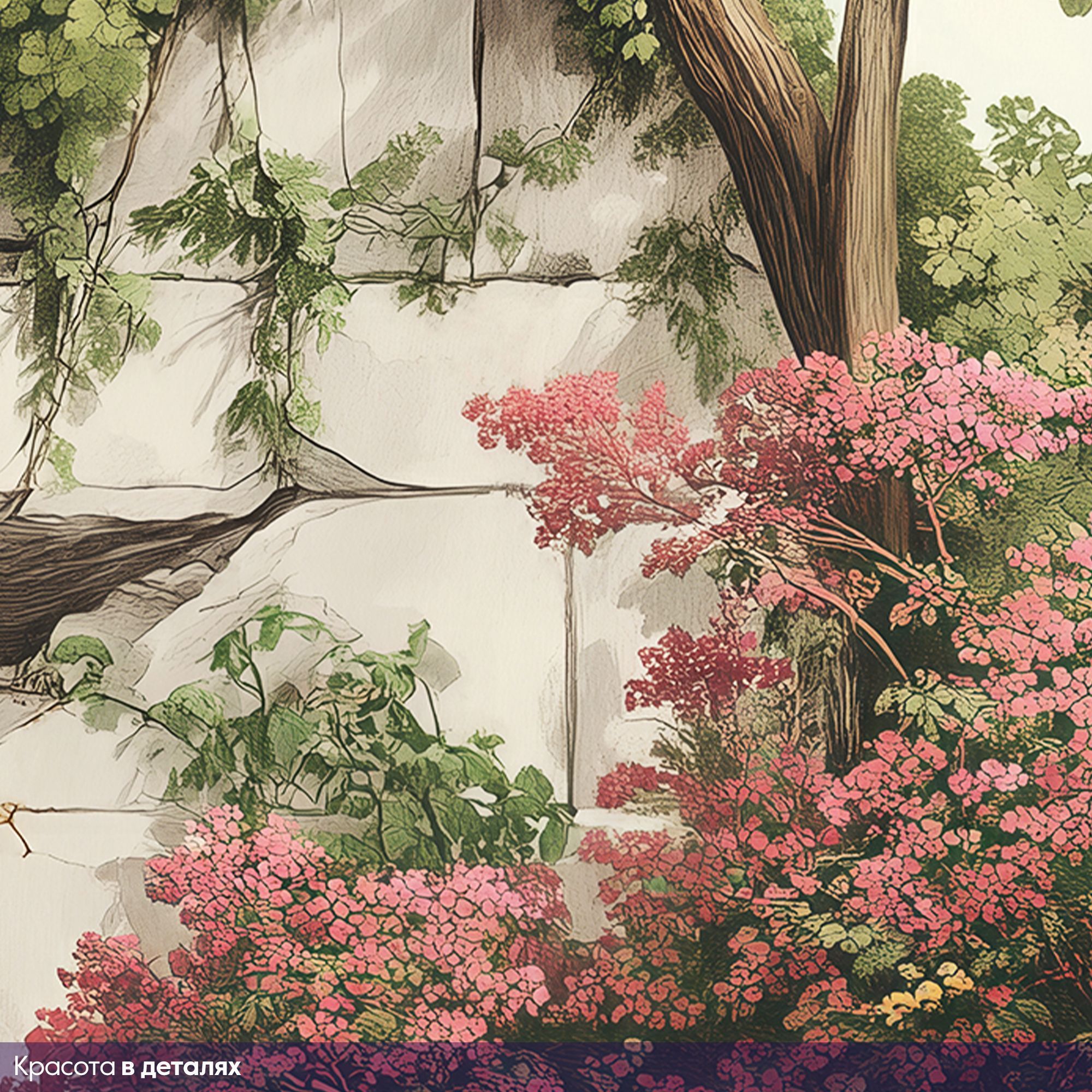 Эти фотообои — настоящий портал в мир природной гармонии и романтики. На них изображена живописная арка из светлого камня, увитая сочной зеленью и цветущими растениями. Арка словно приглашает пройти сквозь неё, чтобы оказаться в идиллическом уголке природы: за ней открывается вид на спокойное море, окружённое скалами и деревьями, а на переднем плане раскинулся ковёр из ярких цветов и густой листвы. Богатая цветовая палитра — сочетание нежных зелёных, розовых, жёлтых и голубых оттенков создаёт ощущение свежести и лёгкости. Детализированная прорисовка — каждый листок, цветок и трещинка на камне прорисованы с удивительной тщательностью, что придаёт изображению реалистичность. Глубина композиции — арка служит естественным «окном» в пейзаж, создавая трёхмерный эффект и визуально расширяя пространство комнаты. Сочетание старины и природы — обветшалая каменная арка в обрамлении буйной растительности вызывает ассоциации с романтическими руинами старинных вилл, утопающих в садах. Спокойная атмосфера — мягкий свет, плавные линии и природные мотивы наполняют изображение умиротворением. Фотообои станут центральным акцентом интерьера, создадут атмосферу уюта и элегантности, идеально подойдут для гостиной в классическом, прованском или эко-стиле.