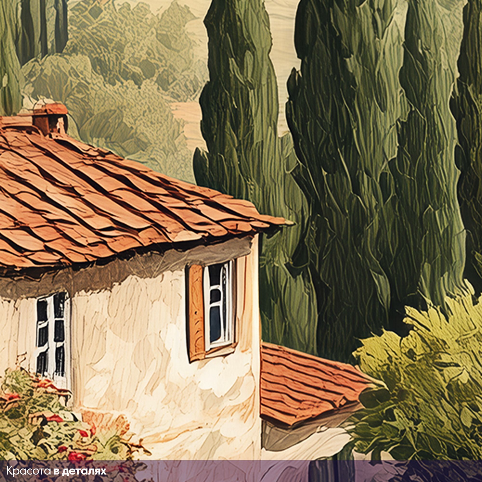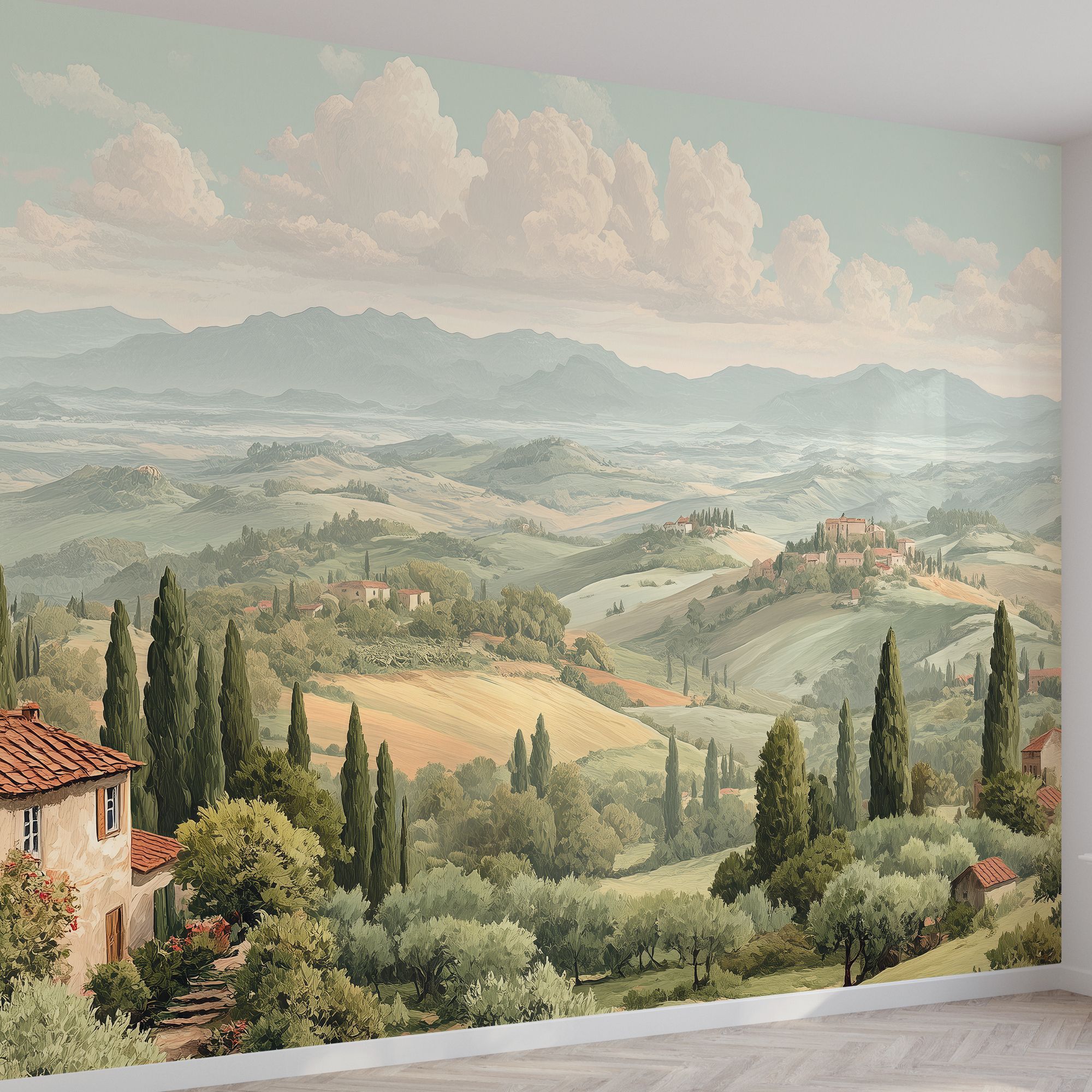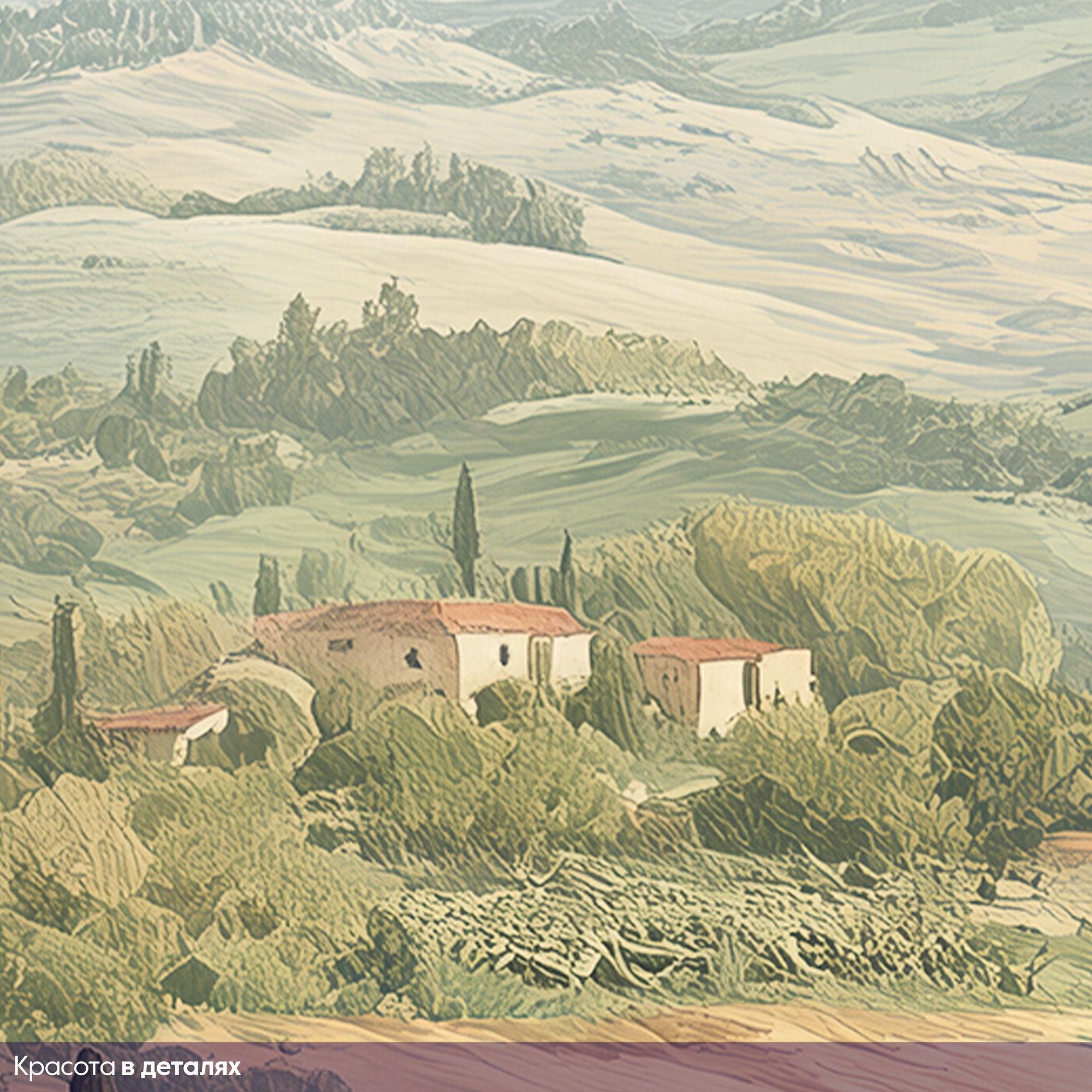 Эти фотообои представляют собой живописный пейзаж в стиле классической тосканской деревни, наполненный тёплой атмосферой сельской Италии. На переднем плане уютные домики с терракотовыми крышами окружены пышной зеленью, цветущими садами и оливковыми деревьями, создавая ощущение уюта и спокойствия. Дальше простираются мягкие, волнистые холмы с аккуратными полями и высокими кипарисами, которые тянутся к горизонту, где виднеются величественные горы под пушистыми облаками. Нежная пастельная цветовая гамма усиливает чувство гармонии и умиротворённости. Эти фотообои станут идеальным акцентом для создания интерьера в средиземноморском стиле, принося в дом тепло, свет и вдохновение живой природы. Они визуально расширят пространство, добавят лёгкость и ощущение свежести, погружая вас в атмосферу солнечного юга и неторопливой жизни.
