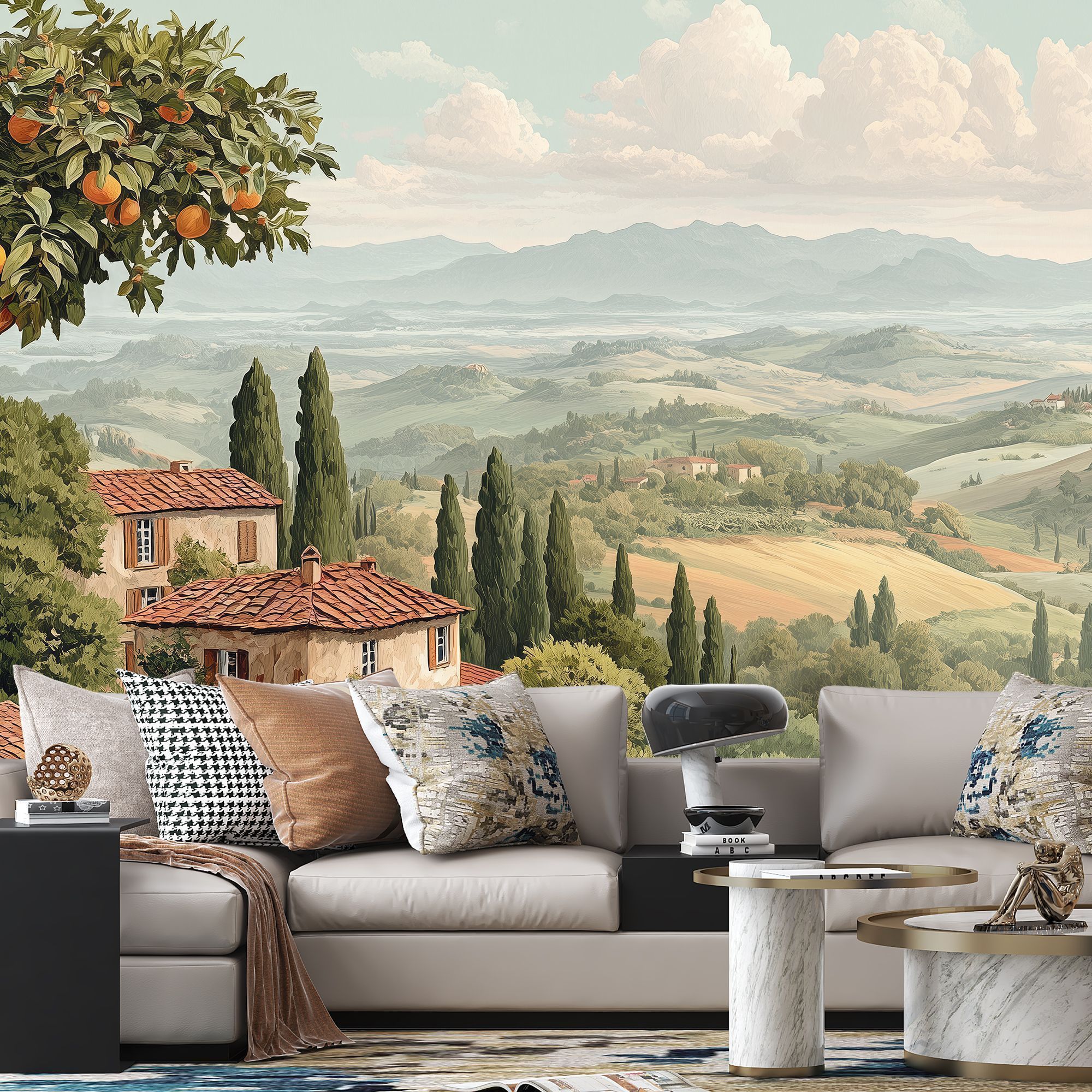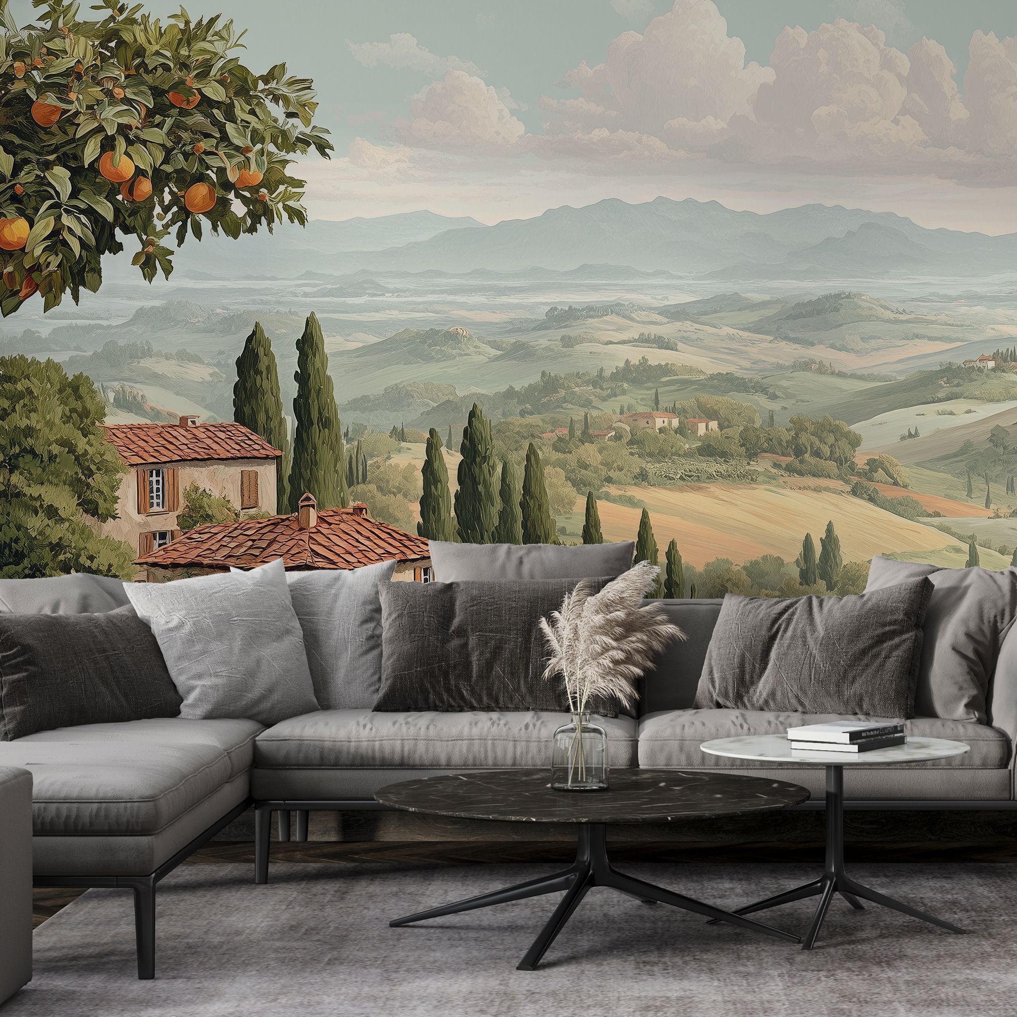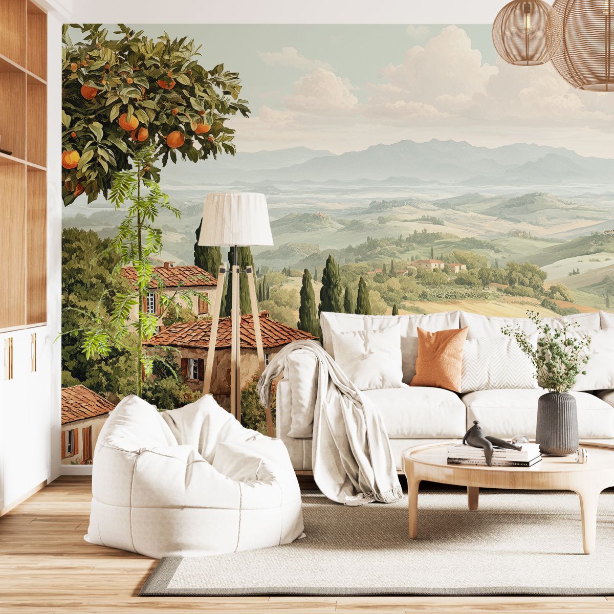 Эти фотообои представляют собой живописный пейзаж в стиле классической тосканской деревни, наполненный тёплой атмосферой сельской Италии. На переднем плане уютные домики с терракотовыми крышами окружены пышной зеленью, цветущими садами и оливковыми деревьями, создавая ощущение уюта и спокойствия. Дальше простираются мягкие, волнистые холмы с аккуратными полями и высокими кипарисами, которые тянутся к горизонту, где виднеются величественные горы под пушистыми облаками. Нежная пастельная цветовая гамма усиливает чувство гармонии и умиротворённости. Эти фотообои станут идеальным акцентом для создания интерьера в средиземноморском стиле, принося в дом тепло, свет и вдохновение живой природы. Они визуально расширят пространство, добавят лёгкость и ощущение свежести, погружая вас в атмосферу солнечного юга и неторопливой жизни.