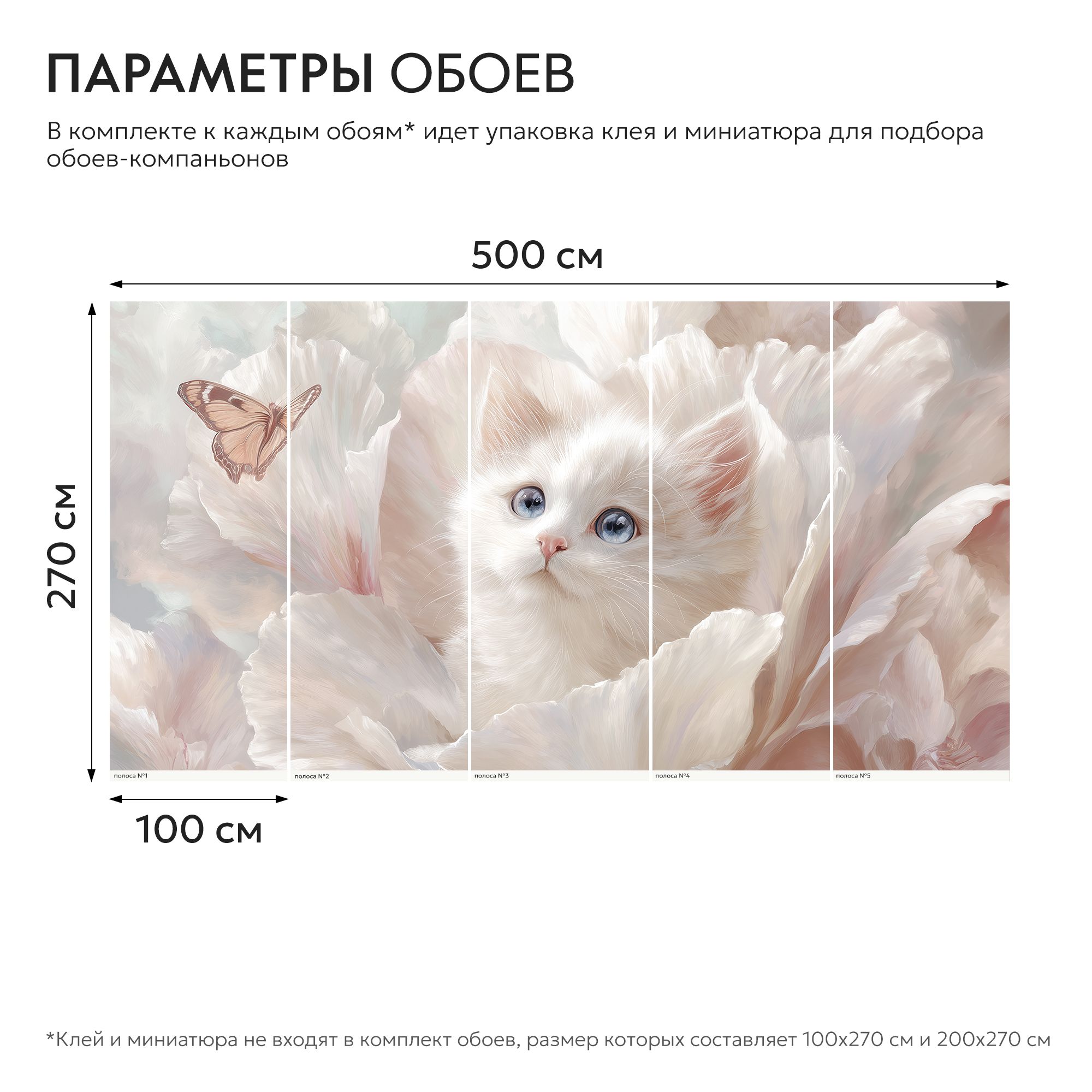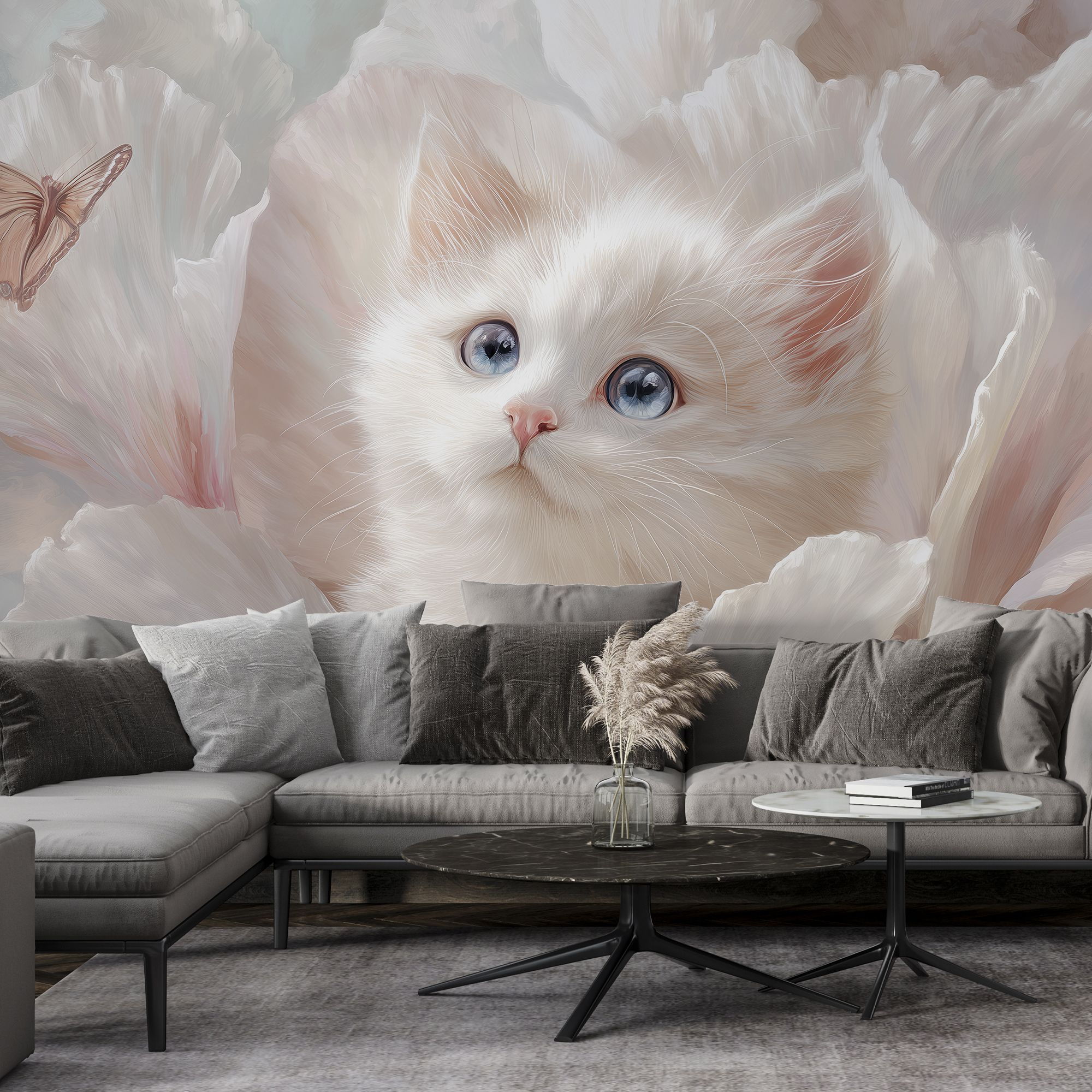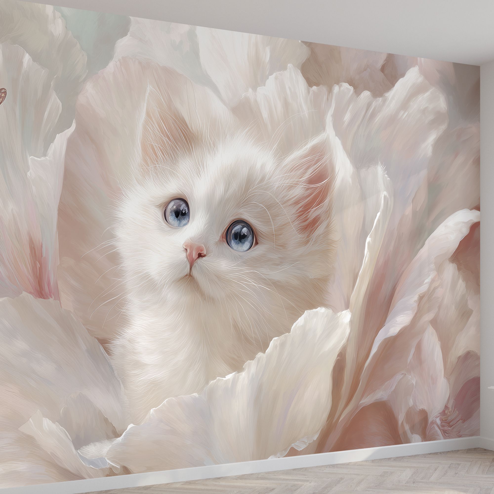 Эти фотообои создают невероятно нежную и трогательную атмосферу благодаря изображению белоснежного котёнка с выразительными большими голубыми глазами. Мягкий, пушистый мех животного словно переливается в окружении нежных светло-розовых и кремовых лепестков огромного цветка, которые словно обнимают малыша, придавая образу сказочность и особую уязвимость. Такой дизайн очарует любителей природы и домашних питомцев, привнося в интерьер тепло и умиротворение. Эти фотообои идеально подойдут для детской комнаты или уютного уголка в доме, где хочется создать атмосферу любви и нежности. Лёгкие пастельные оттенки гармонично вписываются в любой стиль, даря ощущение покоя и светлого настроения.