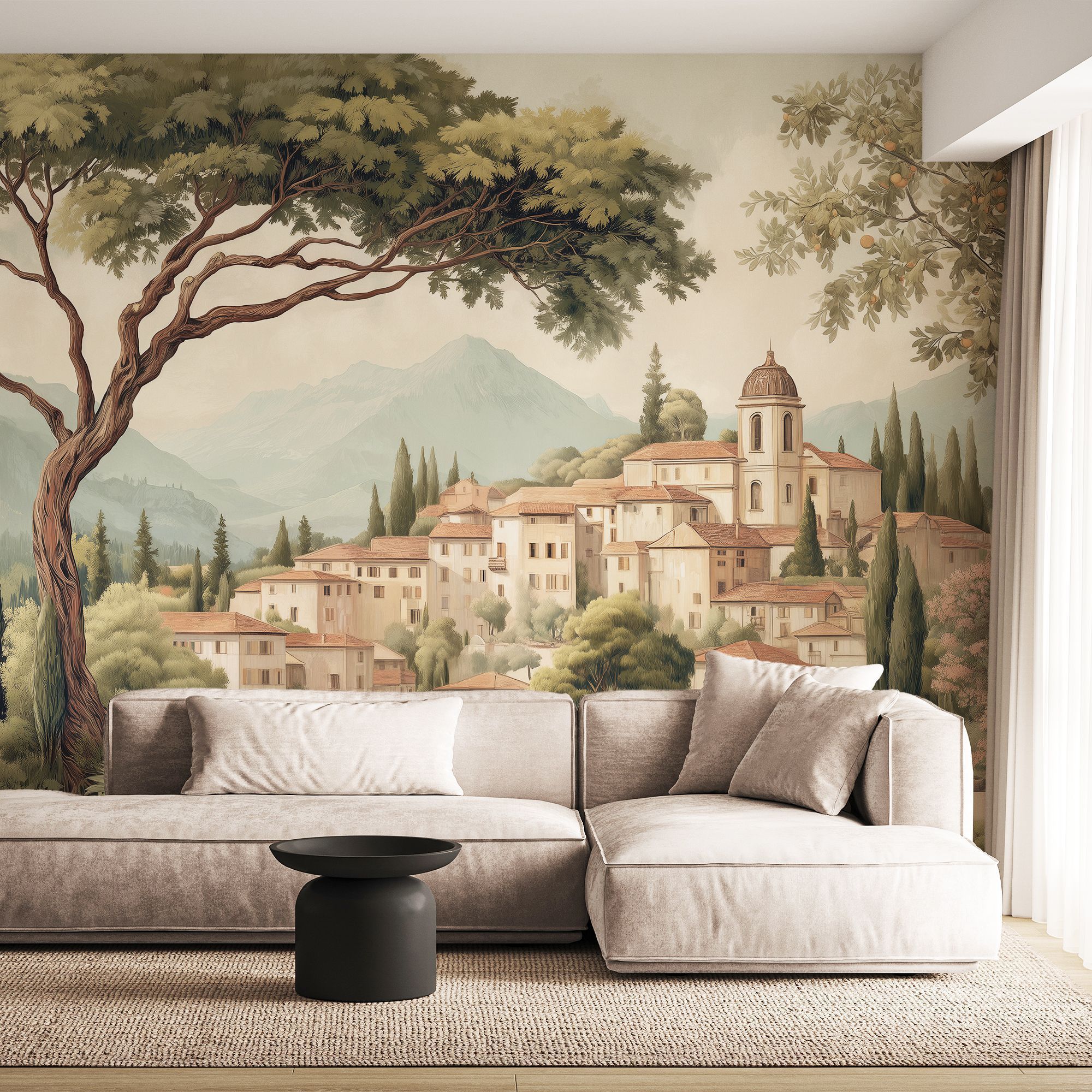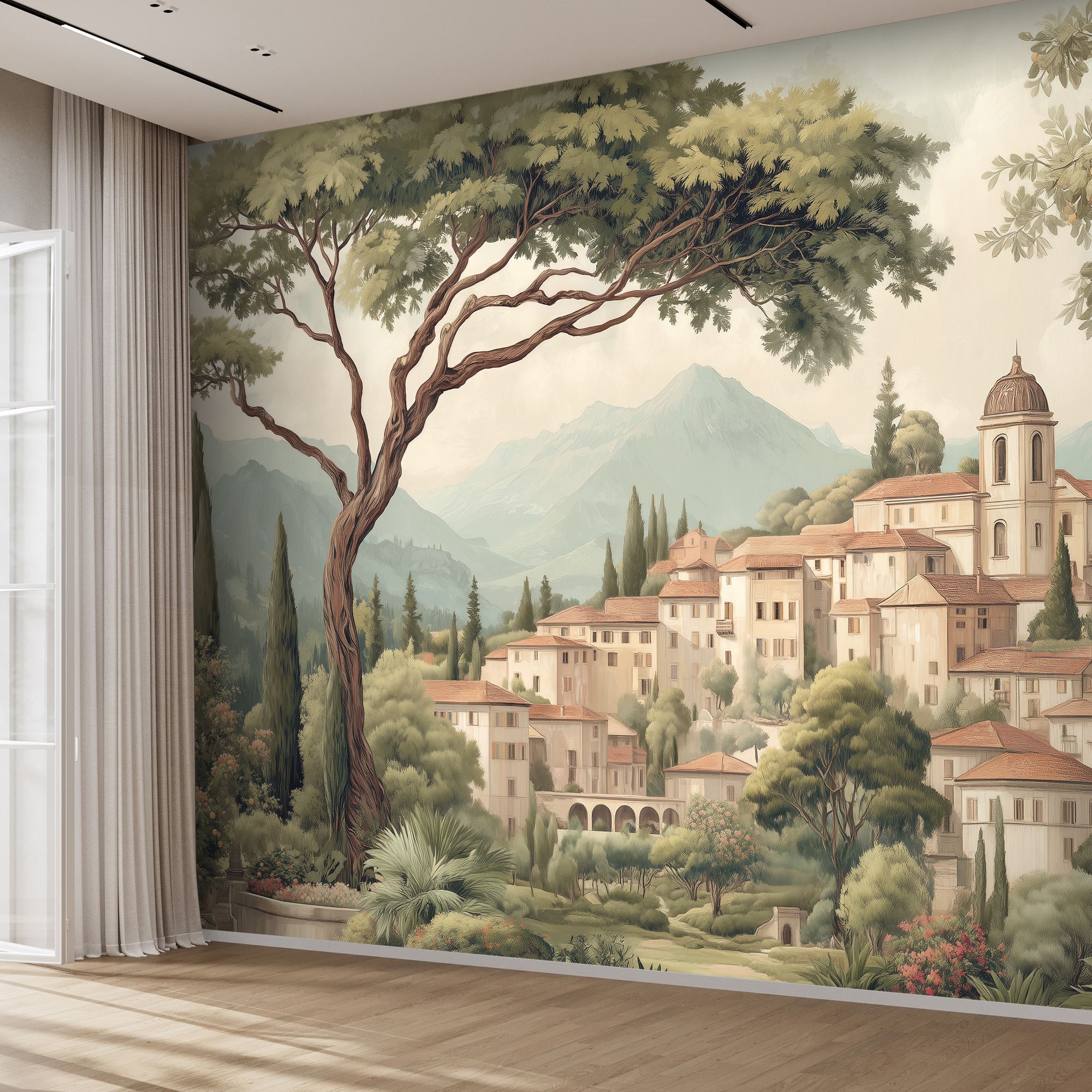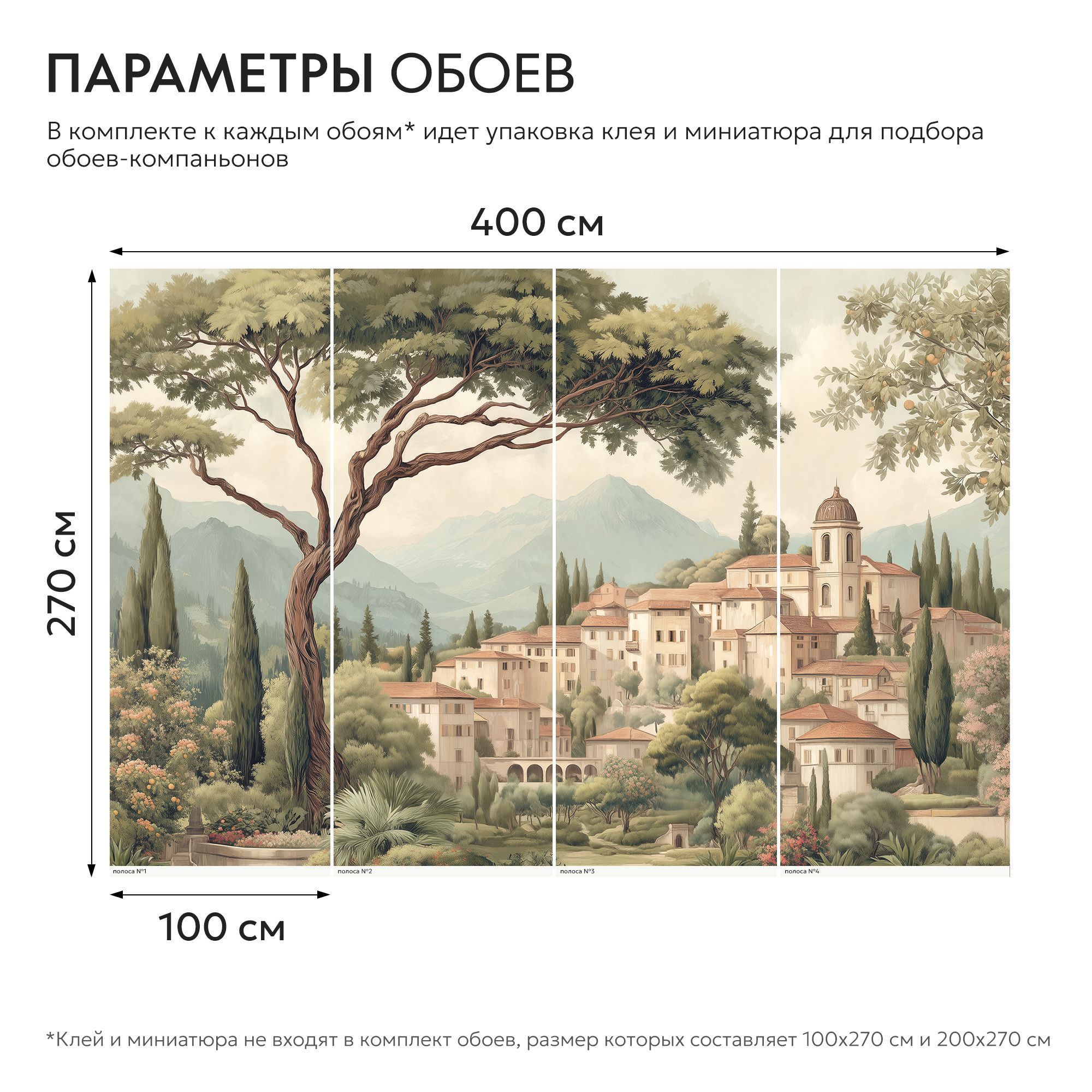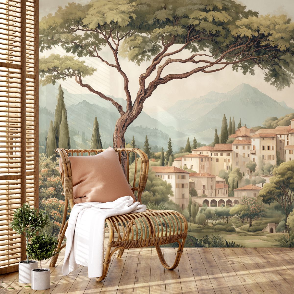 Эти фотообои создают атмосферу умиротворённого средиземноморского пейзажа, наполненного мягким светом и приглушёнными натуральными оттенками зелени, песочного и терракотового. На переднем плане величественное раскидистое дерево с живописными ветвями плавно обрамляет живописную деревушку с традиционными домами, крытыми красной черепицей. Вдалеке виднеются горы, которые добавляют глубину и ощущение простора. Детальная прорисовка каждого растения и архитектурного элемента создаёт гармоничное единство природы и рукотворного уюта. Обои идеально подойдут для создания в интерьере теплой, гостеприимной атмосферы, внесут в комнату нотки романтики и вечной природе, напоминающей о спокойных прогулках по красивым итальянским или провансальским улочкам.