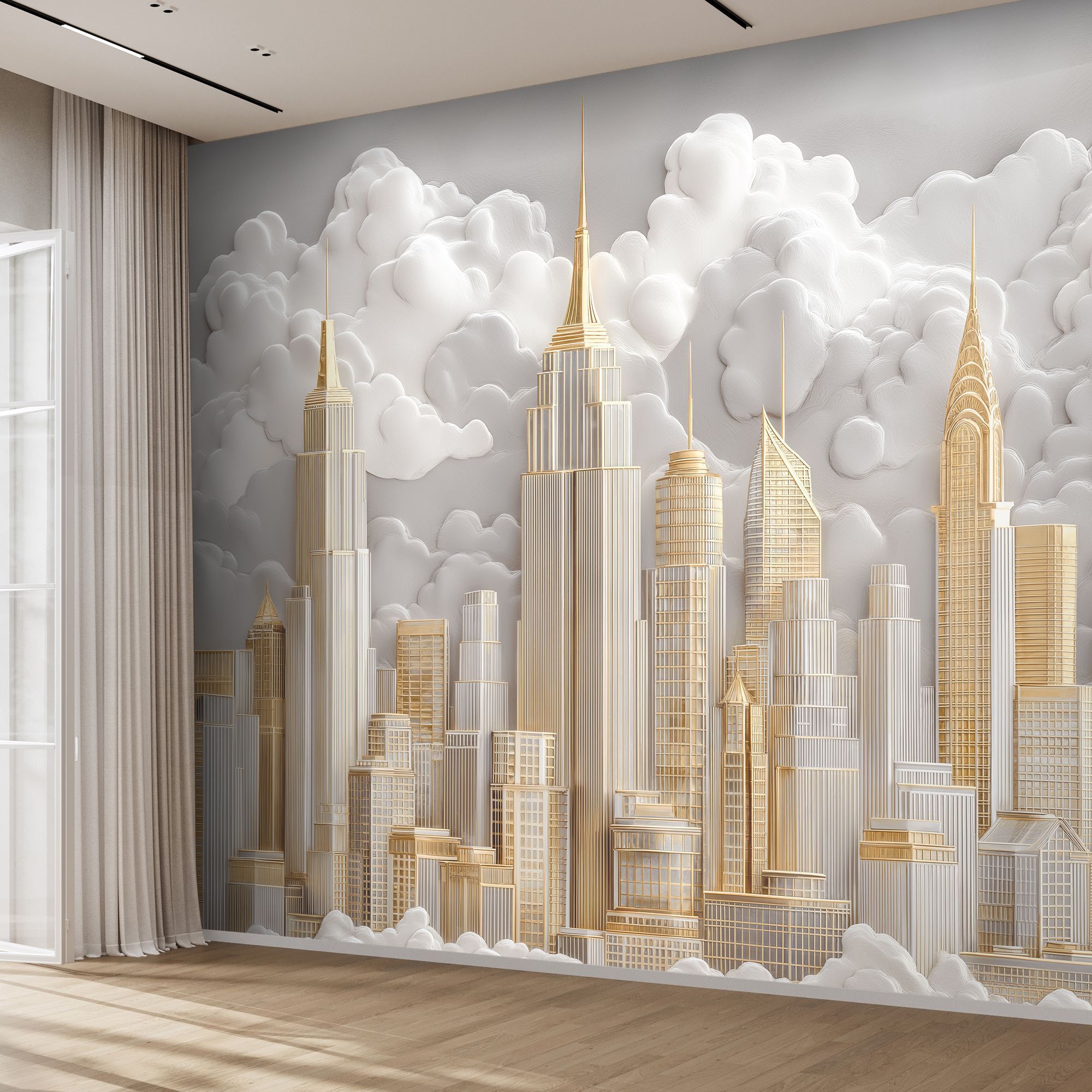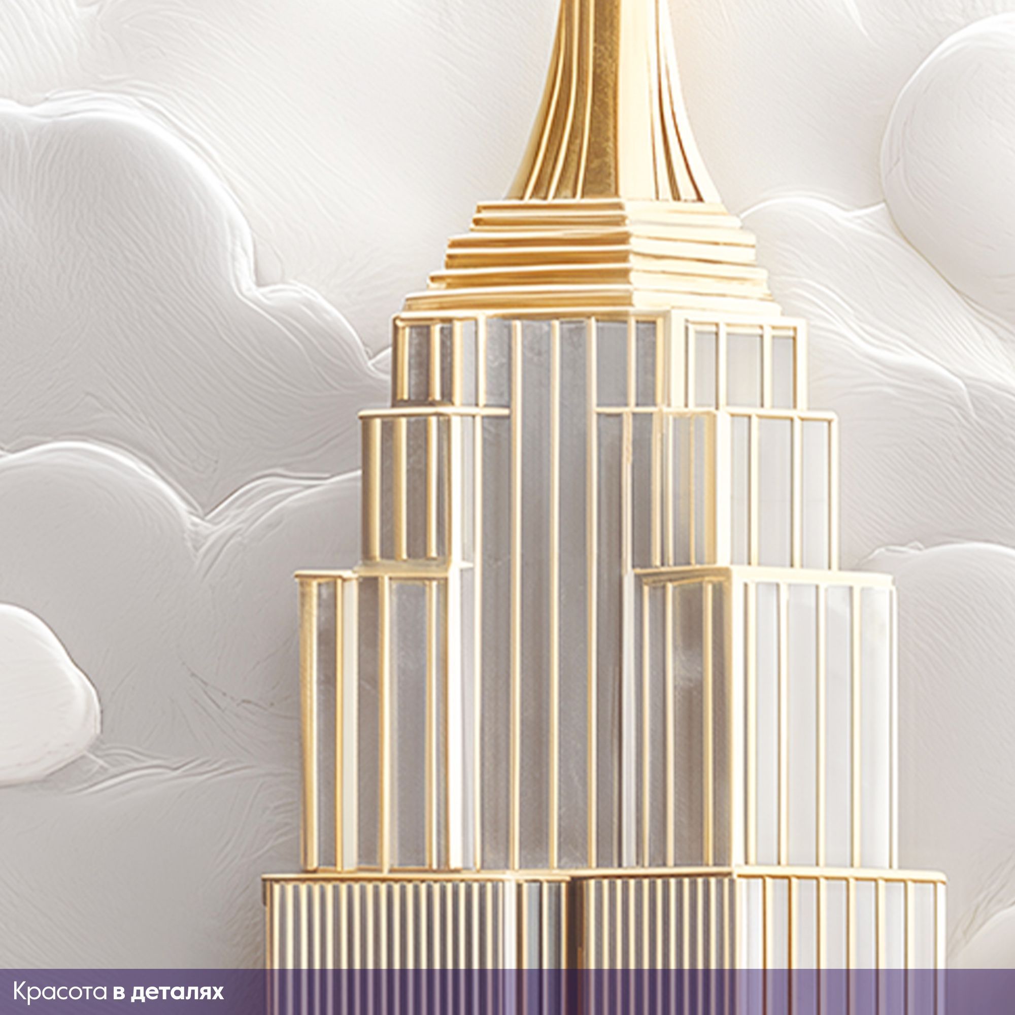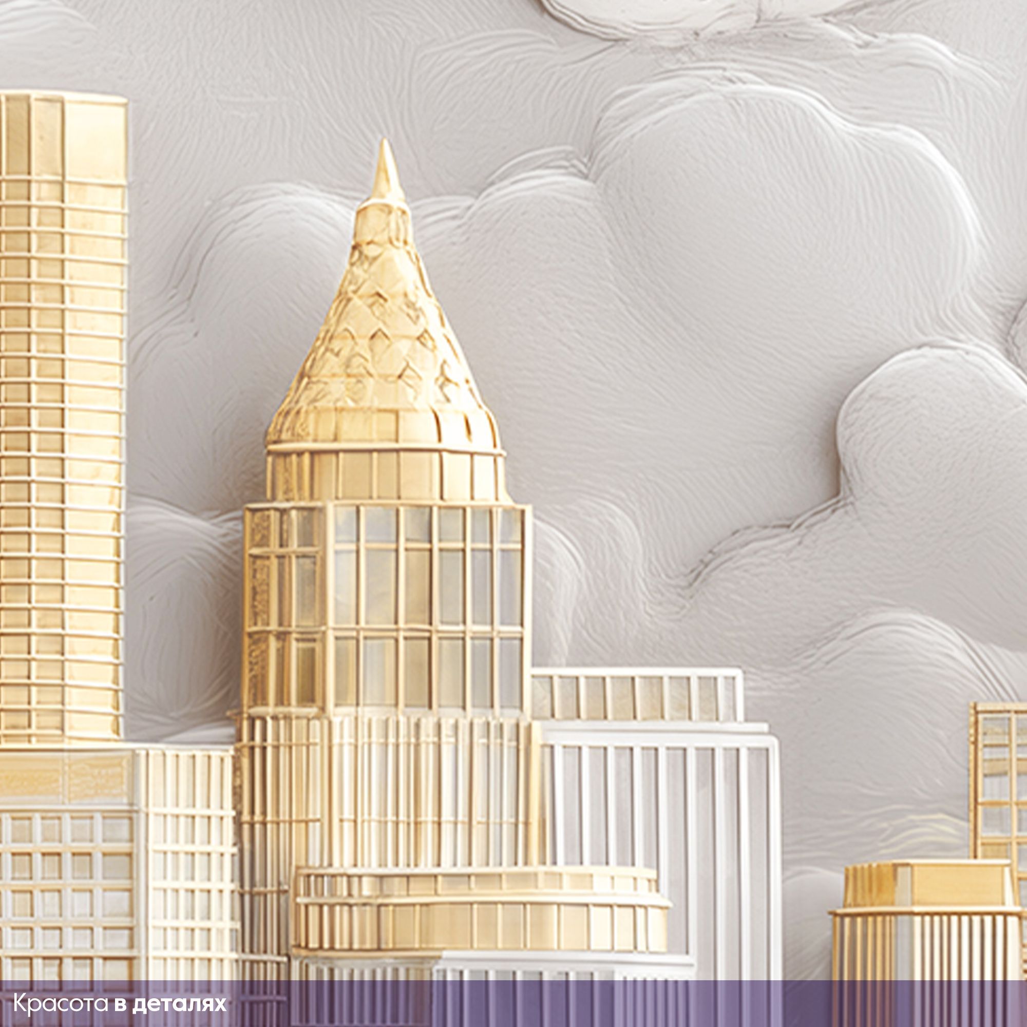 Фотообои с изысканным городским пейзажем в золотых и серебристых тонах, окружённым пушистыми облаками — воплощение роскоши и урбанистической мечты. Центральную часть композиции занимают величественные здания, напоминающие знаковые архитектурные шедевры Нью-Йорка — их изящные силуэты устремлены ввысь, к небесам. Благородные оттенки золота, серебра и белого создают ощущение лёгкости и одновременно подчёркивают статусность интерьера. Архитектурные детали прорисованы с удивительной точностью — видны линии фасадов, оконные сетки, шпили и декоративные элементы зданий. Сочетание строгих геометрических форм небоскрёбов и плавных, округлых очертаний облаков создаёт гармоничный контраст. Фотообои идеально подойдут для гостиной в современном или арт-деко стиле; кабинета руководителя; холла или приёмной; спальни в урбанистическом стиле.